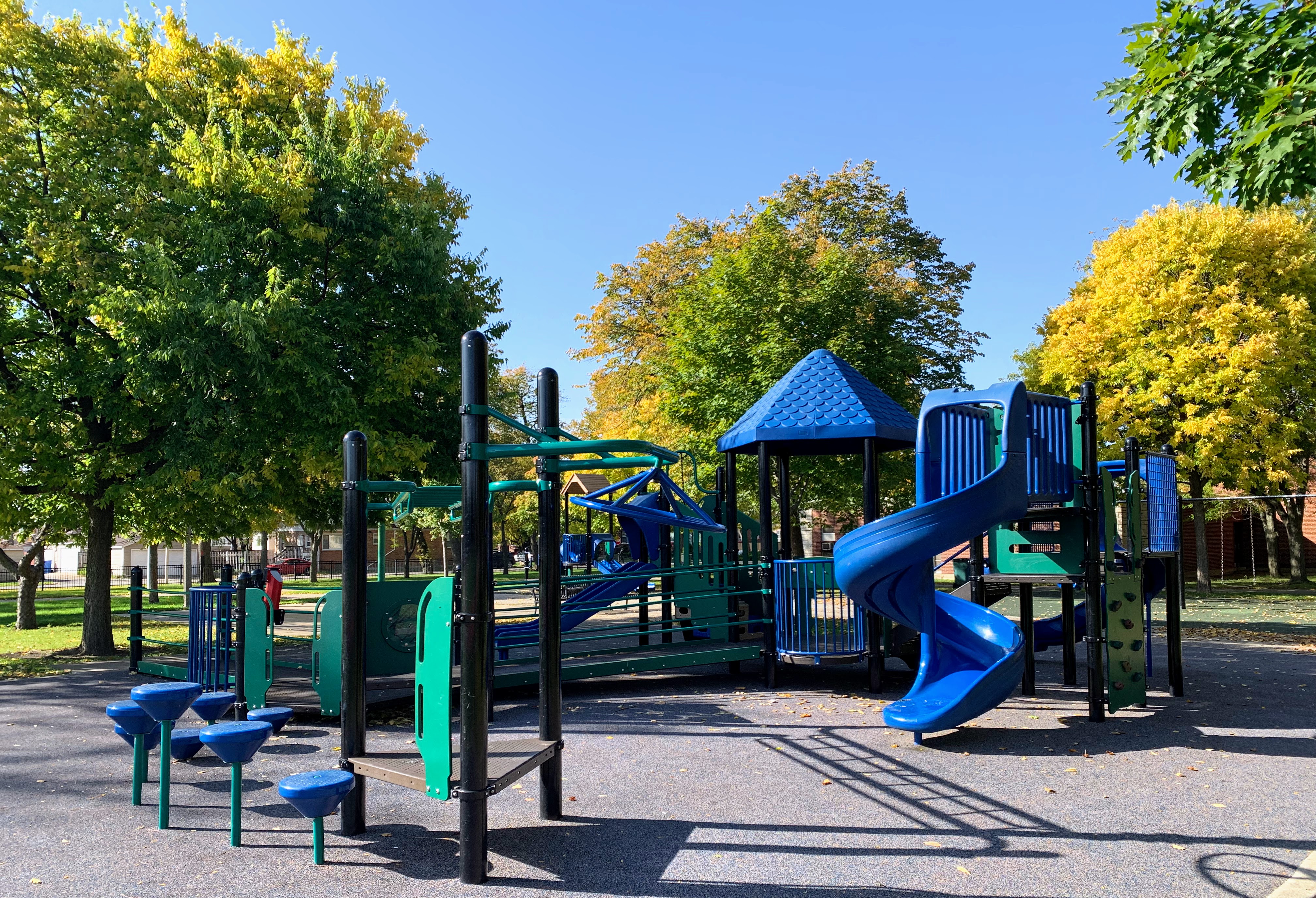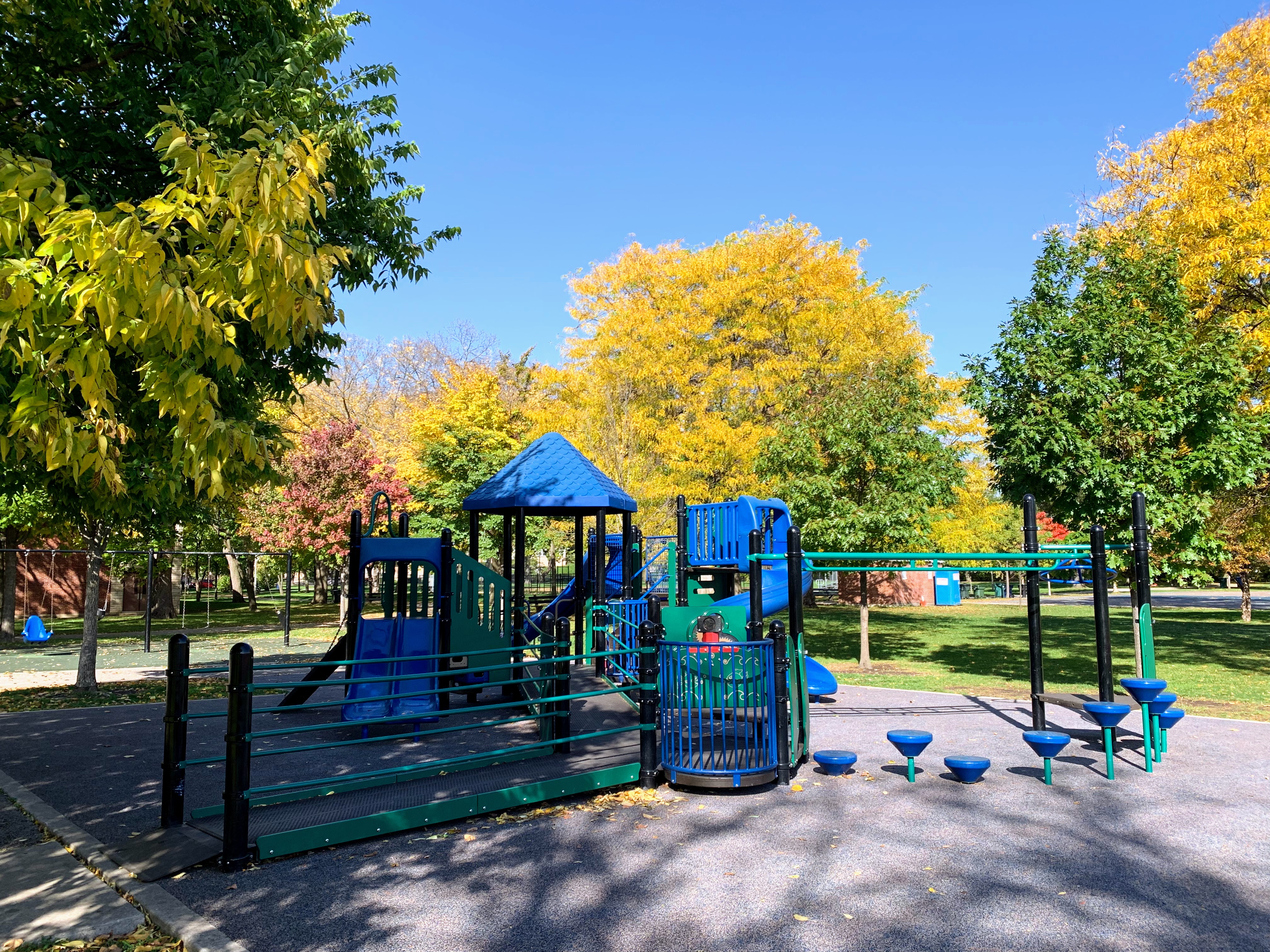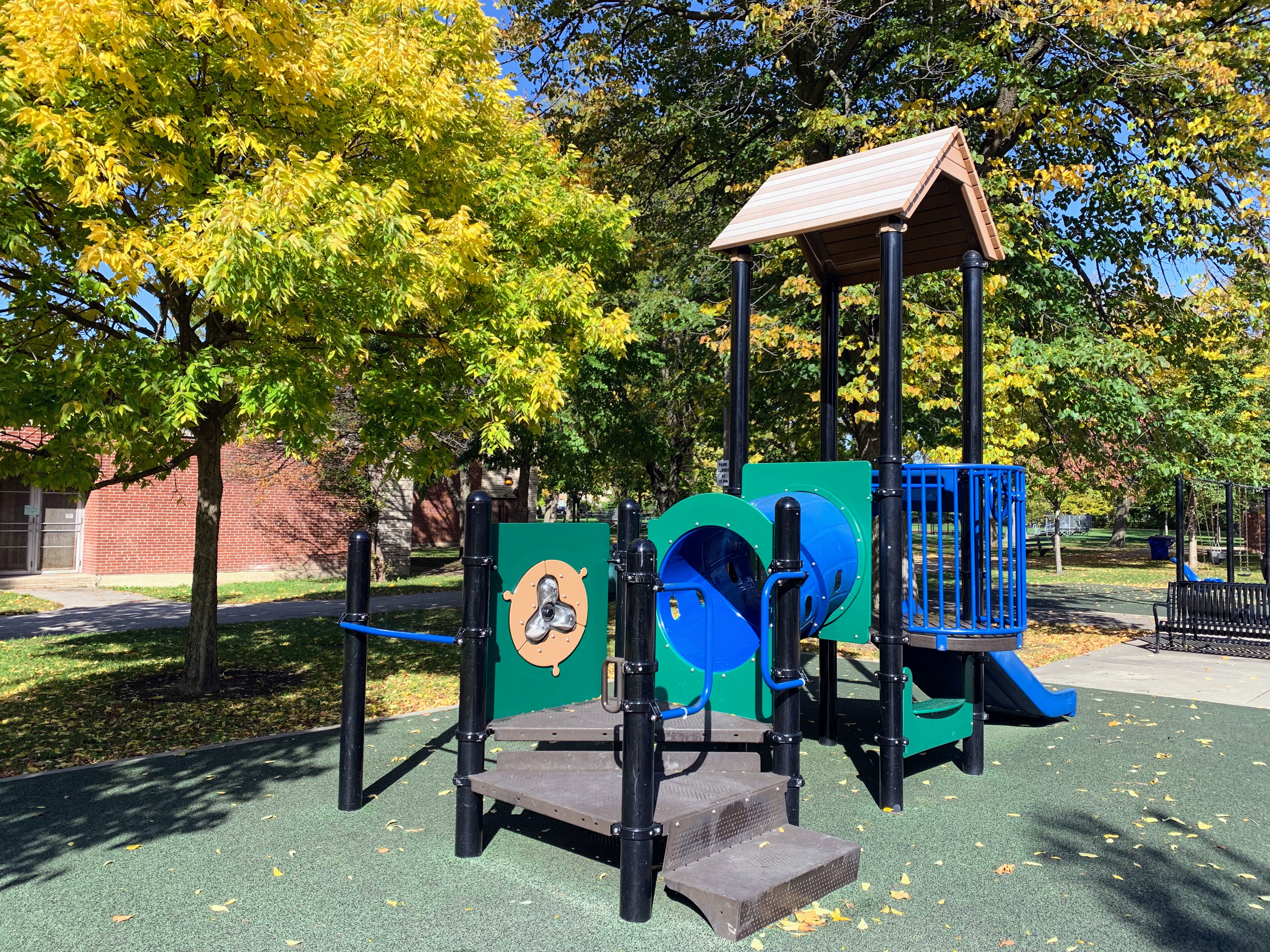 - The playground in Amundsen Park is a good playground with four areas: a smaller structure for younger children, a set of swings, a larger structure for older children, and a water spray feature. The larger structure is low to the ground and accessible via a ramp with a few sprawling elements low to the ground. The non-play features are also good: the play surface is soft rubber and there are benches for seating. There is some shade from trees and the nearby fieldhouse provides access to bathrooms (when open). All in all, this is a great playground; highly recommend.