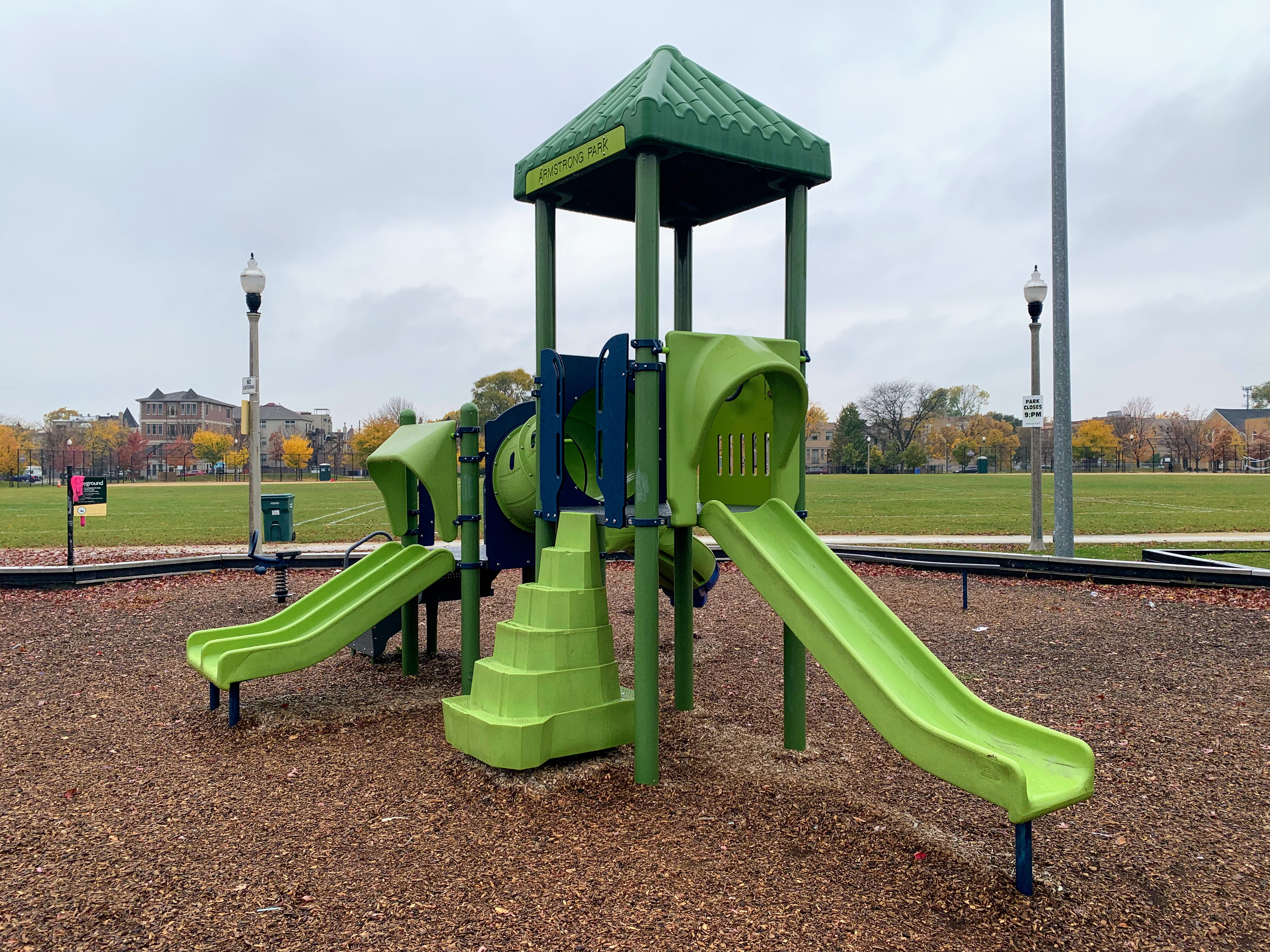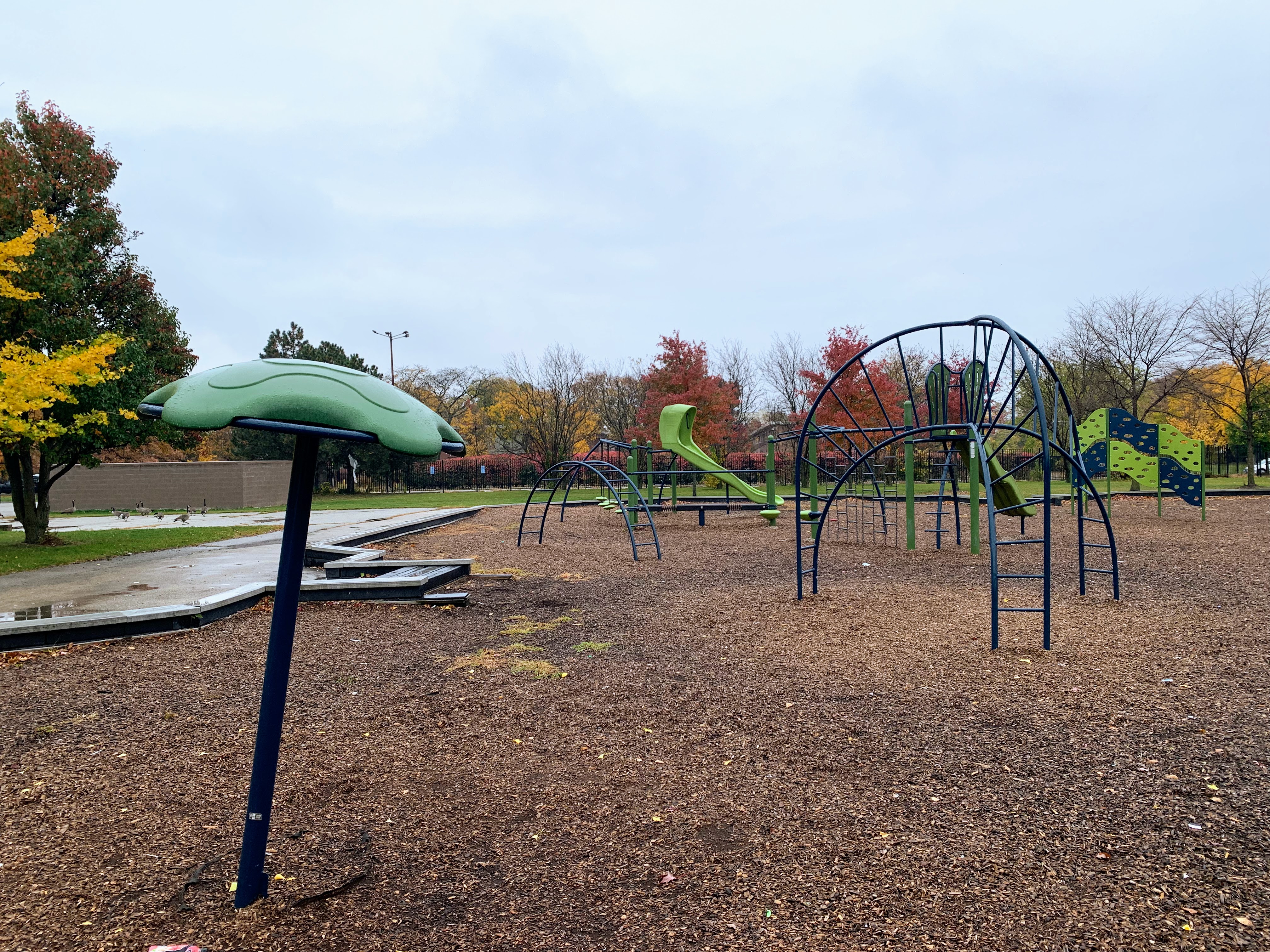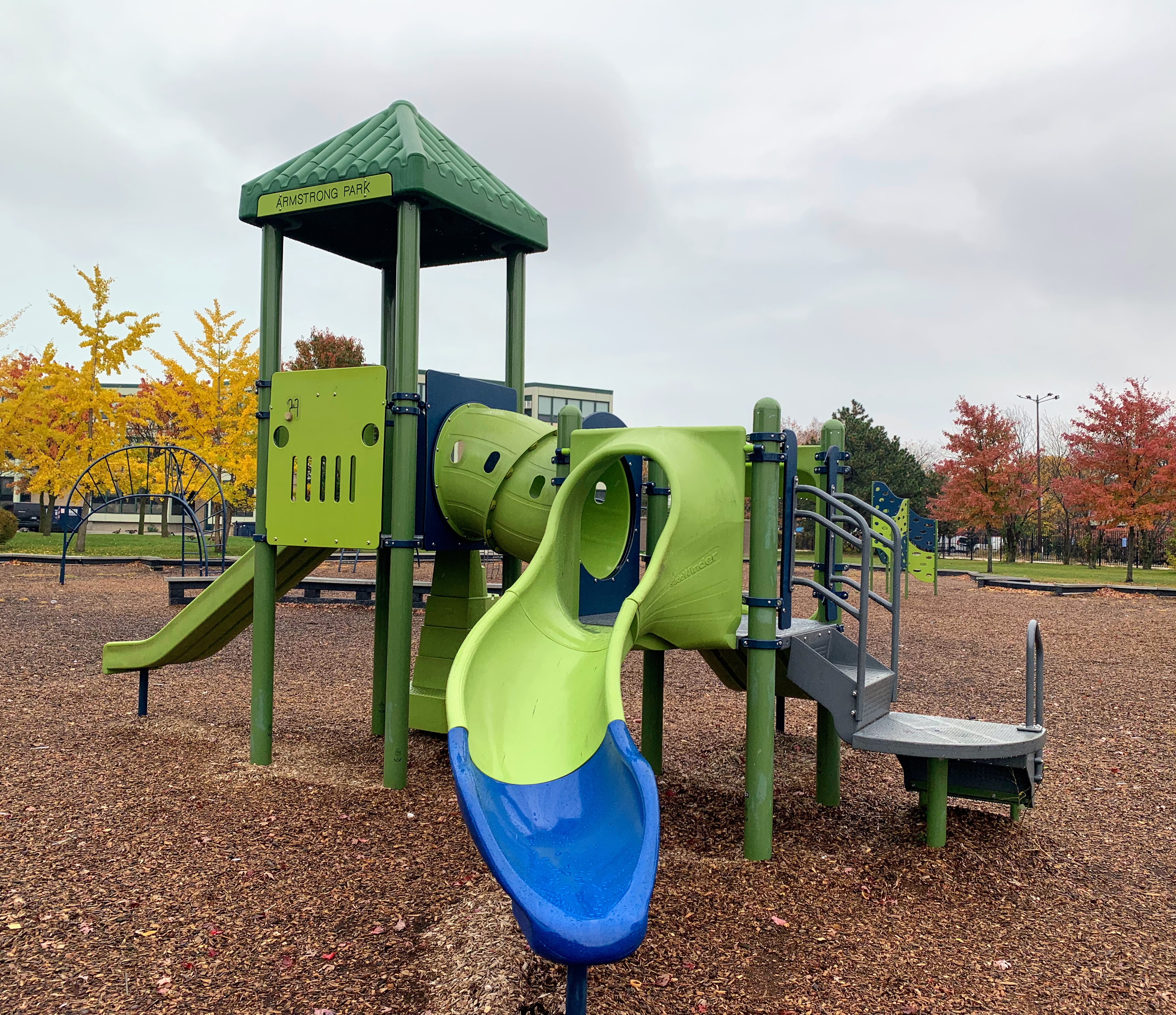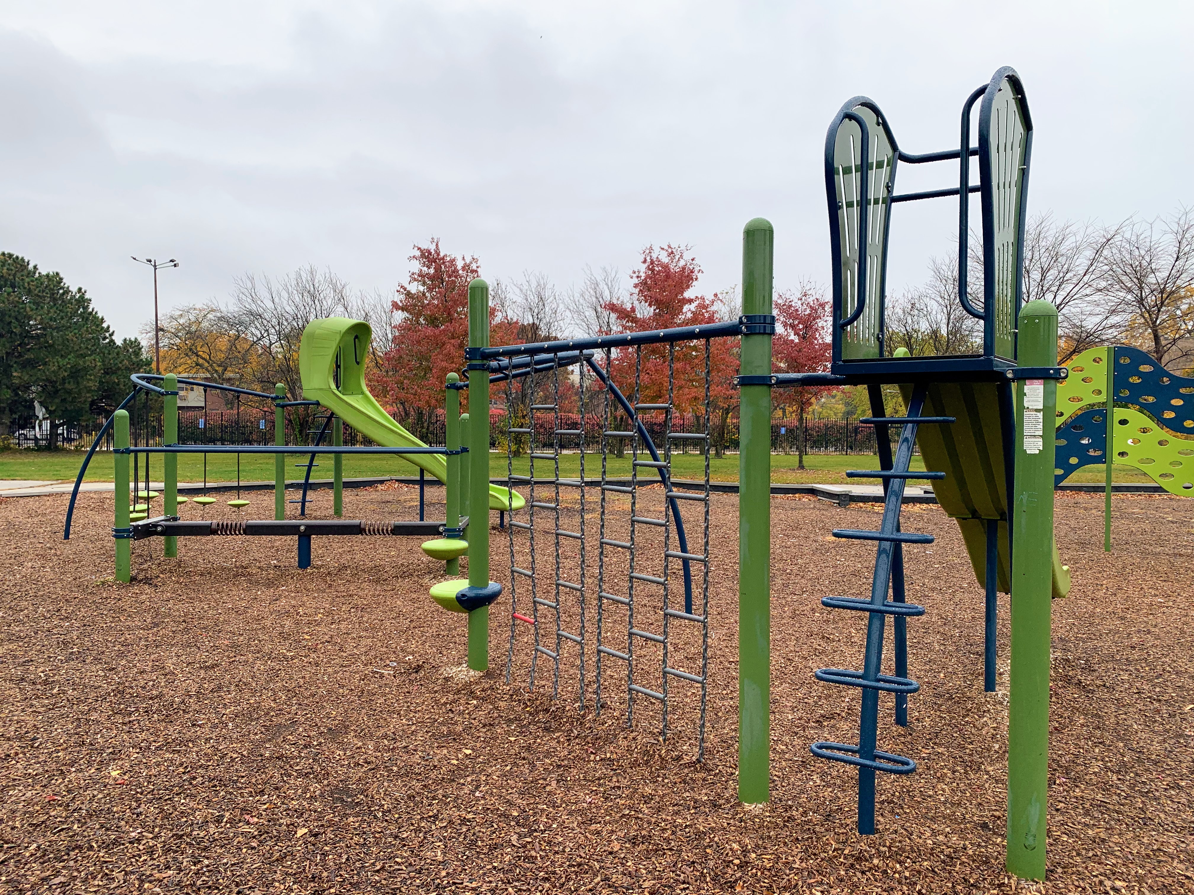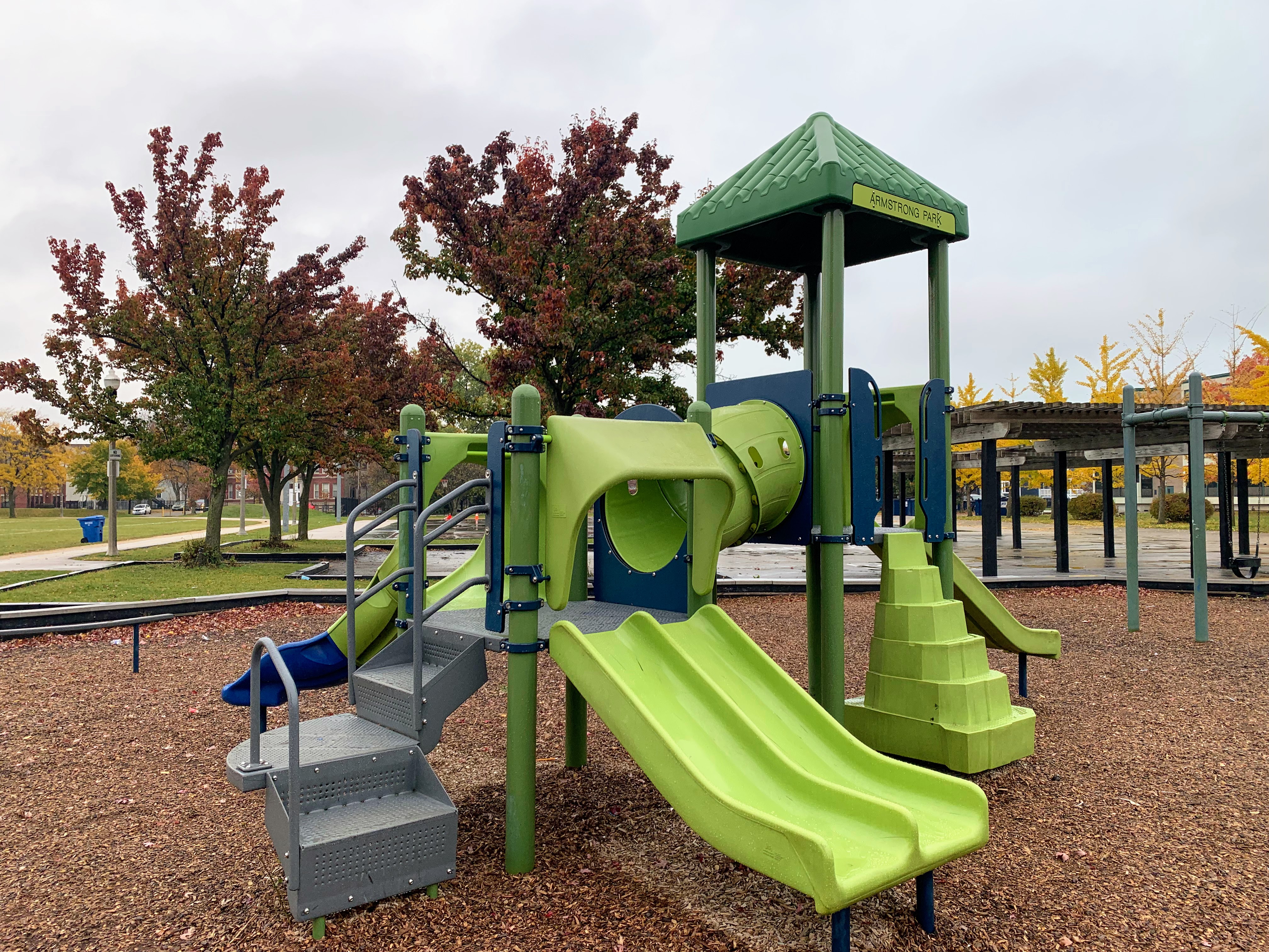 Armstrong Park - named for Lillian Hardin Armstrong, a jazz musician and composer who was married to Louis Armstrong - is a large park with a large playground. The playground features an area for younger children with a small play structure and toddler swings. The rest of the site features an assortment of standalone elements for older children; some are connected but there aren't standard ladders to raised platforms in this park for older children.
