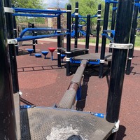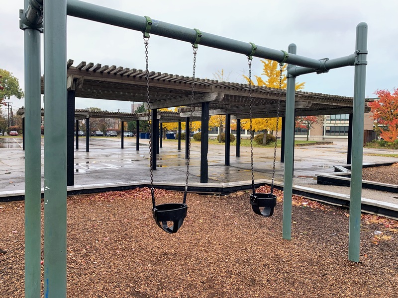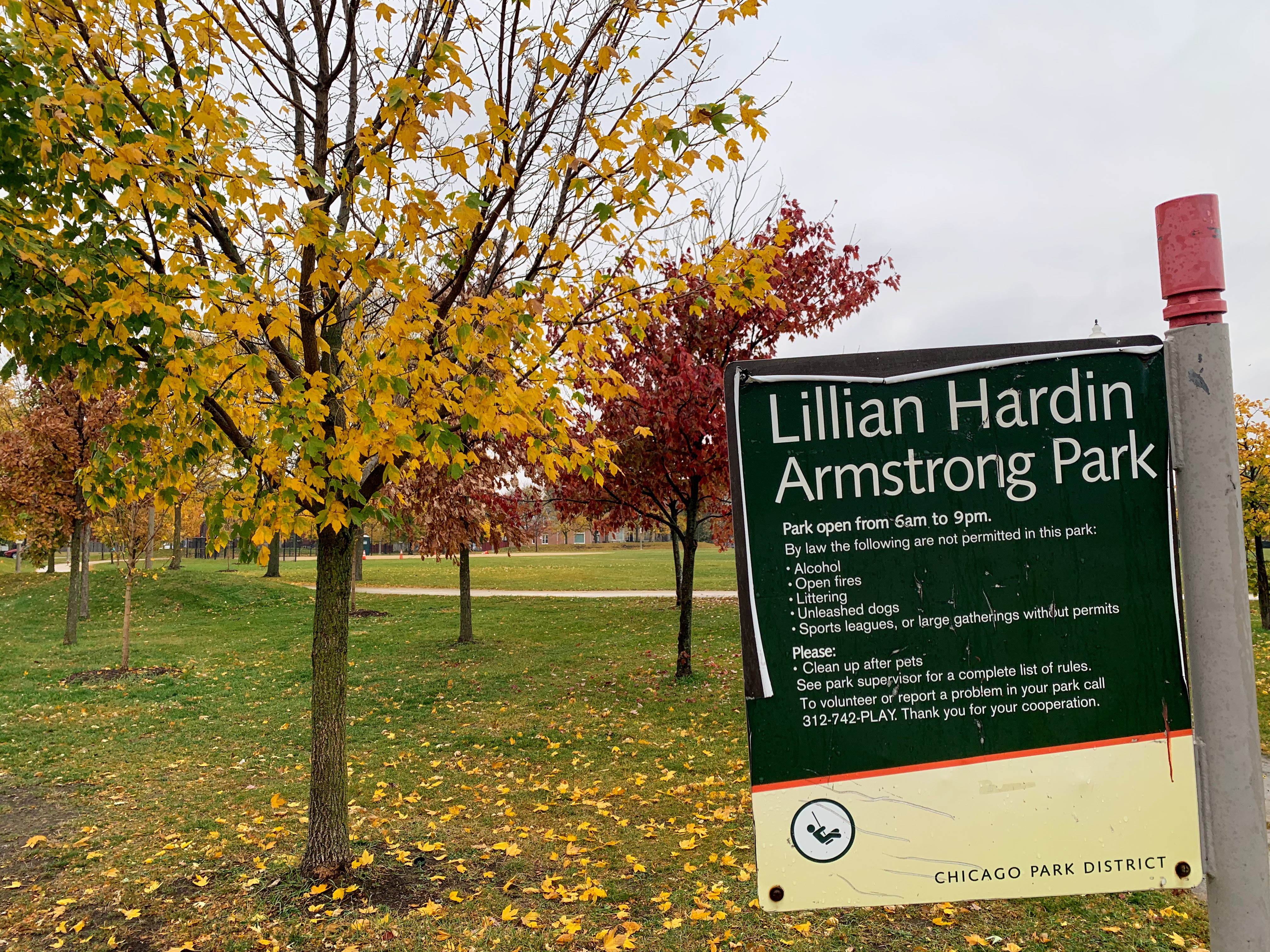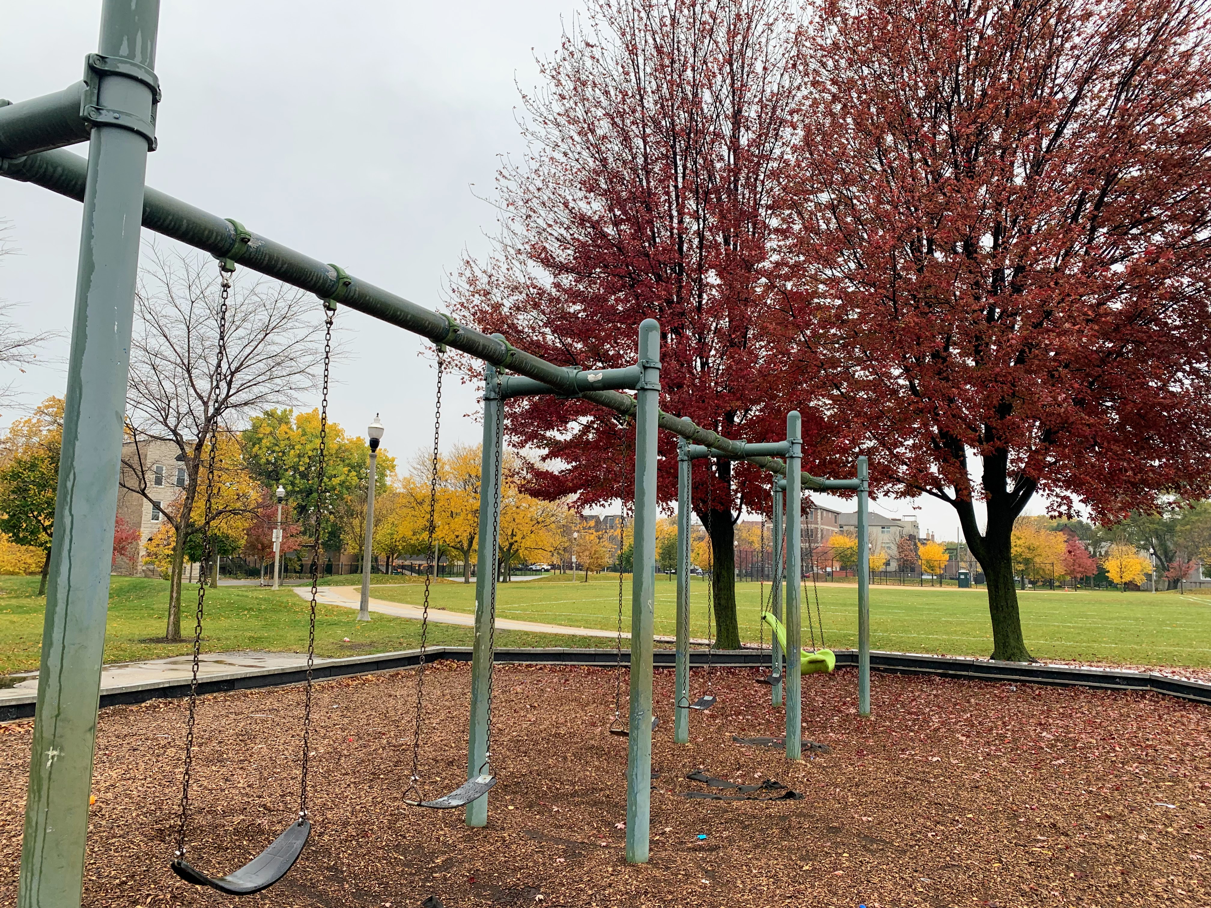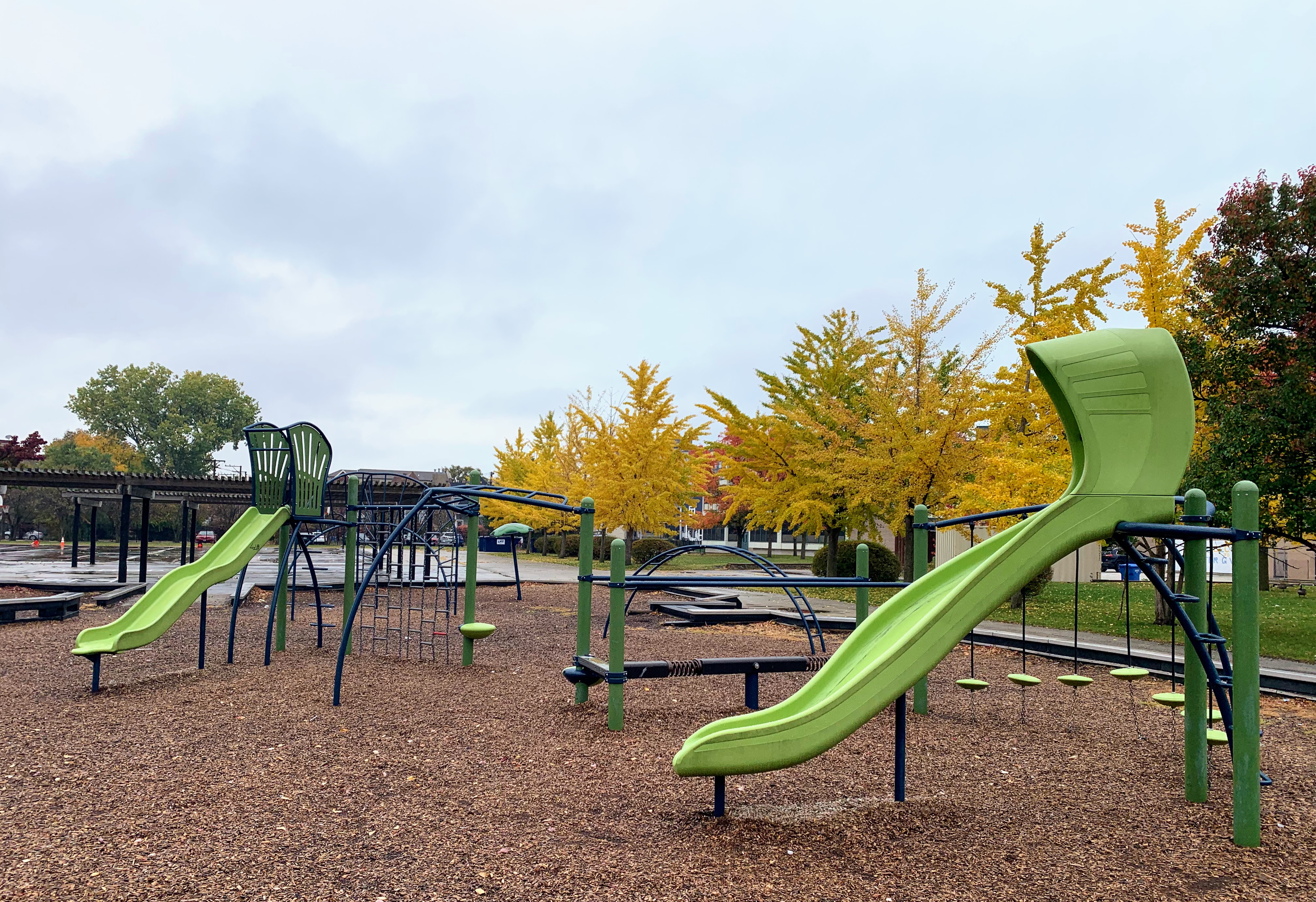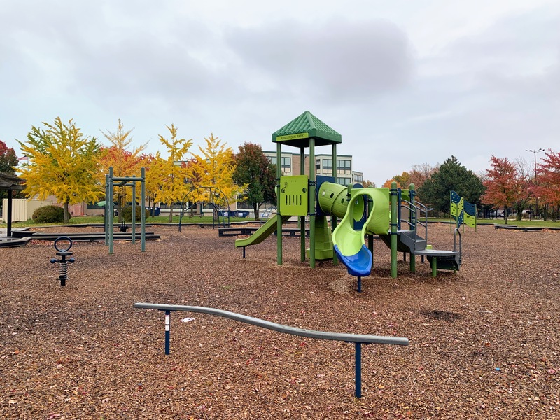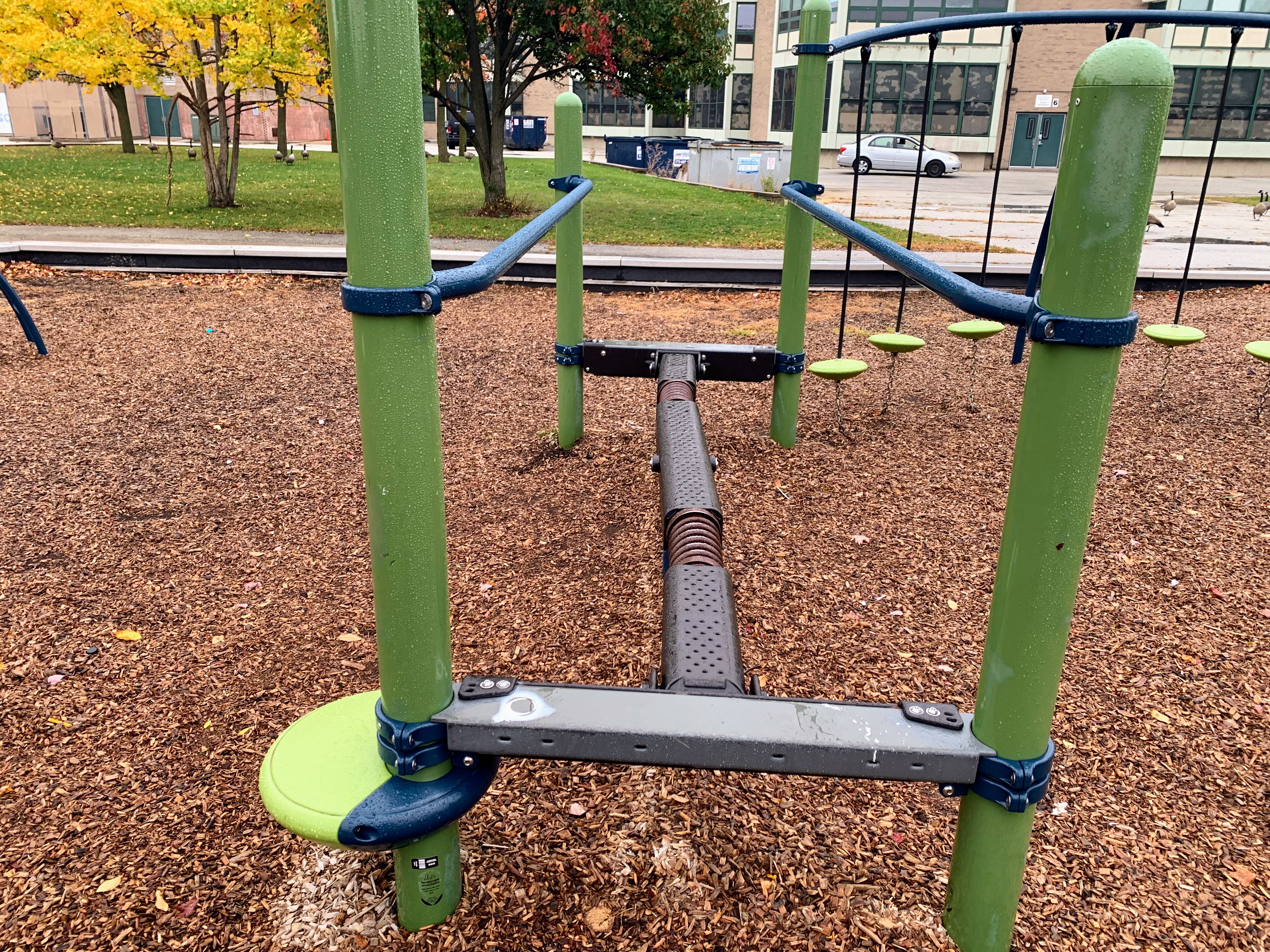 Armstrong Park - named for Lillian Hardin Armstrong, a jazz musician and composer who was married to Louis Armstrong - is a large park with a large playground. The playground features an area for younger children with a small play structure and toddler swings. The rest of the site features an assortment of standalone elements for older children; some are connected but there aren't standard ladders to raised platforms in this park for older children.