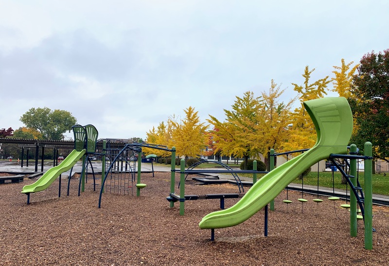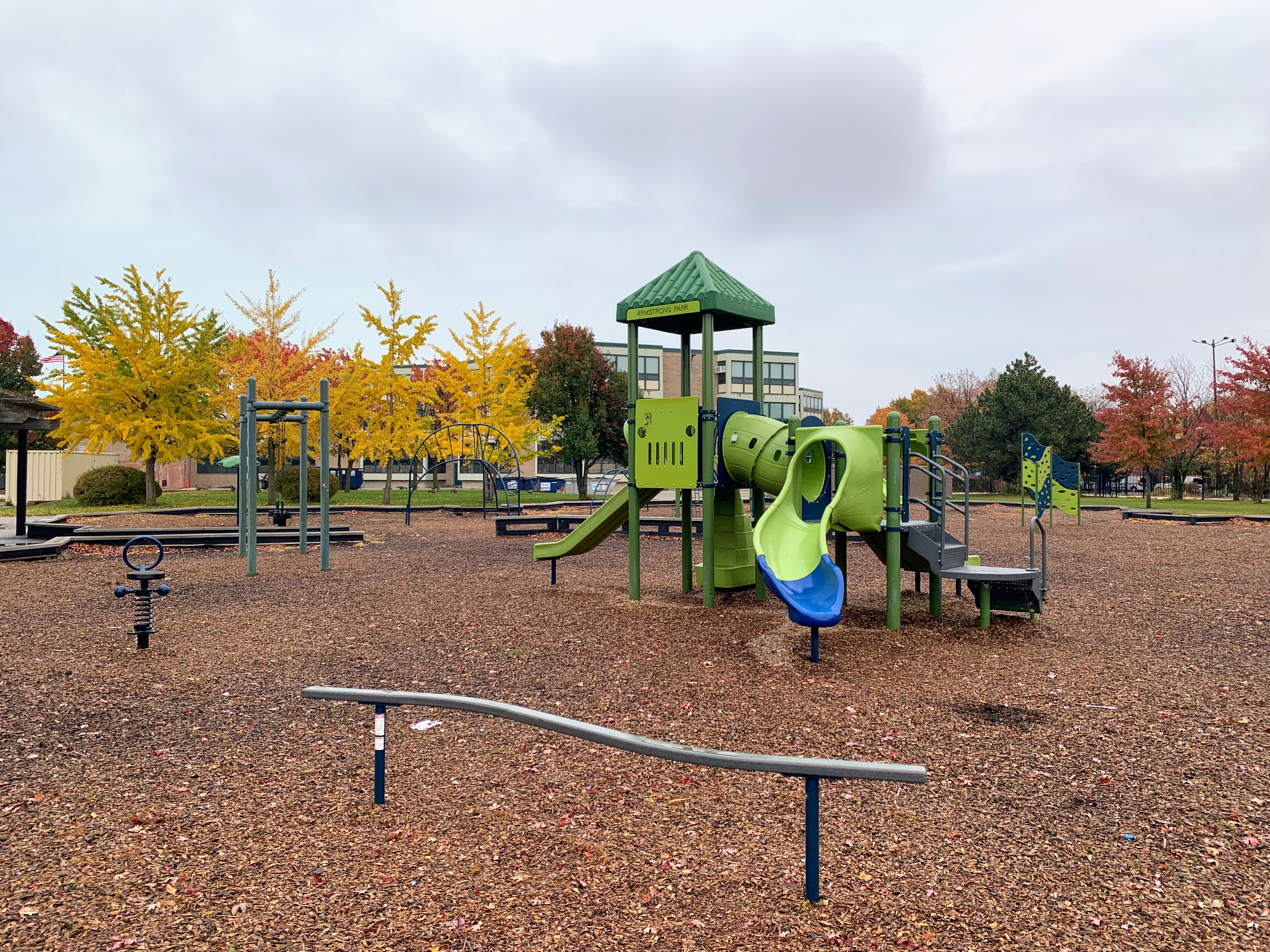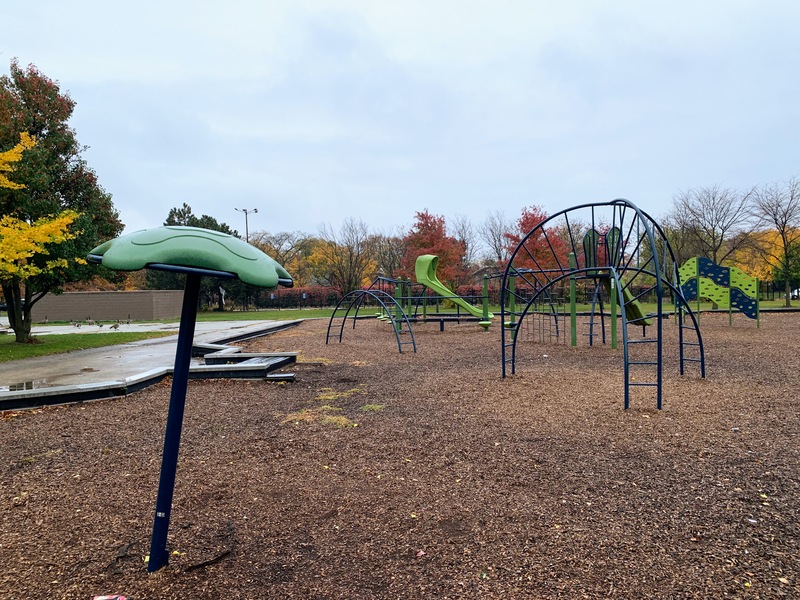 The rest of the park is beautiful with trees, ballfields and a walking path, but the area surrounding this playground is somewhat strange. The play site itself is a large wood chipped area that lacks seating (like benches or picnic tables) and shade. There is a shade pavilion nearby that offers some respite, but the size and general emptiness of the play area are somewhat strange. So while I have some quibbles with the design choices of this playground, I still think it's a decent neighborhood playground. - Playground Features