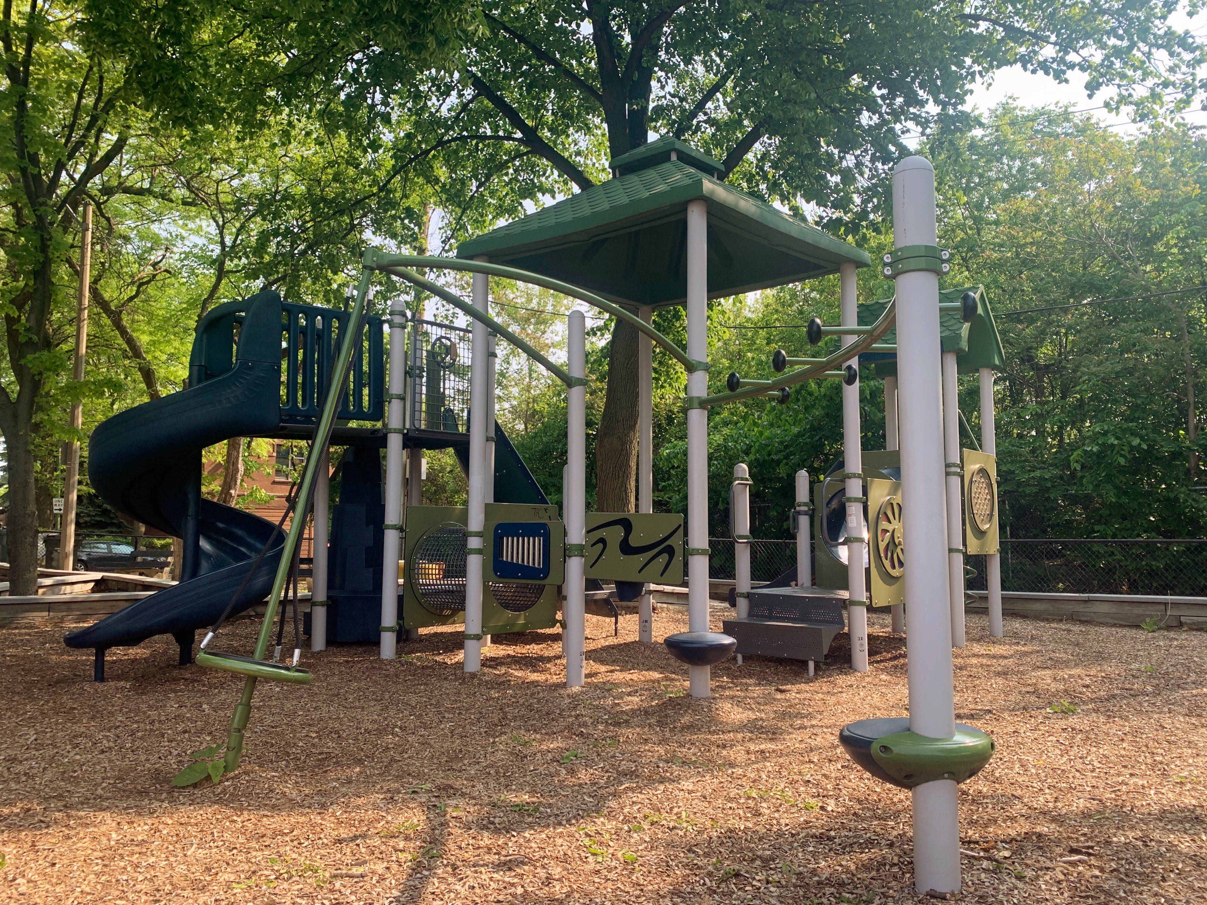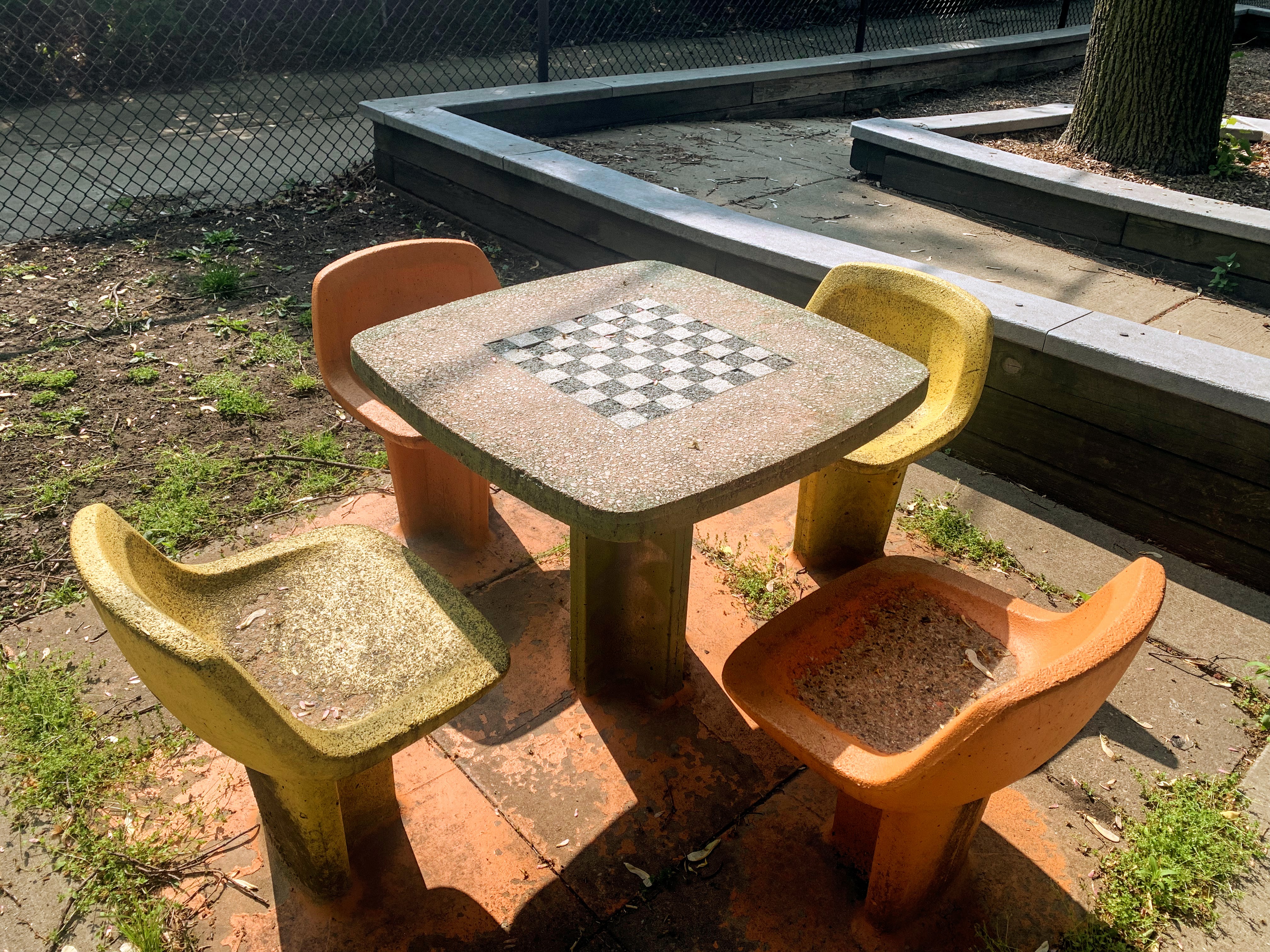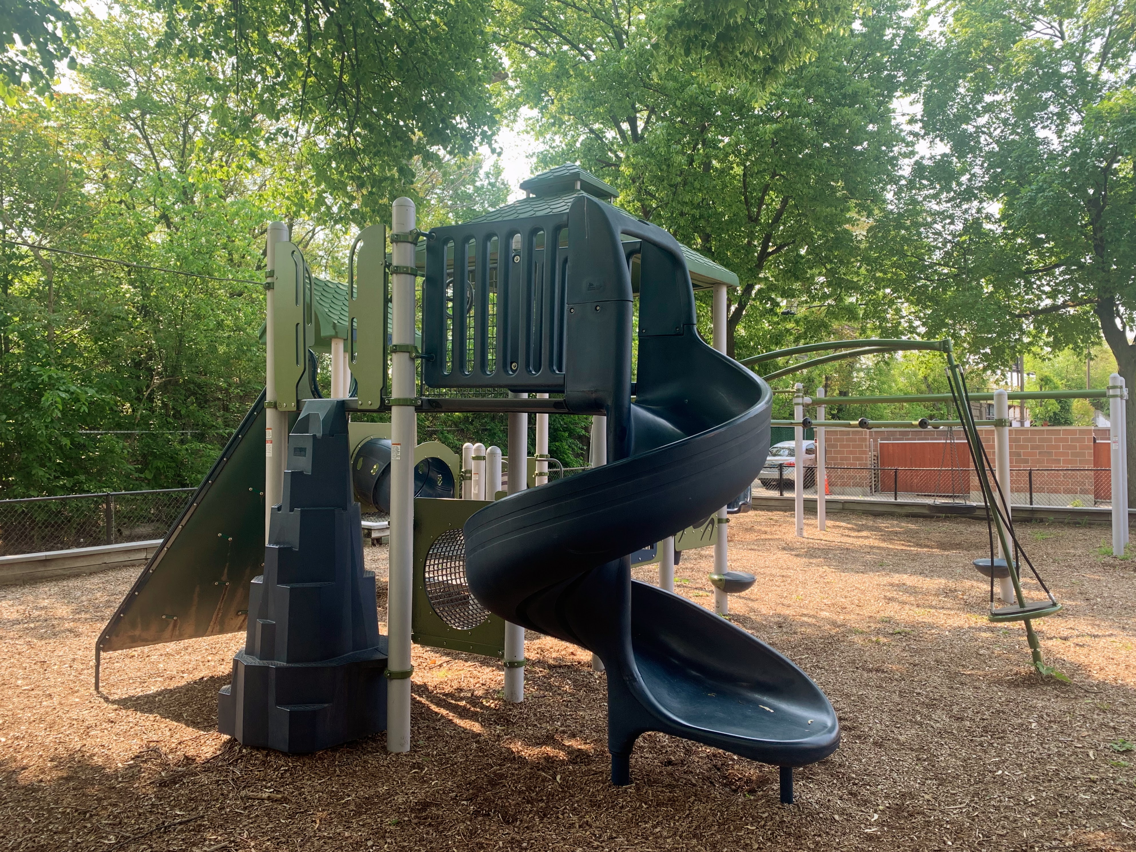 The non-play amenities are okay with some exceptional shade from the large tree on and surrounding the site. There are benches, a drinking fountain, and a small table with a chessboard on the surface. The play area is fully enclosed and the play surface is wood chips. All in all, this playground is a shady and quiet spot to spend a day at the park. - Playground Features
