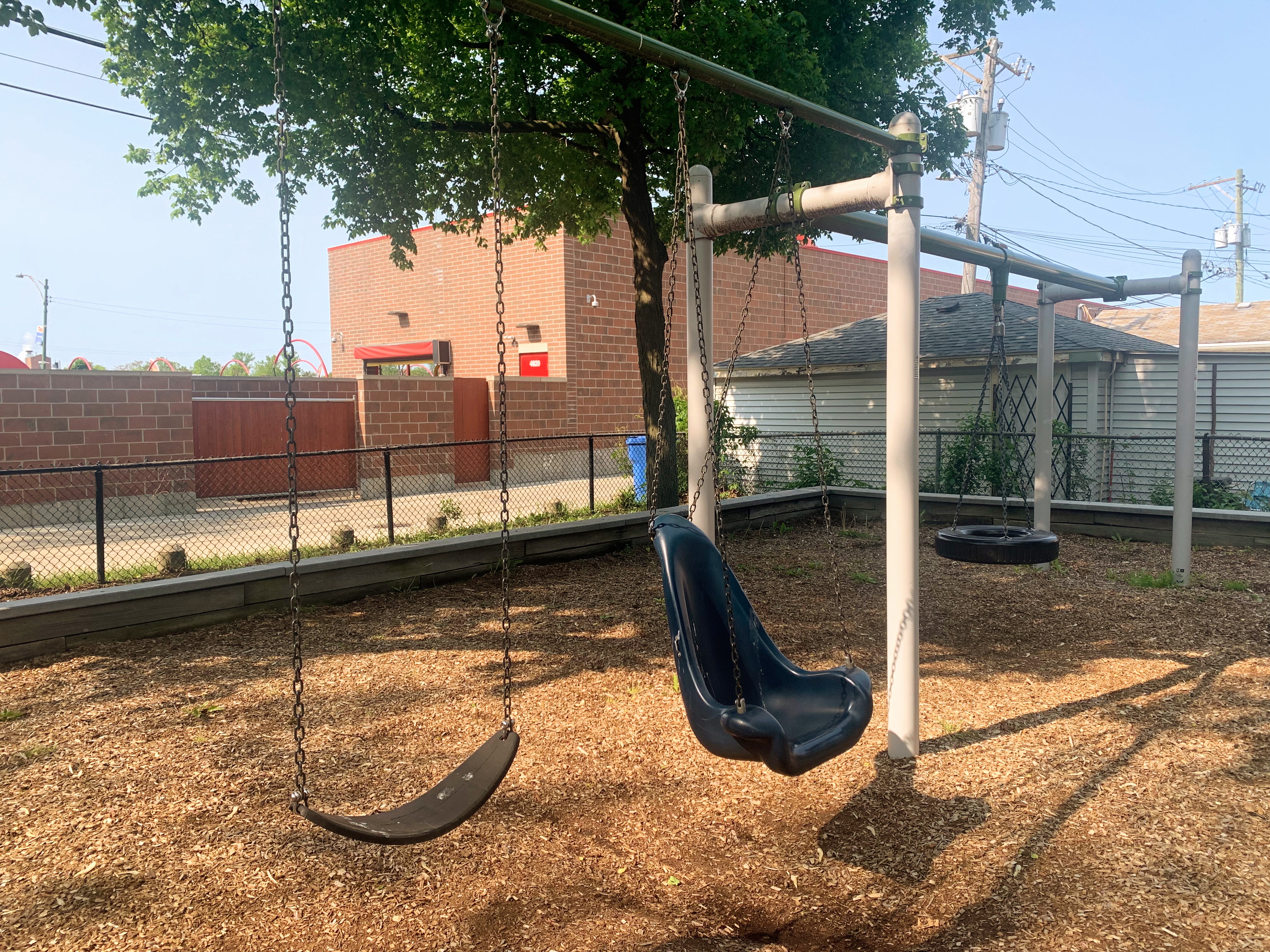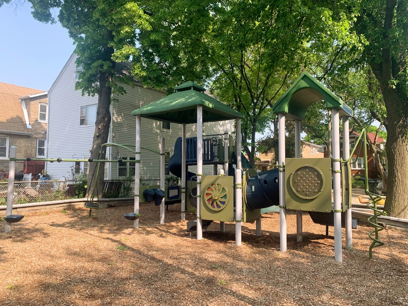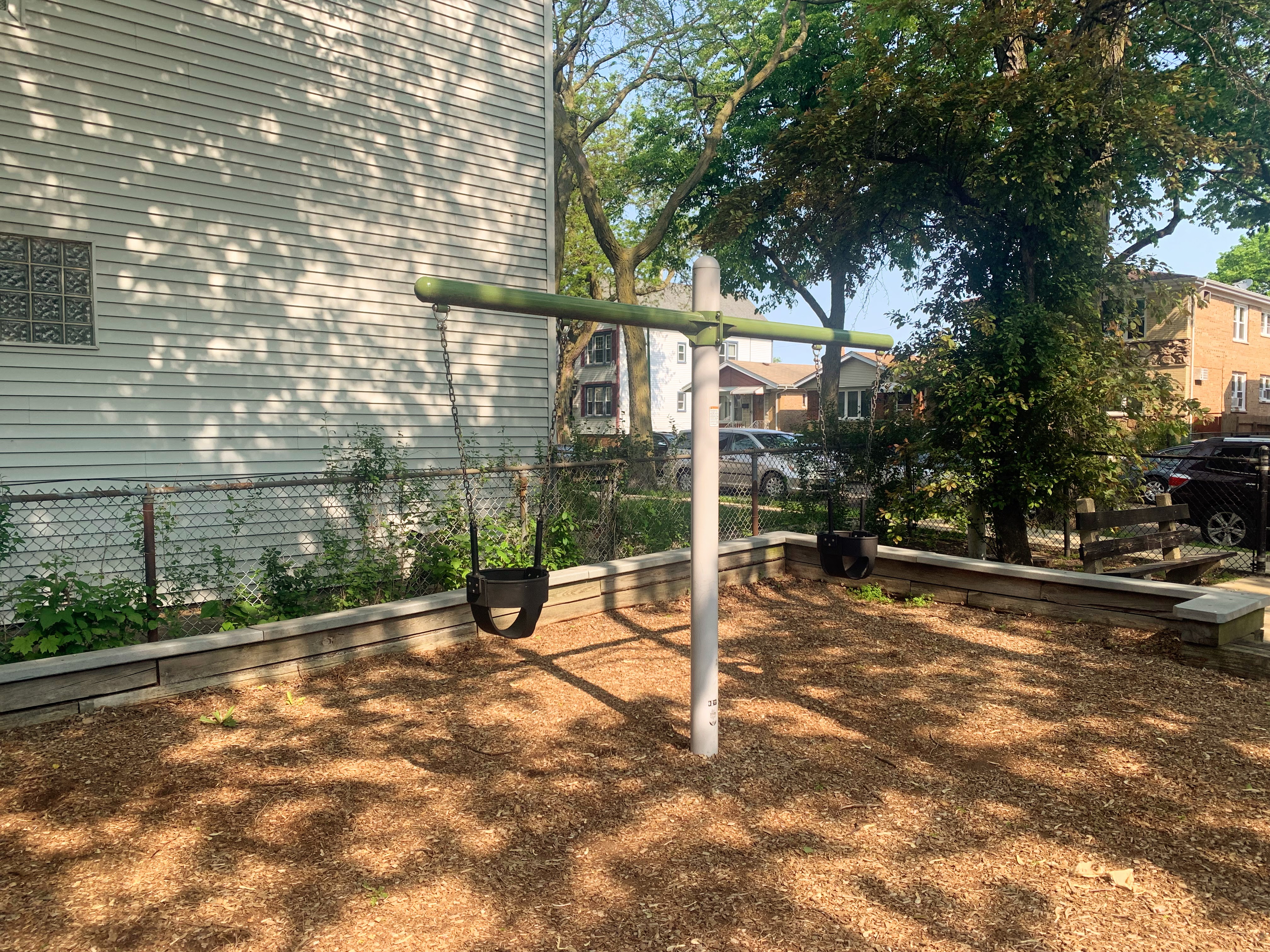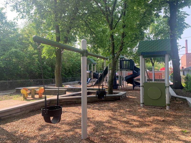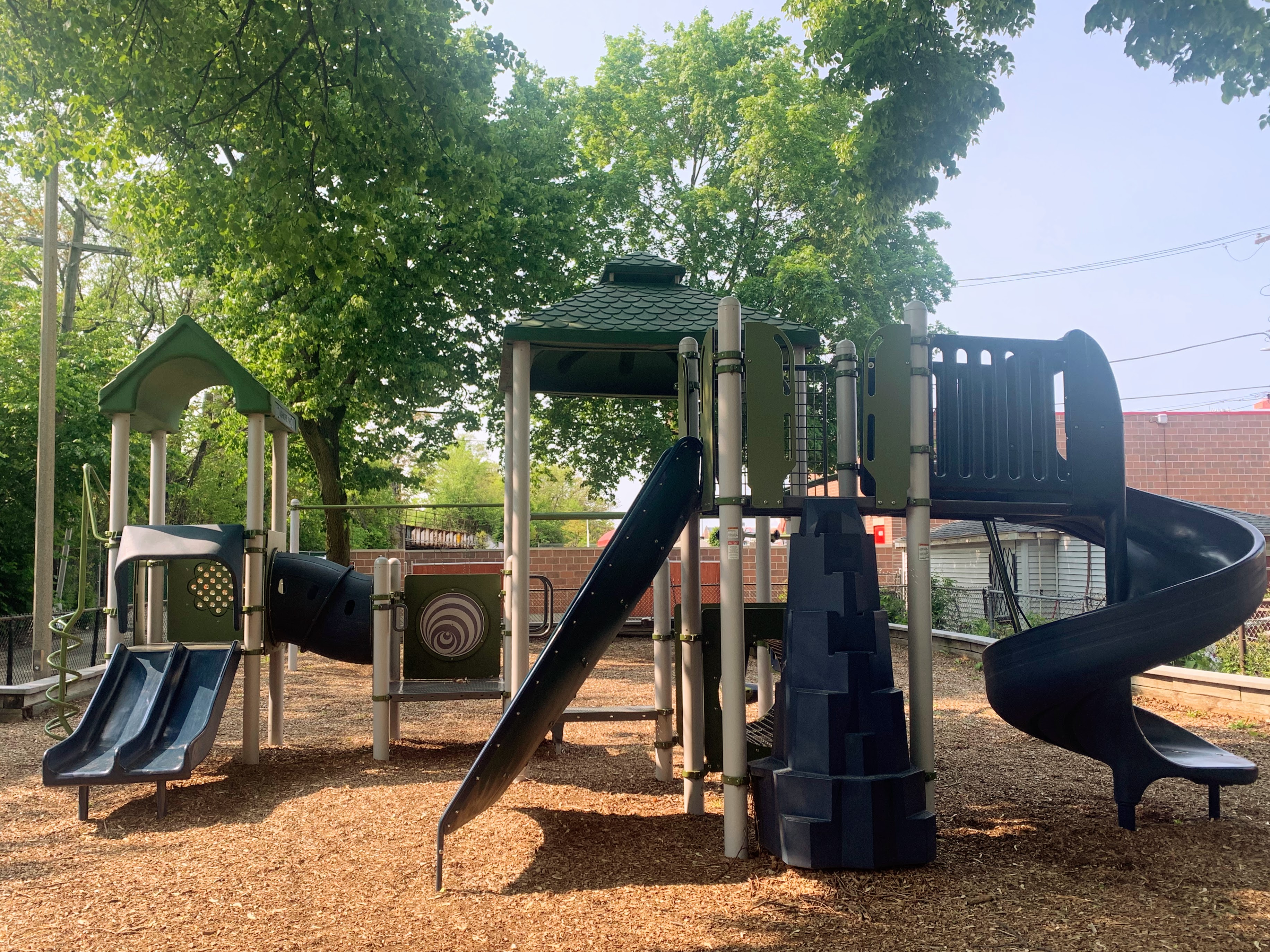 The non-play amenities are okay with some exceptional shade from the large tree on and surrounding the site. There are benches, a drinking fountain, and a small table with a chessboard on the surface. The play area is fully enclosed and the play surface is wood chips. All in all, this playground is a shady and quiet spot to spend a day at the park. - Playground Features