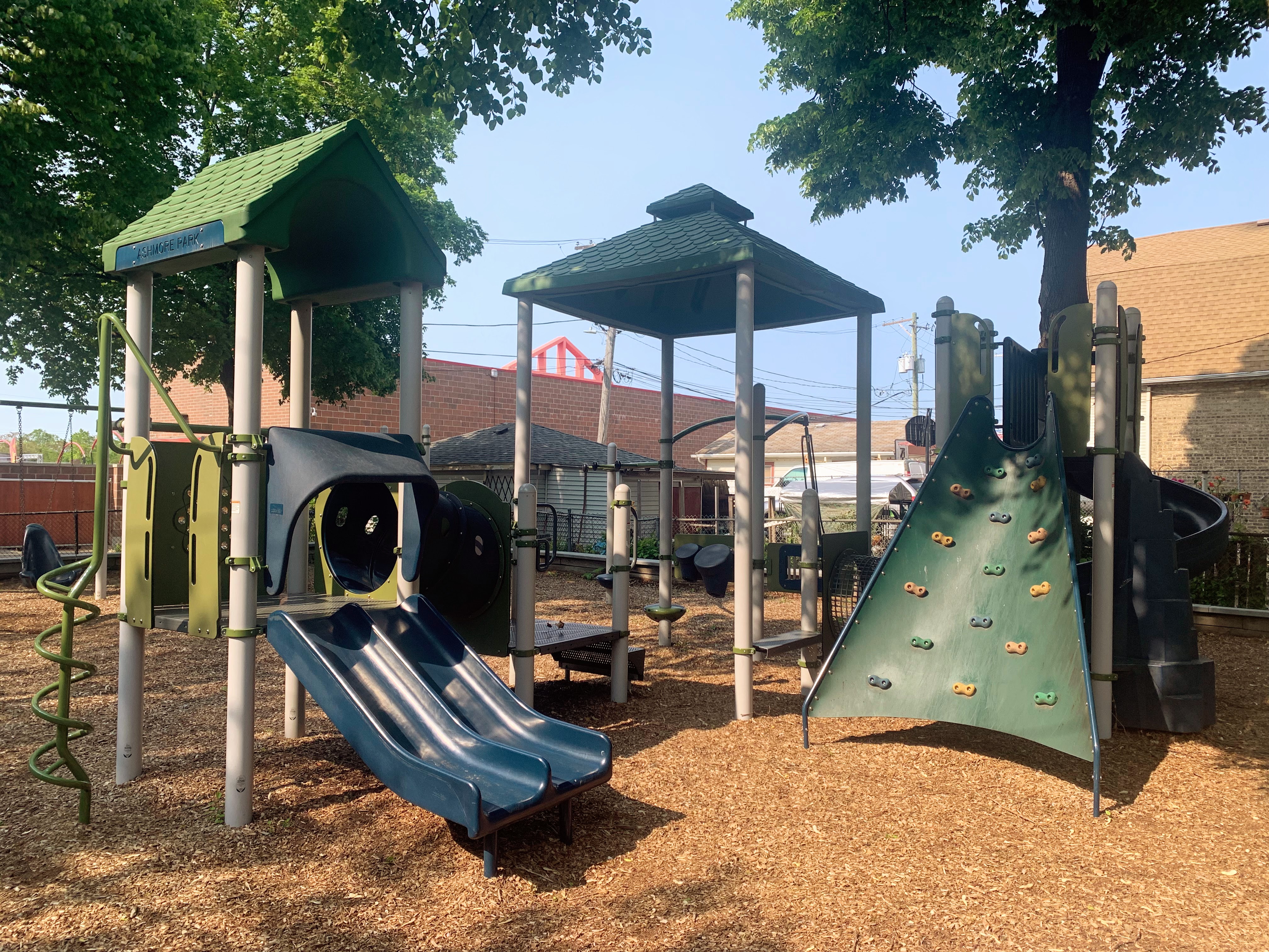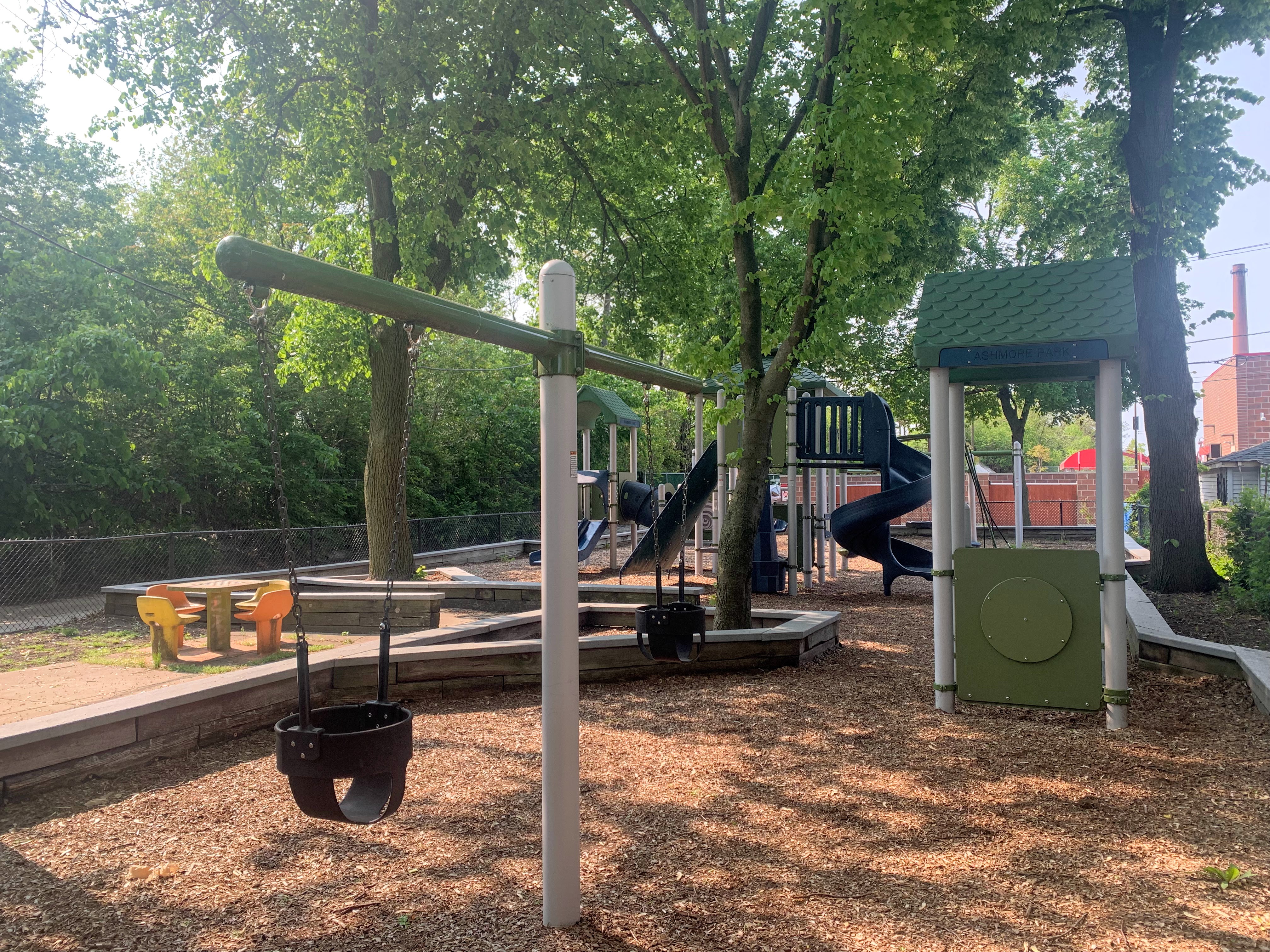 Ashmore Park is a tiny neighborhood park on a residential street with a great little playground. There is a large structure with all the basics (slides, climbing elements, a variation on monkey bars, etc.) and some interactive panels. There are various swings including a toddler, belt, adaptive, and tire variations.