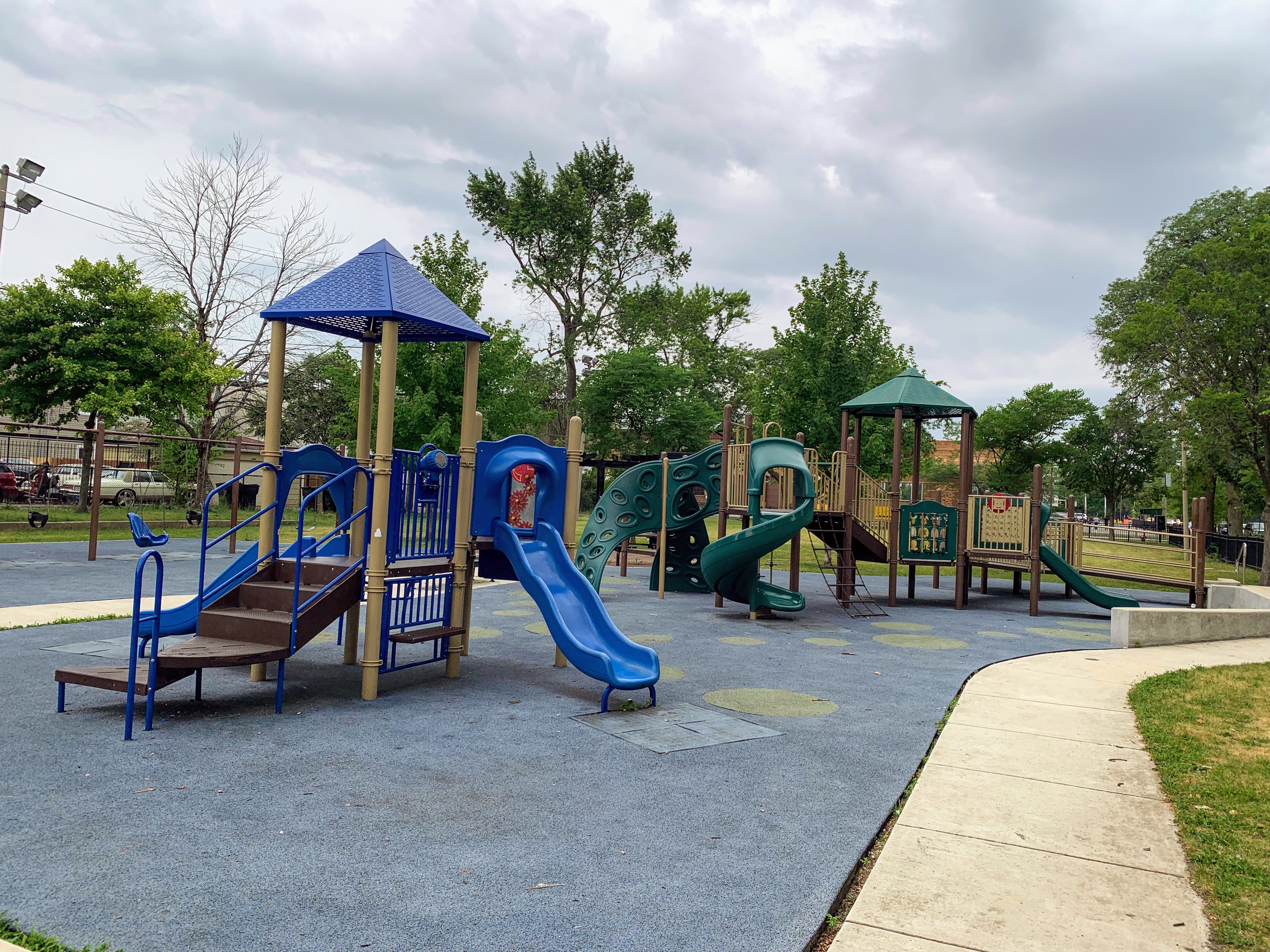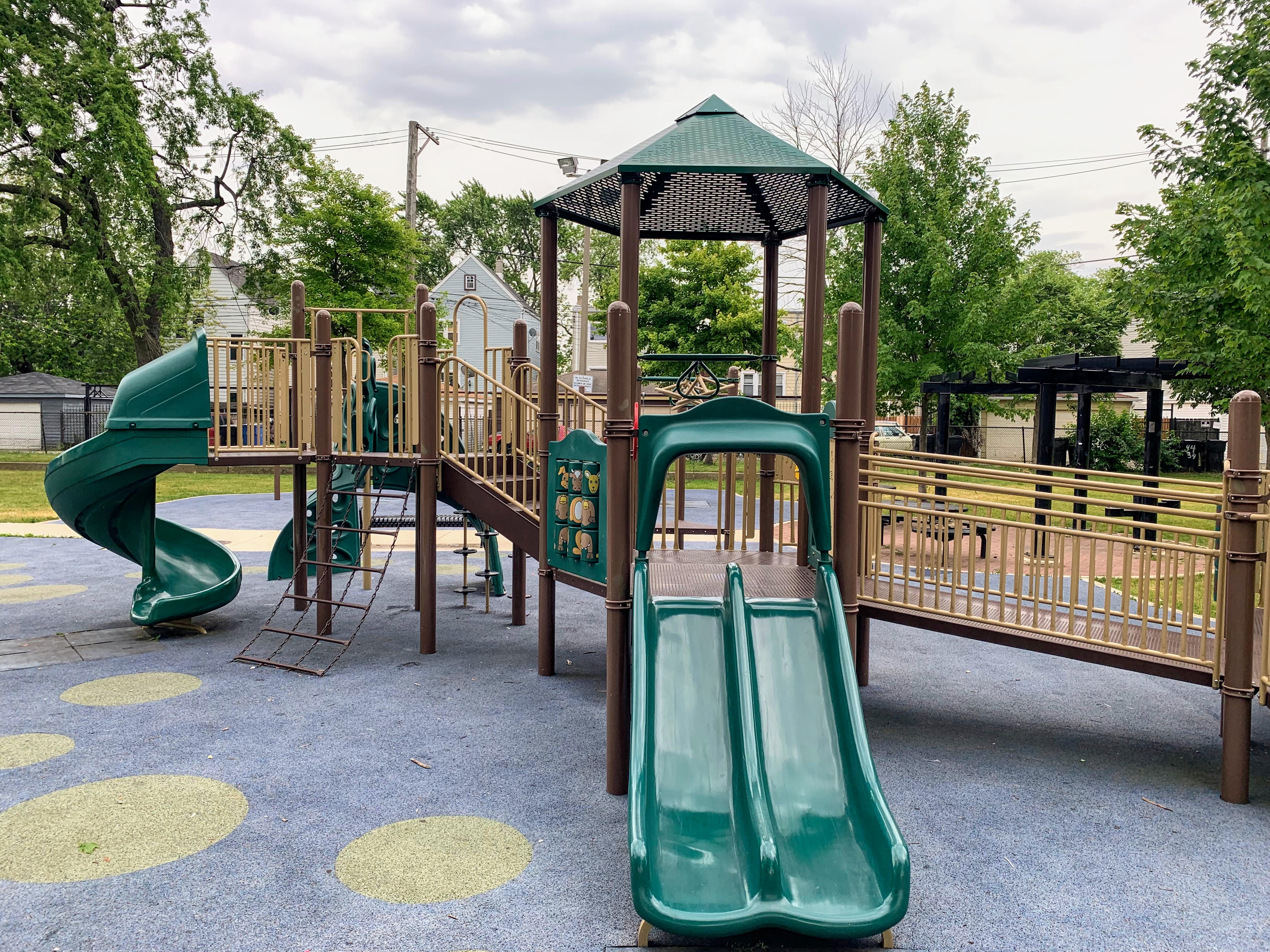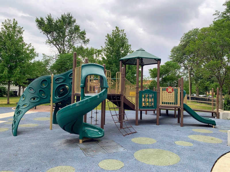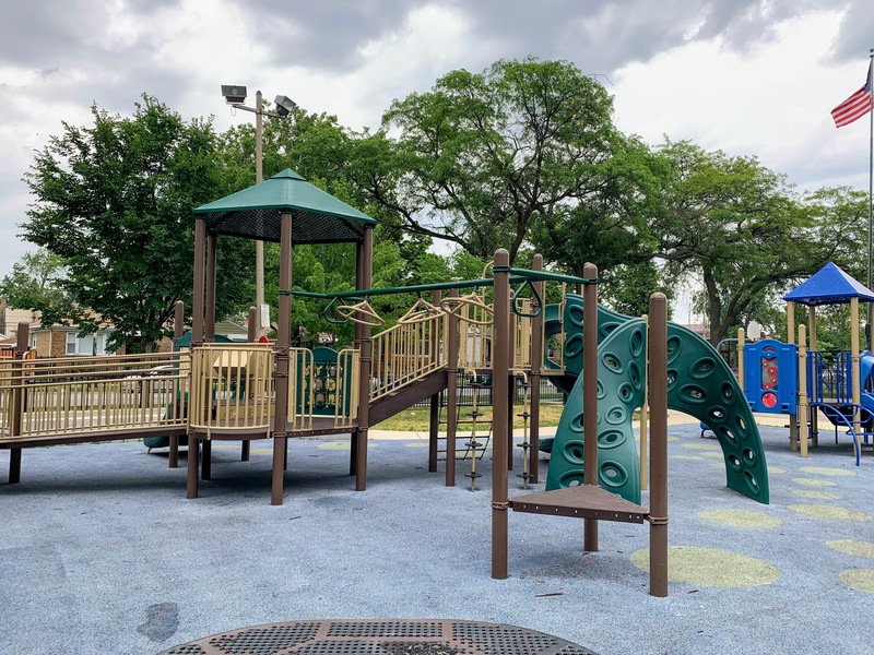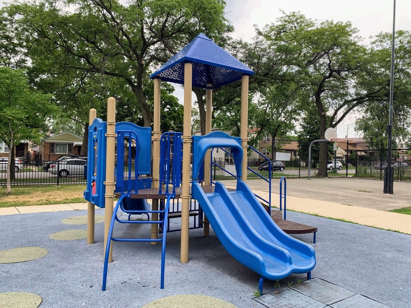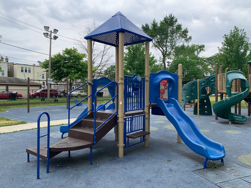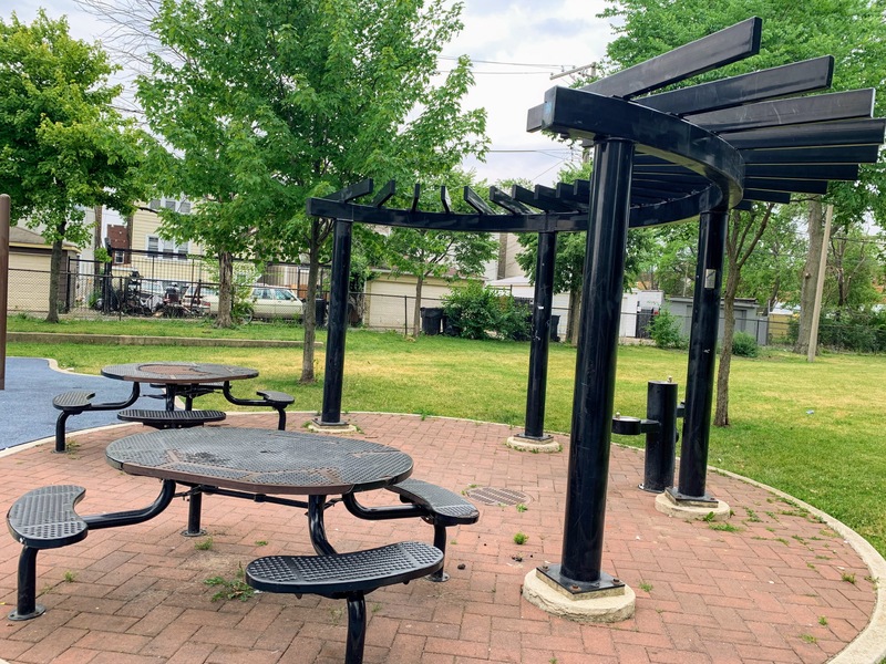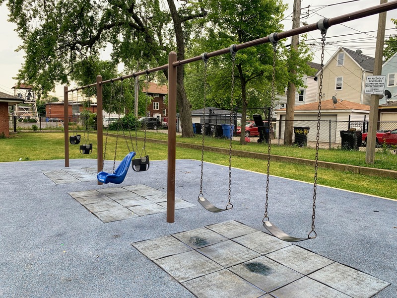 - Augusta Park features a playground with two play structures and the standard Chicago Park swings. The smaller play structure is designed for younger children and is relatively small. The other structure is much larger and features a few slides, interactive panels, and overhead elements designed for older children. There are a couple of picnic tables and benches for seating. The play area is fully enclosed and boasts a soft rubber play surface. The playground itself is bright and sunny without much shade and there is a grassy area next to the playground.