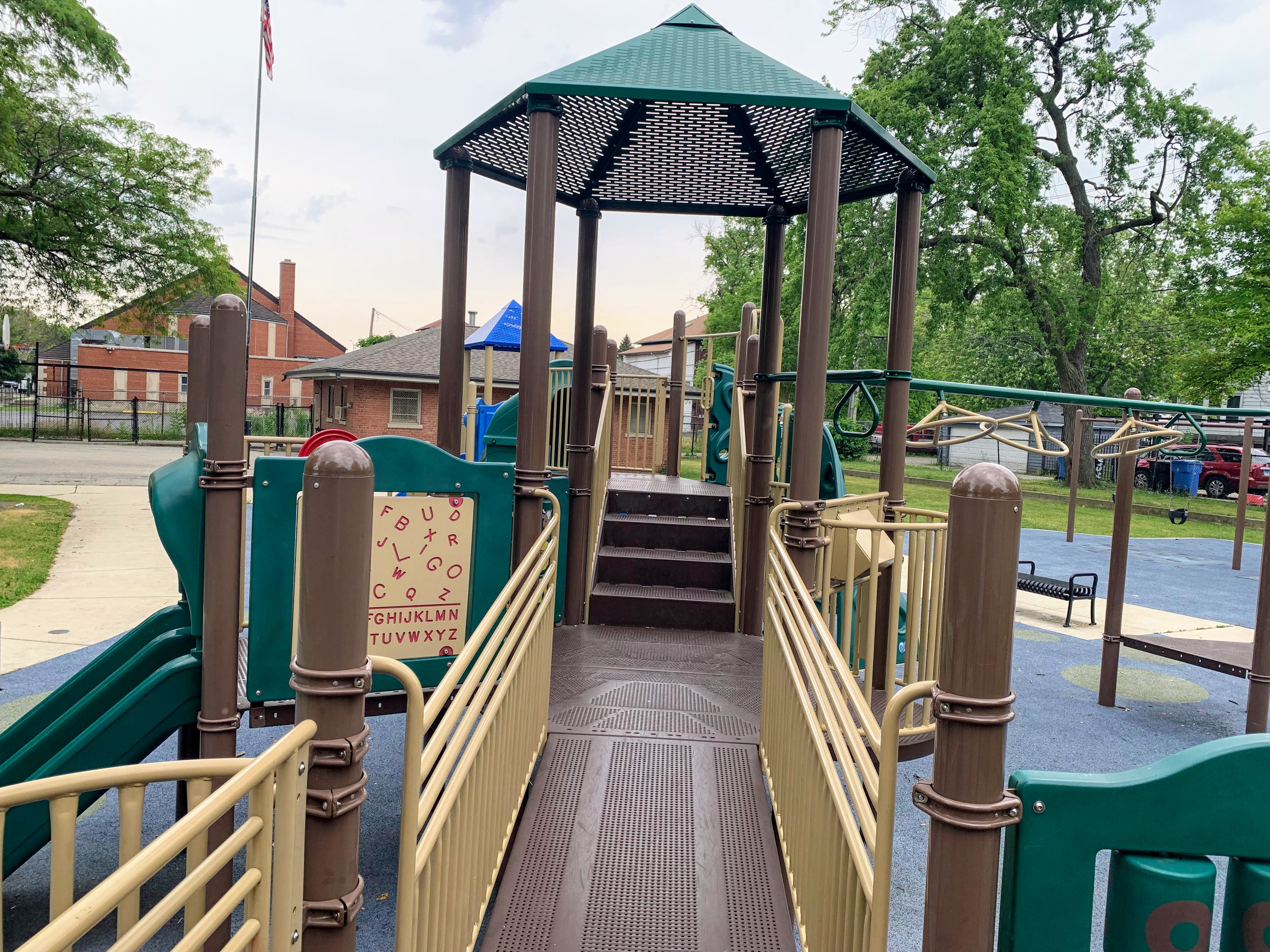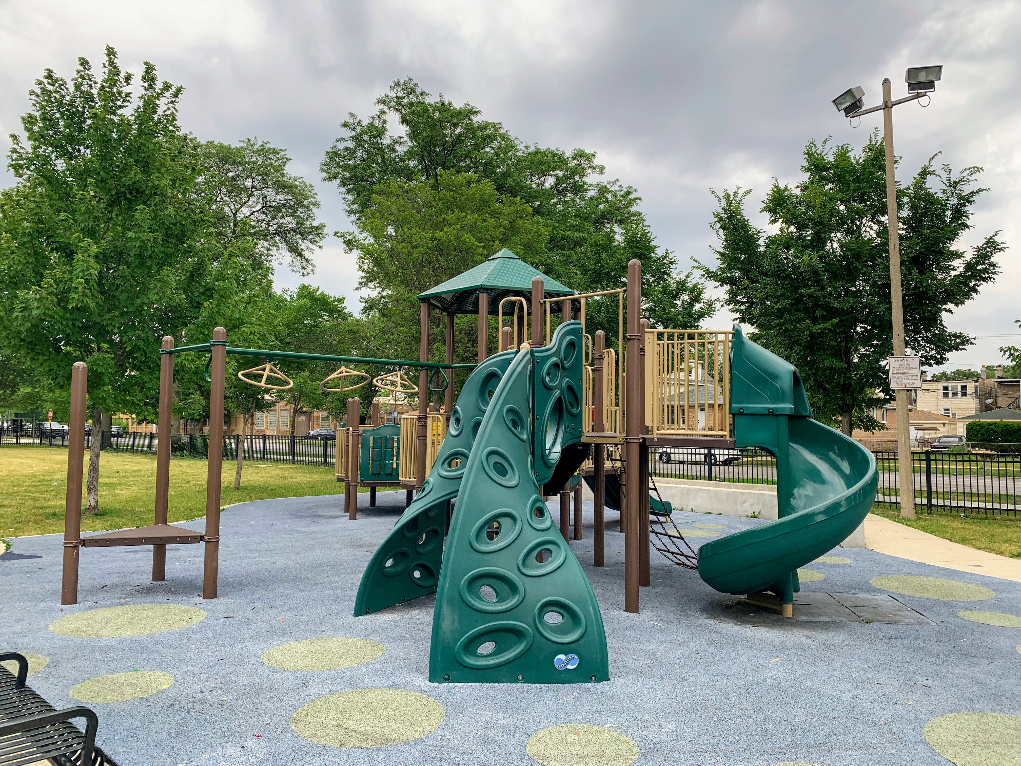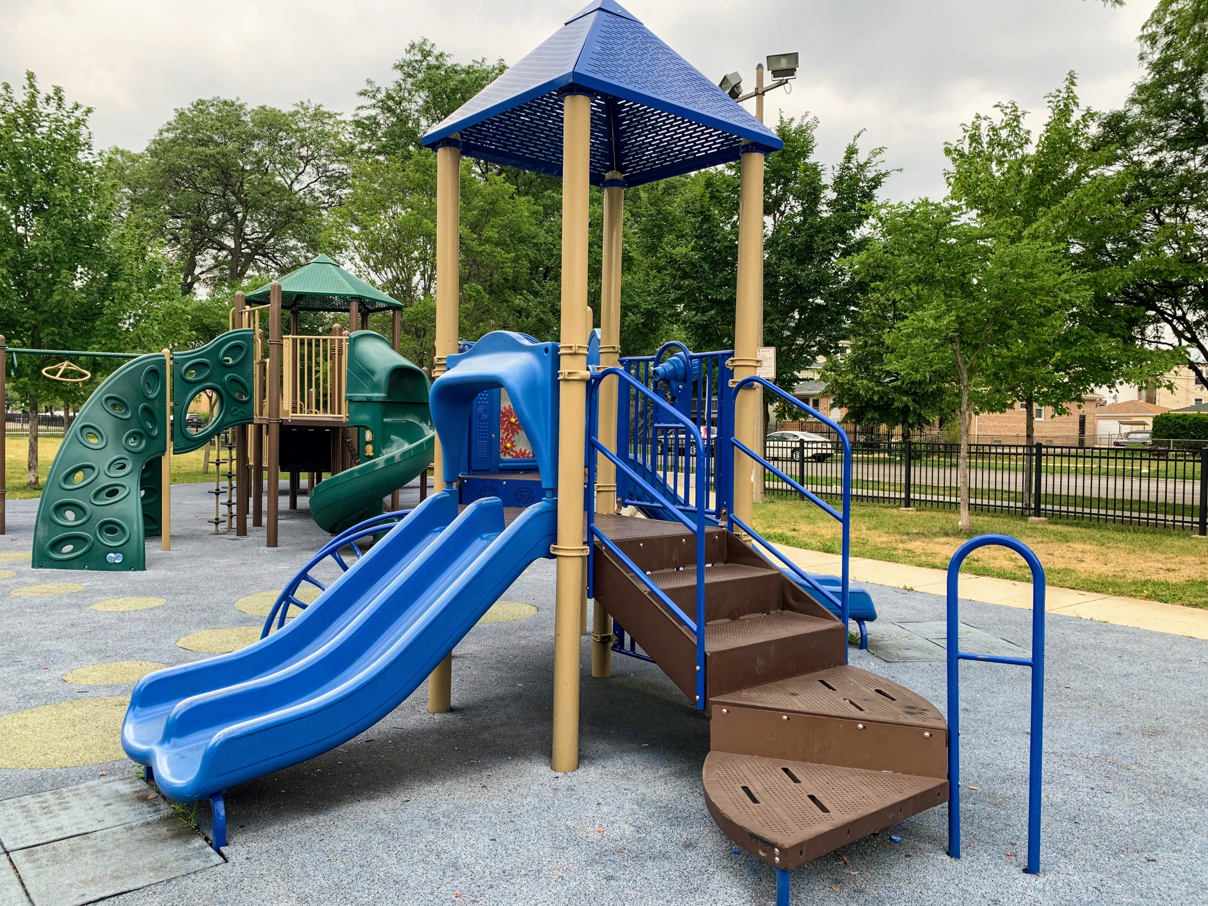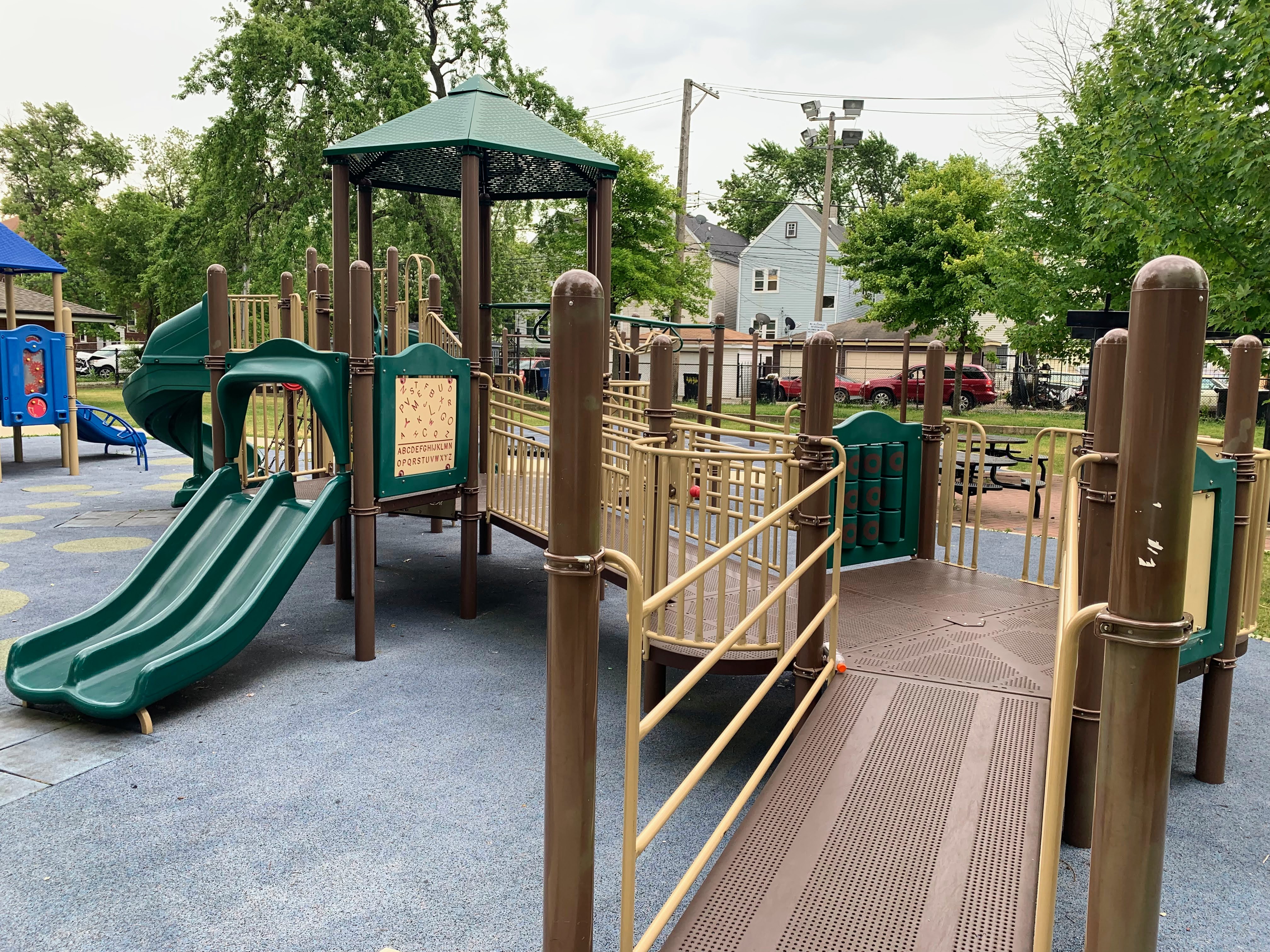 - Augusta Park features a playground with two play structures and the standard Chicago Park swings. The smaller play structure is designed for younger children and is relatively small. The other structure is much larger and features a few slides, interactive panels, and overhead elements designed for older children. There are a couple of picnic tables and benches for seating. The play area is fully enclosed and boasts a soft rubber play surface. The playground itself is bright and sunny without much shade and there is a grassy area next to the playground.