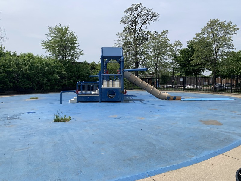The play area is not enclosed but it is shaded by large trees to the south. There is a bench near the park and bathroom access via the fieldhouse building near the water features. The play surface is wood chips. - Playground Features