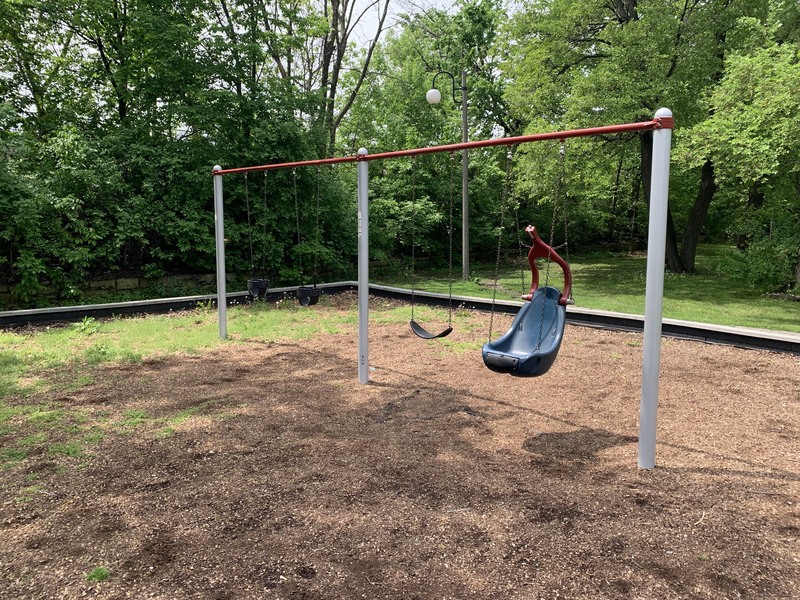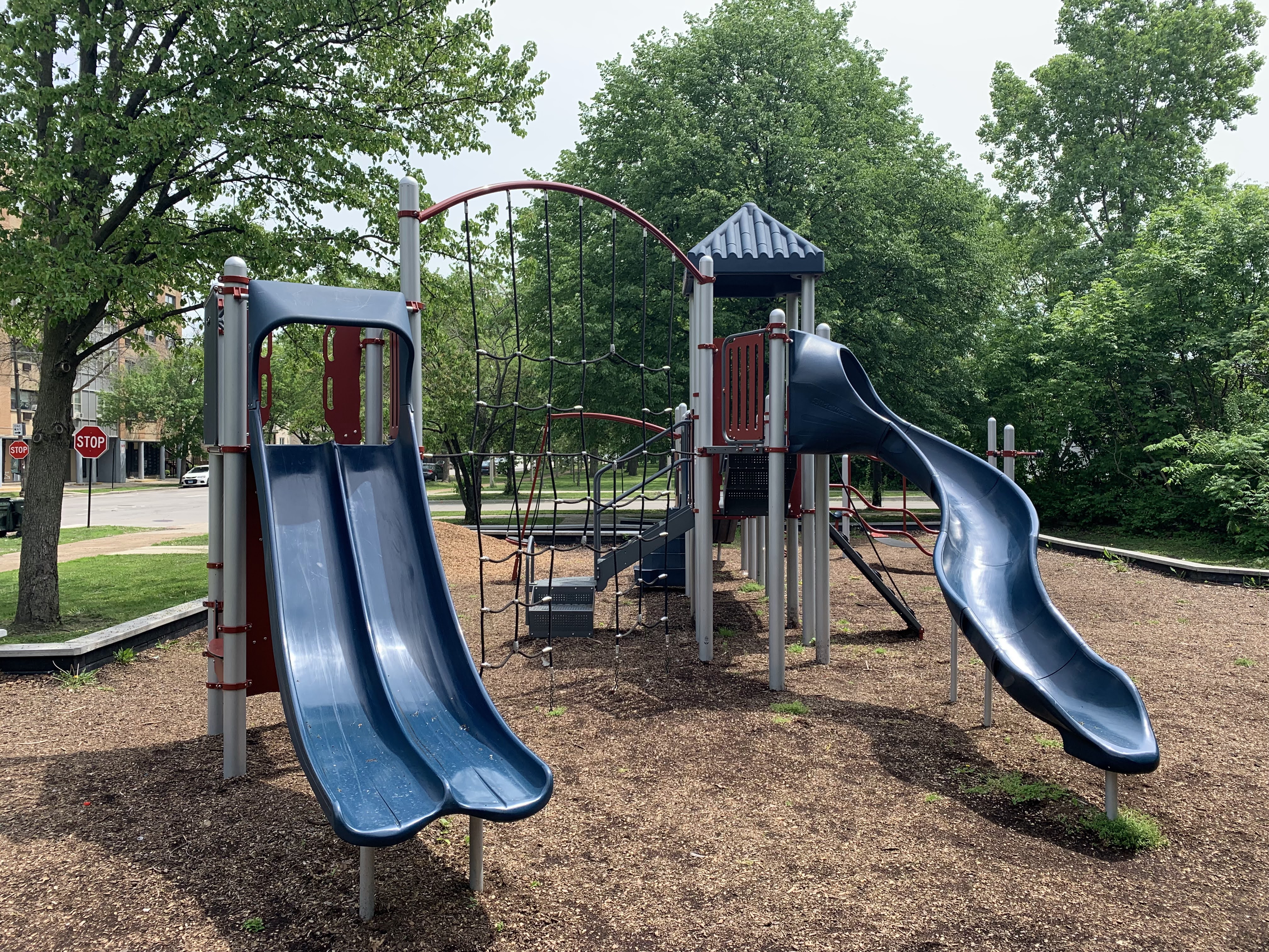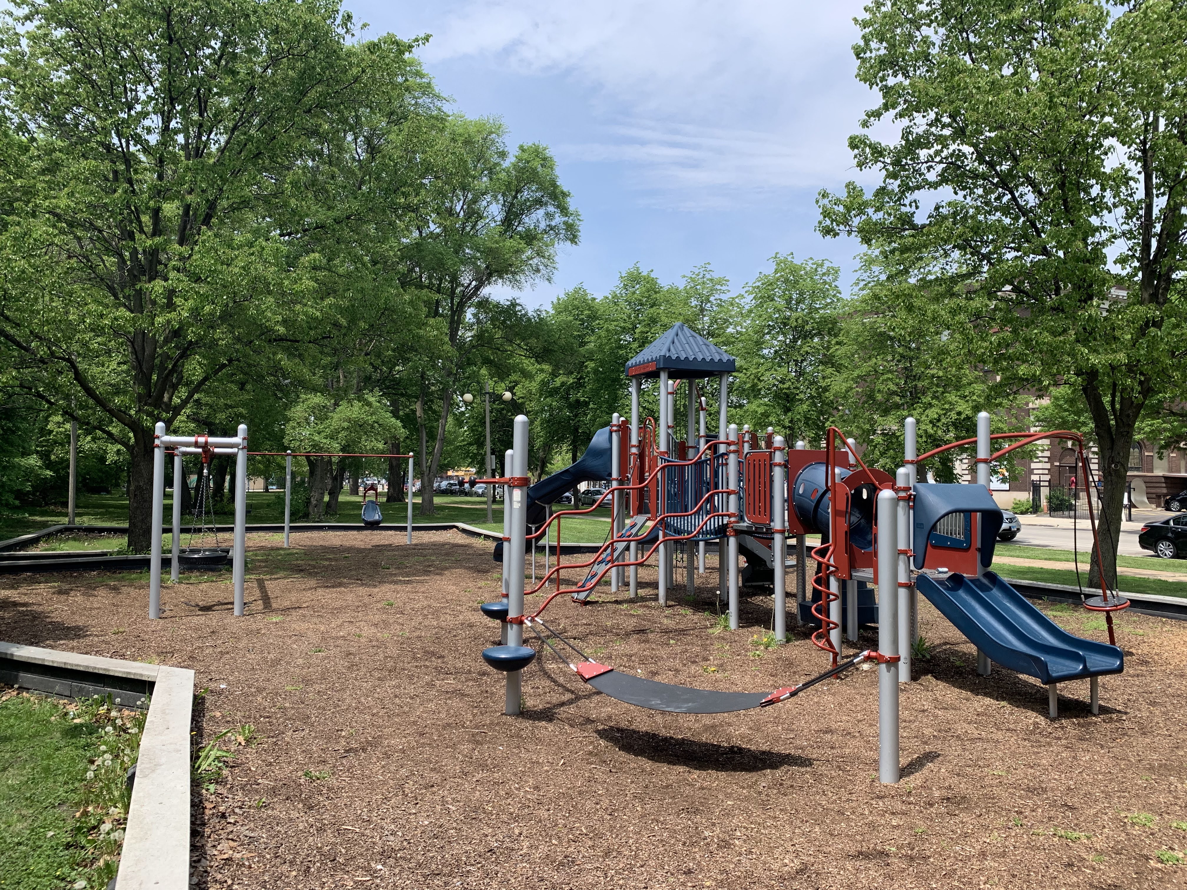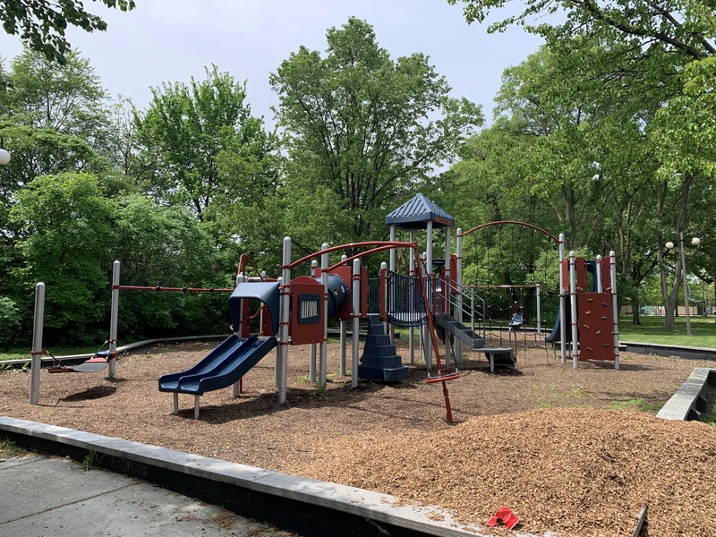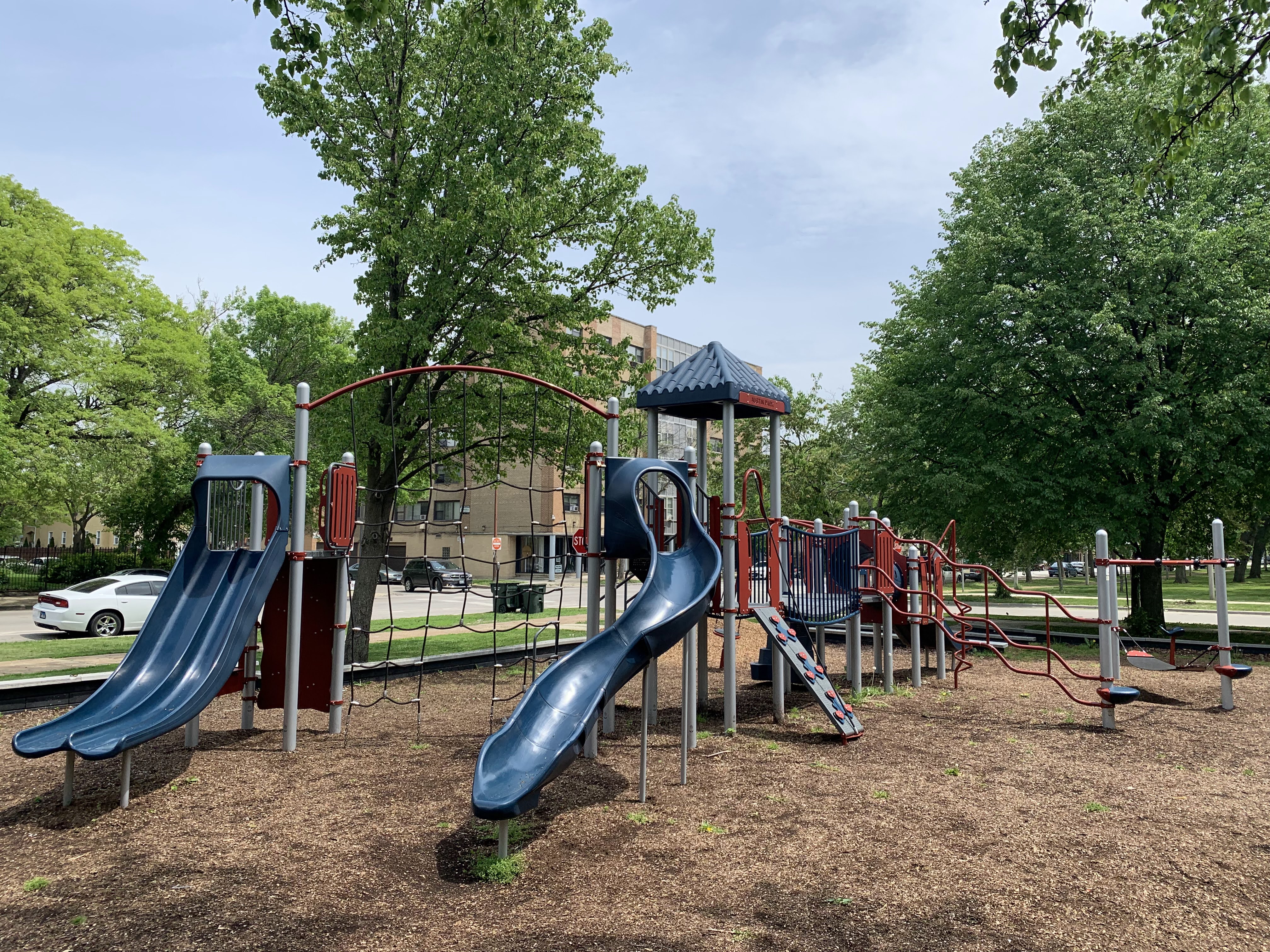 This playground is located in narrow Austin Park near the corner of Lake and Mayfield and just north of the CTA Green Line tracks. The equipment in this park is standard for Chicago playgrounds but larger than most. It contains a large climbing structure designed for older children with a few slides and climbing features as well as a climbing net and small climbing wall.