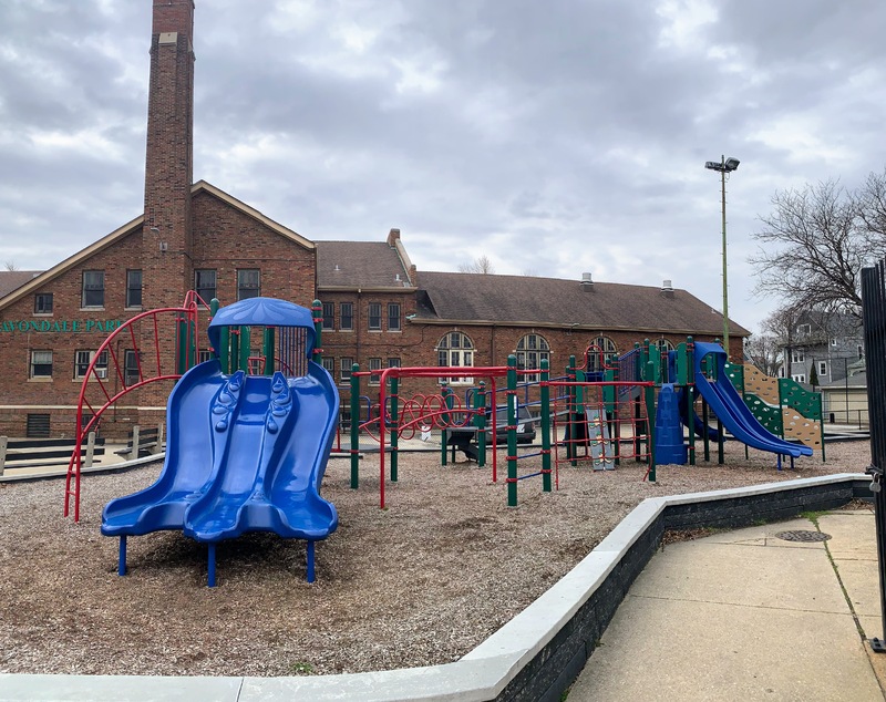 - Avondale Park is a nice neighborhood park with a fieldhouse, outdoor pool, water spray feature, and a nice playground. The playground is tucked just north of the fieldhouse and includes a large, sprawling play structure and the standard set of swings. There is also a large sandbox and a water spray feature nearby. The play area is fully enclosed and is bright and sunny. There are a few benches and the play surface is wood chips. The nearby fieldhouse provides access to bathrooms and drinking fountains (when open).