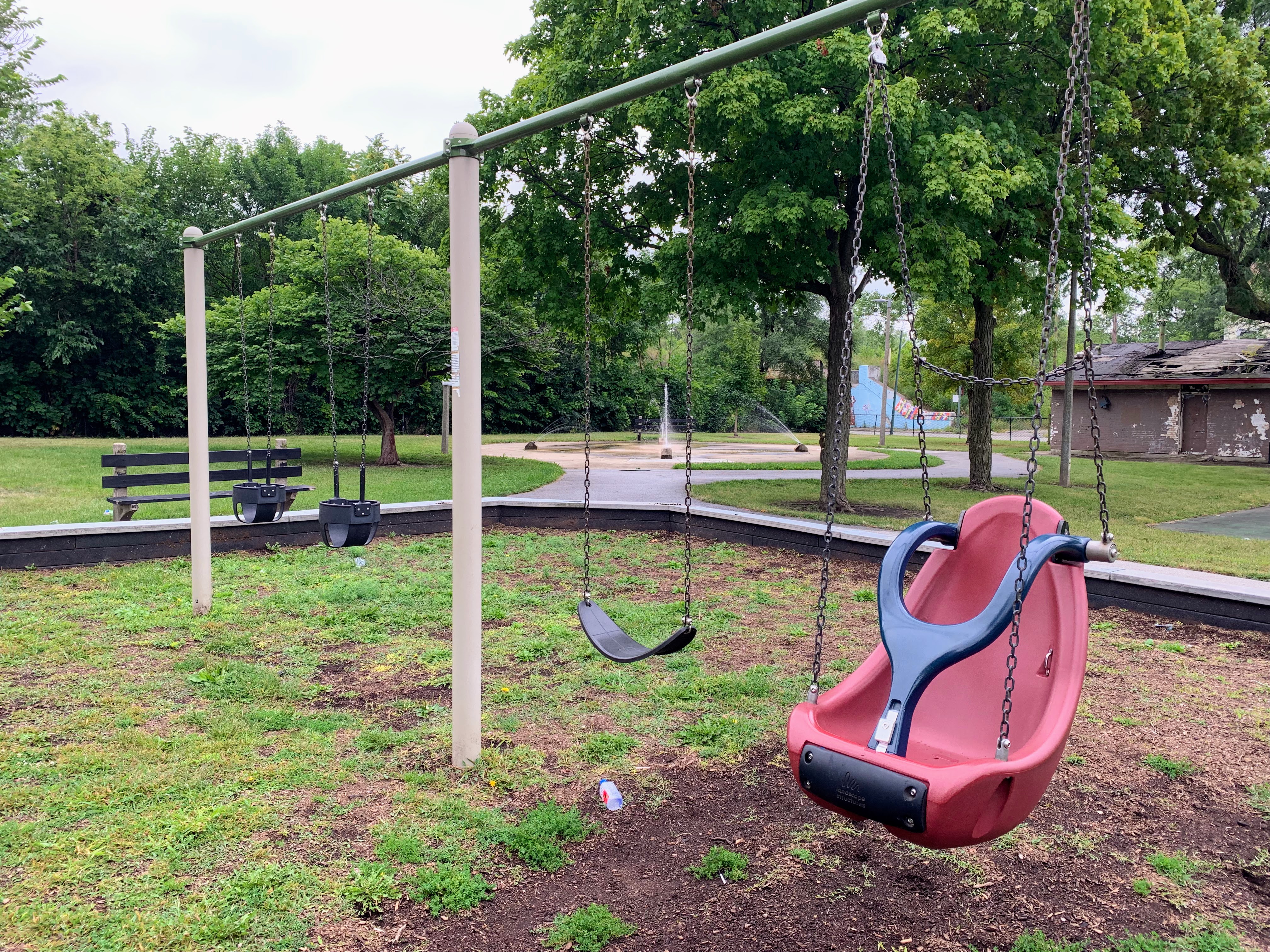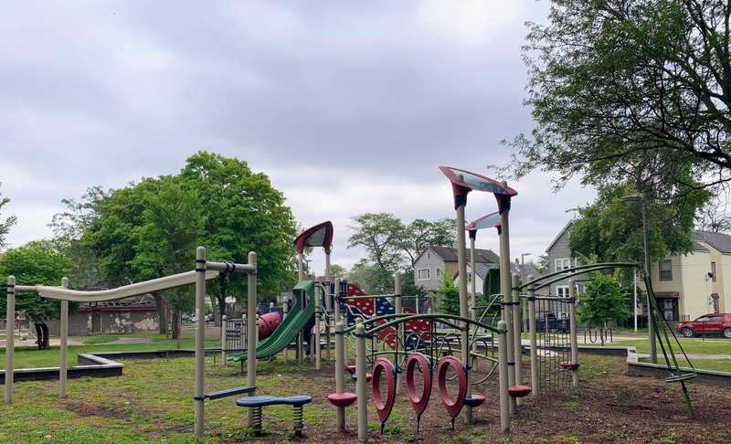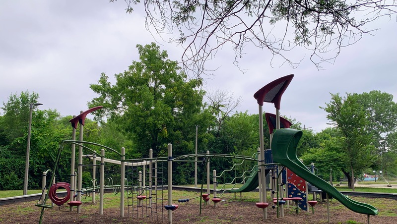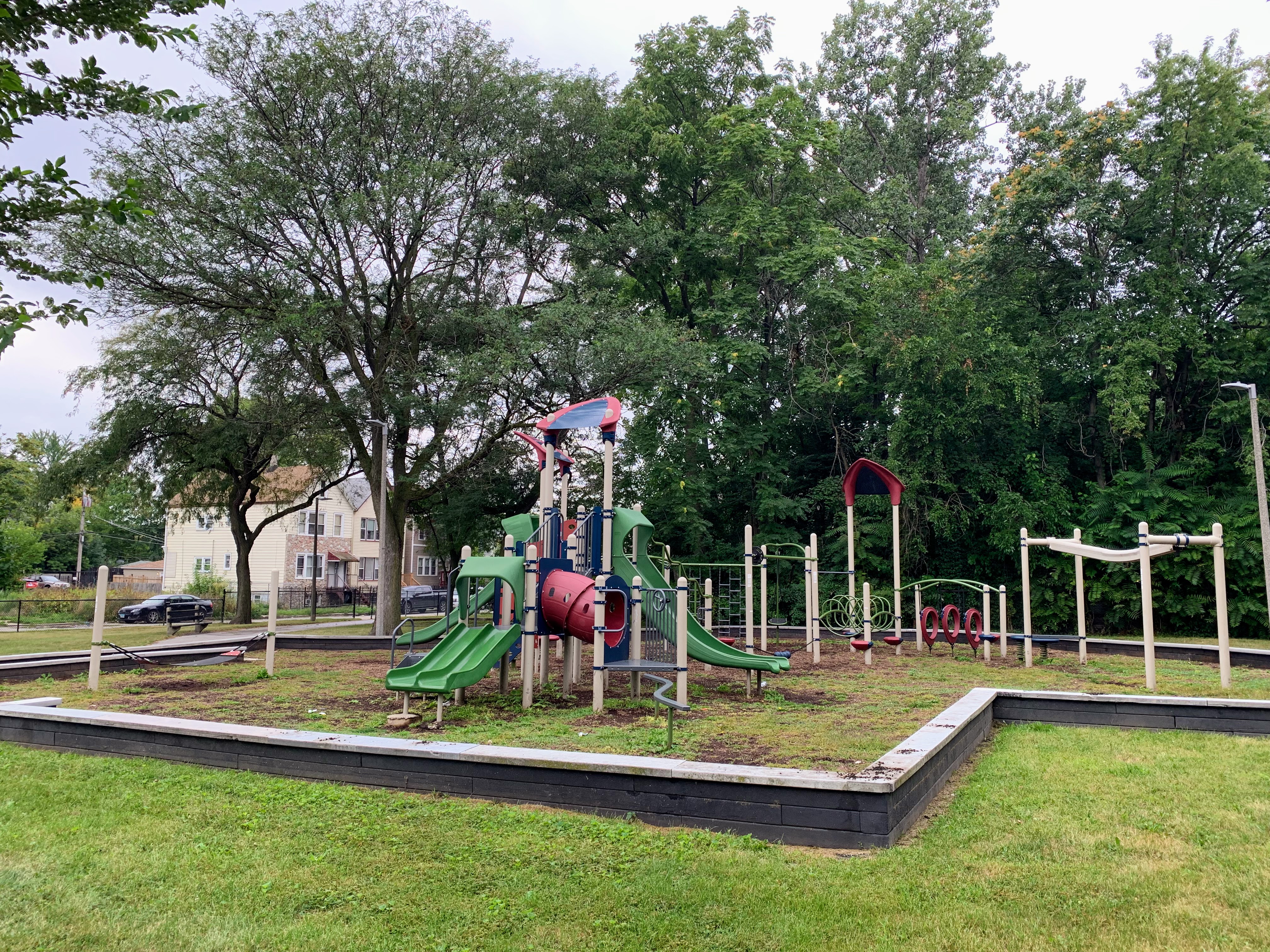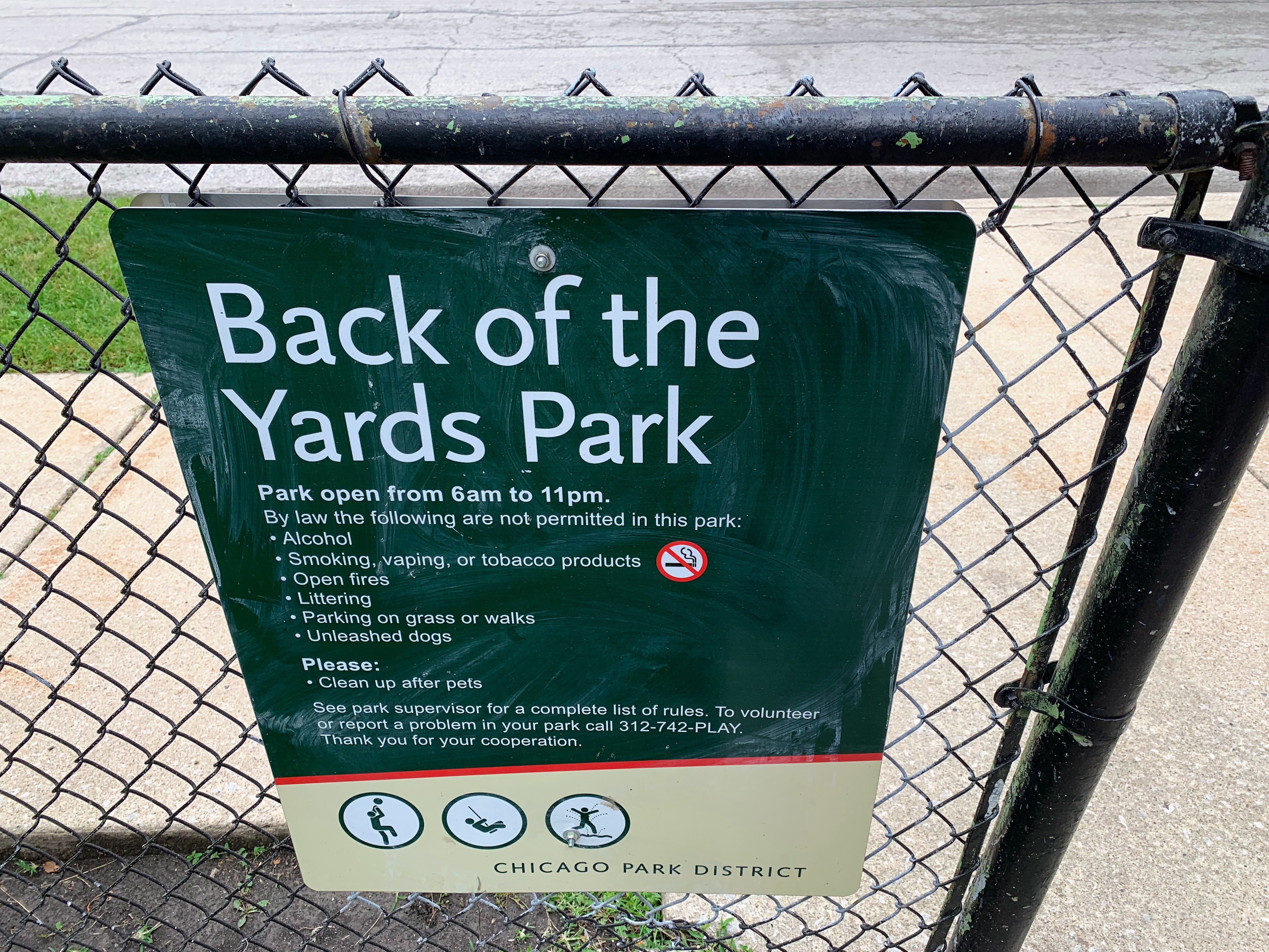 - Back of the Yards Park features a sprawling set of playground equipment as well as a small water spray feature. The playground is a basic and classic Chicago Park playground with wood chips and a few scattered park benches.