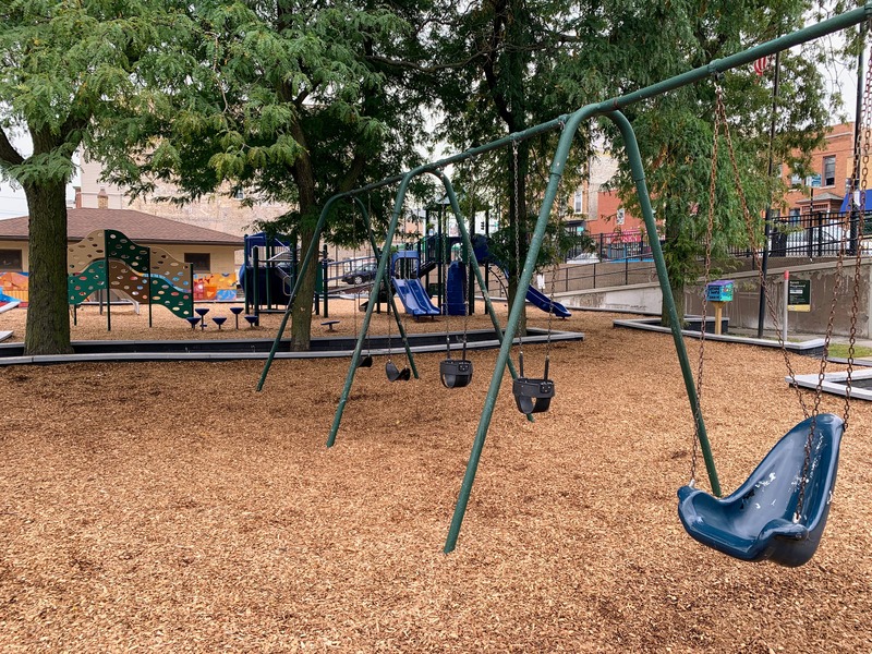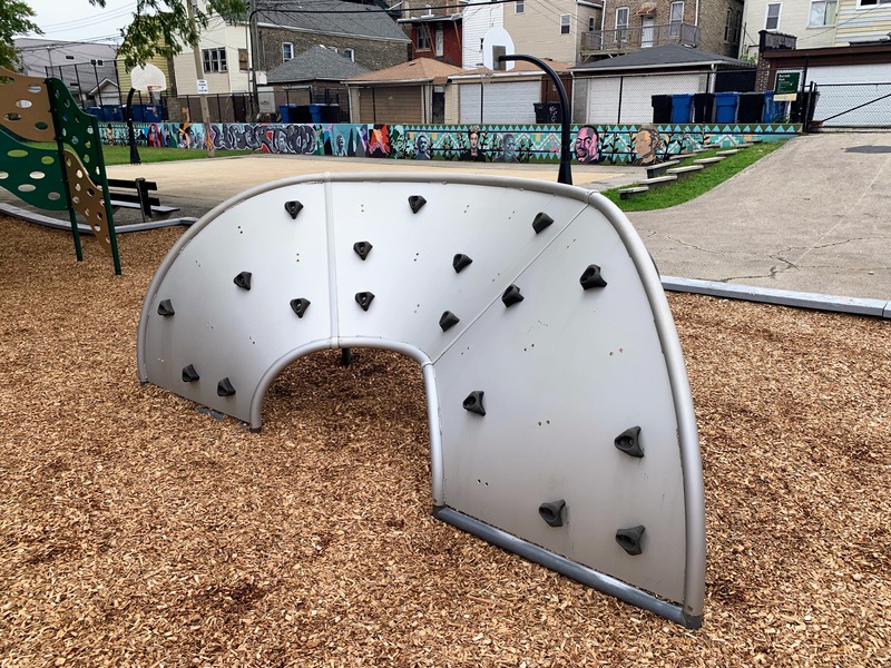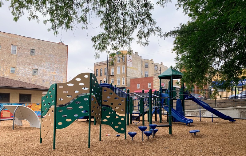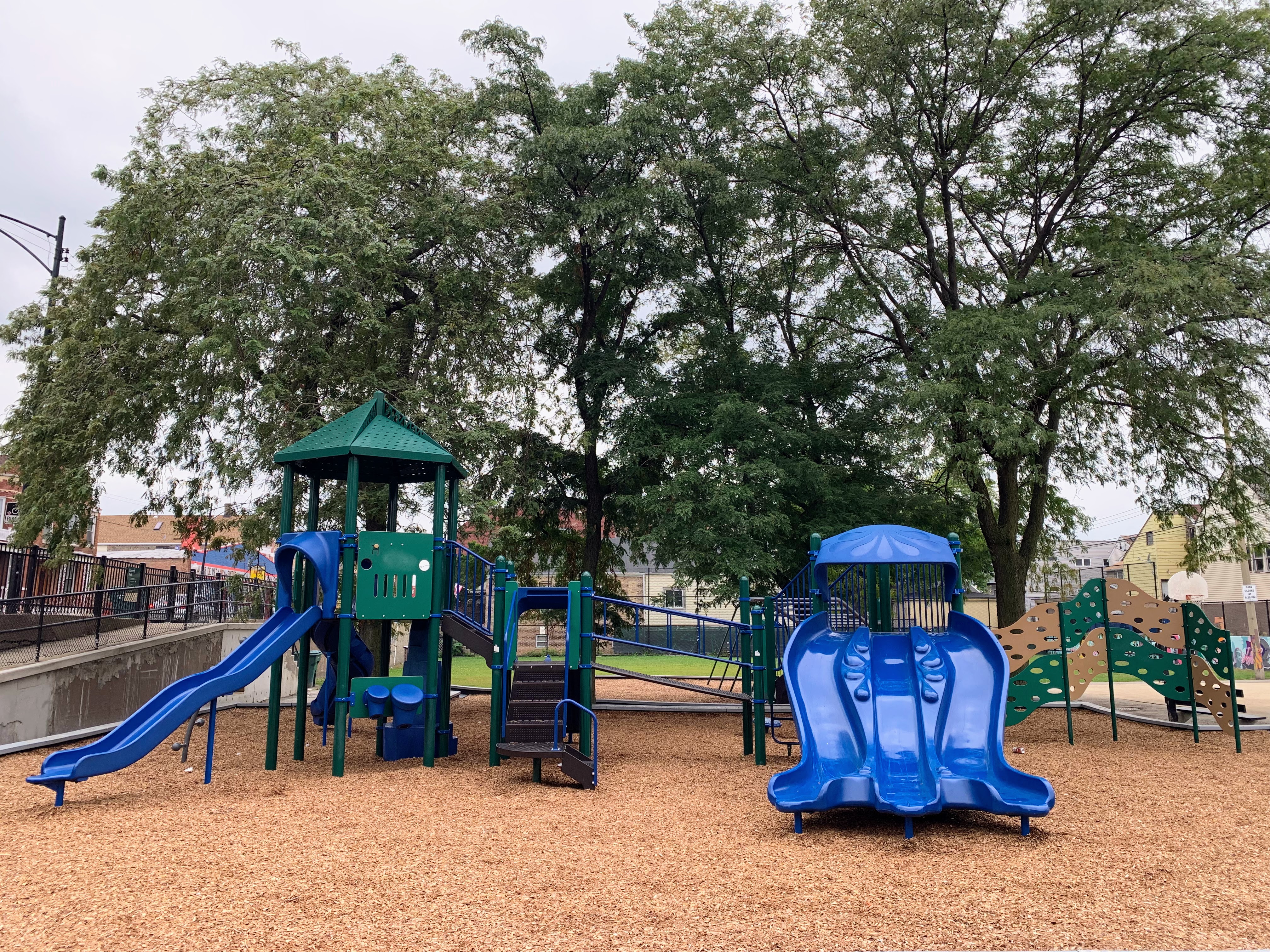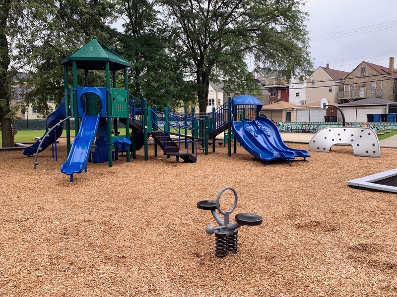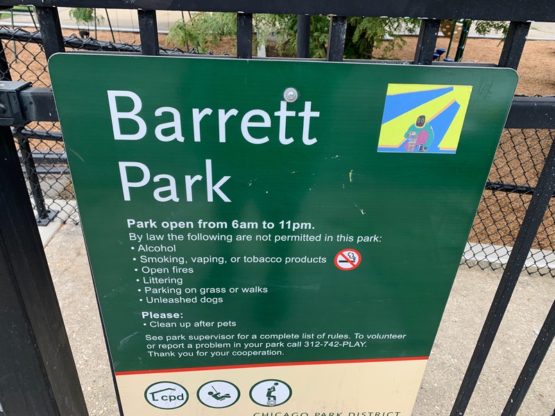 - Barrett Park is below street grade but the playground gets high marks! The playground itself features a large play structure with a variety of slides and climbing elements as well as a set of swings. The playground is fully fenced in and the play surface is wood chips. There are a few benches and a few trees provide shade. There is a Chicago Park fieldhouse but does not seem open. All in all, this is a great neighborhood playground.