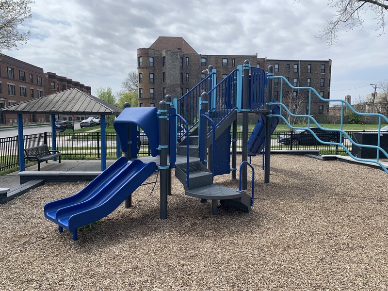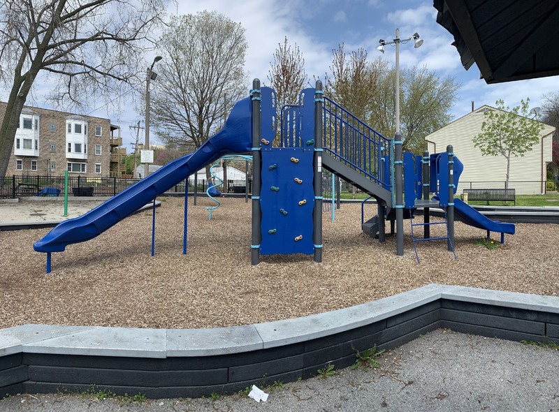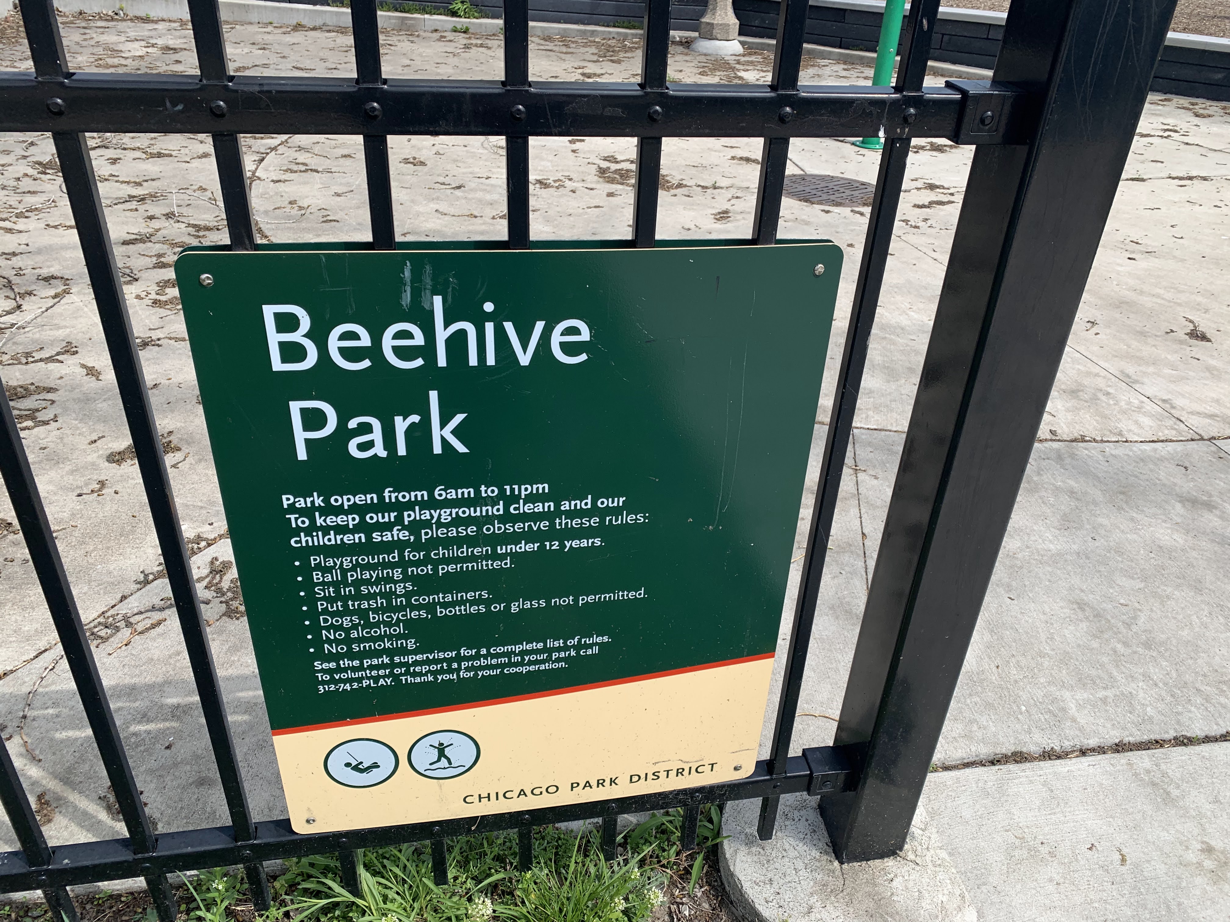 The small Beehive Park is a neighborhood park that features a small play structure and small water feature. The play structure is small but well-equipped and features a few slides, a variation of monkey bars, and a few other climbing/traversing structures. There are also two swings (toddler and molded bucket seat with harness) in the small play area.