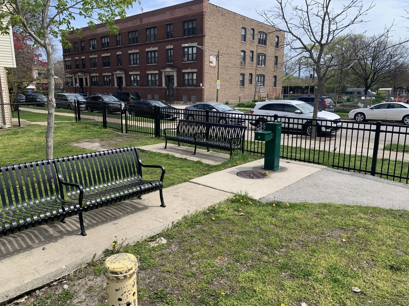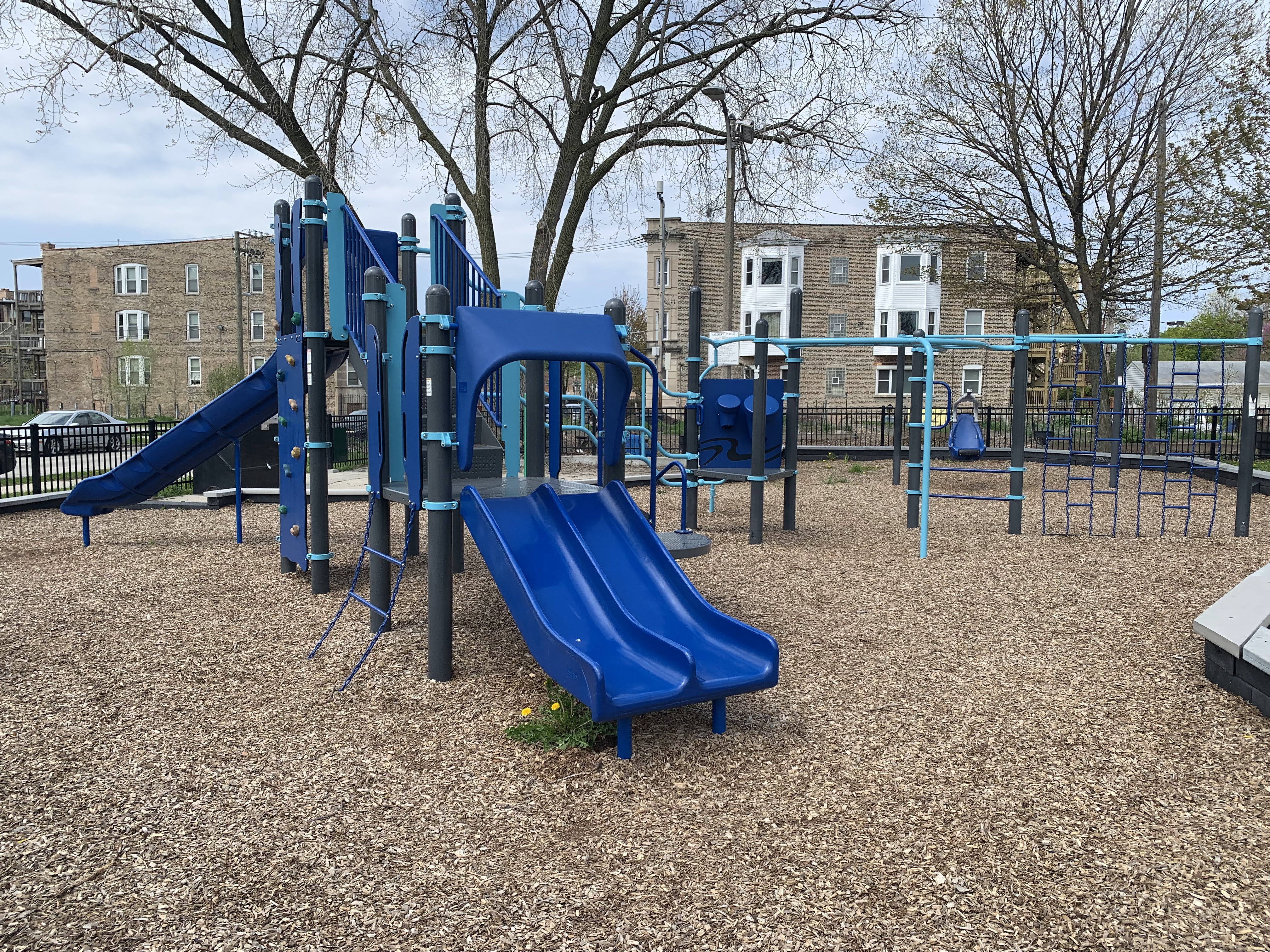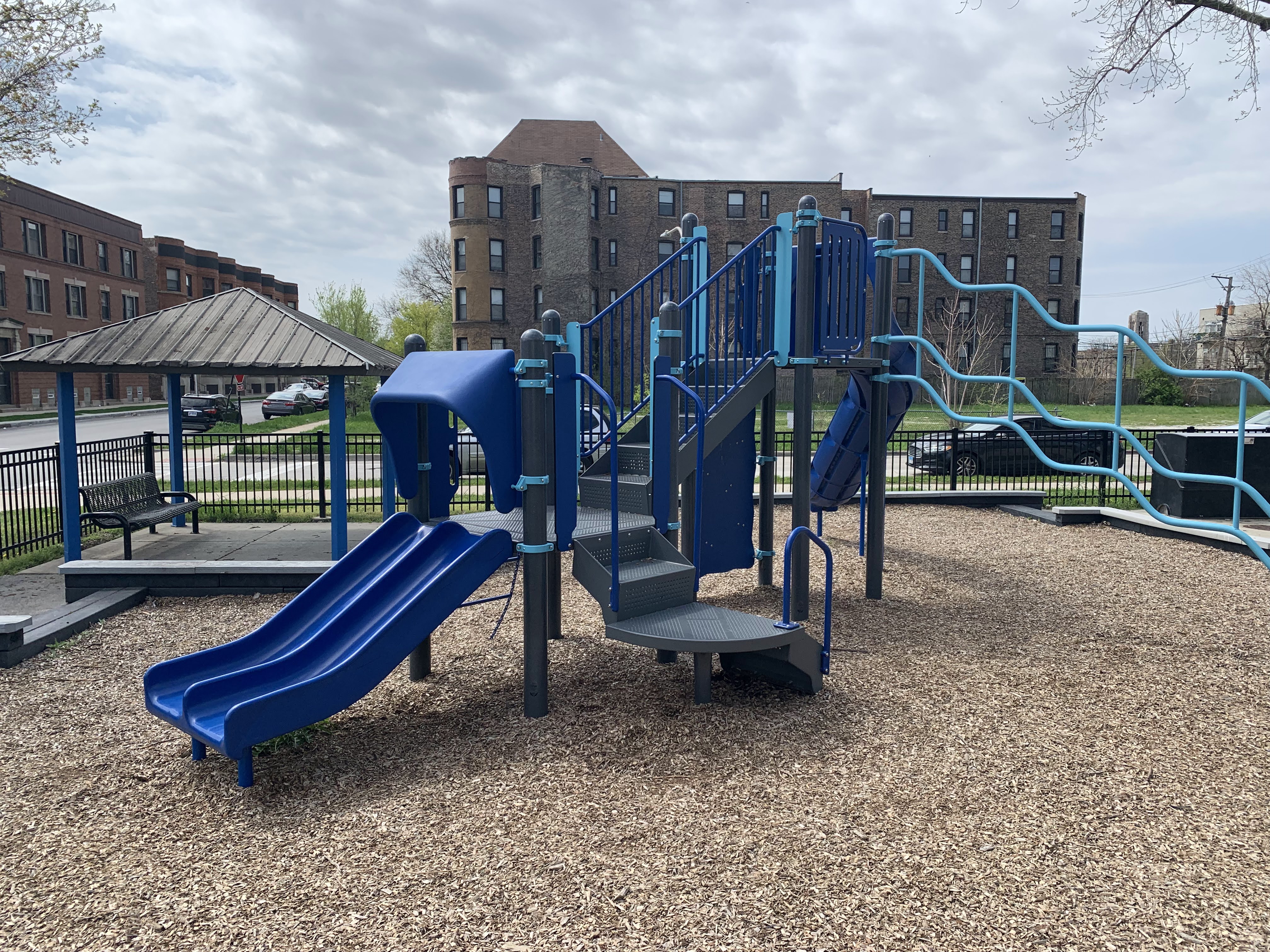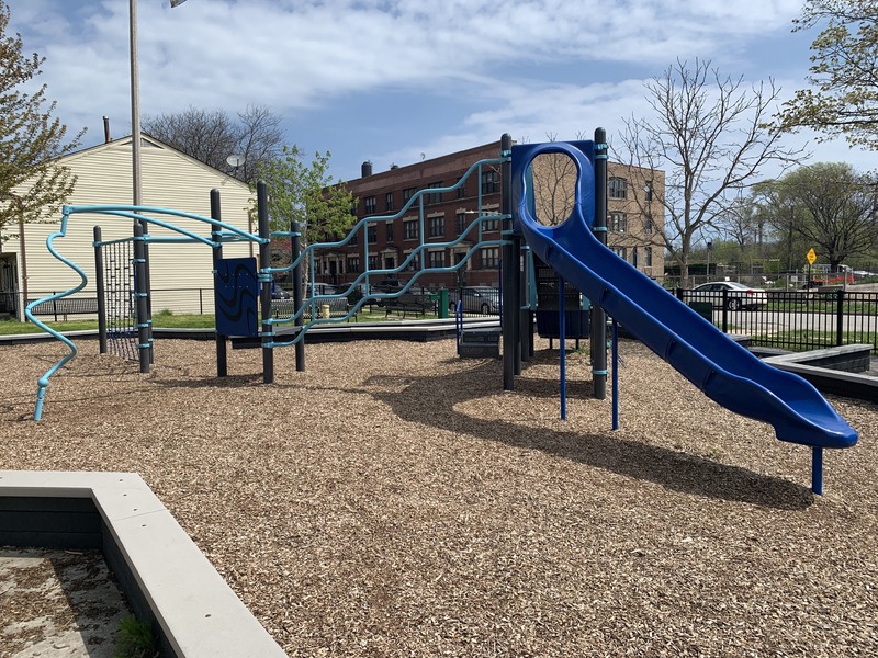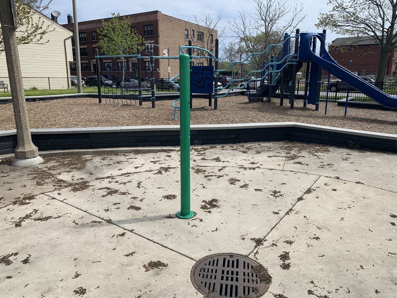The play area is fully enclosed and the play surface is wood chips. There are a few benches and a drinking fountain in the play area as well as a small, open-sided pavilion providing some shade in an otherwise very sunny and exposed site. There is a small and simple water feature with a single pole mister. All in all, this is a respectable neighborhood park. - Playground Features