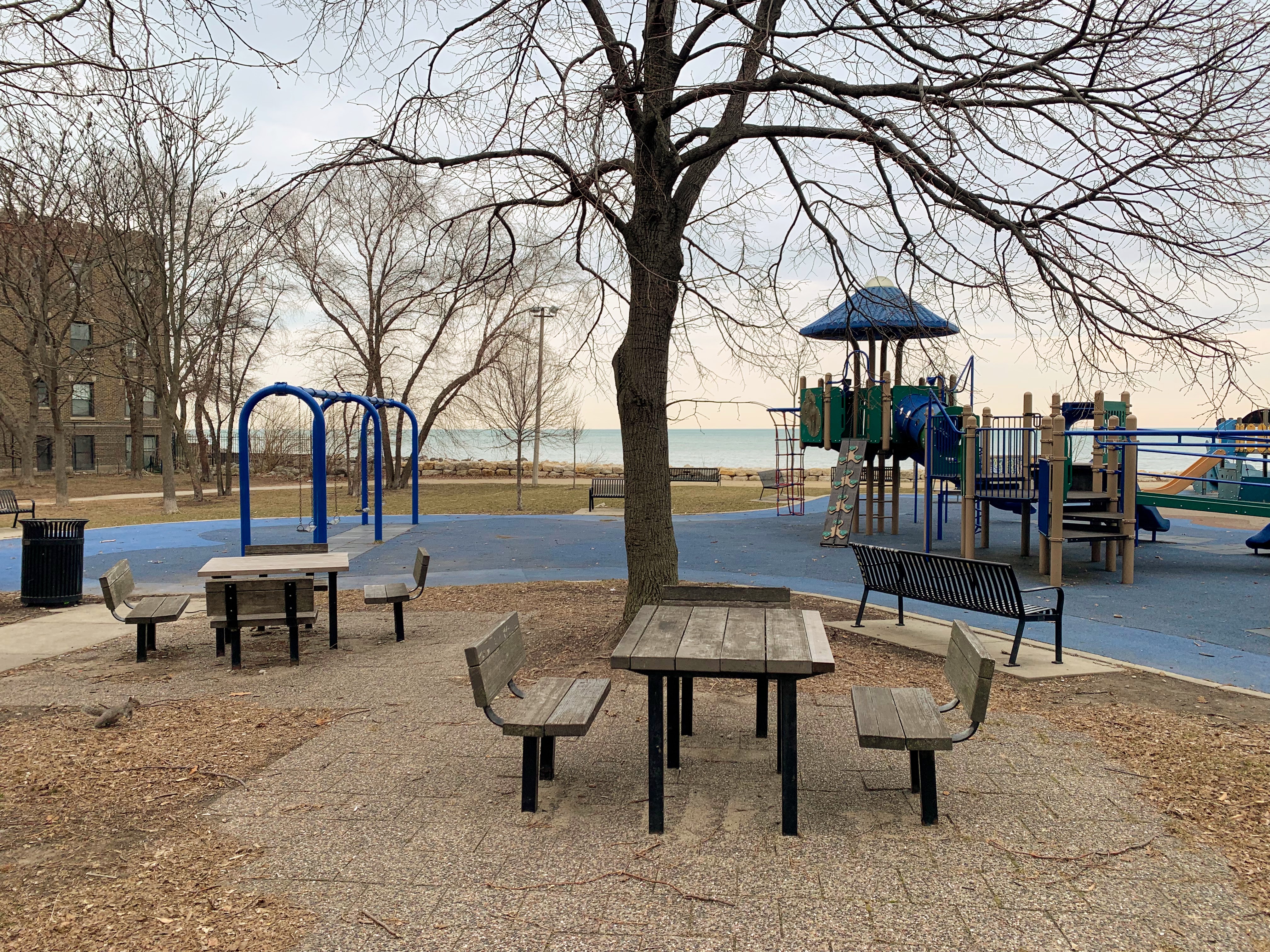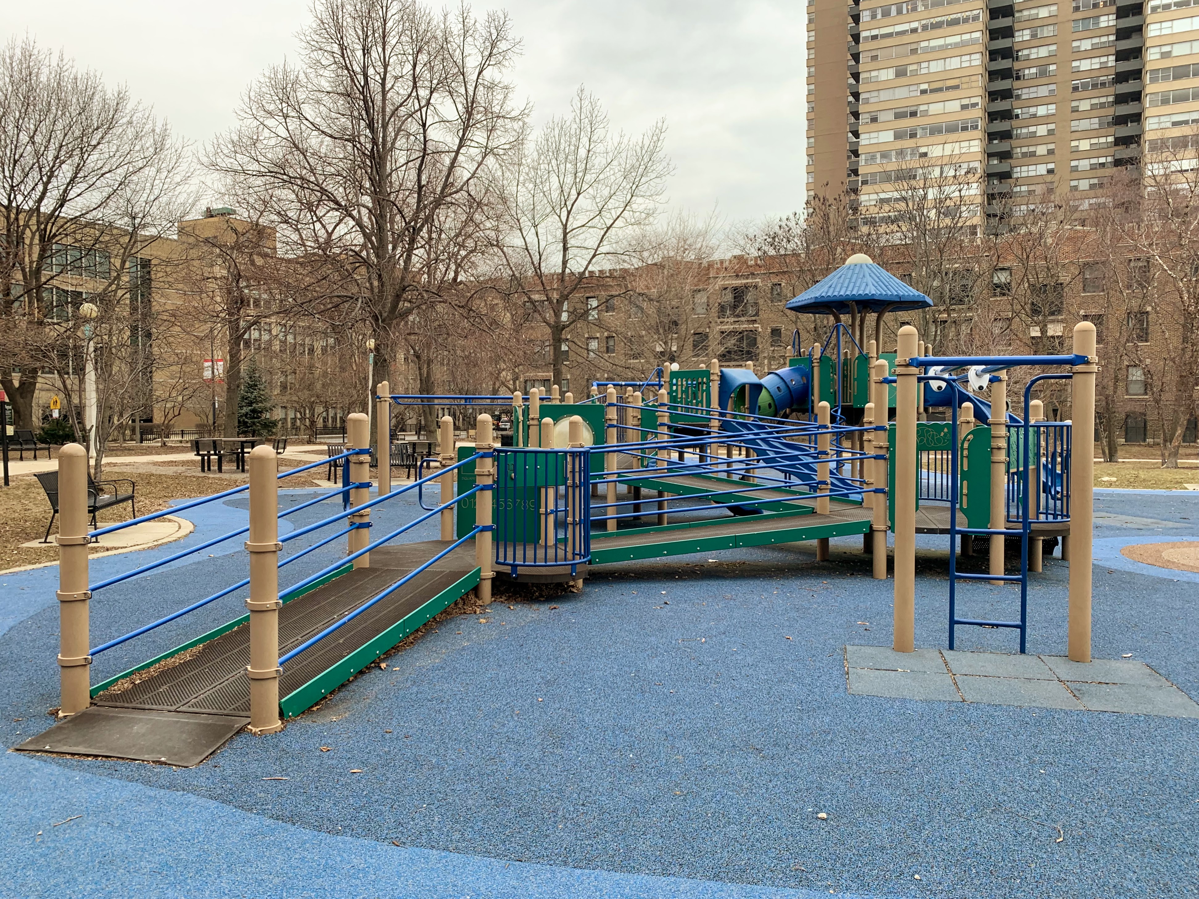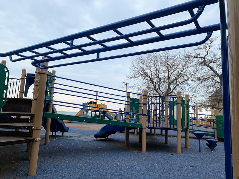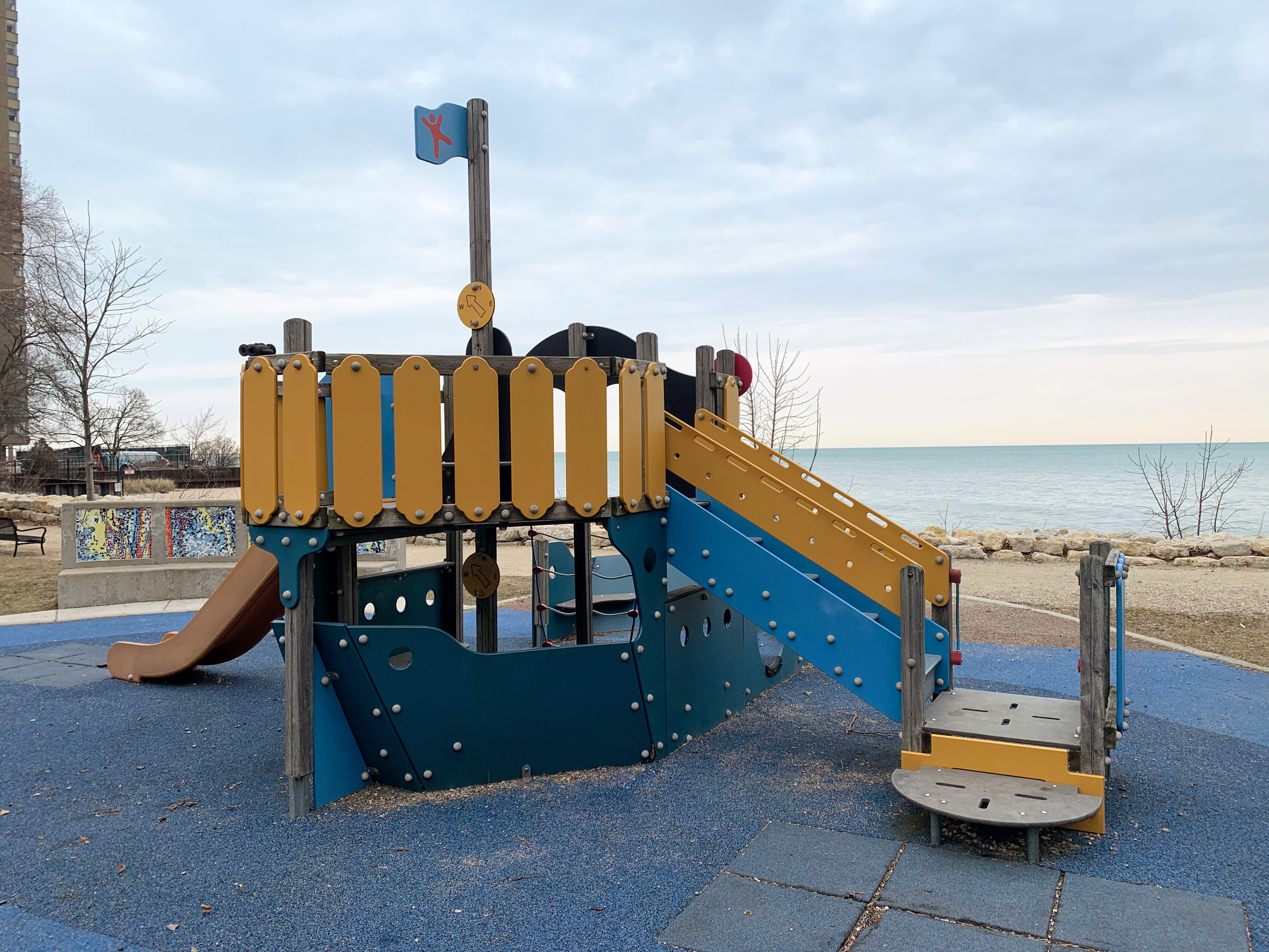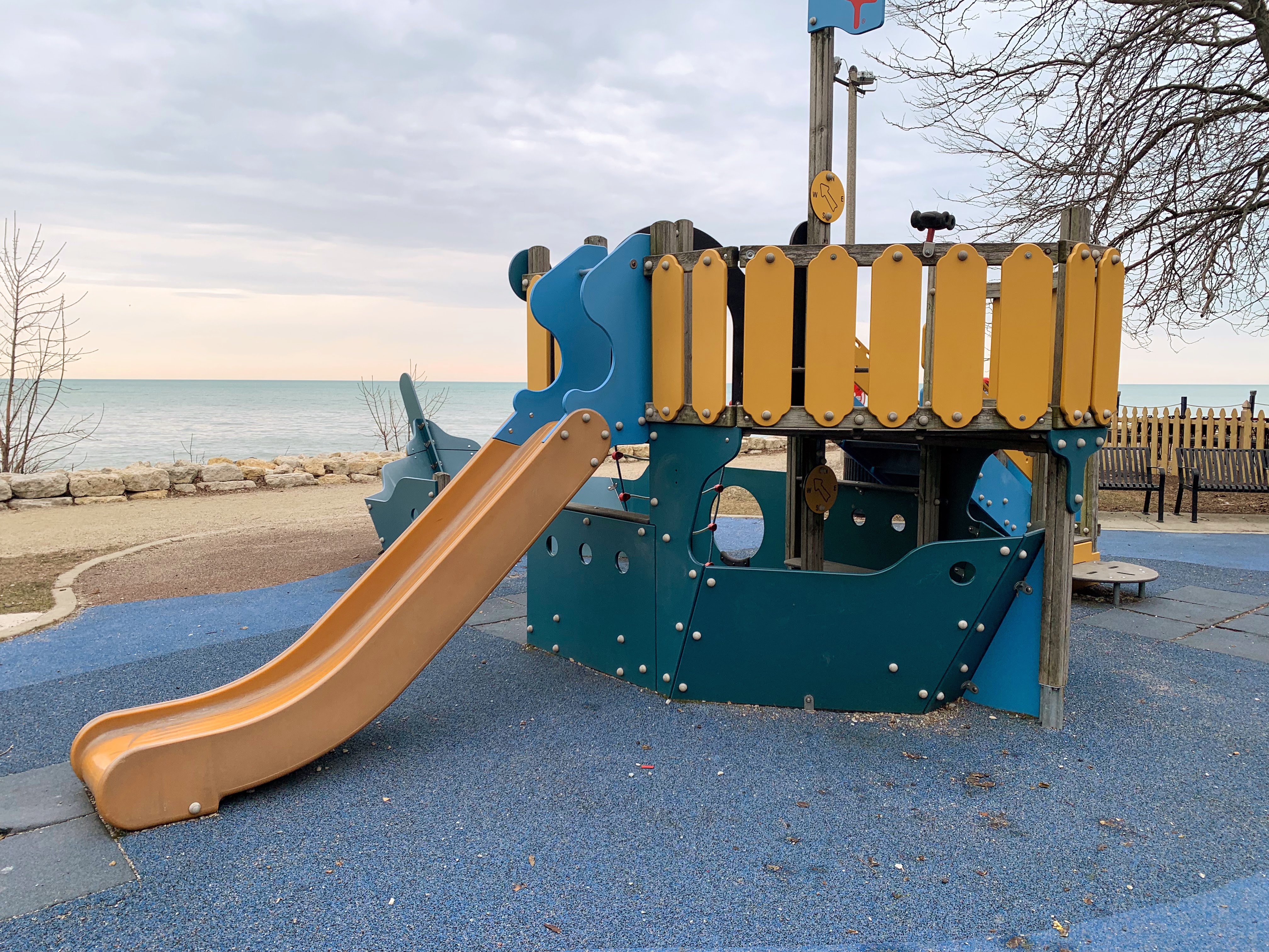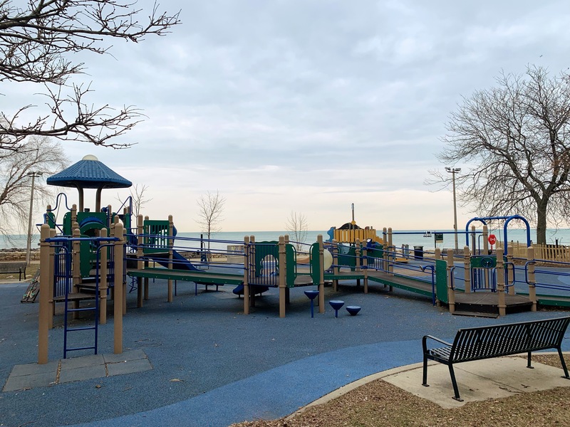 - Berger Park has a wonderful playground with views of Lake Michigan. There is dedicated area for smaller children close to the lake with a nautical theme and a larger structure for older children that is accessible via a ramp. This playground has a rubberized surface and the equipment seemed new and well maintained. There were plenty of benches and a few picnic tables. This is a great playground; highly recommend.