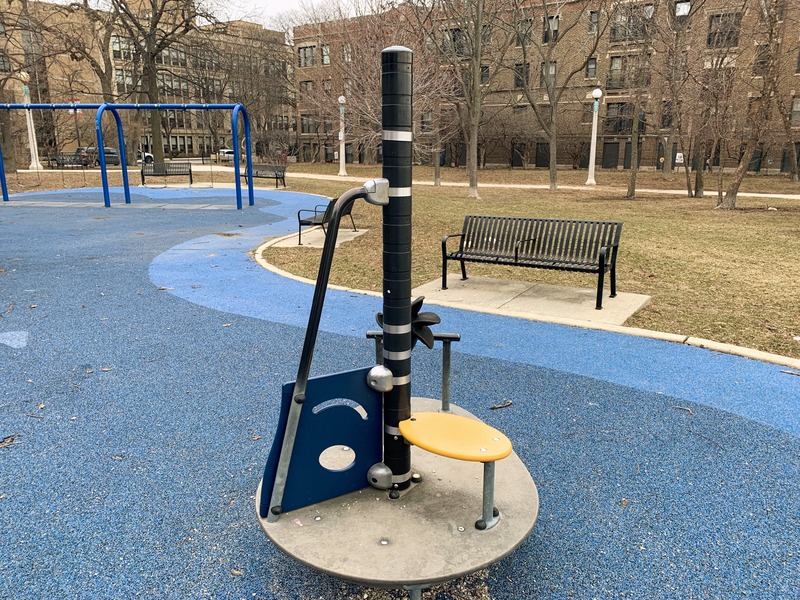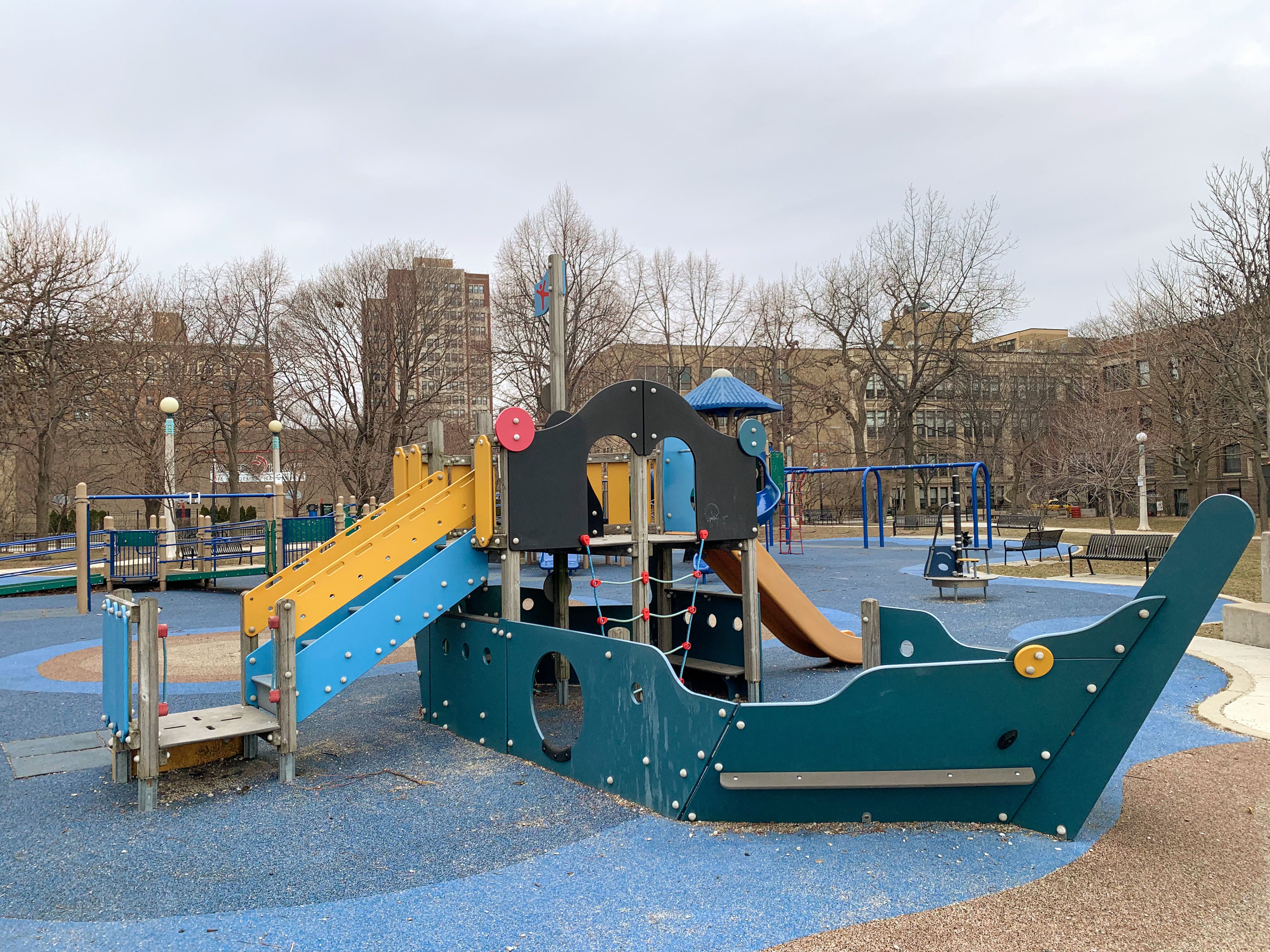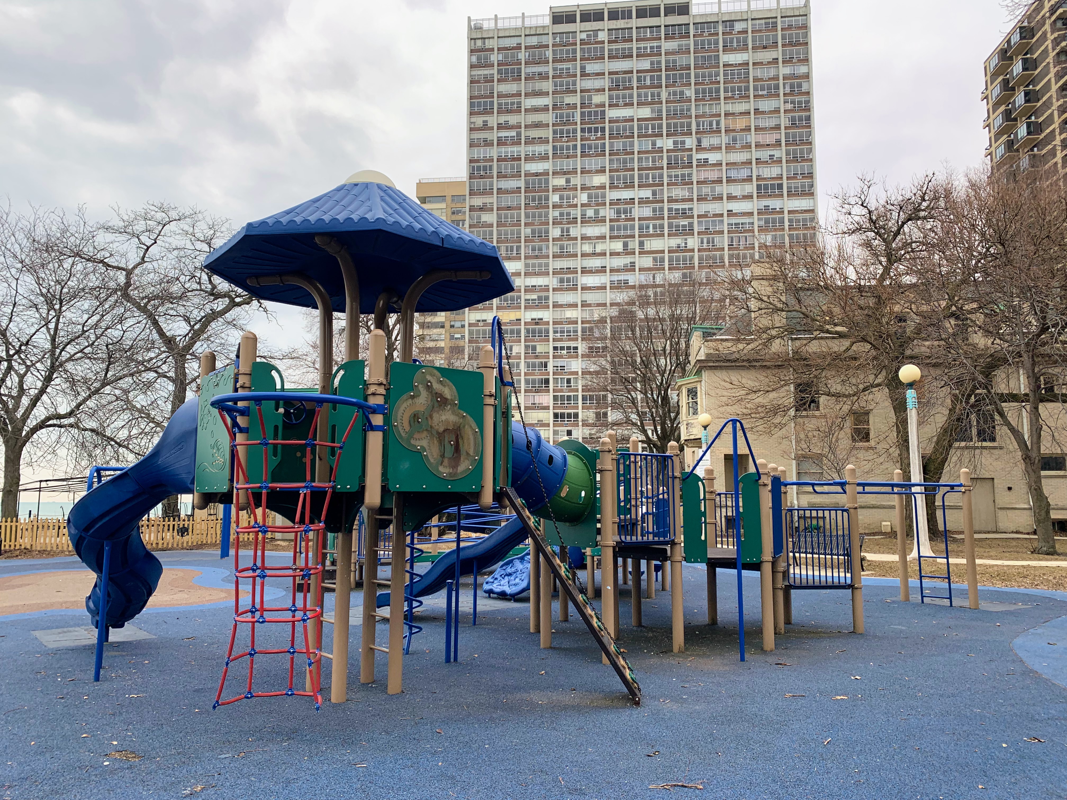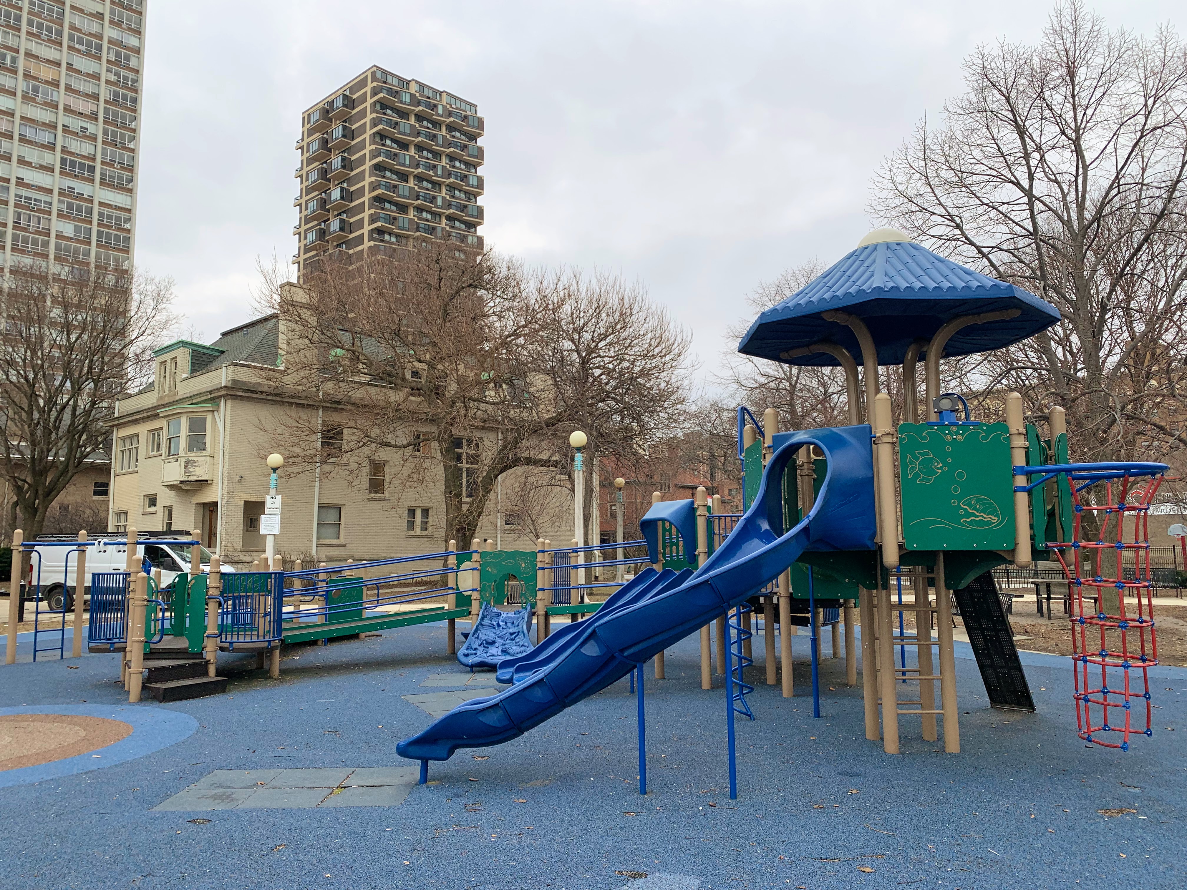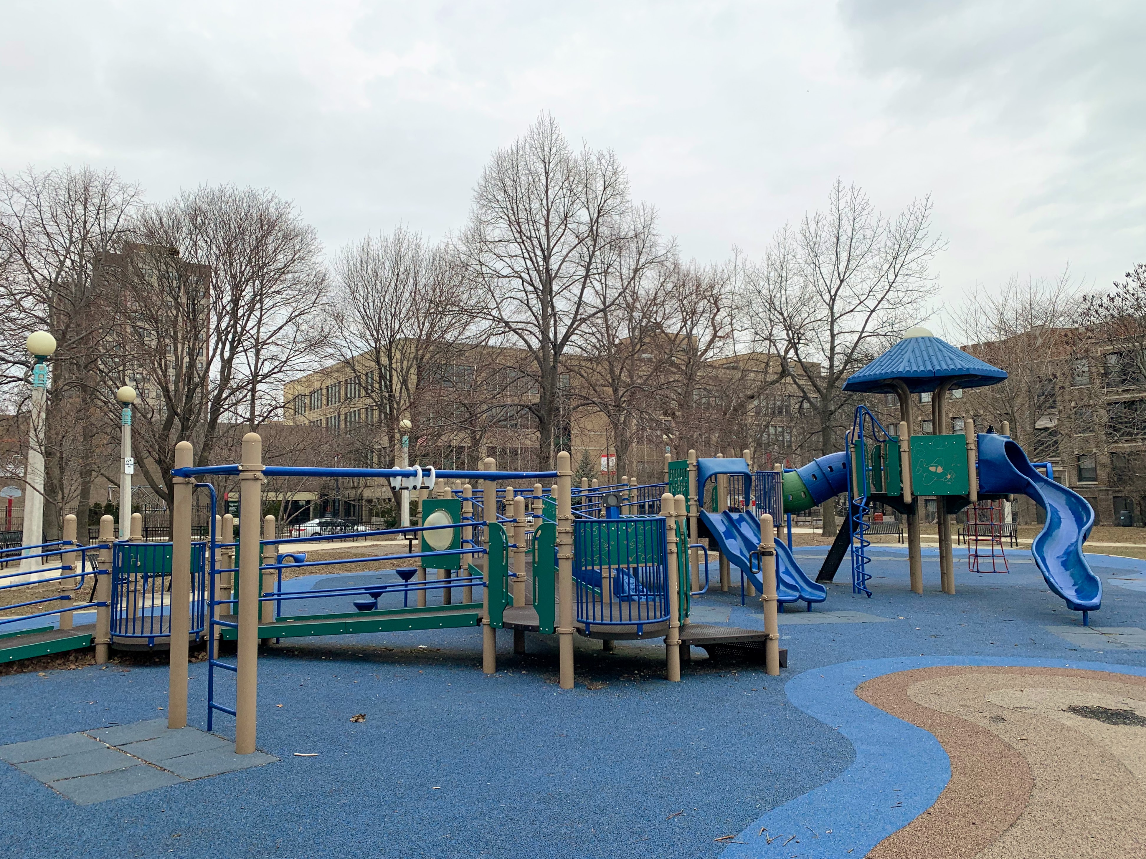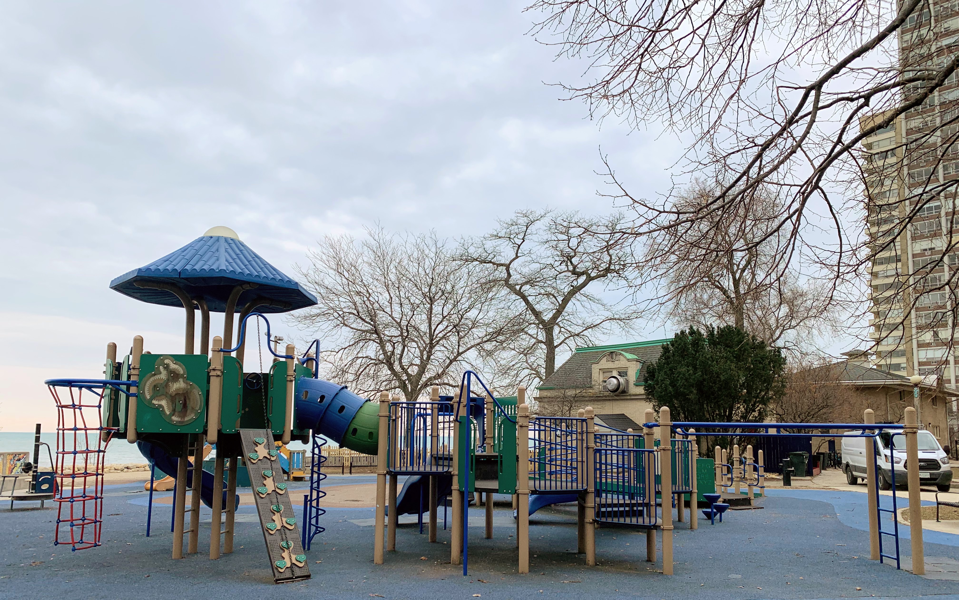 - Berger Park has a wonderful playground with views of Lake Michigan. There is dedicated area for smaller children close to the lake with a nautical theme and a larger structure for older children that is accessible via a ramp. This playground has a rubberized surface and the equipment seemed new and well maintained. There were plenty of benches and a few picnic tables. This is a great playground; highly recommend.