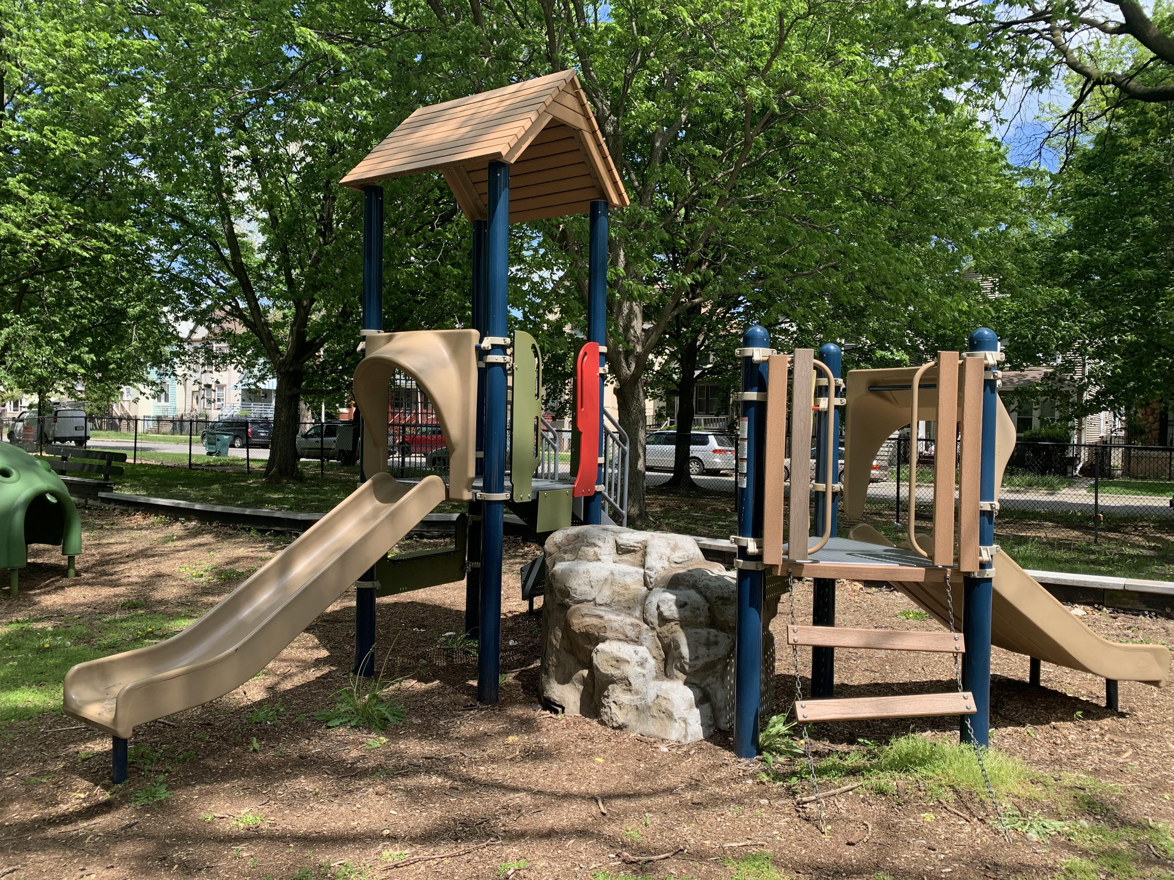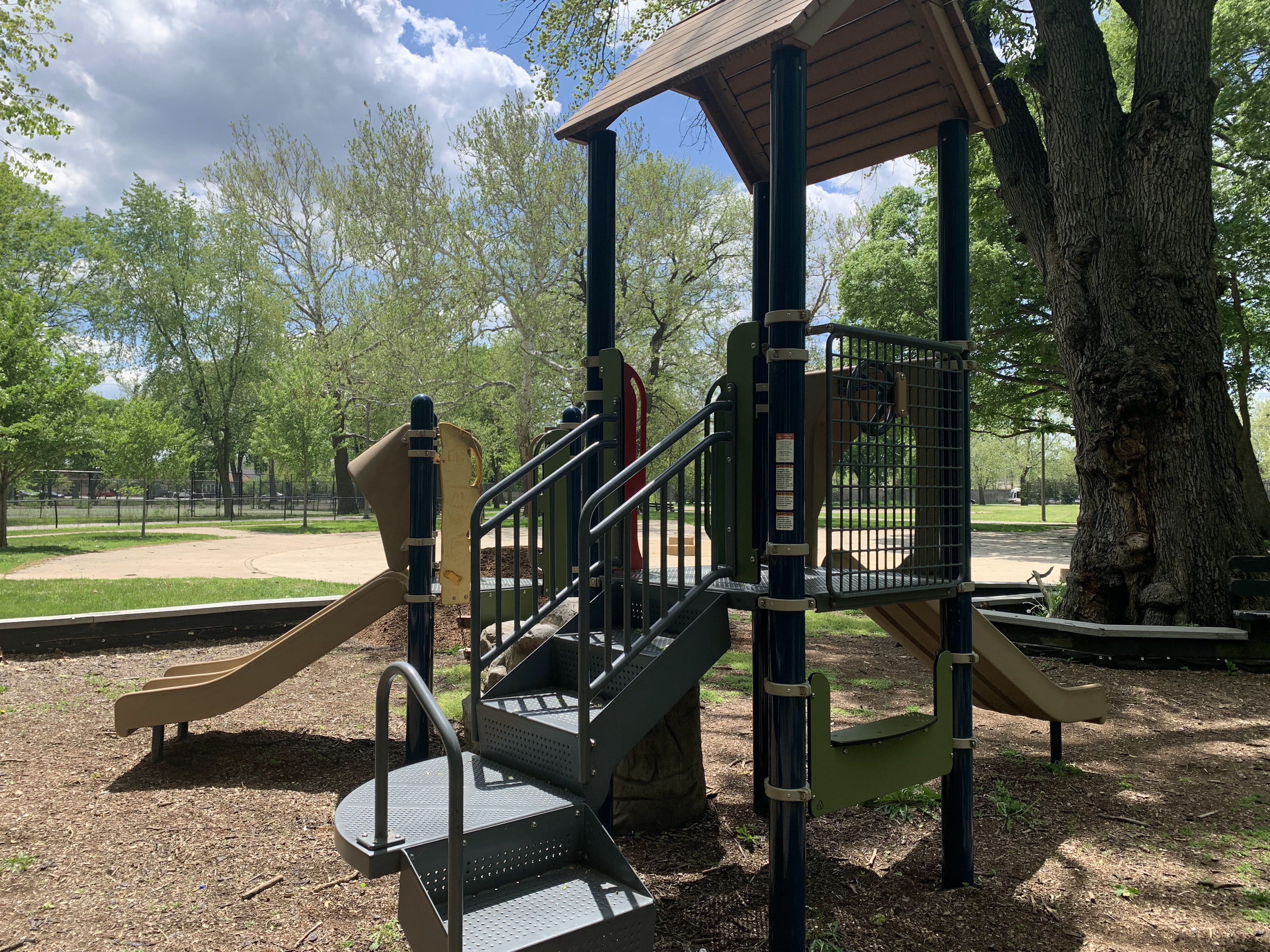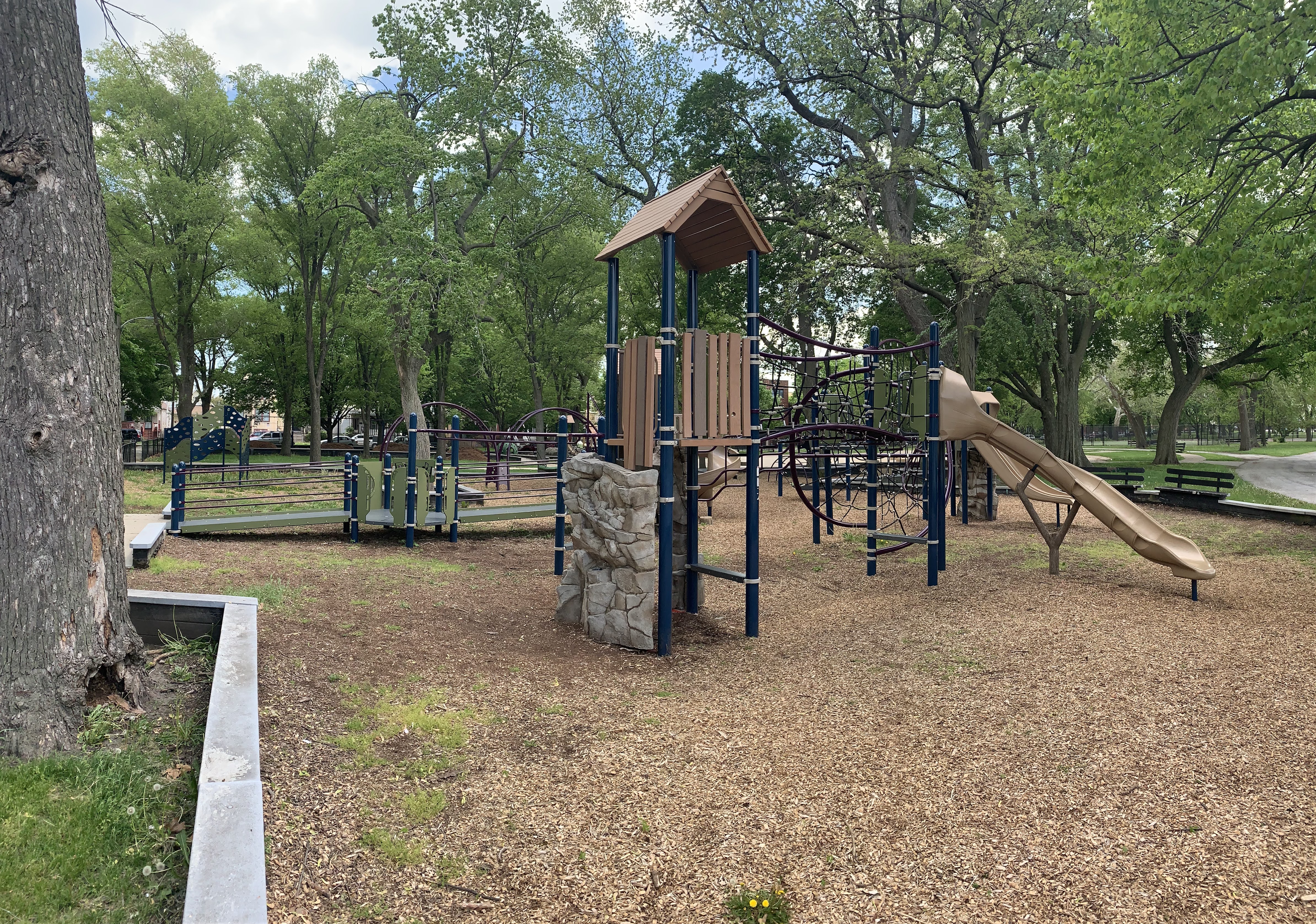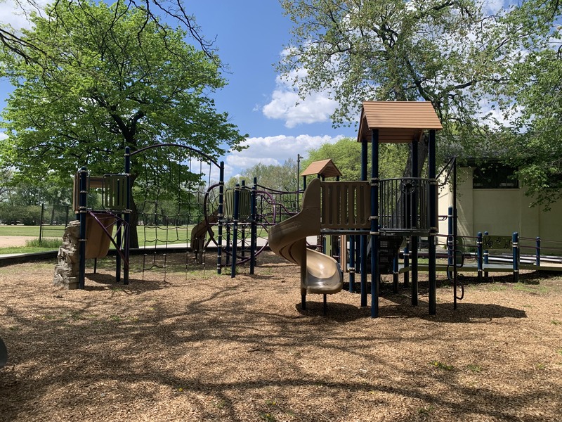 The play areas are not enclosed but they are fenced from the street and set back a bit. The area is shaded by large trees and there are a few benches for seating. The play surface in both areas is wood chips. There is a fieldhouse building just to the north providing bathroom access. All in all, this is a great playground. - Playground Features