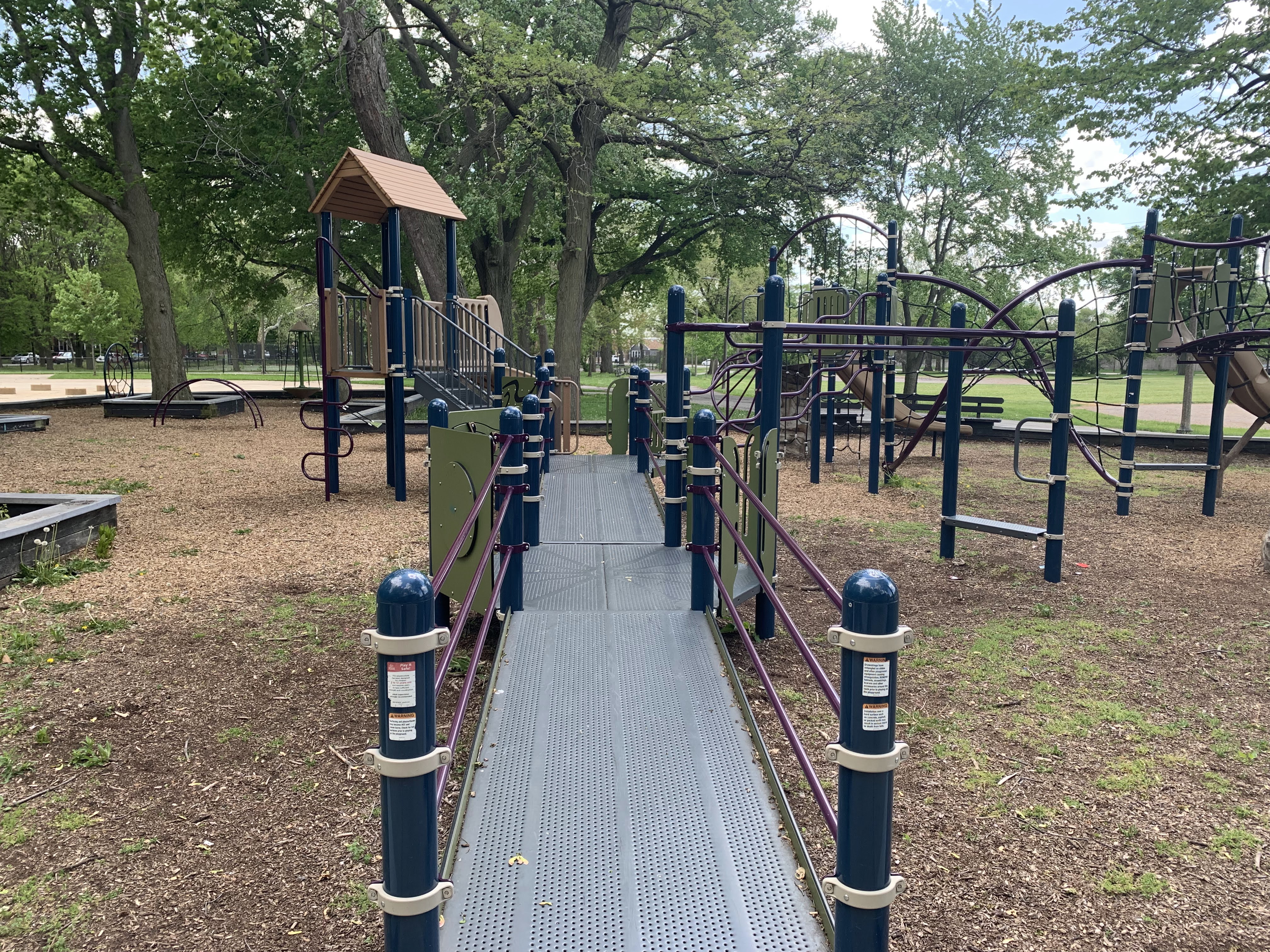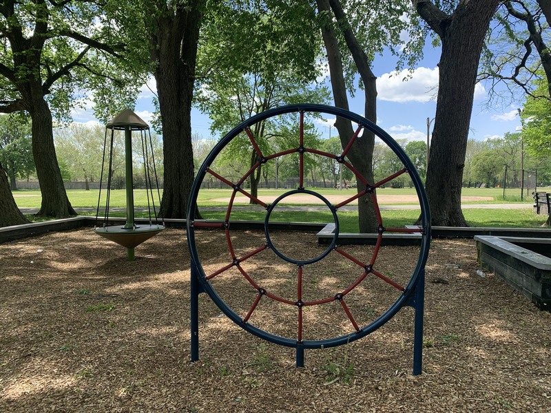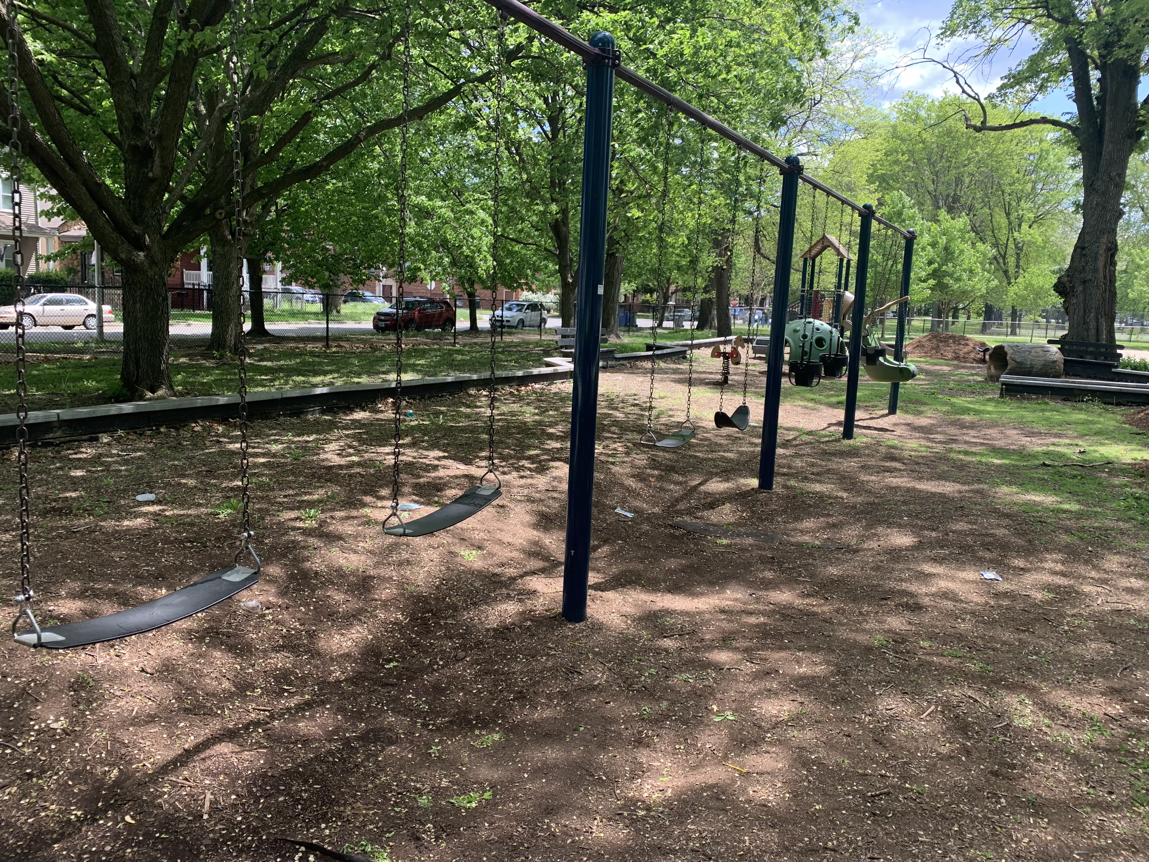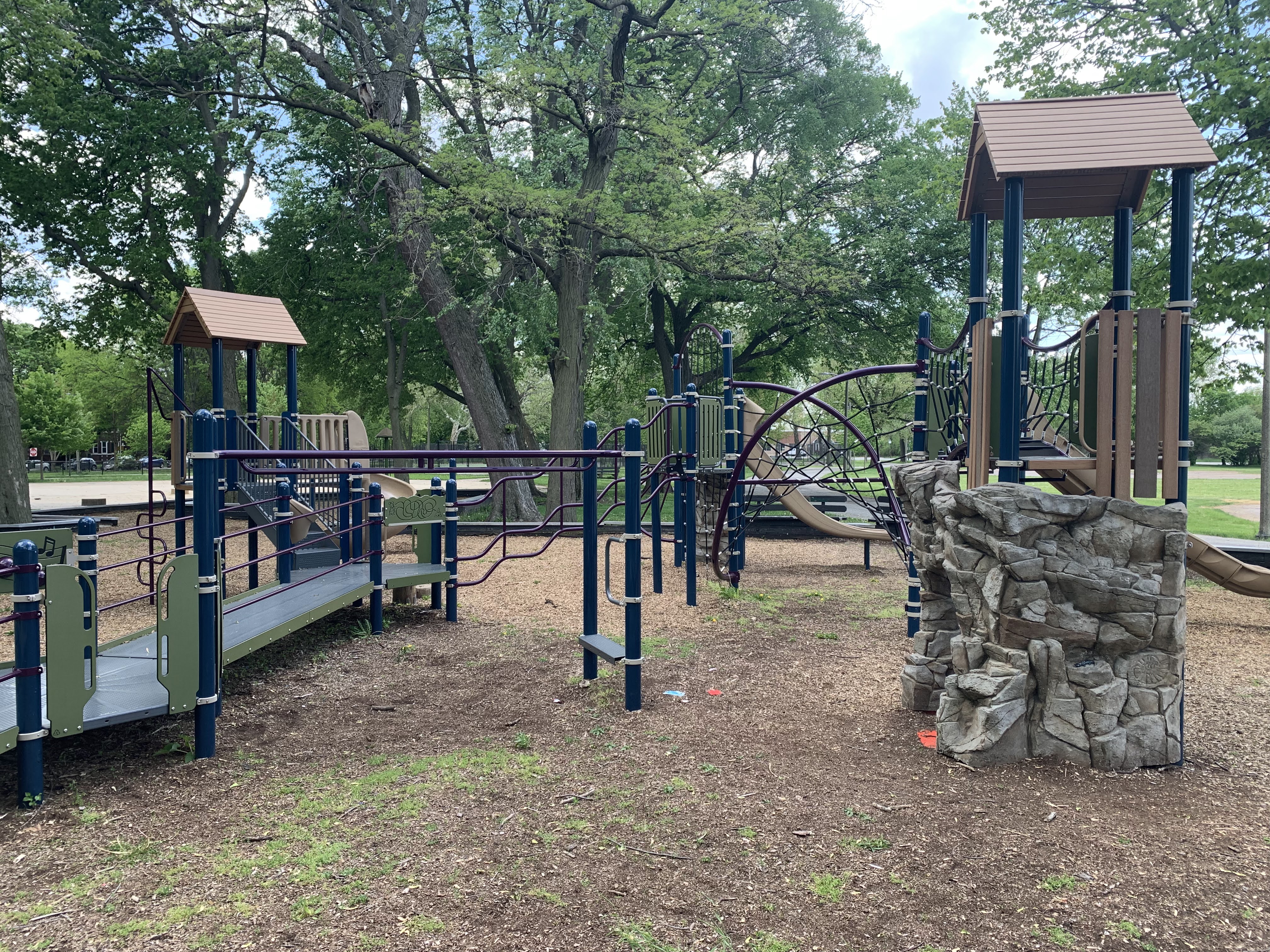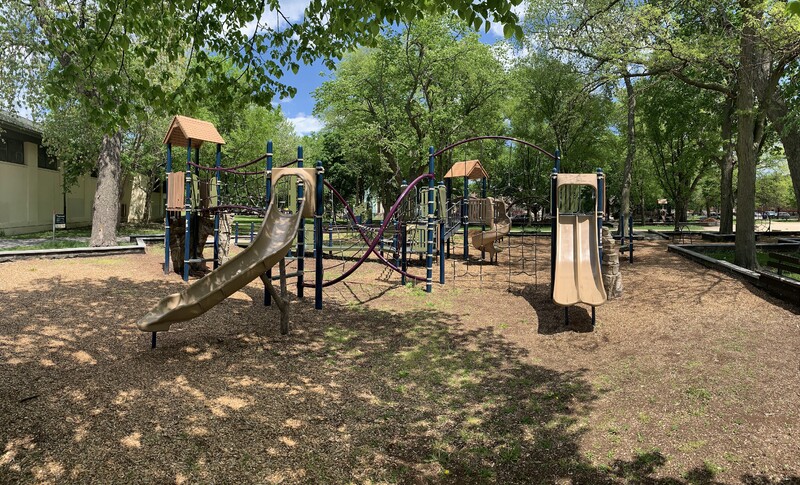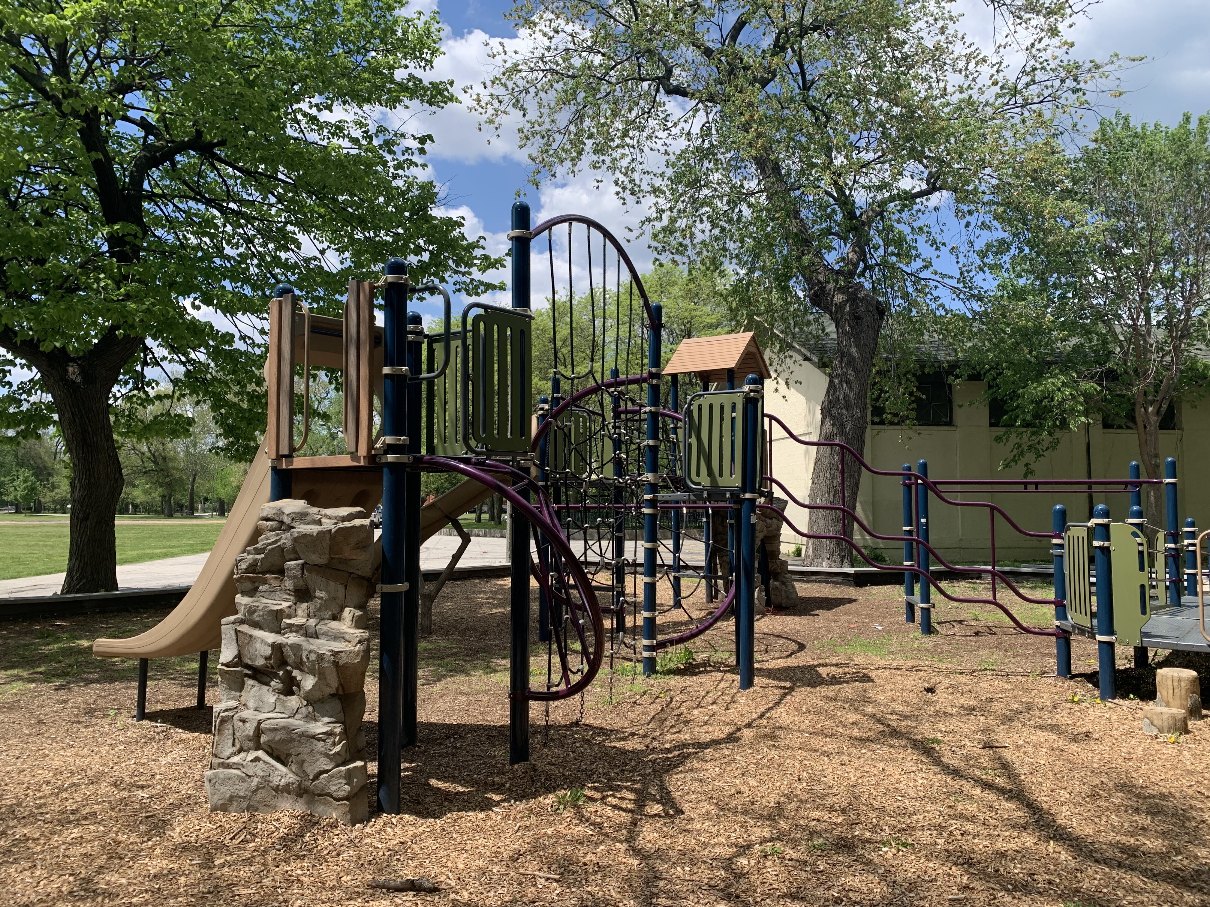 The play areas are not enclosed but they are fenced from the street and set back a bit. The area is shaded by large trees and there are a few benches for seating. The play surface in both areas is wood chips. There is a fieldhouse building just to the north providing bathroom access. All in all, this is a great playground. - Playground Features