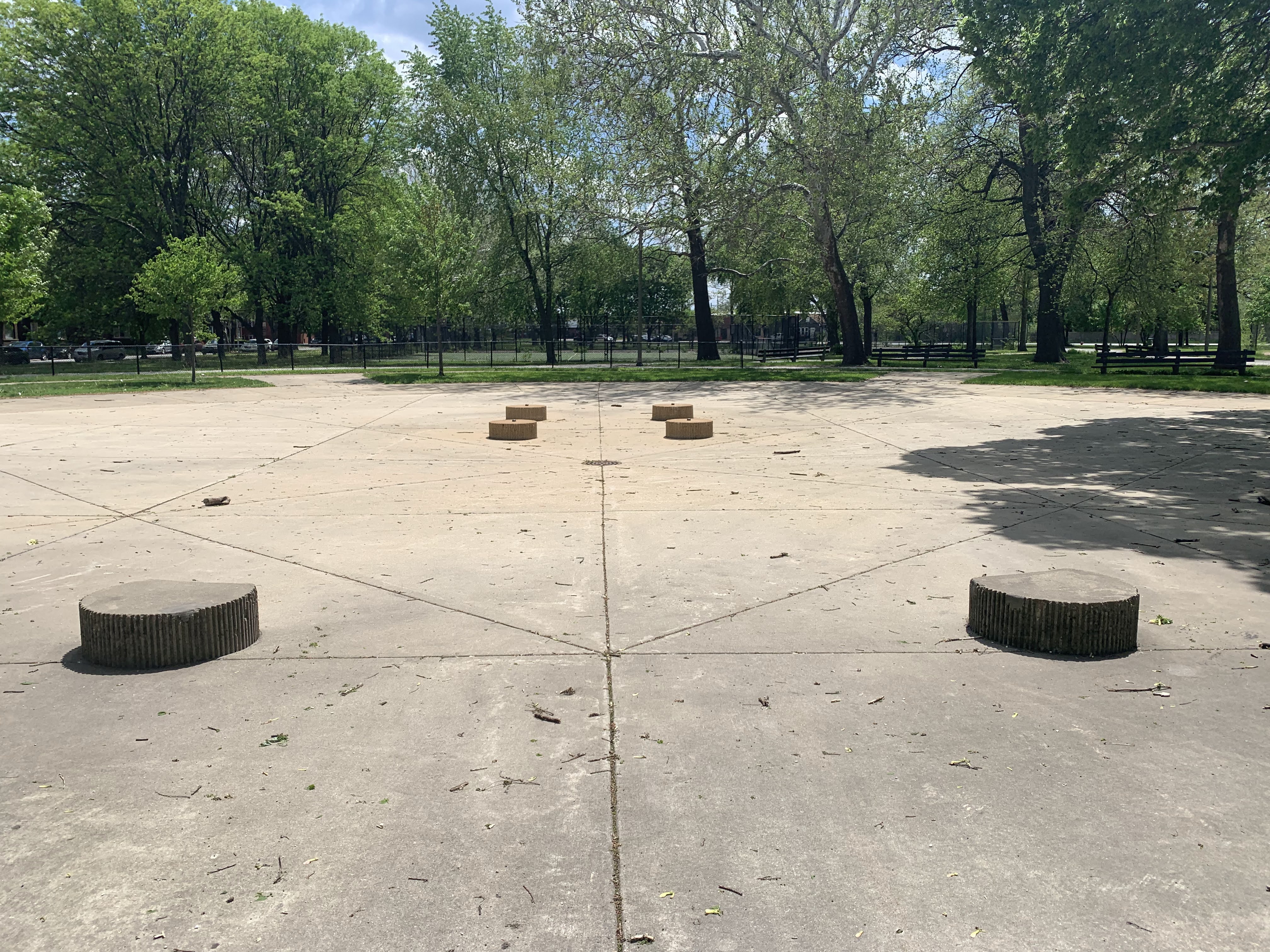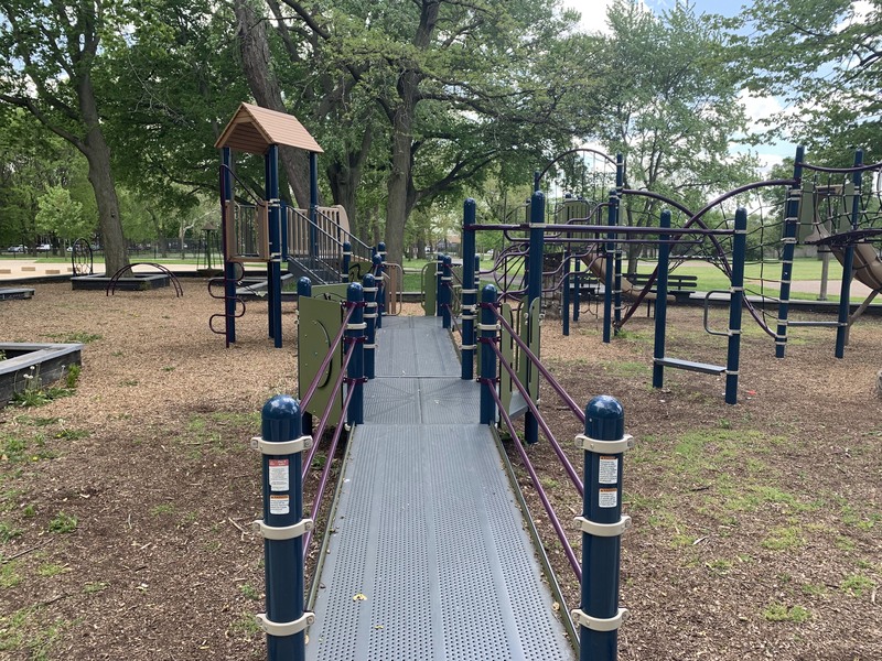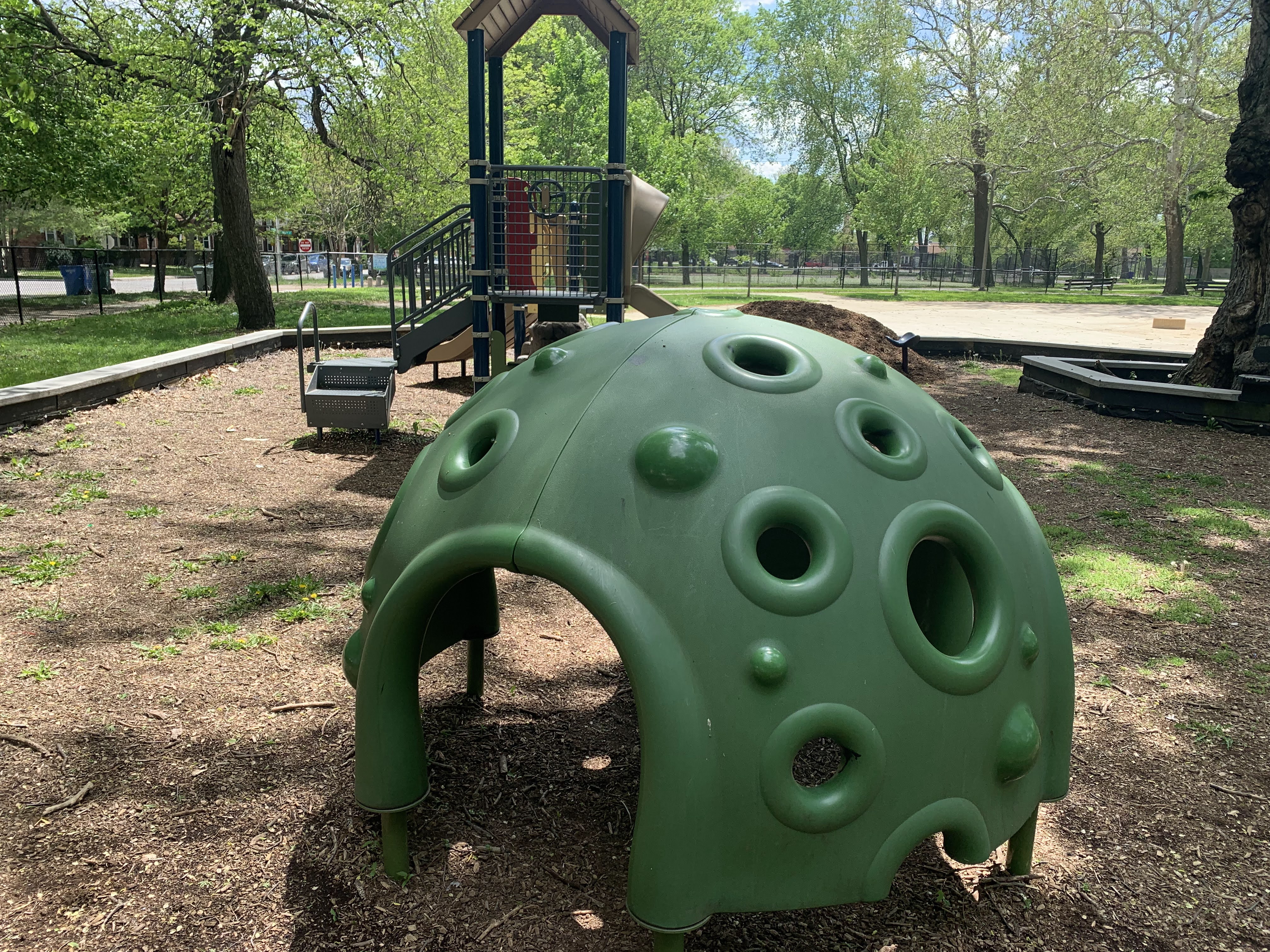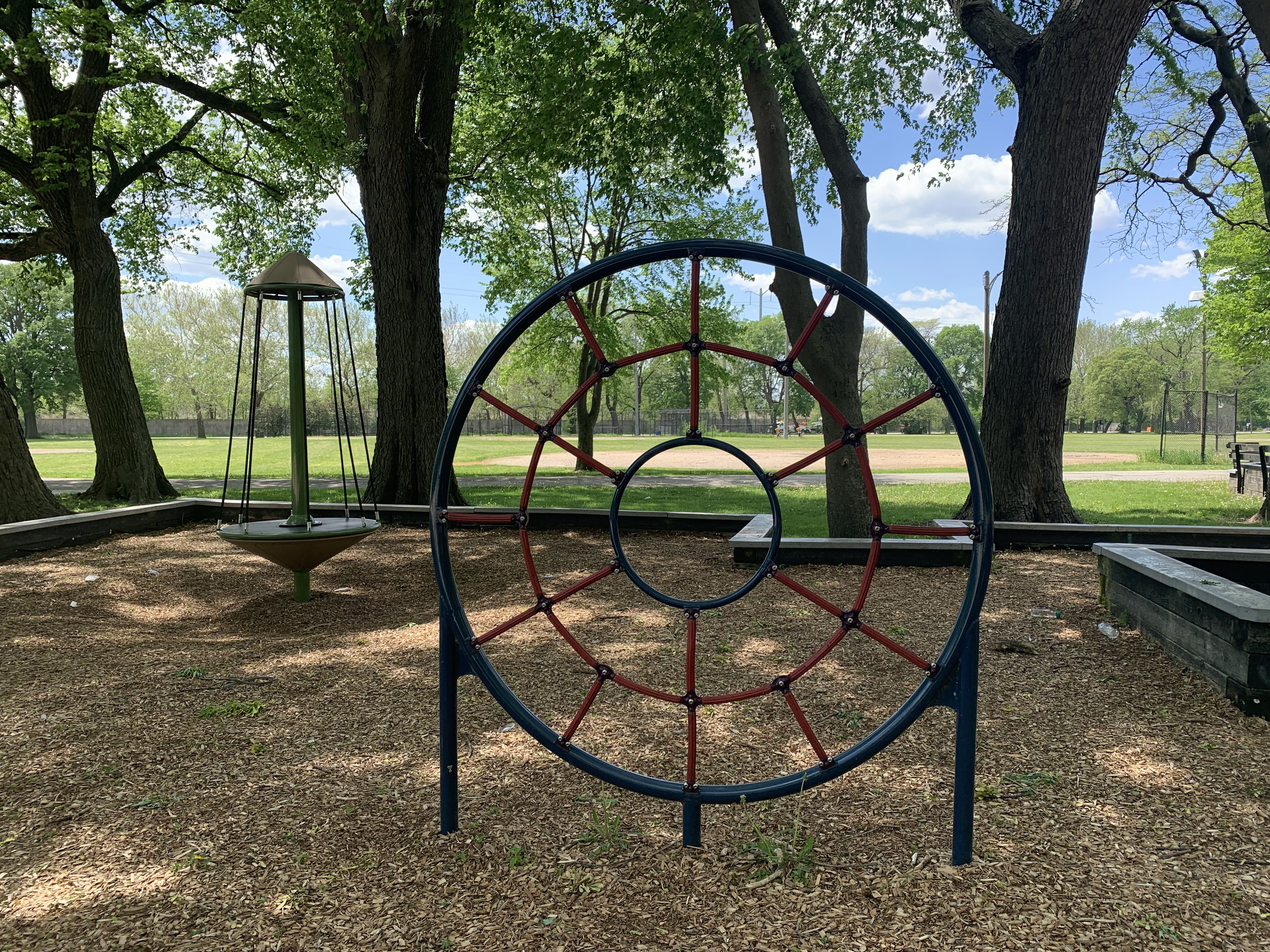 The play areas are not enclosed but they are fenced from the street and set back a bit. The area is shaded by large trees and there are a few benches for seating. The play surface in both areas is wood chips. There is a fieldhouse building just to the north providing bathroom access. All in all, this is a great playground. - Playground Features