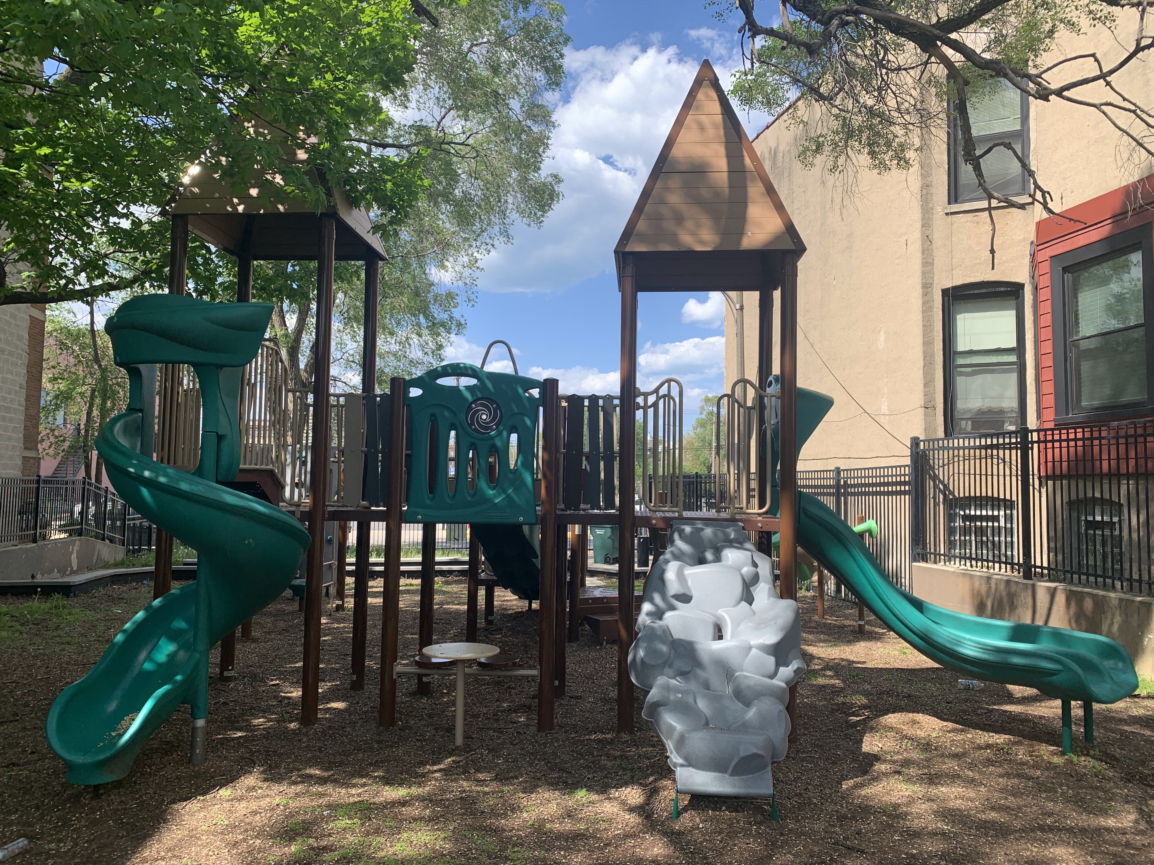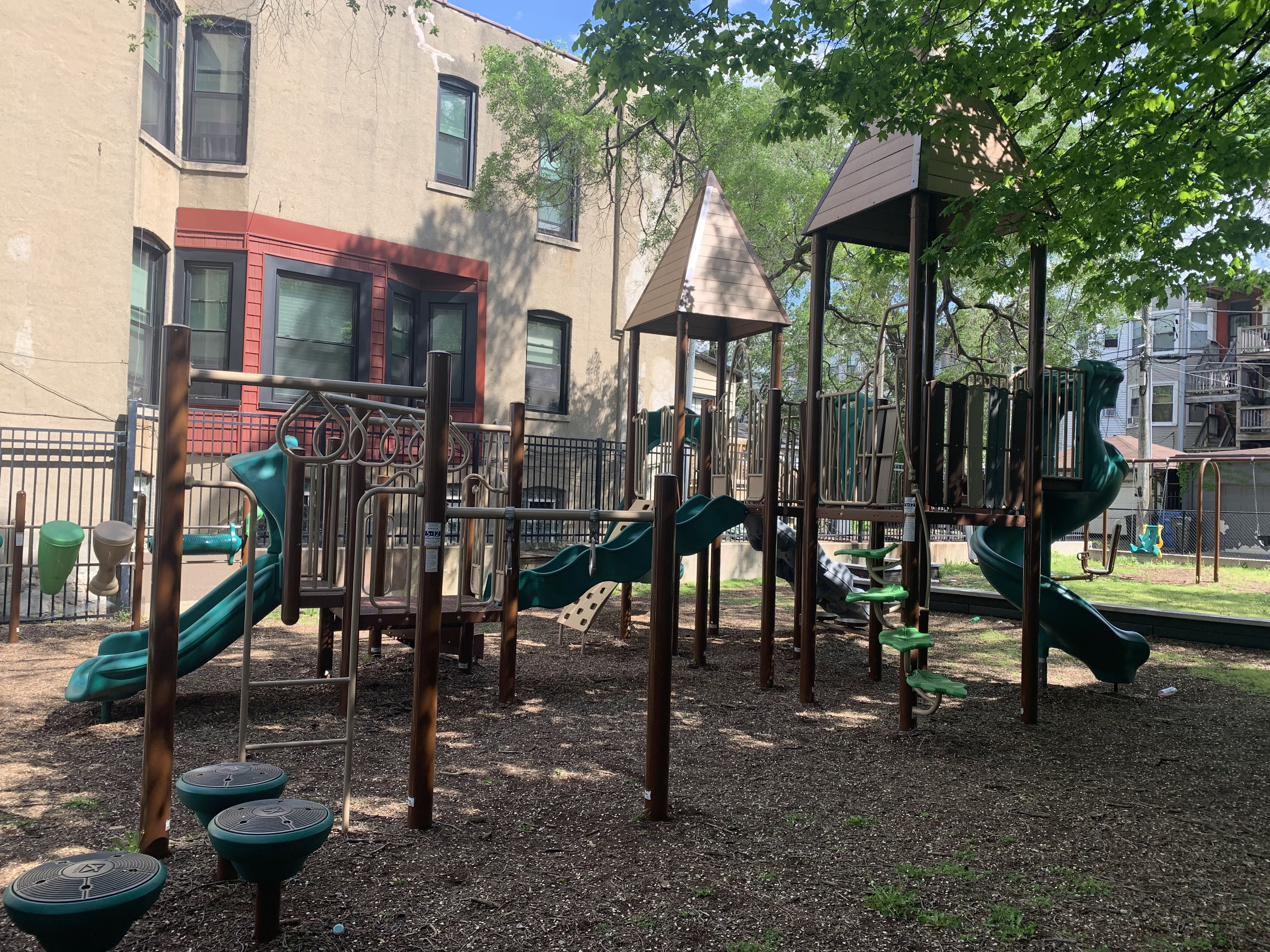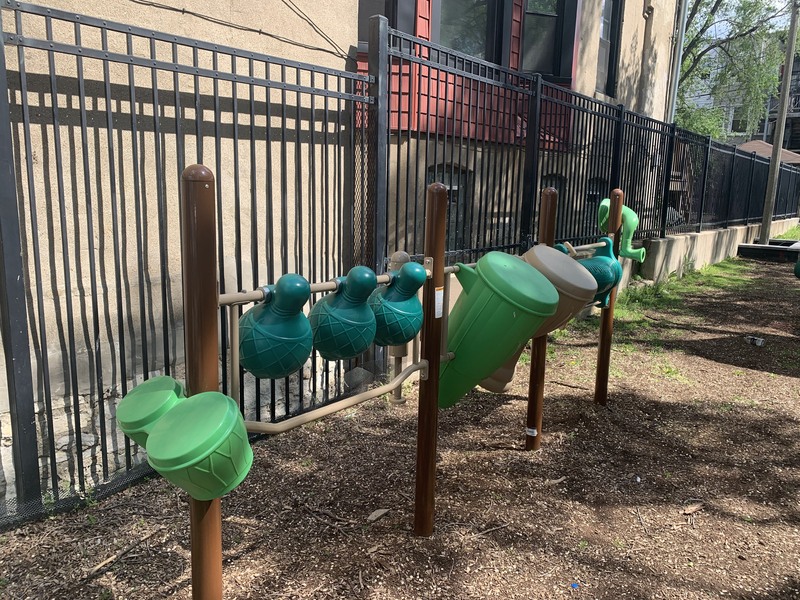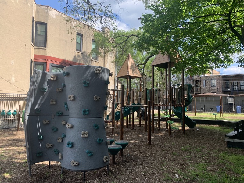 - This tiny neighborhood park is tucked away in the middle of a block but is packed with features. It has a large play structure with a variety of slides and climbing features. There is also a 'musical bar' with a variety of instruments and a small climbing wall. And in the back there are the standard set of swings and a few spinning seats and a see-saw. The play area is shaded by large mature trees and the surface is wood chips. There are a few benches and a drinking fountain as well. This is a standard neighborhood playground in the best sense of the phrase.