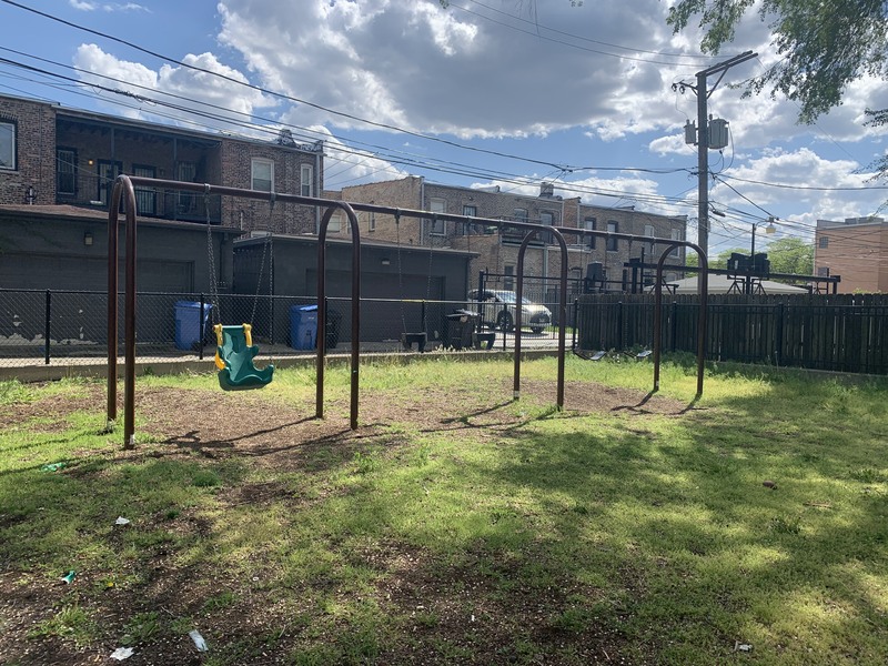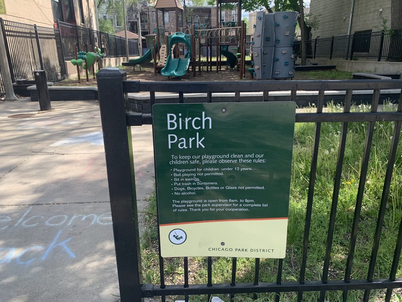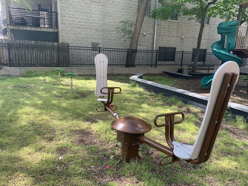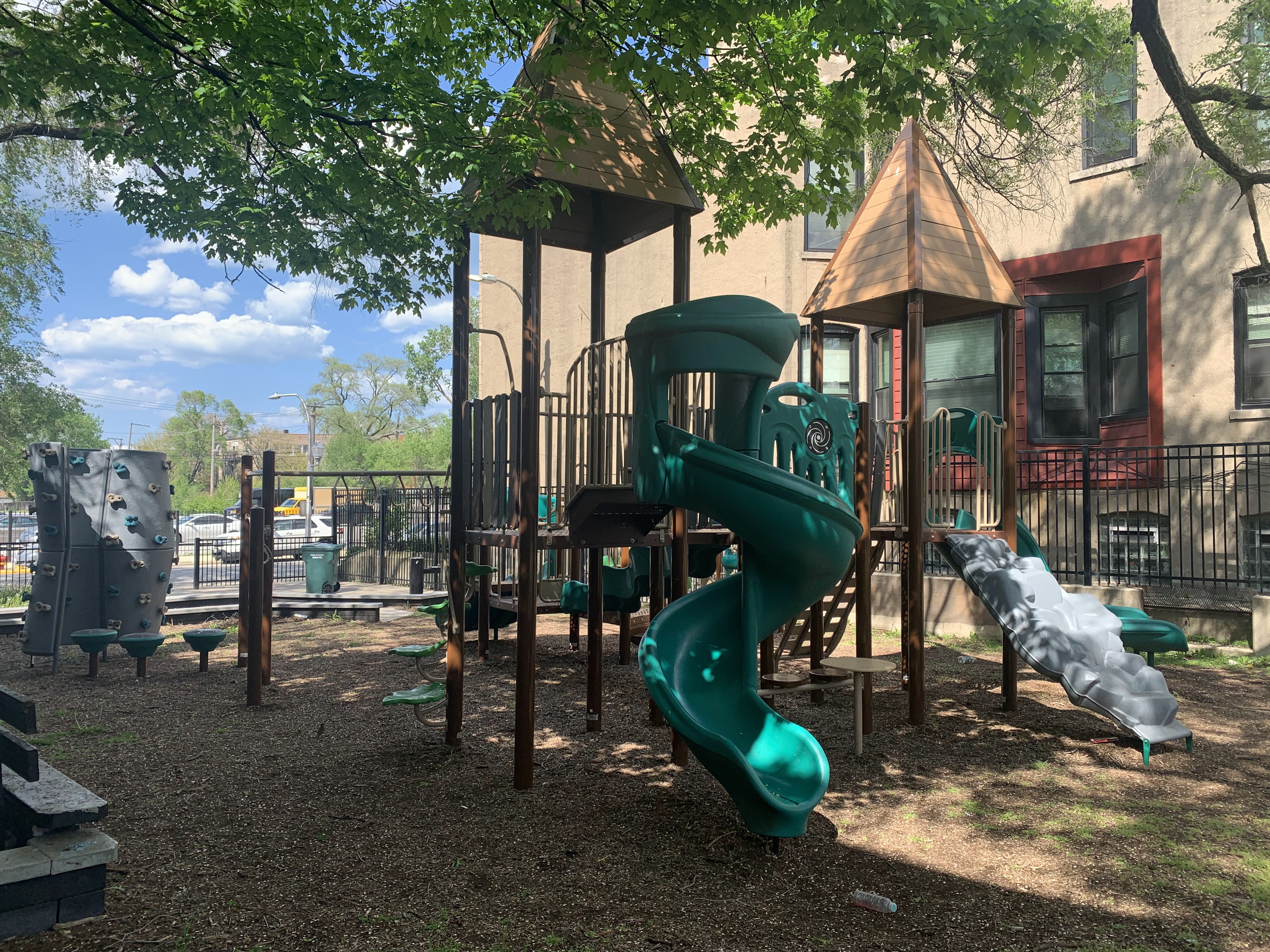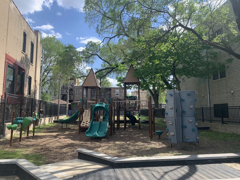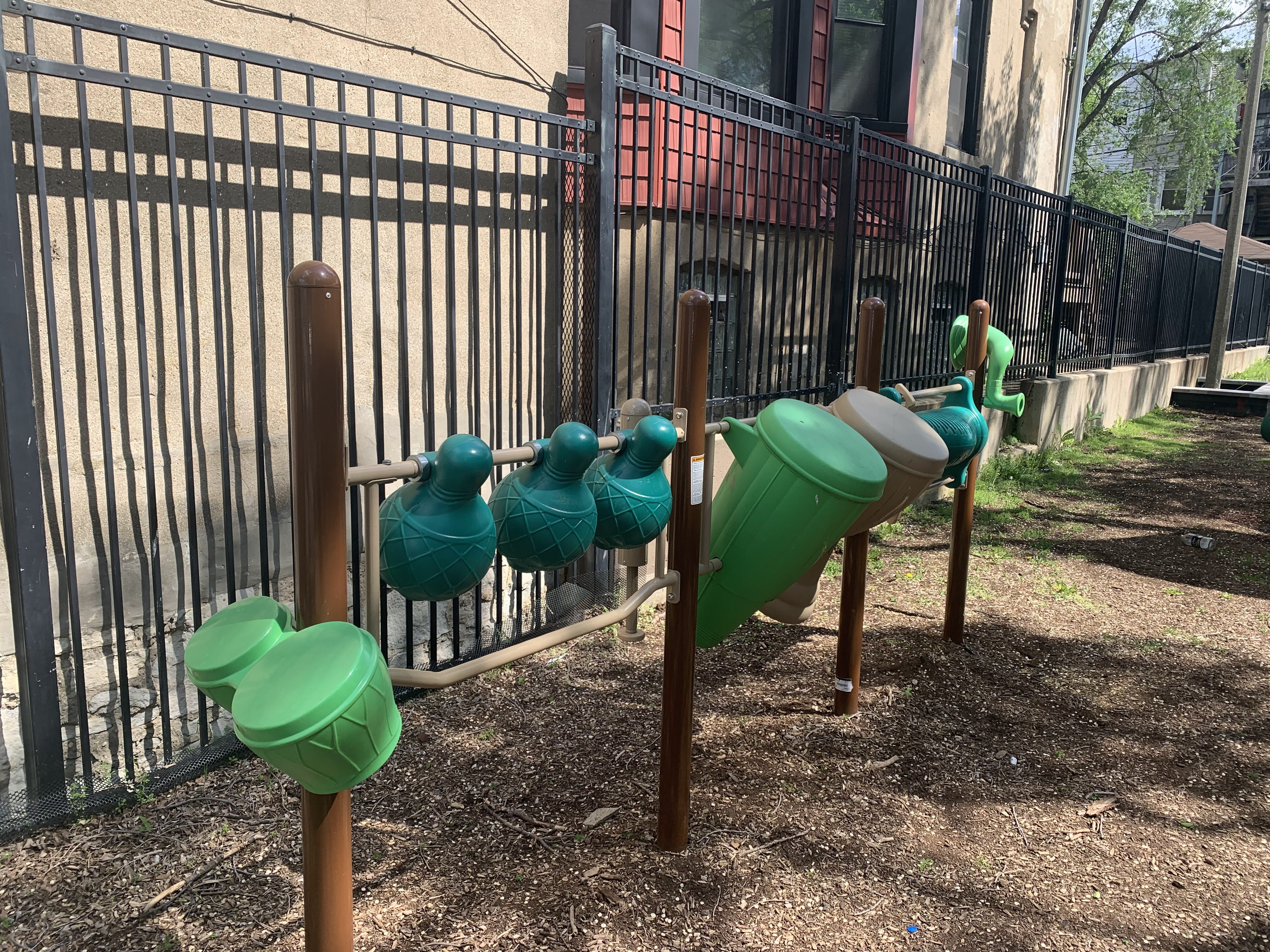 - This tiny neighborhood park is tucked away in the middle of a block but is packed with features. It has a large play structure with a variety of slides and climbing features. There is also a 'musical bar' with a variety of instruments and a small climbing wall. And in the back there are the standard set of swings and a few spinning seats and a see-saw. The play area is shaded by large mature trees and the surface is wood chips. There are a few benches and a drinking fountain as well. This is a standard neighborhood playground in the best sense of the phrase.