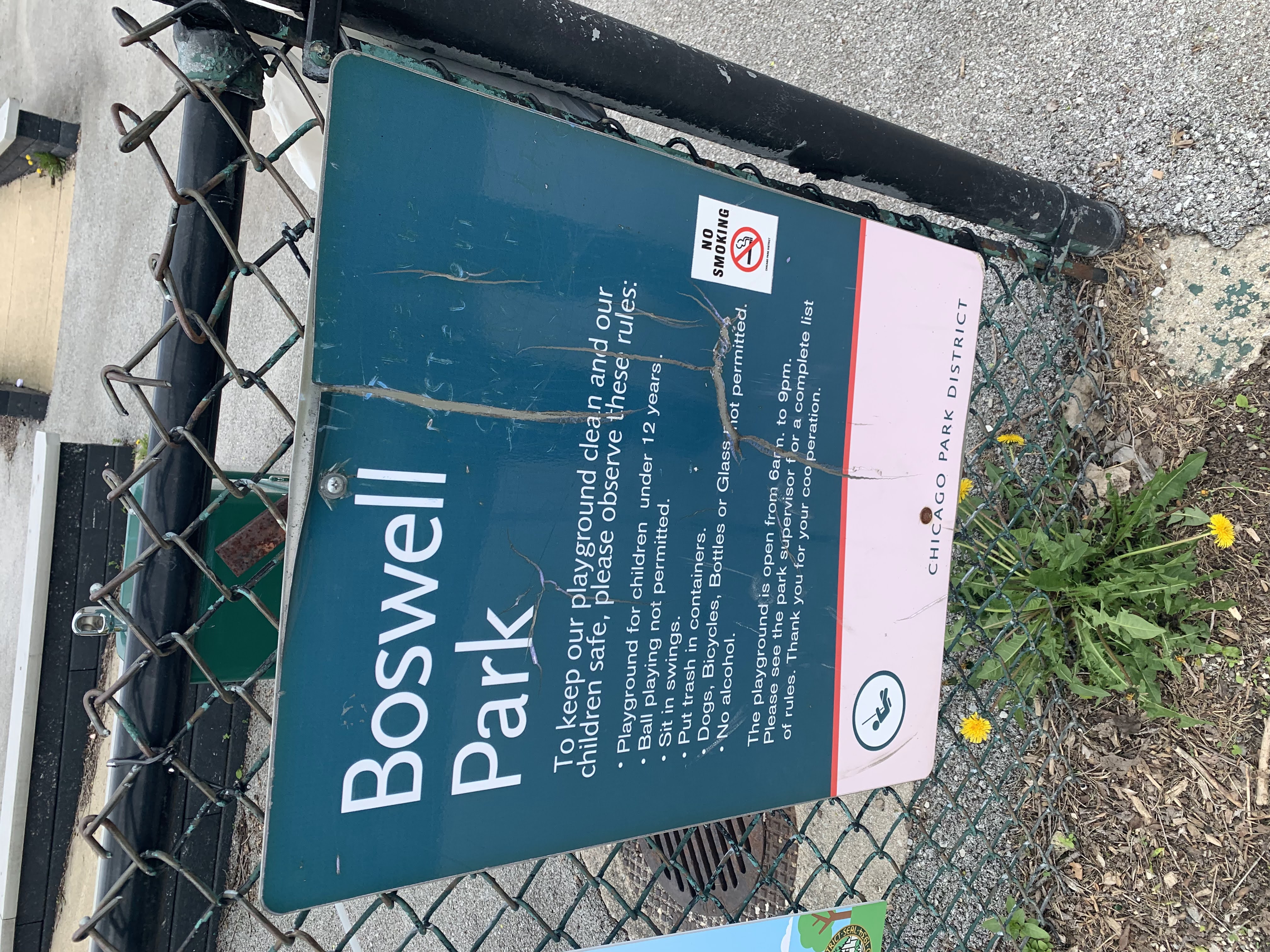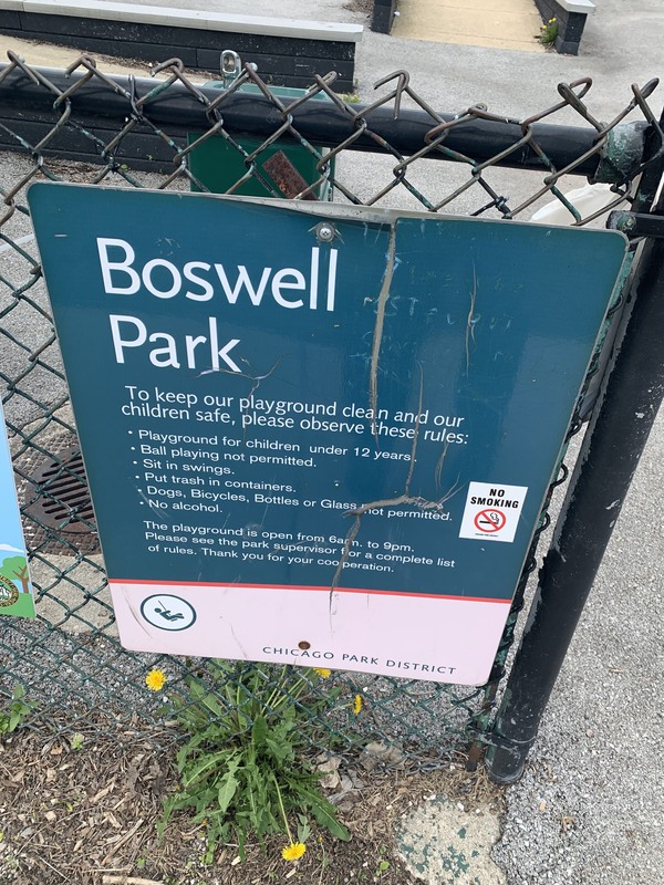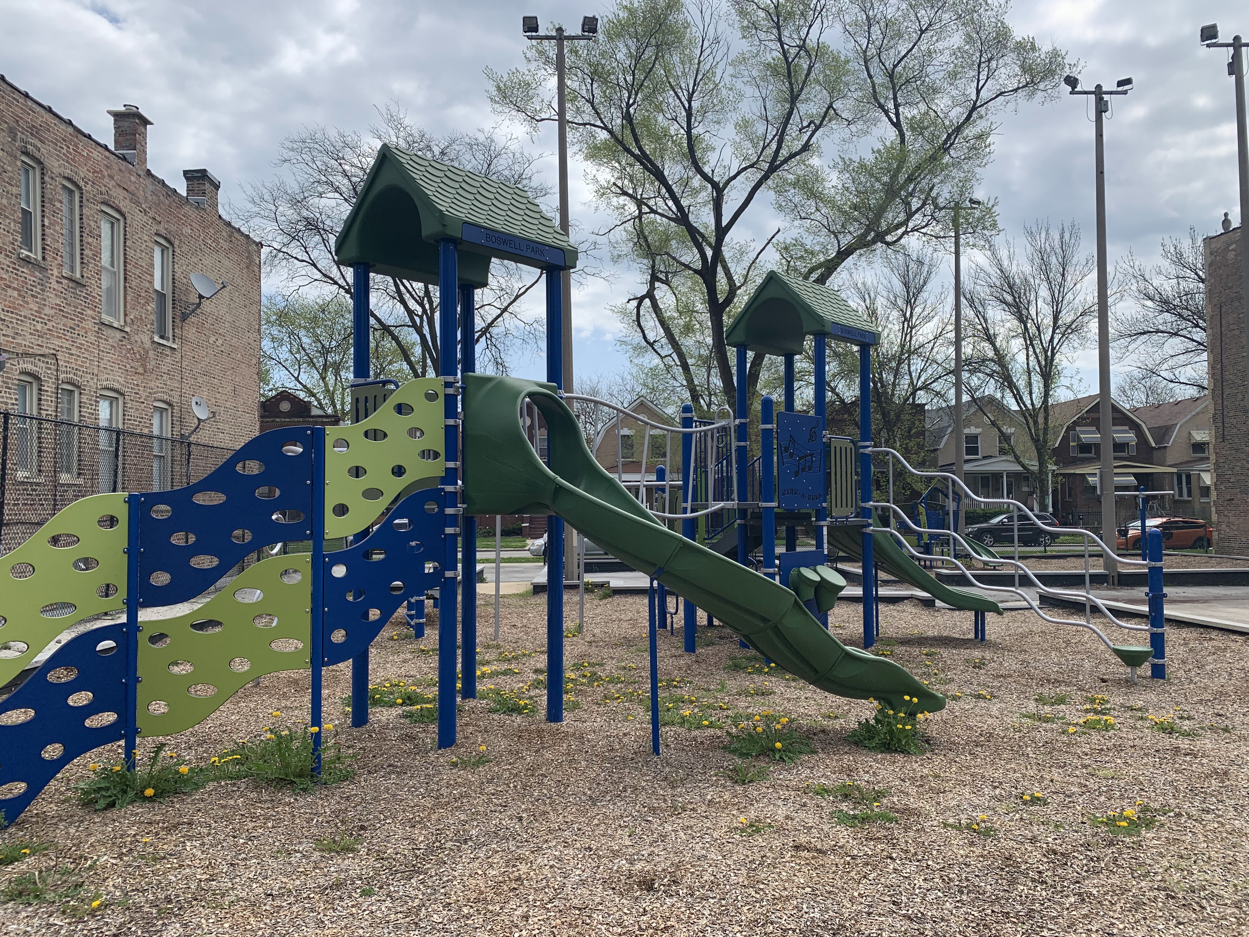 - Tiny Boswell Park sits on a quiet side street and features two small play structures. The smaller structure is designed for younger children and the larger structure is designed for older children and features a variety of slides and traversing elements. There are only toddler swings at the site - not standard belt seat swings - and a few other standalone elements. The play area is mostly enclosed and the play surfaces are wood chips. The park is bright and sunny and there are benches and a drinking fountain near the entrance.