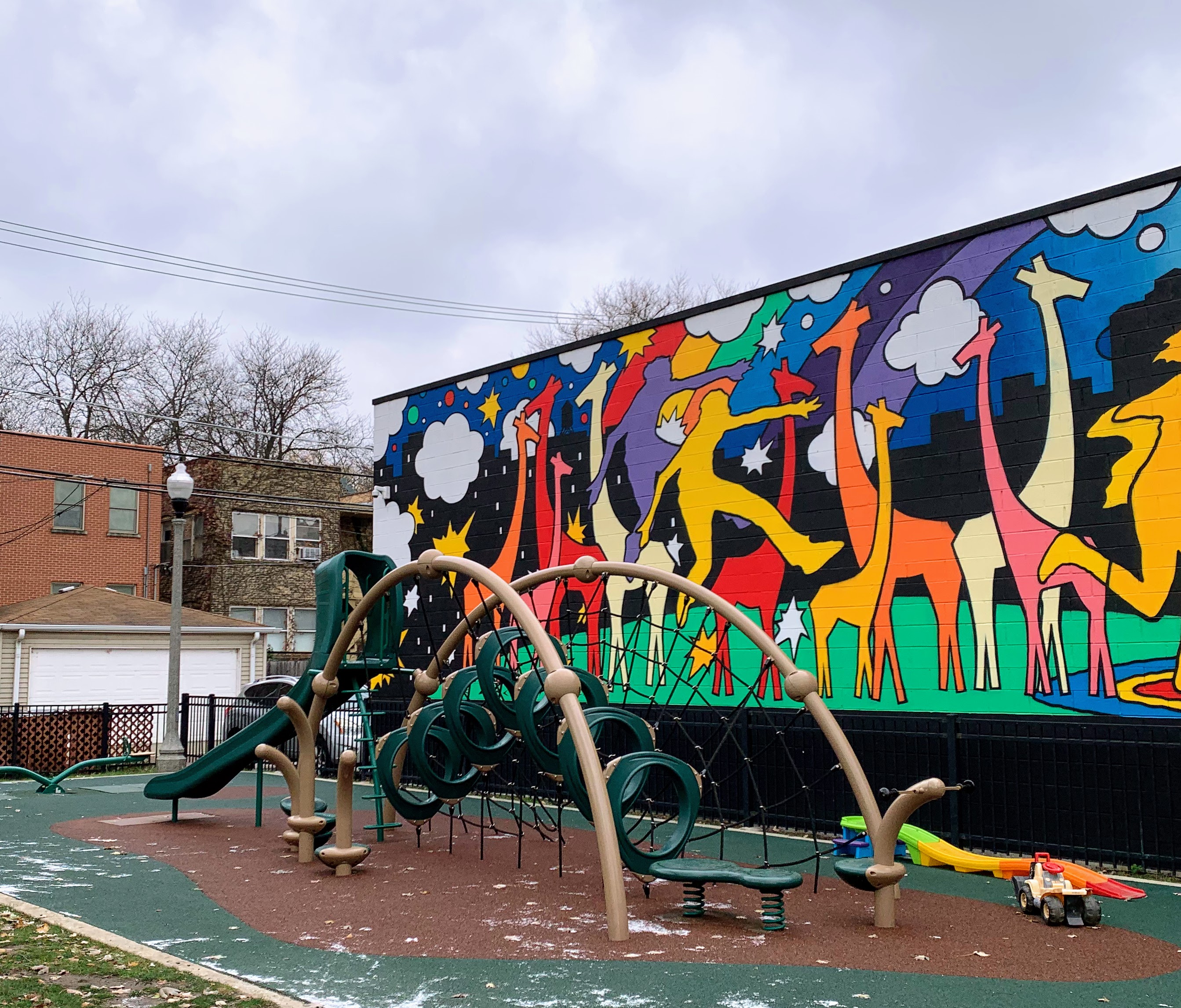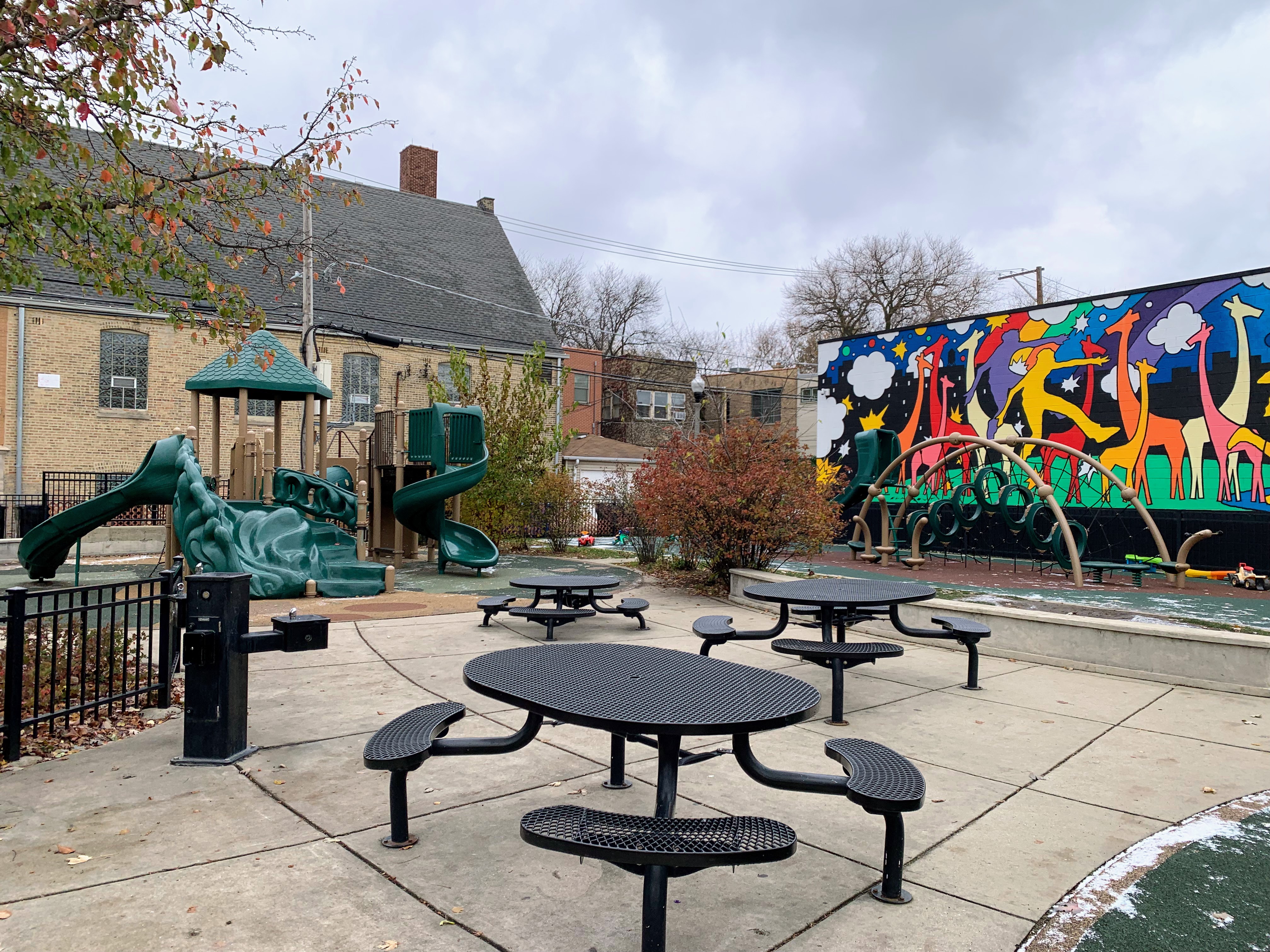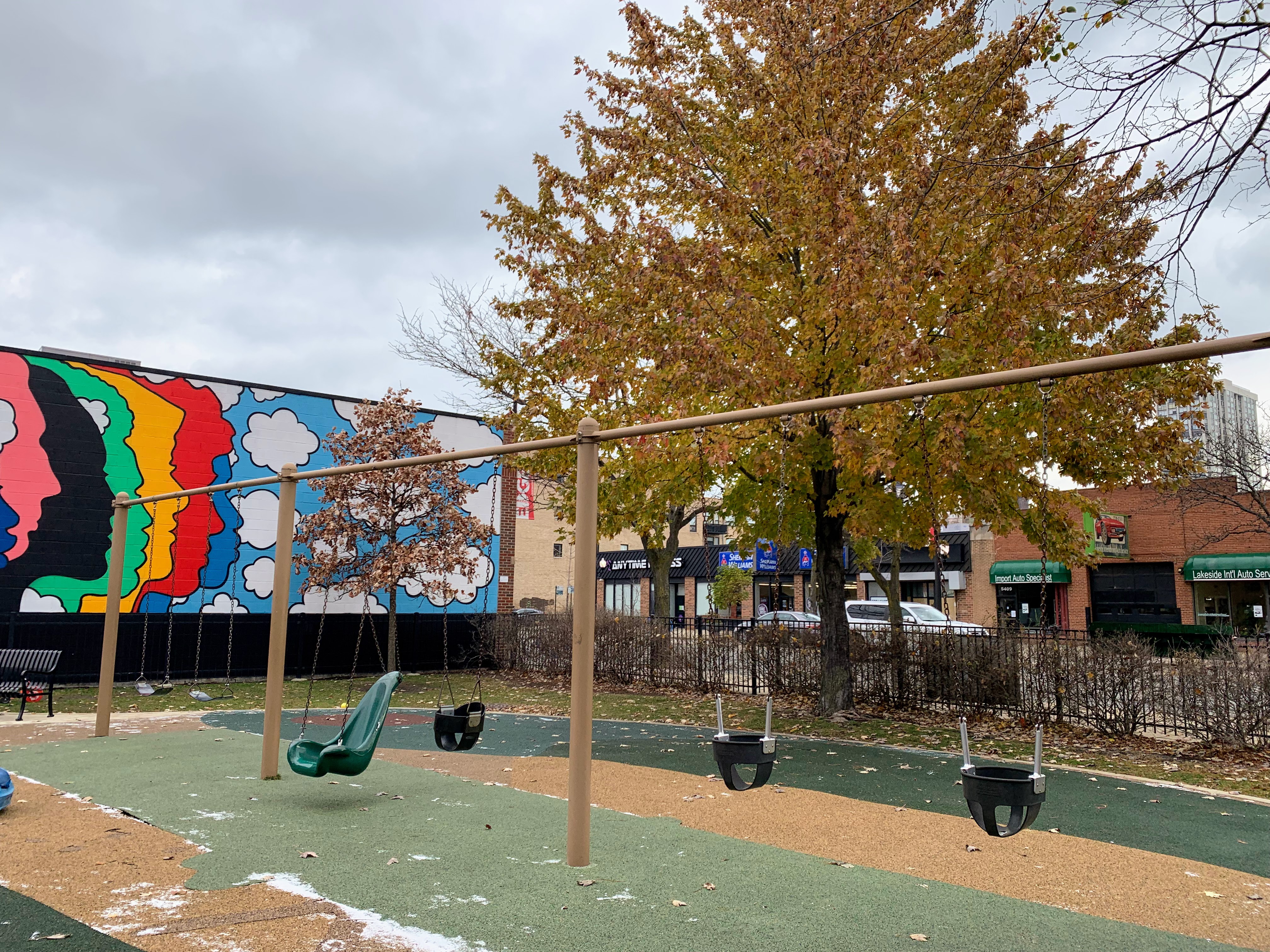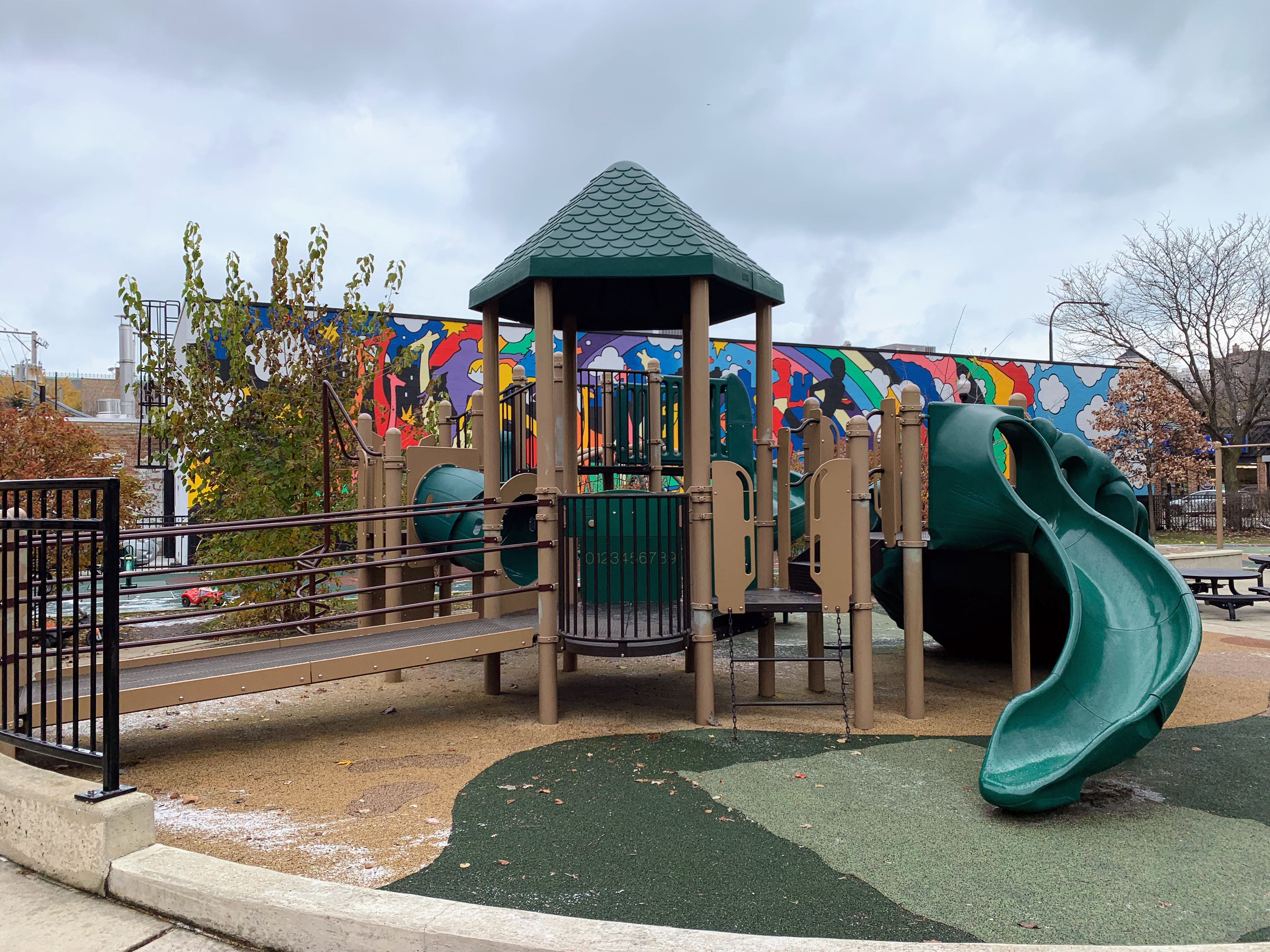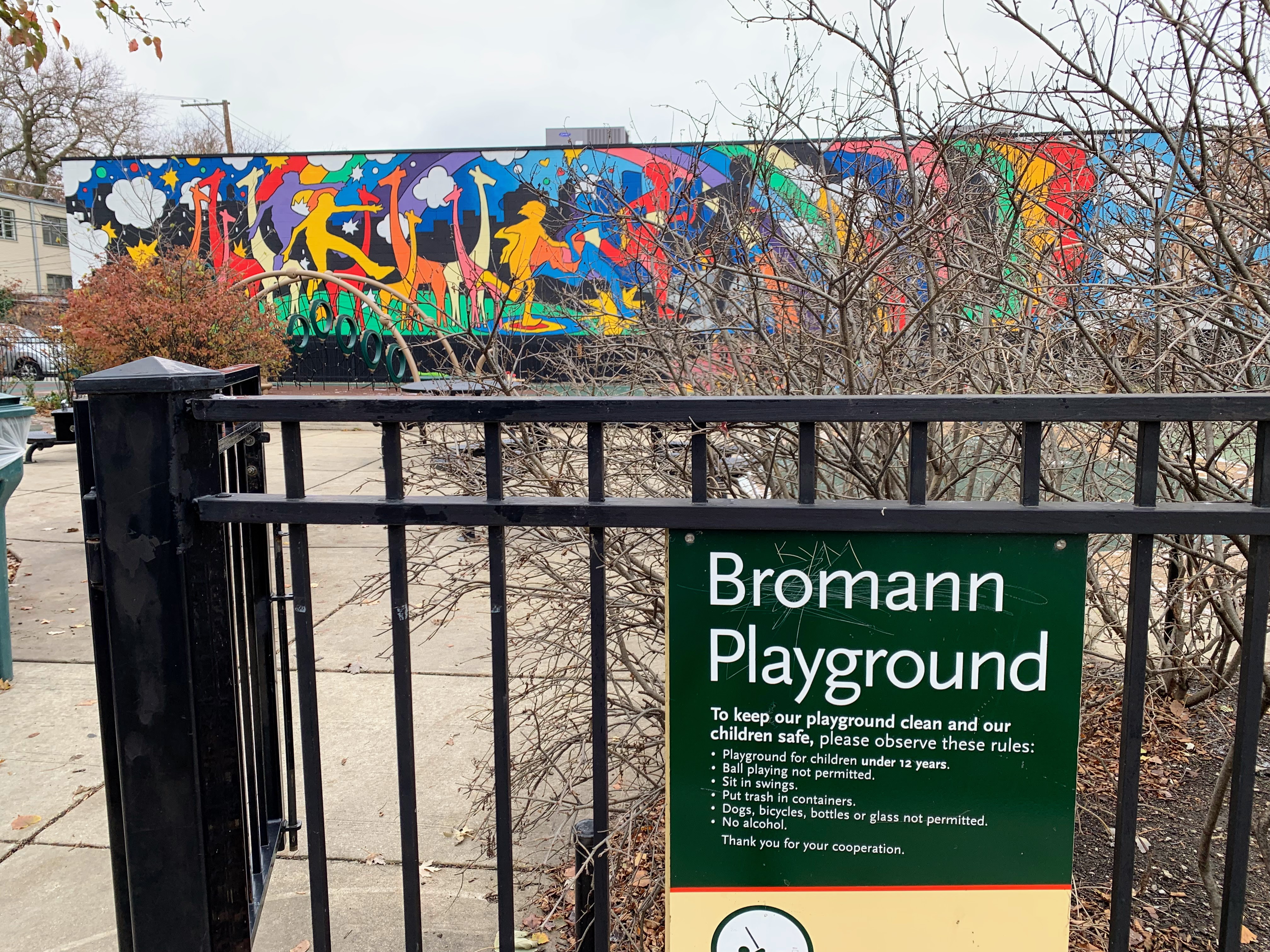 - Bromann Park is a busy park on a busy corner of Chicago that fits a lot of equipment and amenities into a very small site. There is a standard set of swings, a collection of climbing/traversing elements, and a moderate size play structure accessible via a ramp. The amenities are solid: there are benches and picnic tables in the fully enclosed play area as well as a drinking fountain. The play surface is soft rubber and there is a lovely mural on the wall forming the north side of the park. All in all, this is a great little park - highly recommend.
