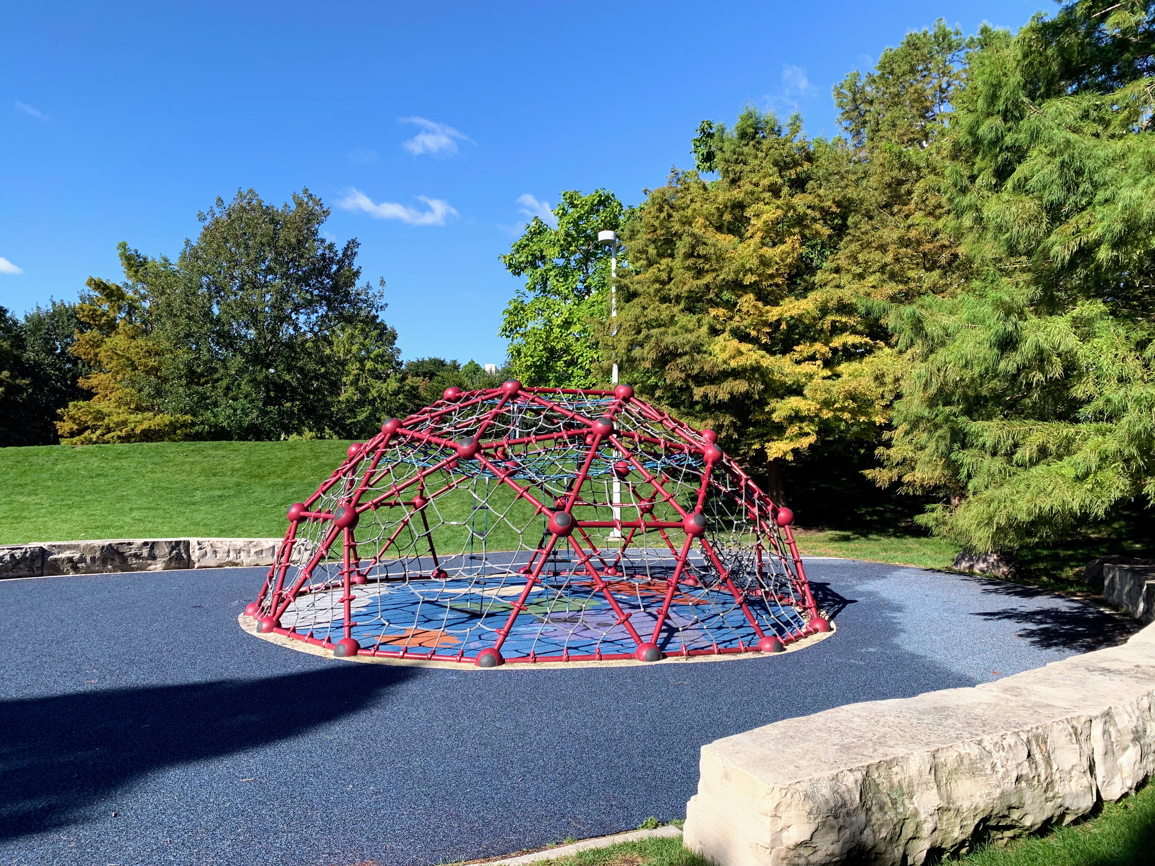 This playground - officially part of Burnham Park - is located just south of the museum campus and northeast of Solider Field and consists of a single rope/net climbing element. The surface is sort rubber and although it is tucked away between trees and small hills, this site is not enclosed and quite open to the roads nearby. There are a few benches for seating.