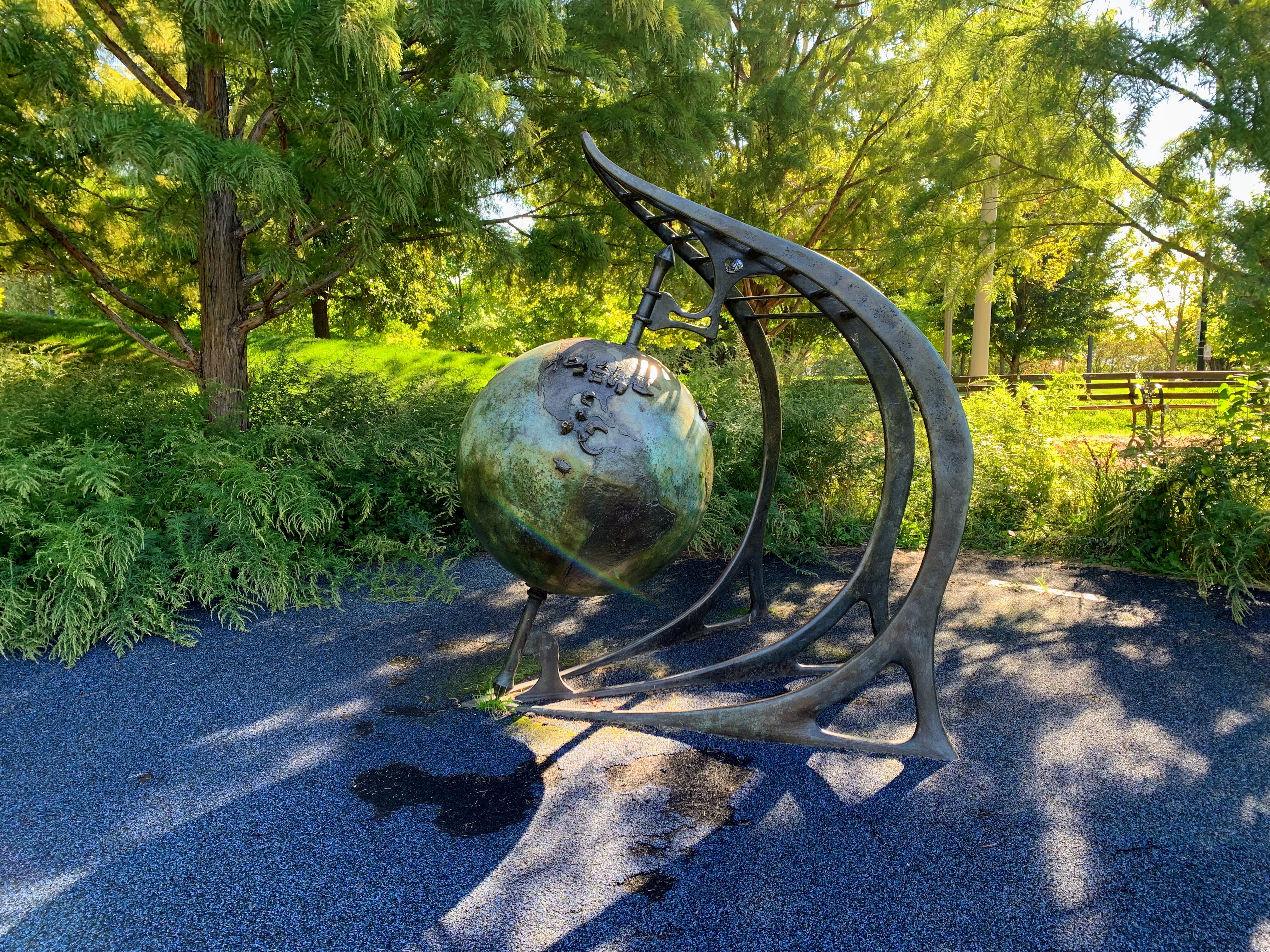 This play structure is incorporated into the Solider Field Children's Garden. According to the Chicago Park District's website, this Children's Garden "thematically relates to the three museums nearby—the Field Museum of Natural History, the Shedd Aquarium, and the Adler Planetarium. Throughout the play space, various features evoke the themes of each museum. Large sculptural spheres representing the Earth can be climbed on or walked through. A path spirals around like a nautilus. There is a spider web-like jungle gym. Children who explore carefully will also find other subtle imagery such as seahorses and the Milky Way." - Playground Equipment