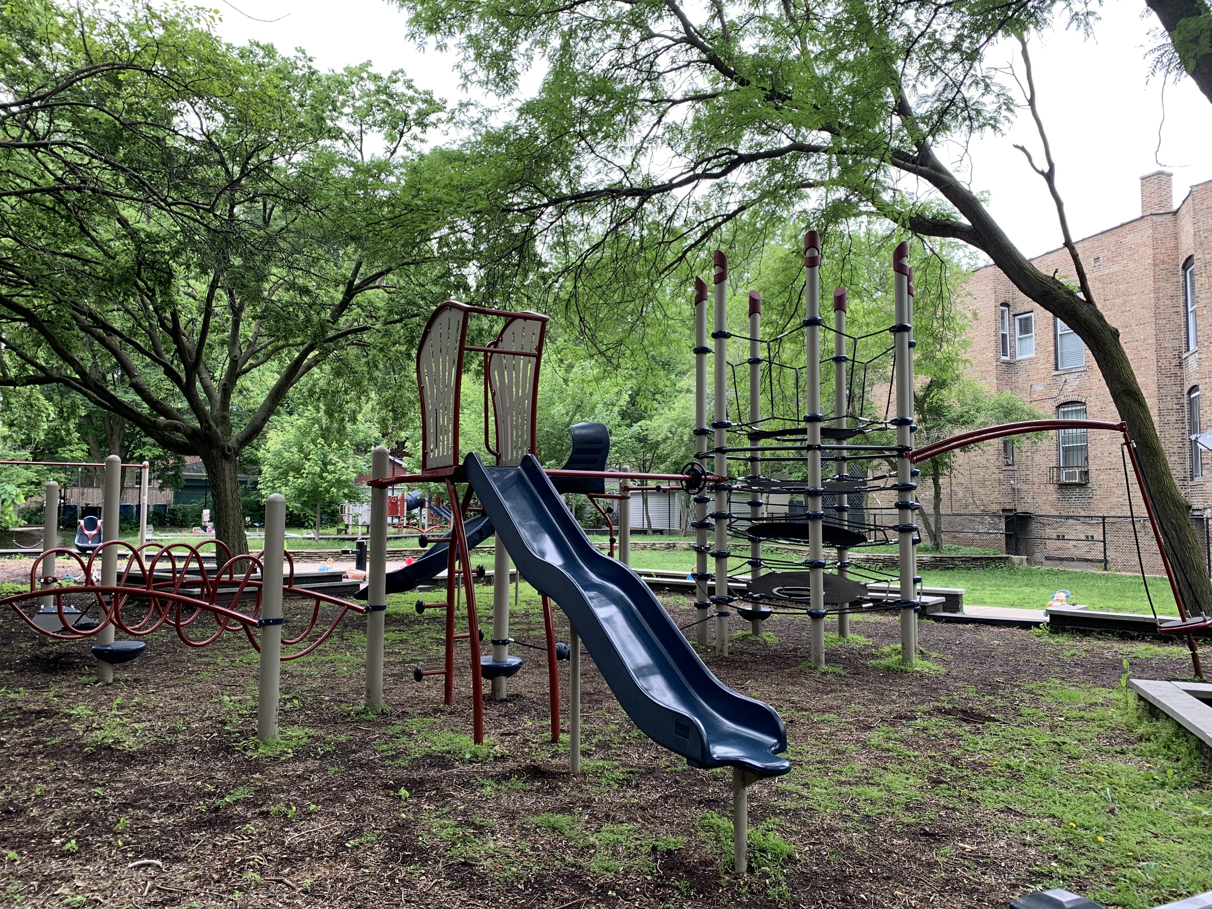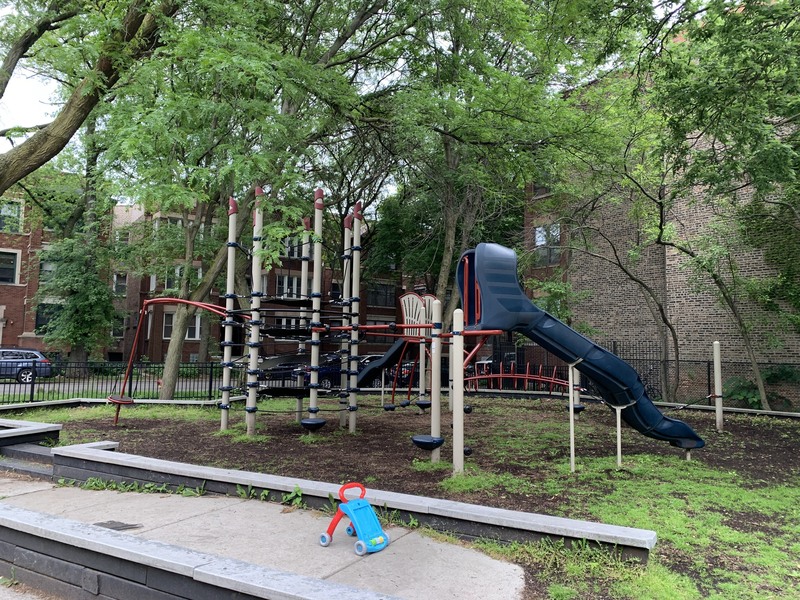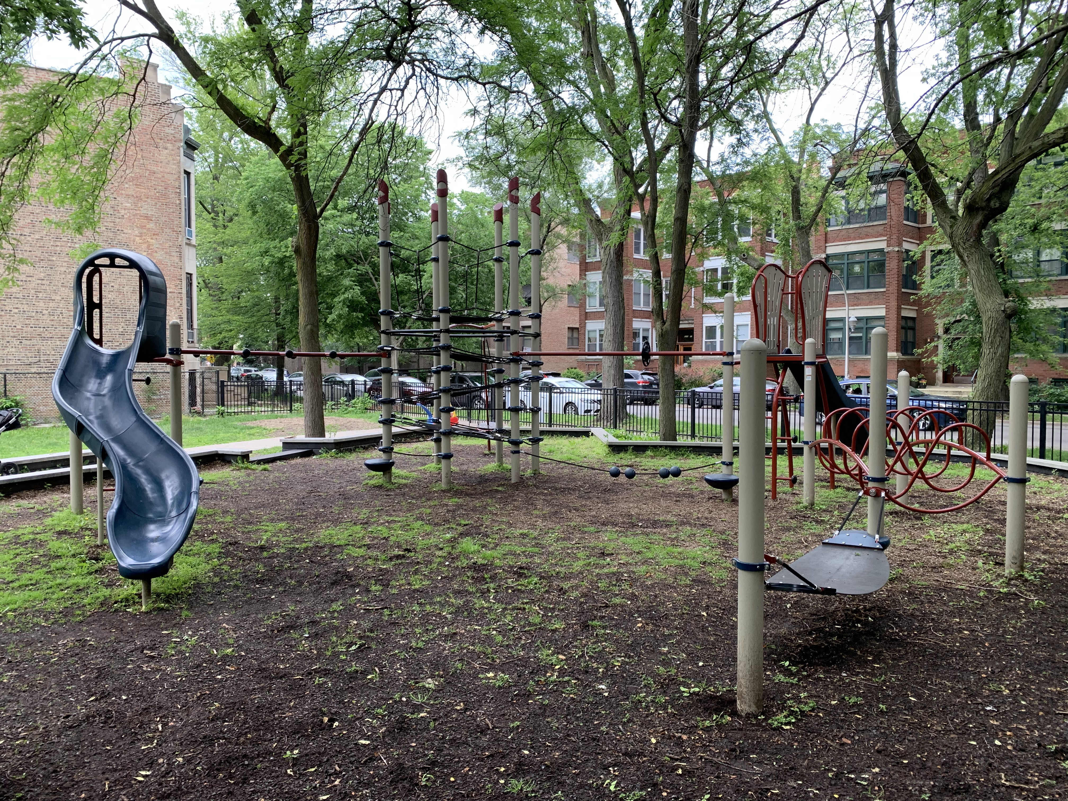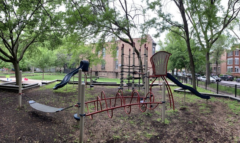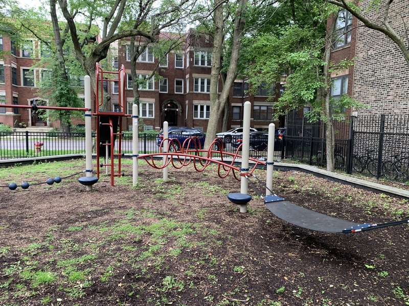 - Butternut Park features a large playground with two separate area in a small and shady location. Near the entrance is a set of elements for older children including some monkey bars and slides as well as a large rope/net climbing structure. Near the back of the park is a smaller structure for younger children and a set of toddler swings. There are also the standard swings (toddler, adaptive, and belt seat) and a few standalone elements. The site itself is located in the middle of a residential block and is fully enclosed. The main play surface is wood chips though there is a grassy area as well. There aren't formal benches but low walls throughout the site provide some seating and large, mature trees provide shade. All things considered, this is a good neighborhood playground.