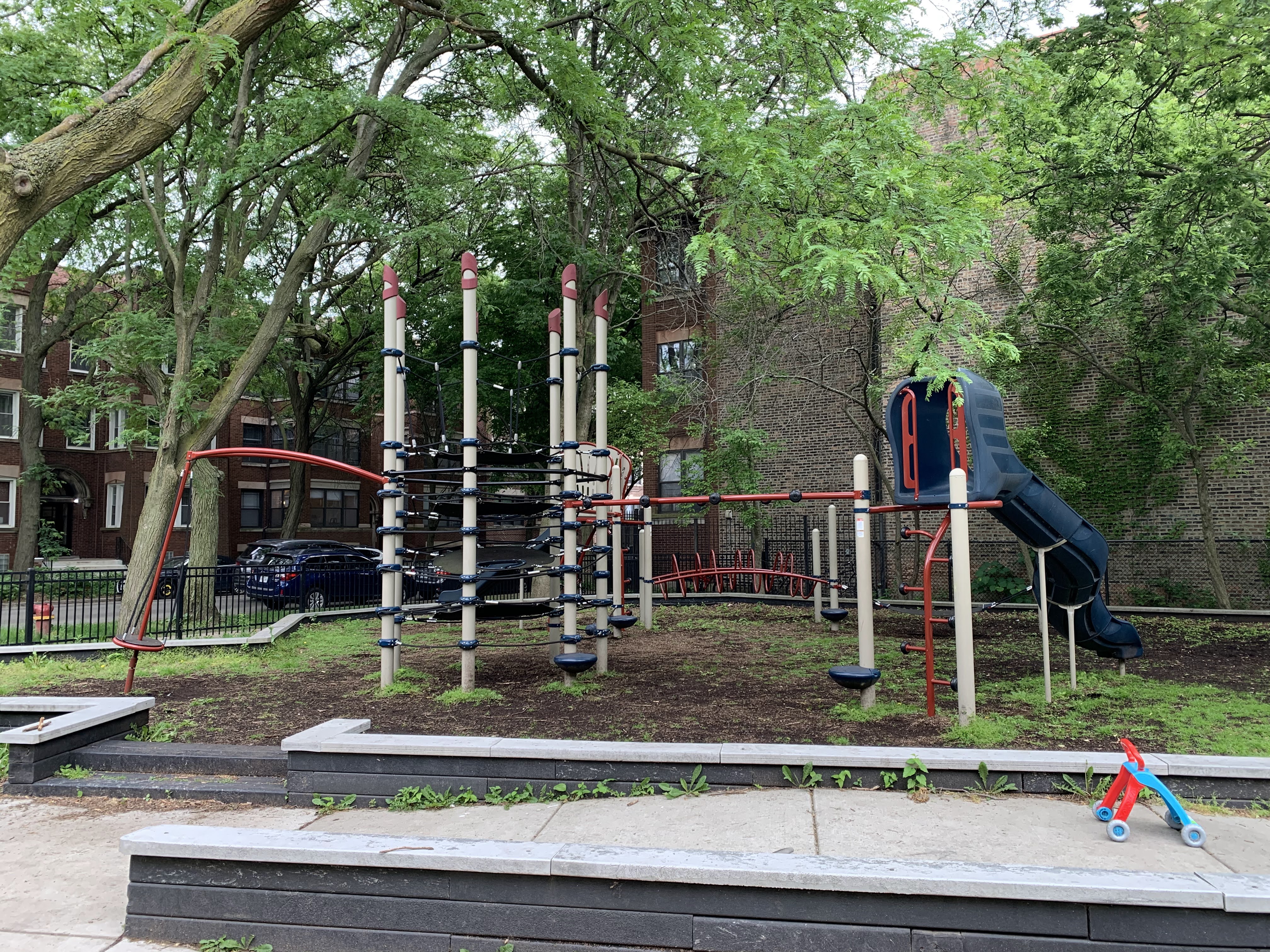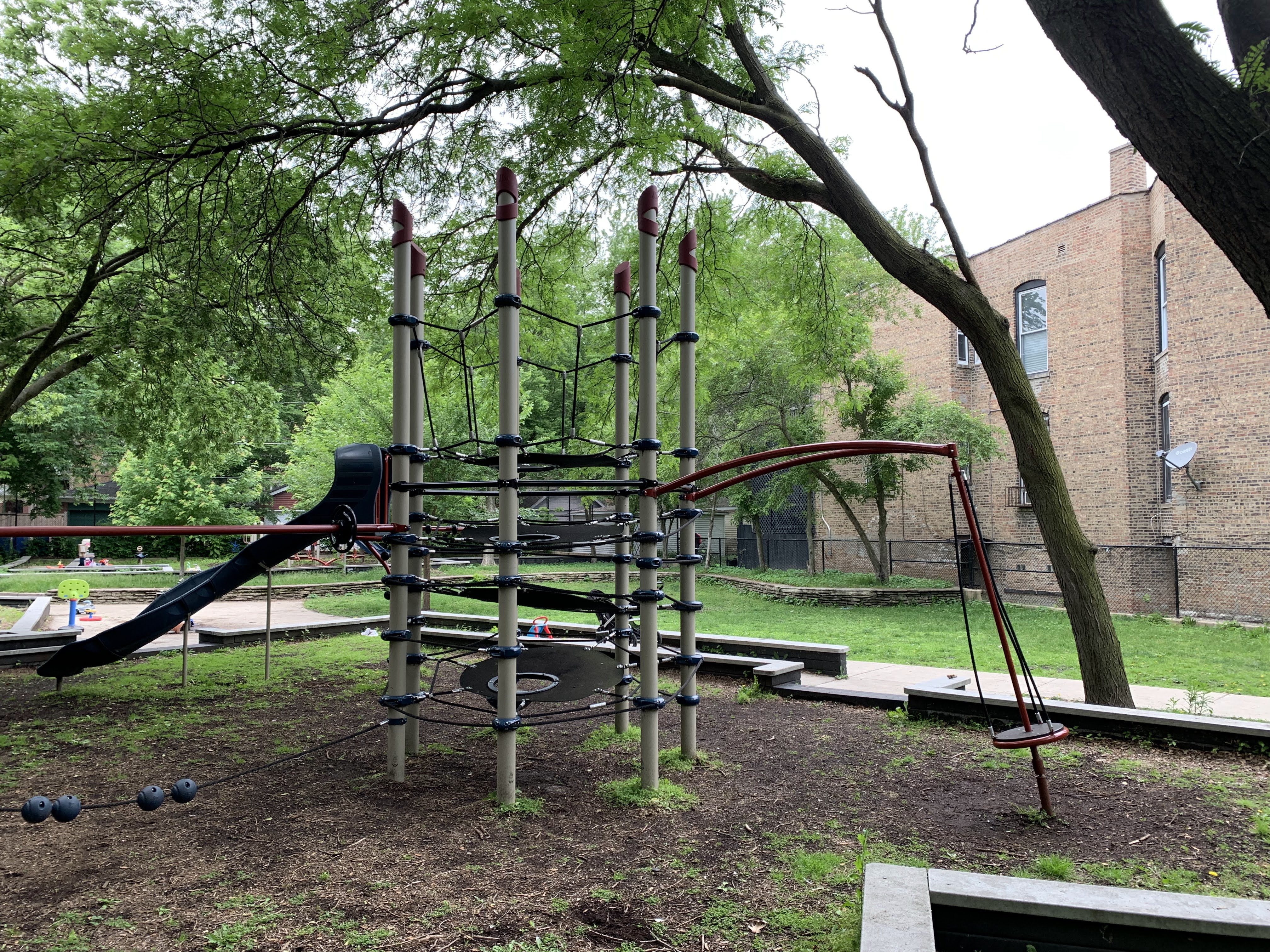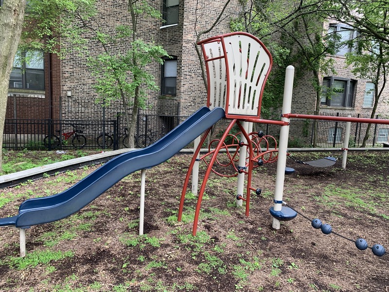 - Butternut Park features a large playground with two separate area in a small and shady location. Near the entrance is a set of elements for older children including some monkey bars and slides as well as a large rope/net climbing structure. Near the back of the park is a smaller structure for younger children and a set of toddler swings. There are also the standard swings (toddler, adaptive, and belt seat) and a few standalone elements. The site itself is located in the middle of a residential block and is fully enclosed. The main play surface is wood chips though there is a grassy area as well. There aren't formal benches but low walls throughout the site provide some seating and large, mature trees provide shade. All things considered, this is a good neighborhood playground.