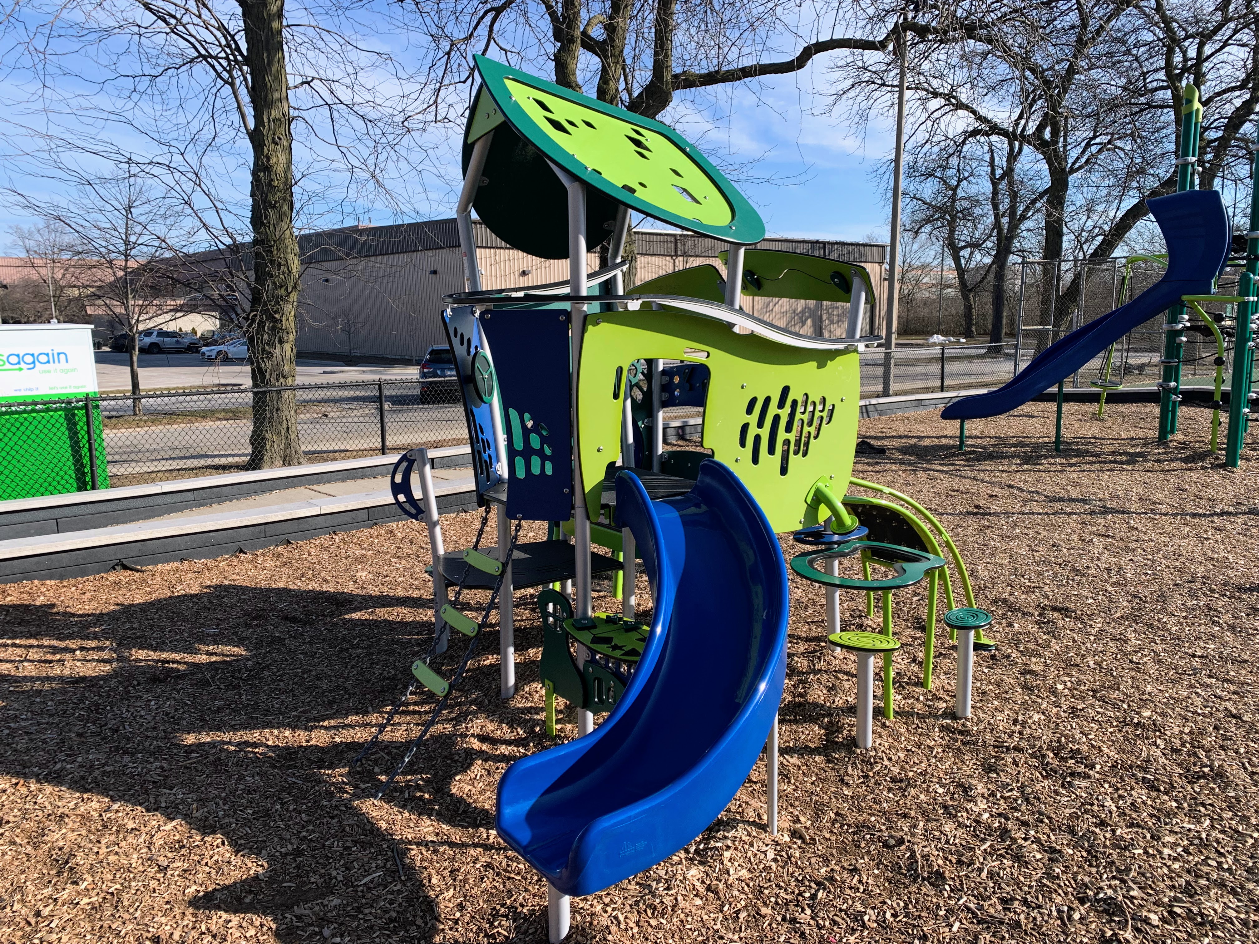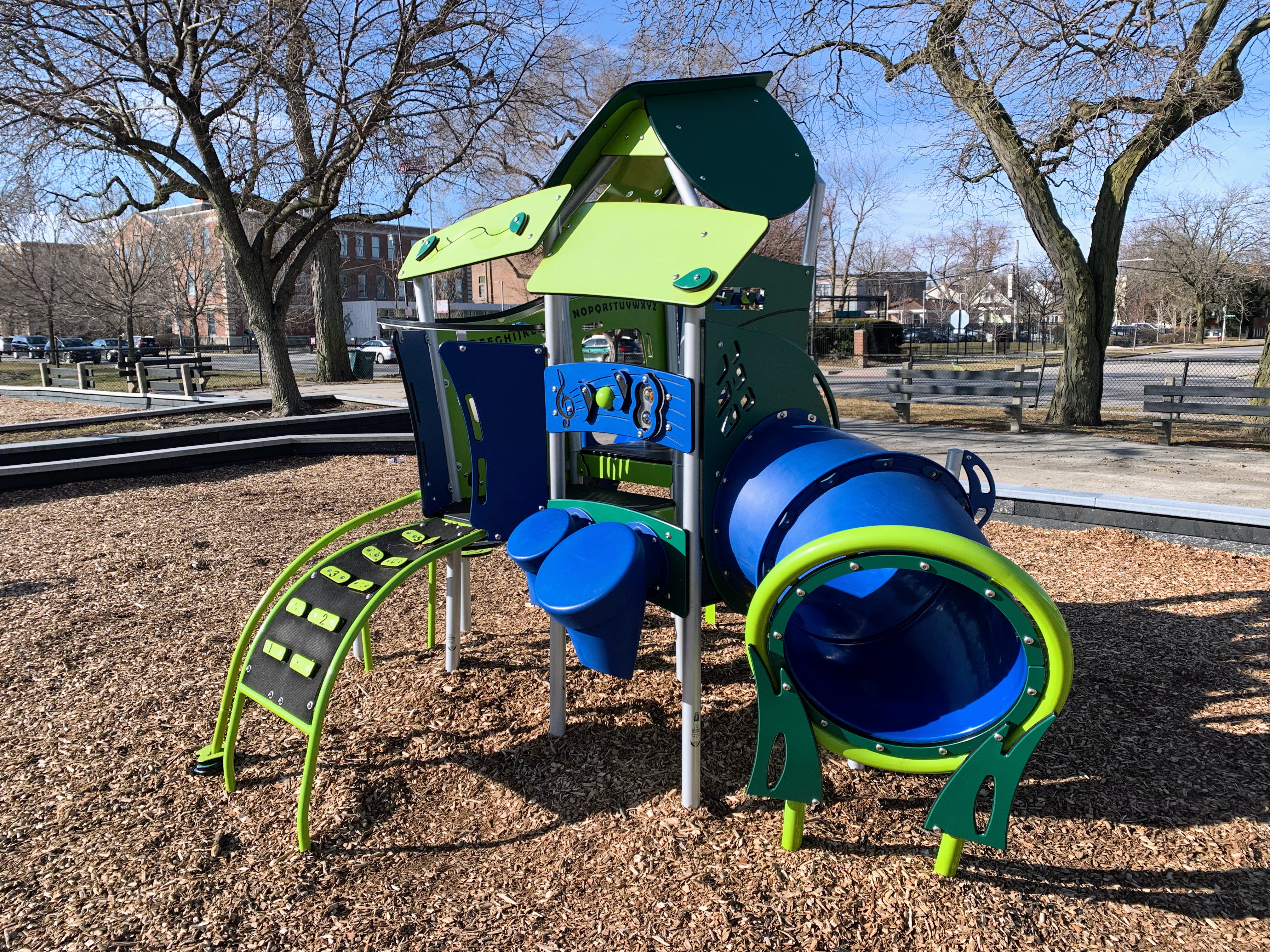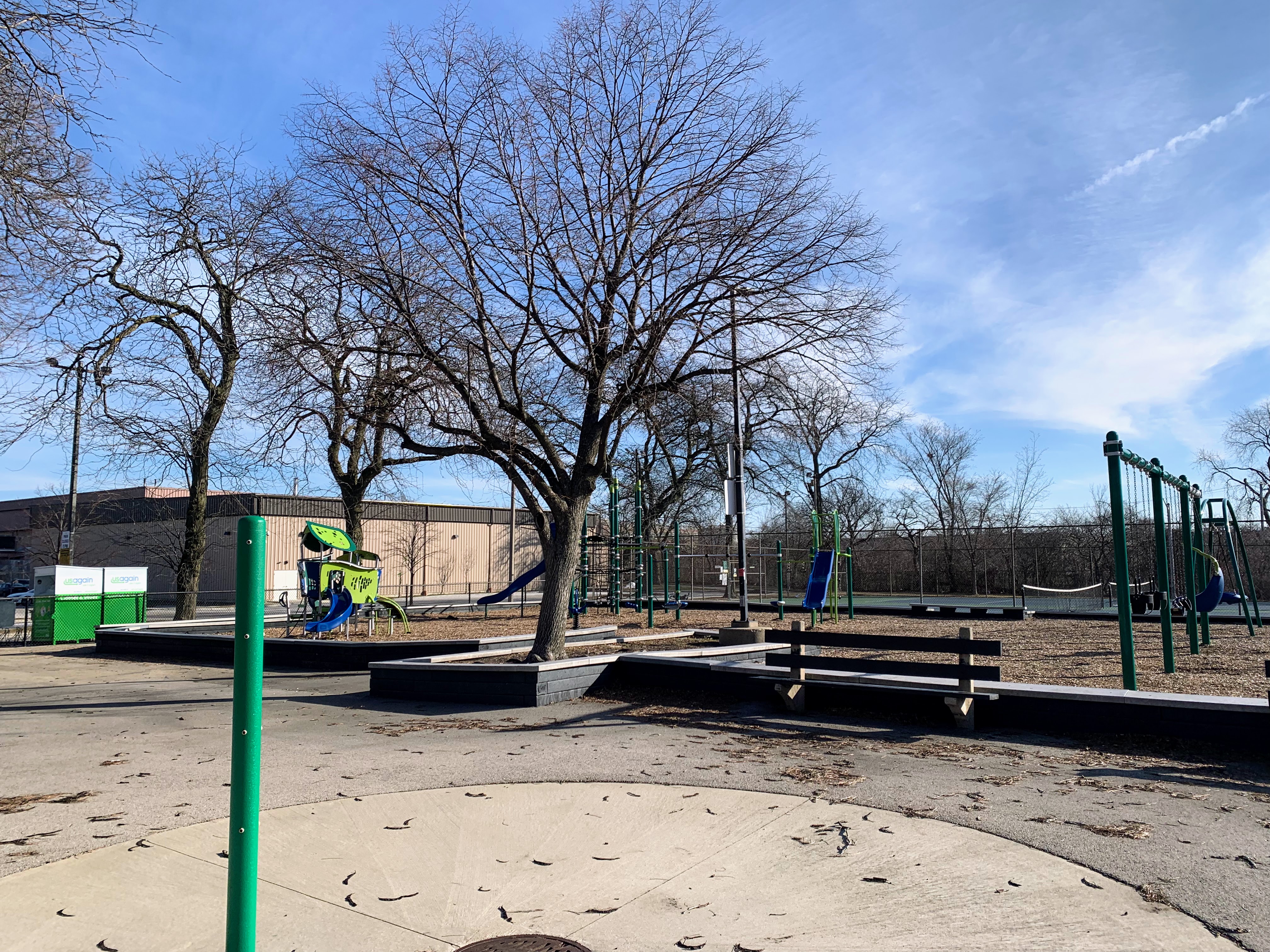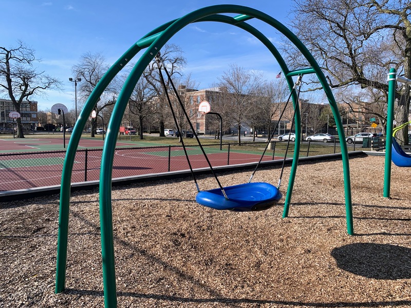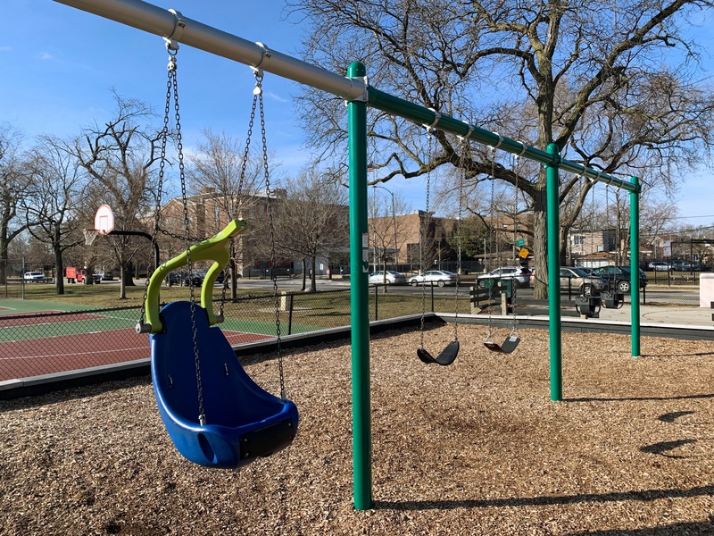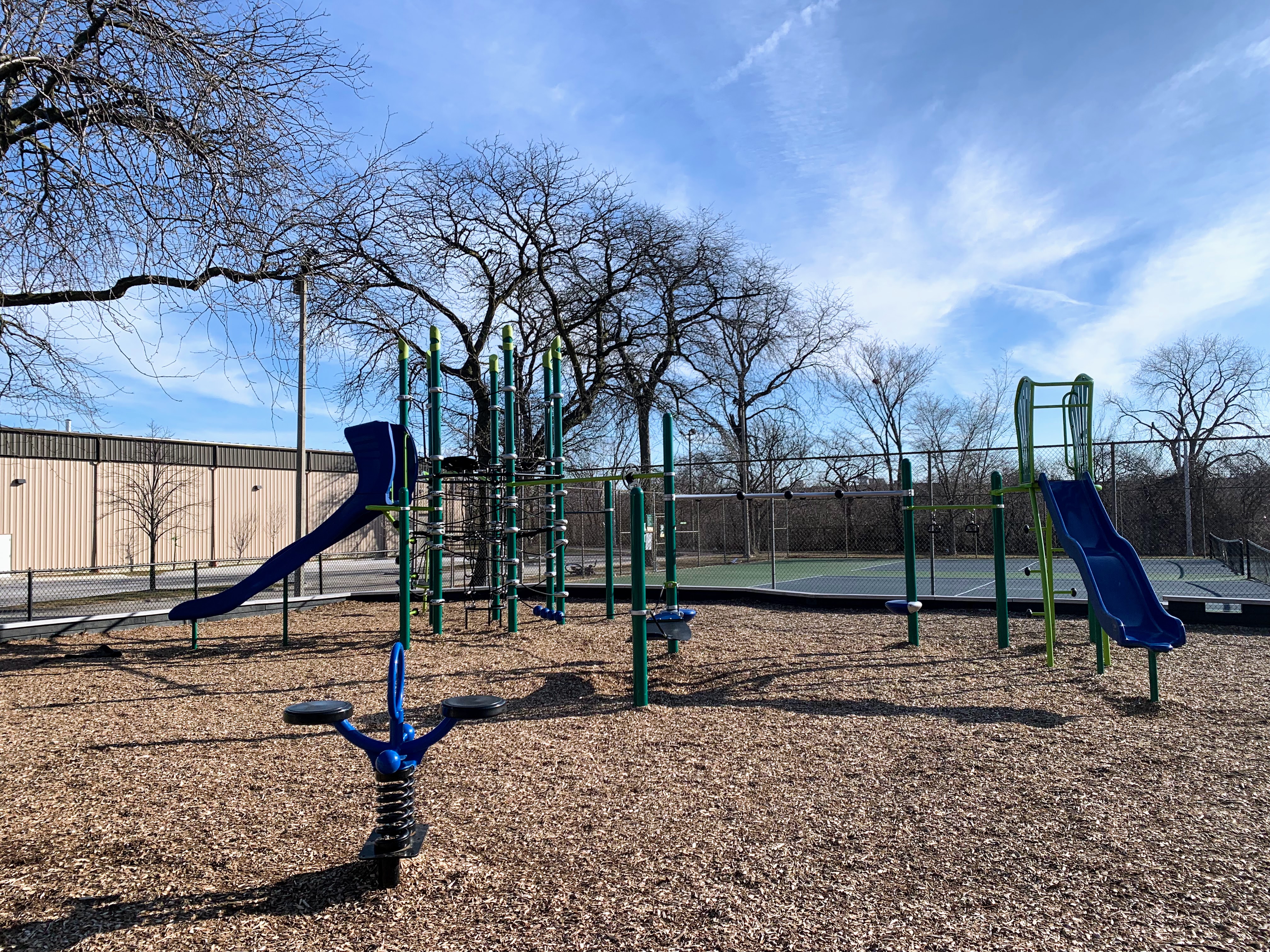 The play area is fully enclosed and has a wood chip play surface. There are a few benches and the nearby fieldhouse provides access to bathrooms (when open). All in all, this is a decent neighborhood park. - Playground Features