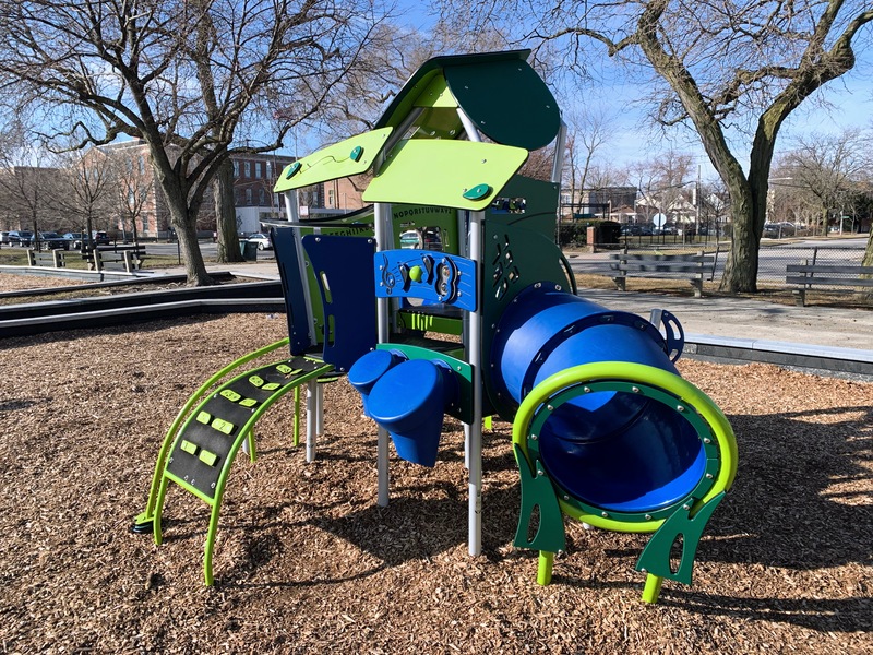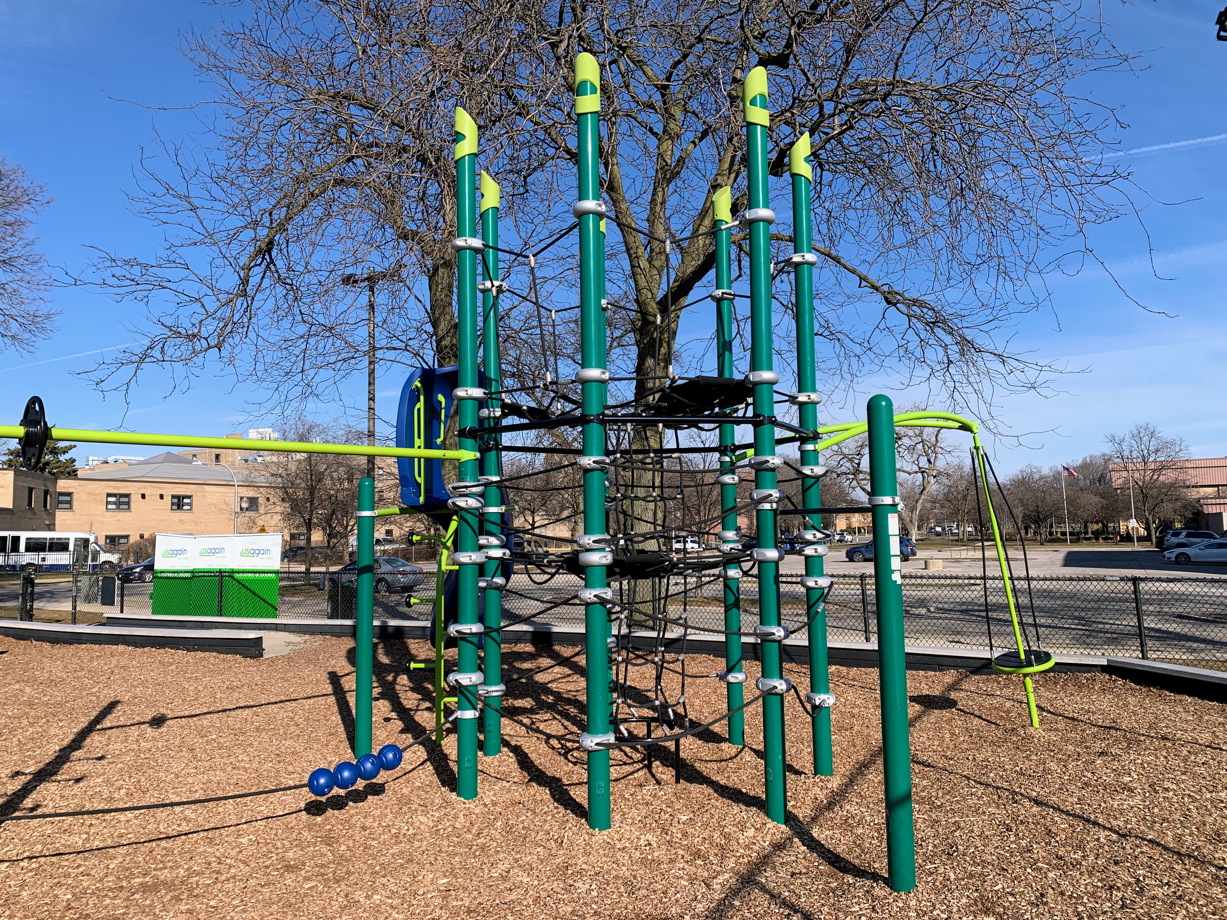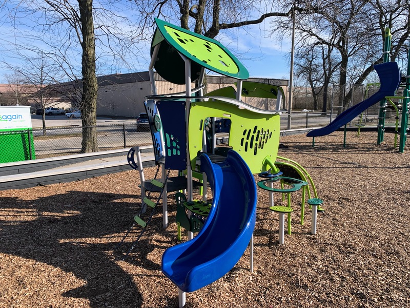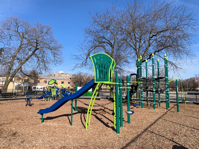 California Park is a great park located on the bank of the North Branch and accessible via the Riverview Pedestrian Bridge. The playground is located near the southern edge of the park. It features a somewhat non-traditional set of equipment that is more like a linear obstacle course than a traditional vertical play structure. The water spray feature is a single pole mister/sprayer.
