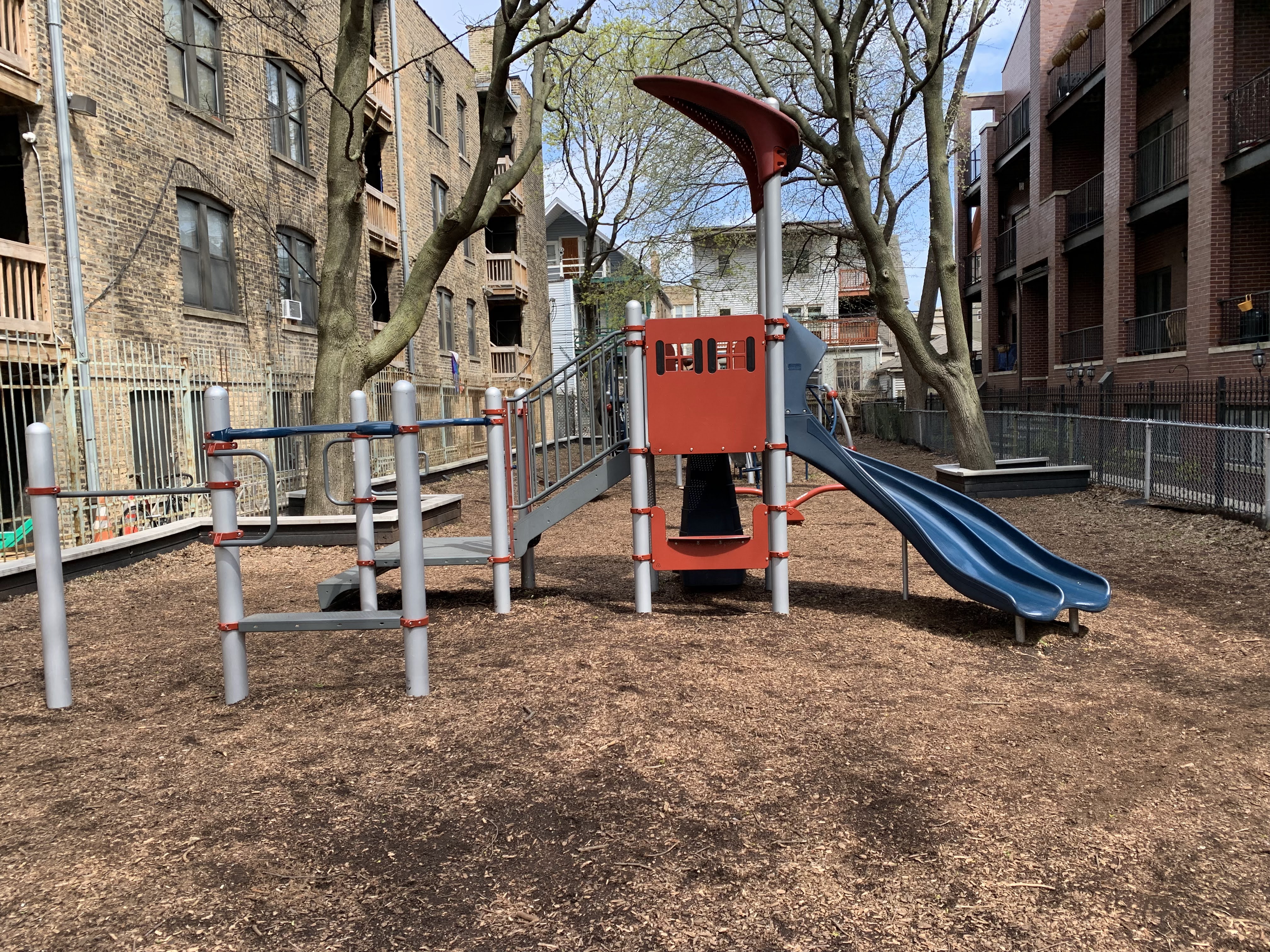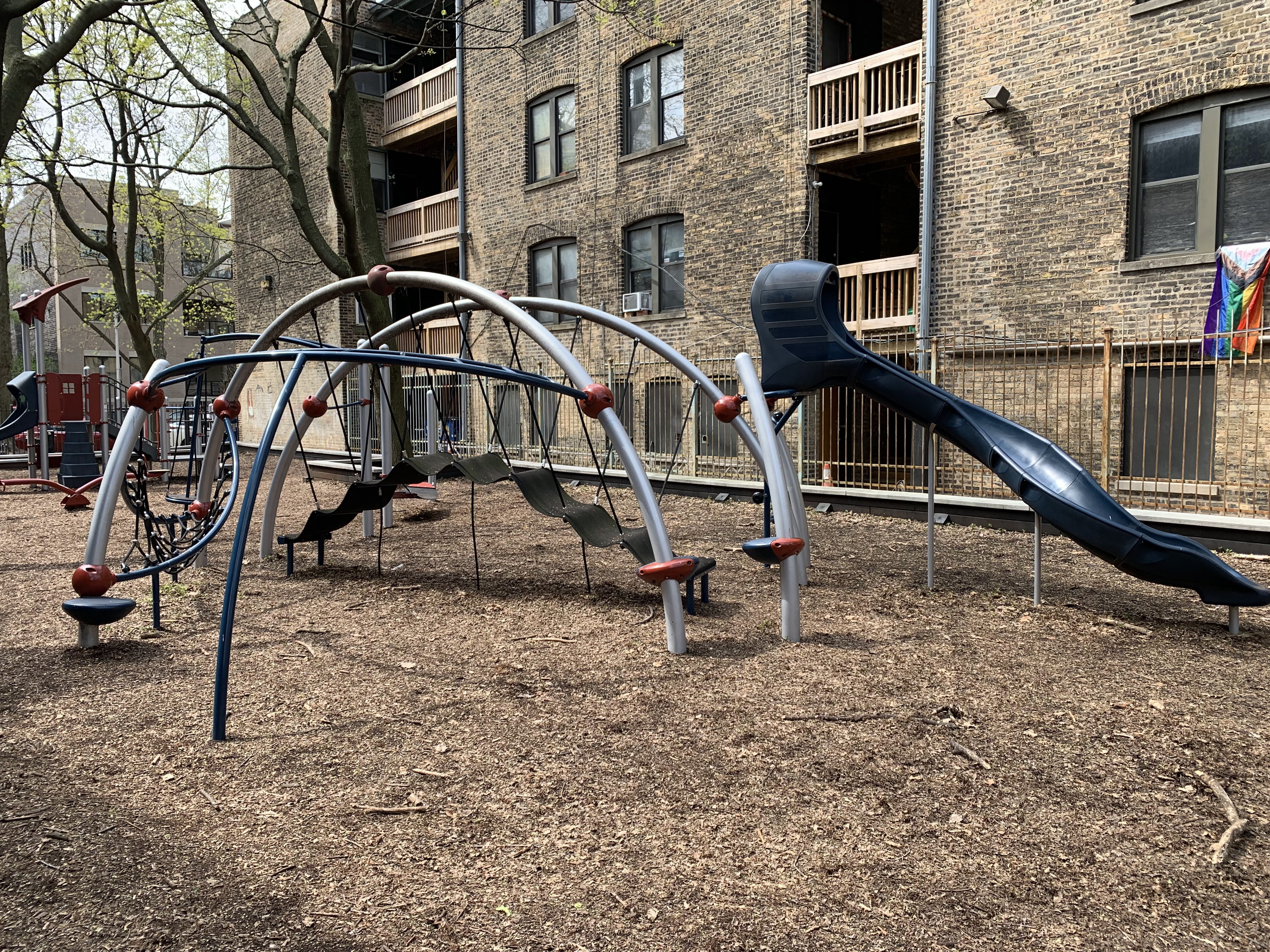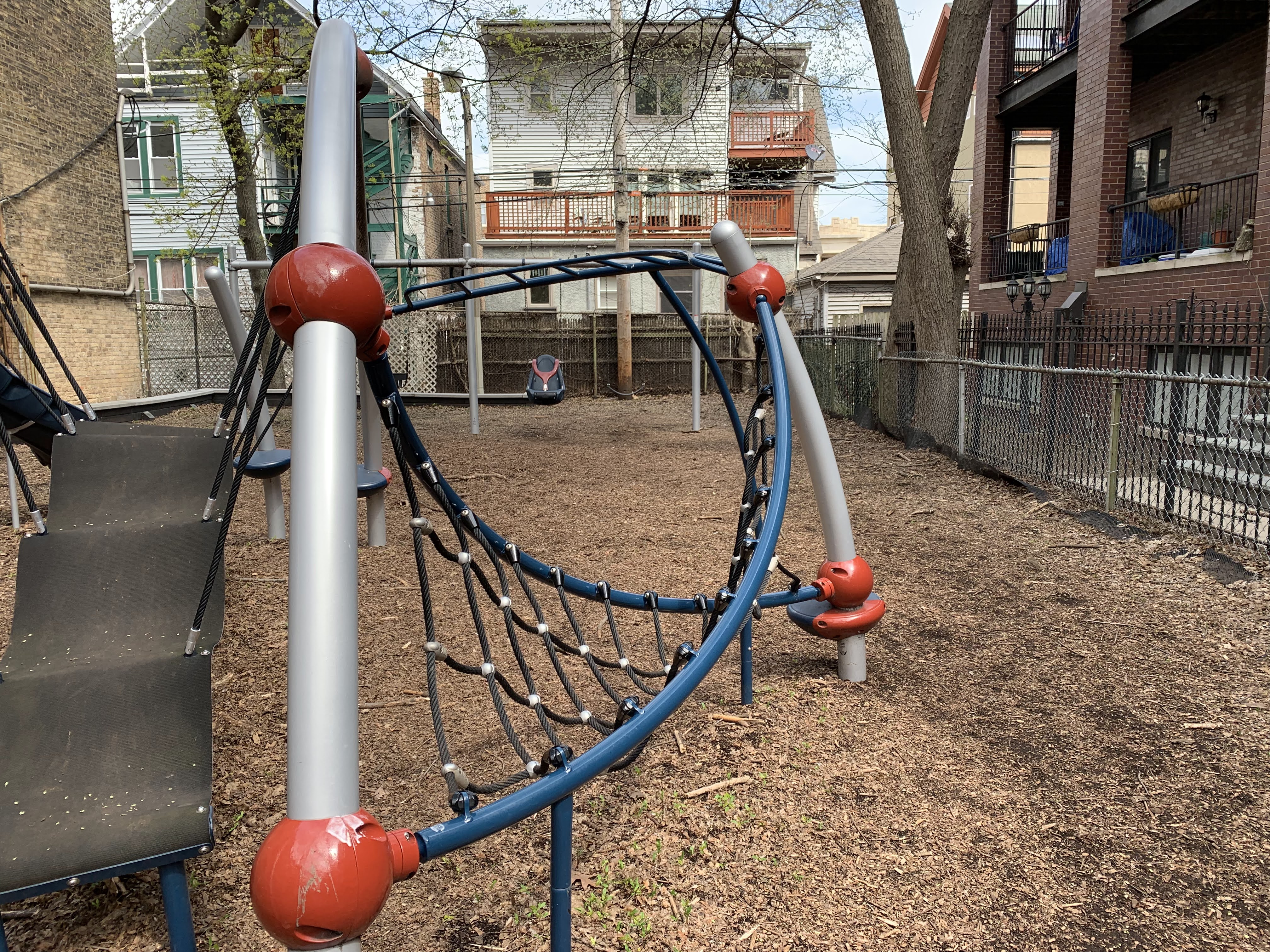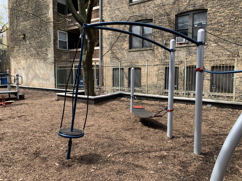 - Tiny Carmen Park is tucked between two large buildings and shaded by large trees making this a quiet and hidden spot in the Uptown neighborhood. The playground has some traditional elements - the standard varieties of swings, for example - but also features some unique and modern elements like a flexible black belt bridge and twisted net structure. The play area is fully enclosed and the surface is wood chips. There aren't benches or tables but the low perimeter walls provide some seating.
