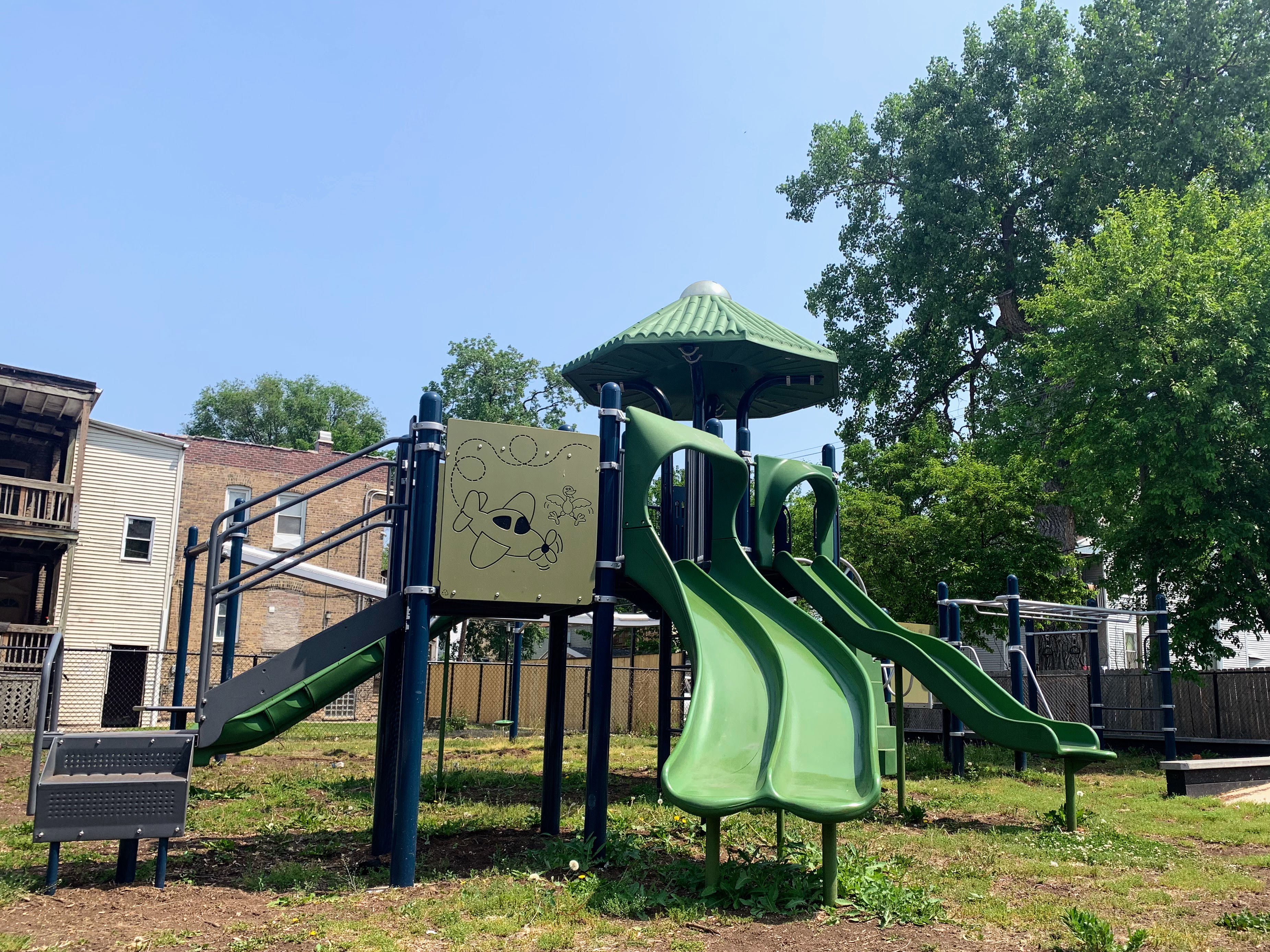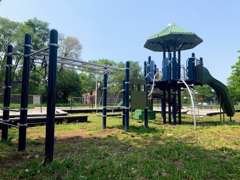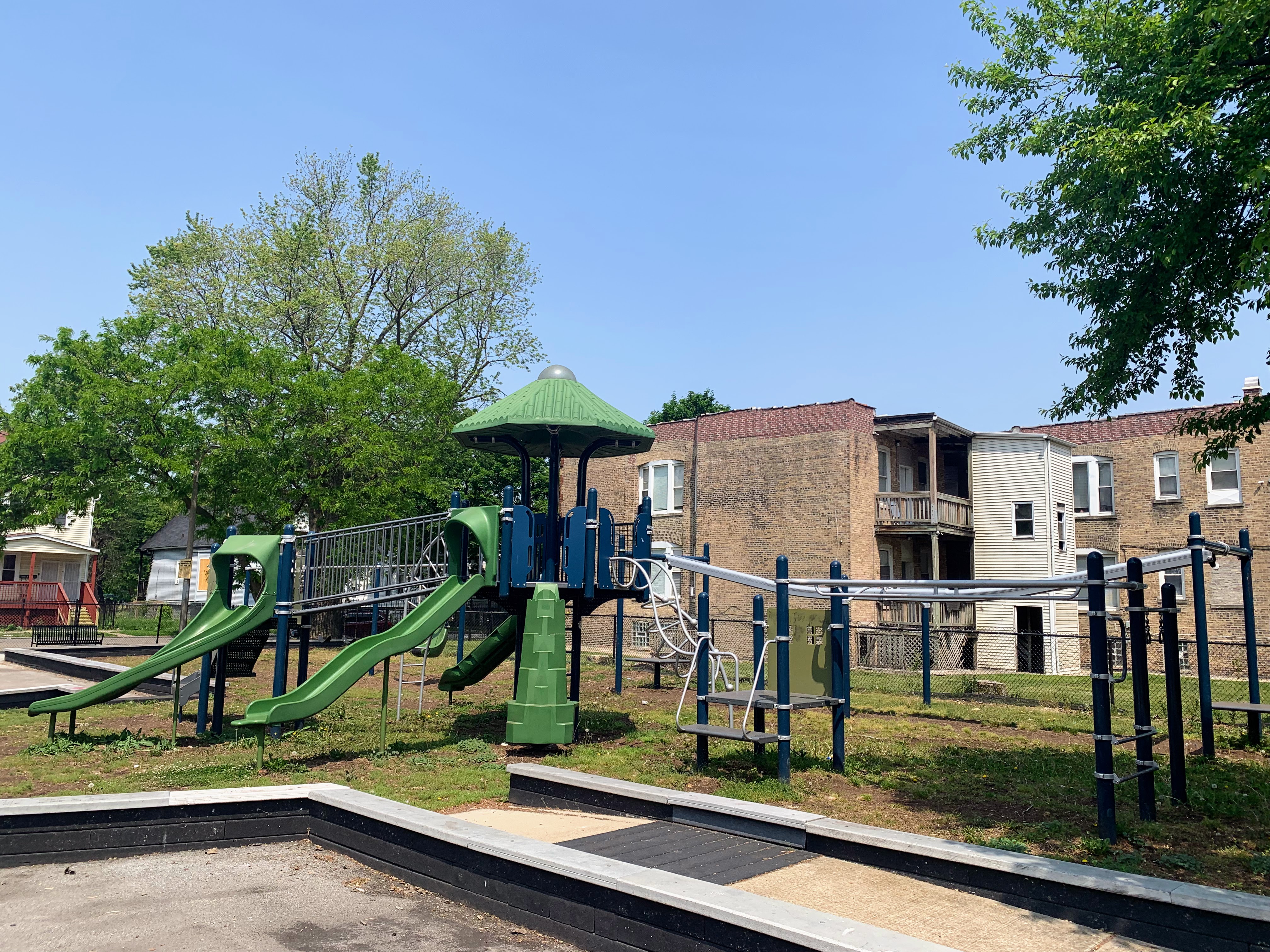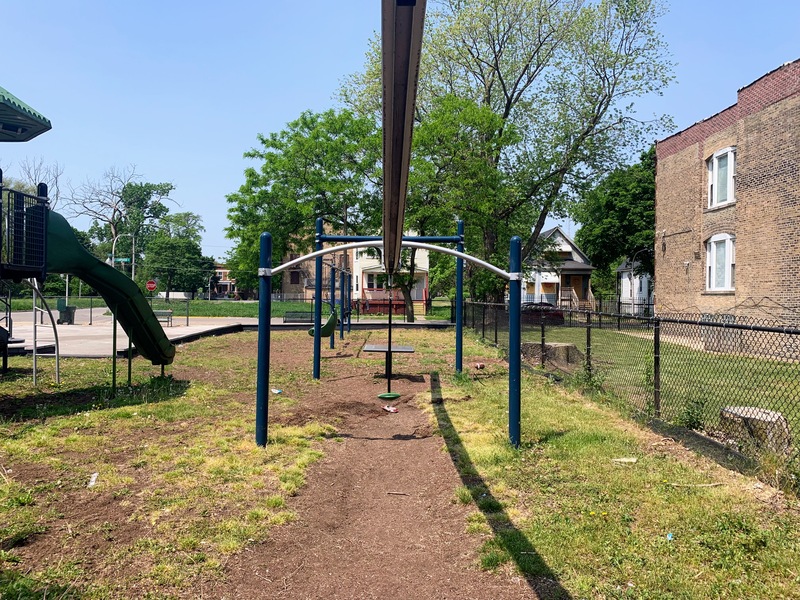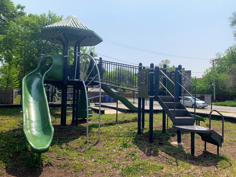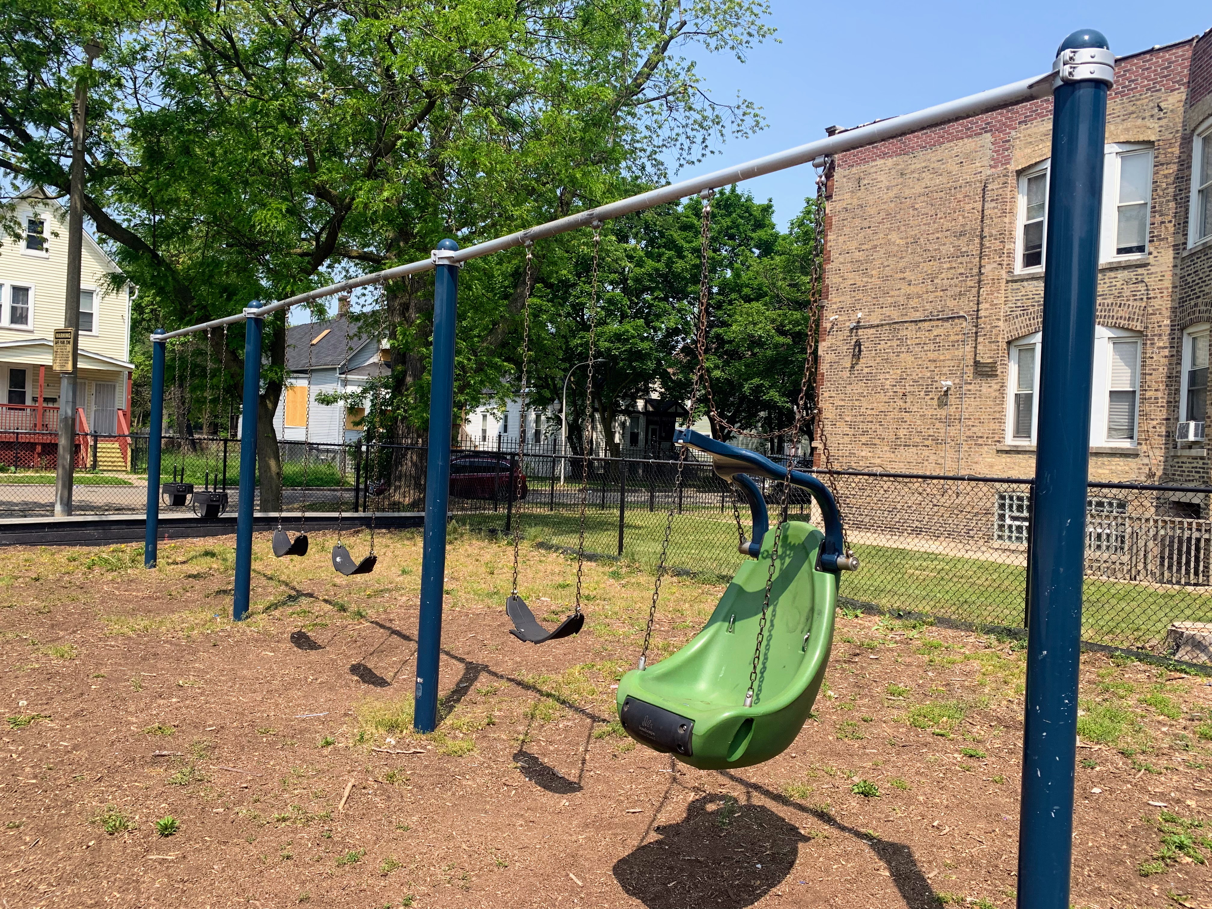 - The playground in Carpenter Park features a large play structure with a few slides and climbing features, the standard set of swings, and a zipline with circular seat. The play surface is wood chips and there are a few benches around the perimeter of the park.