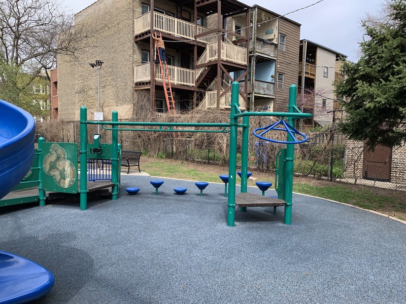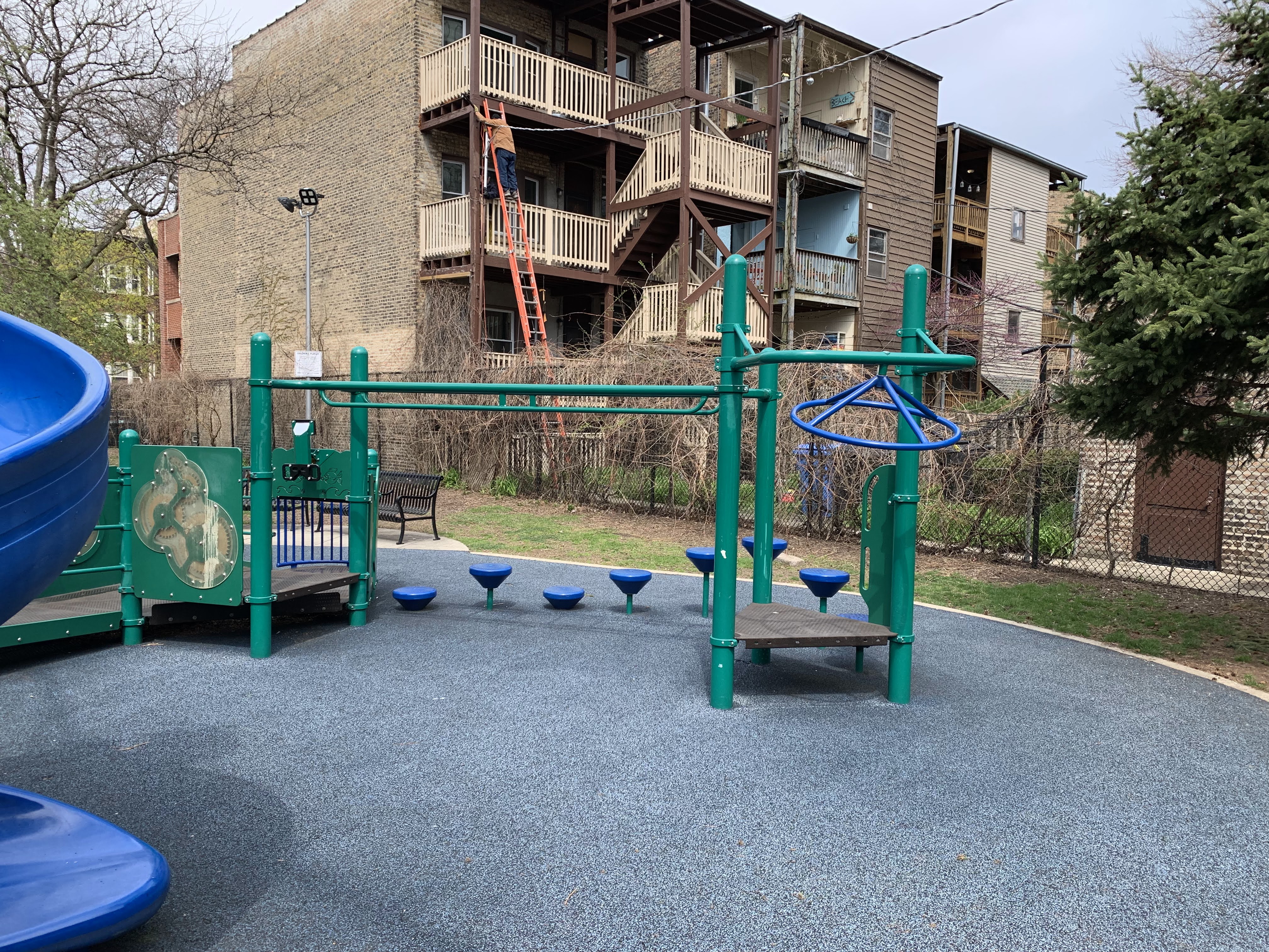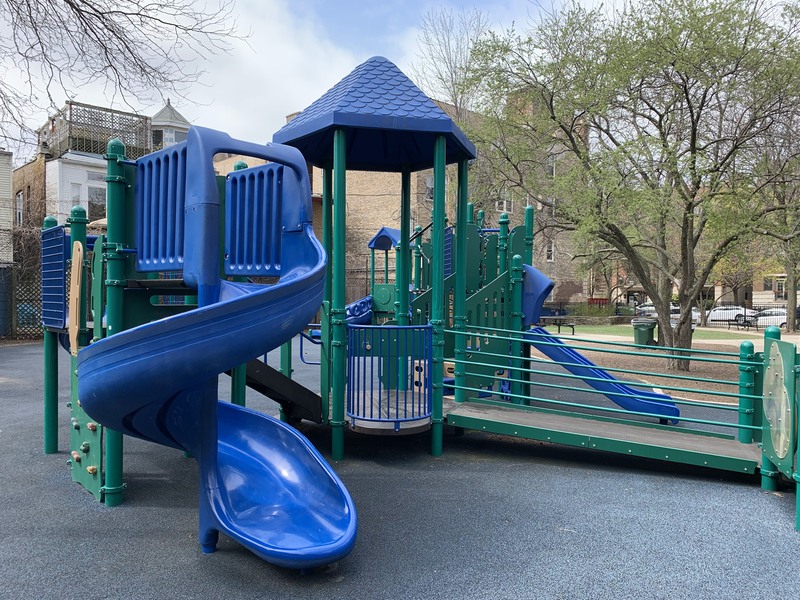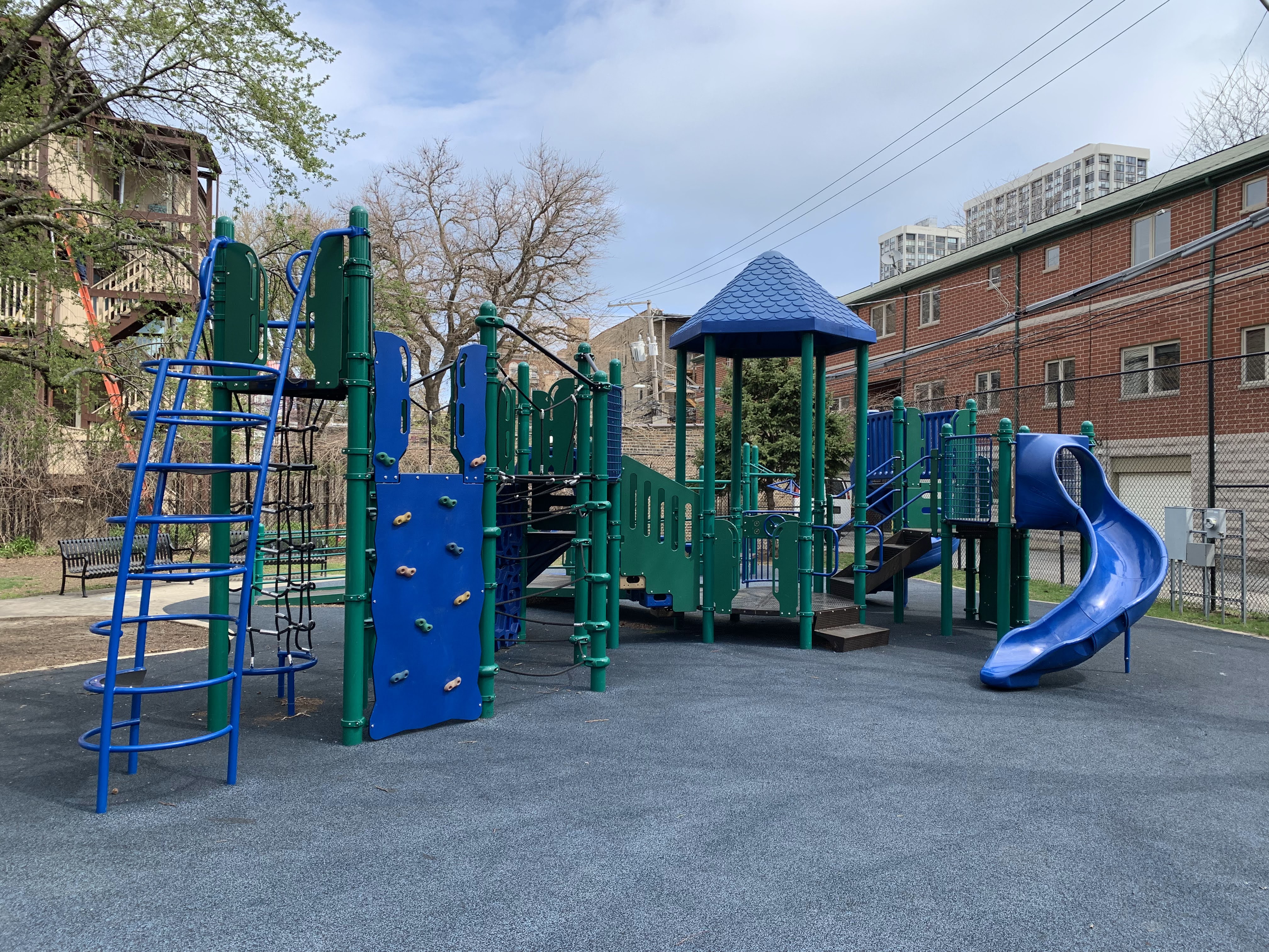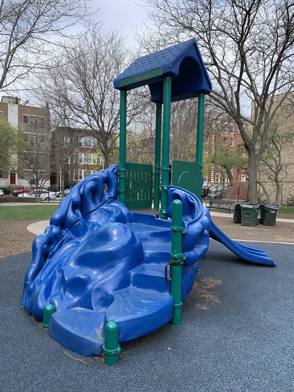 - This playground in small Cedar Park packs a big punch: a large play structure for older kids, a separate smaller structure for younger climbers, new water spray features, and a few benches and picnic tables. The large play structure is notable because it includes a few climbing elements that are relatively unique in Chicago Park playgrounds. Parts of the large play structure can also be accessed via a ramp from the soft rubber play surface making this playground somewhat accessible. The water features are in the same fully enclosed play area and are both relatively gentle spray elements. The playlot is shaded by large trees and there are several benches and a picnic table for seating. This is a great smaller playground because it offers great equipment, water features, seating, and shade; highly recommend.