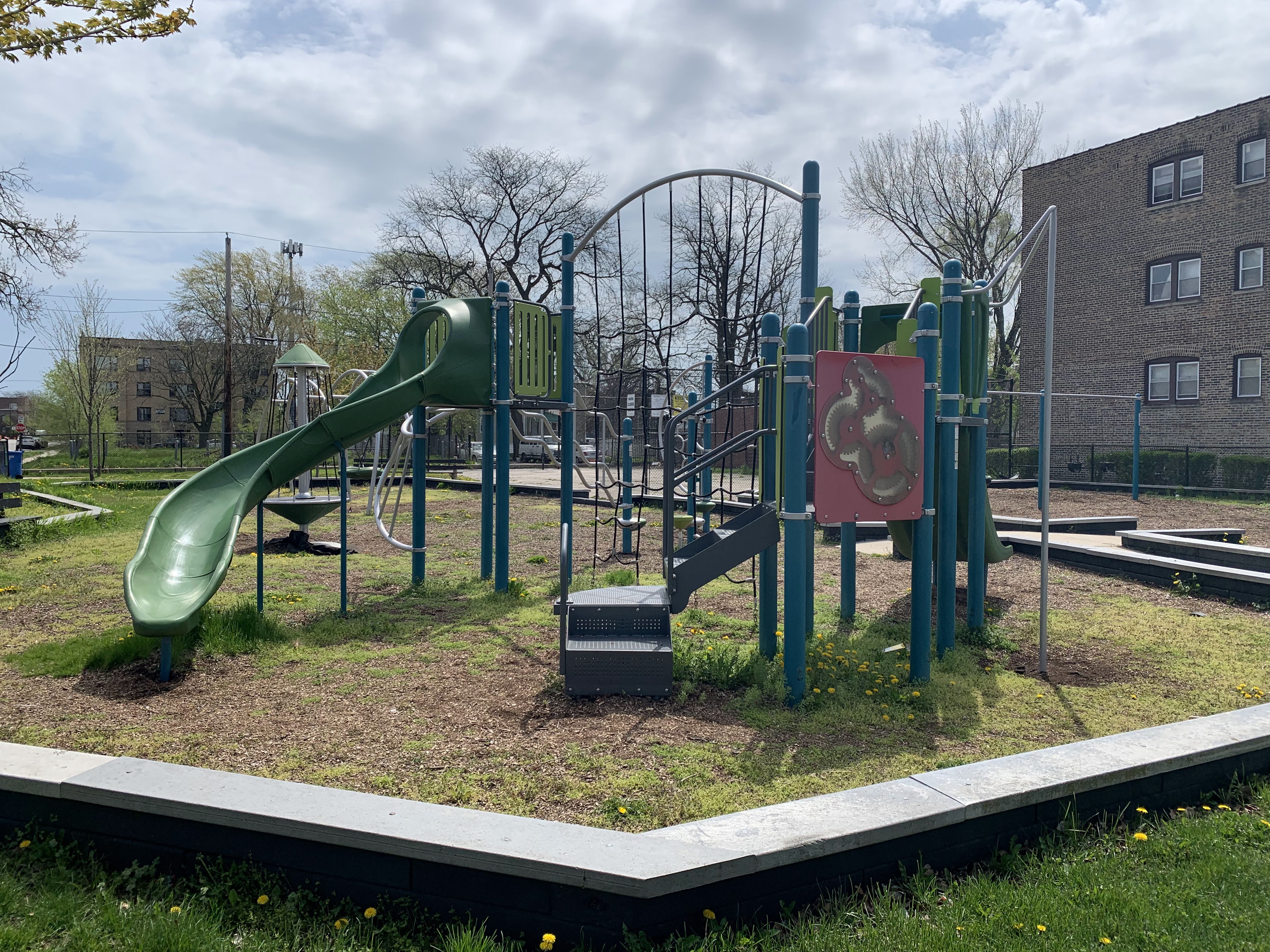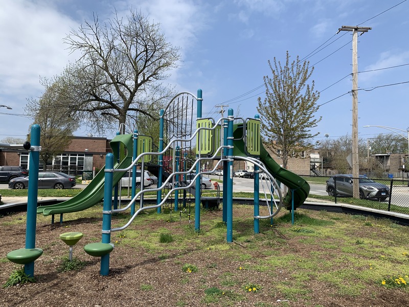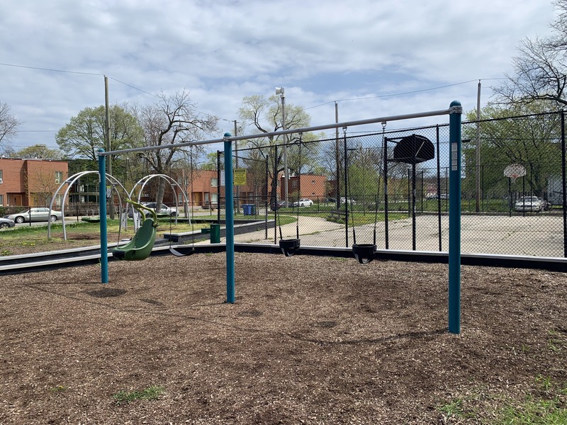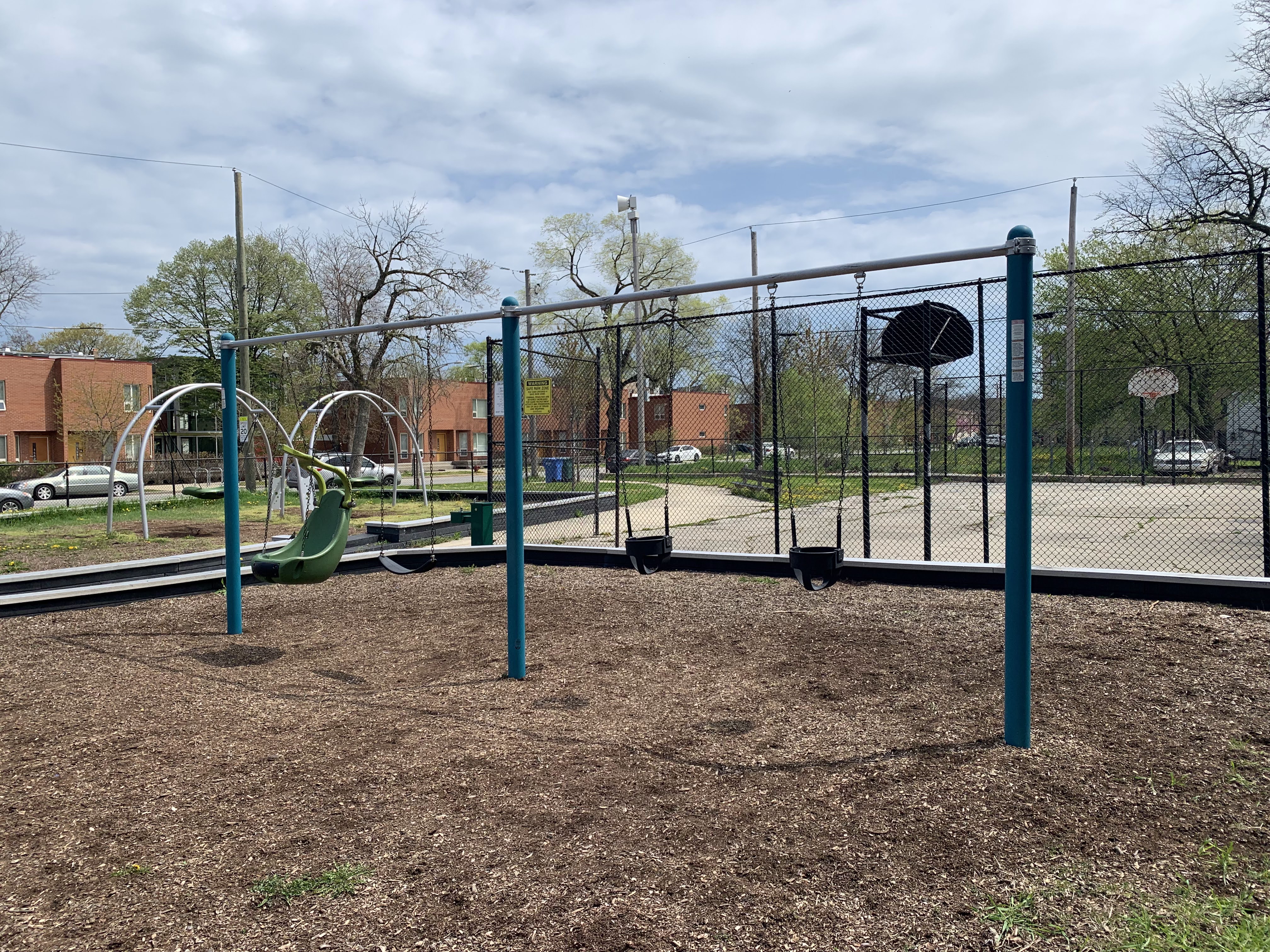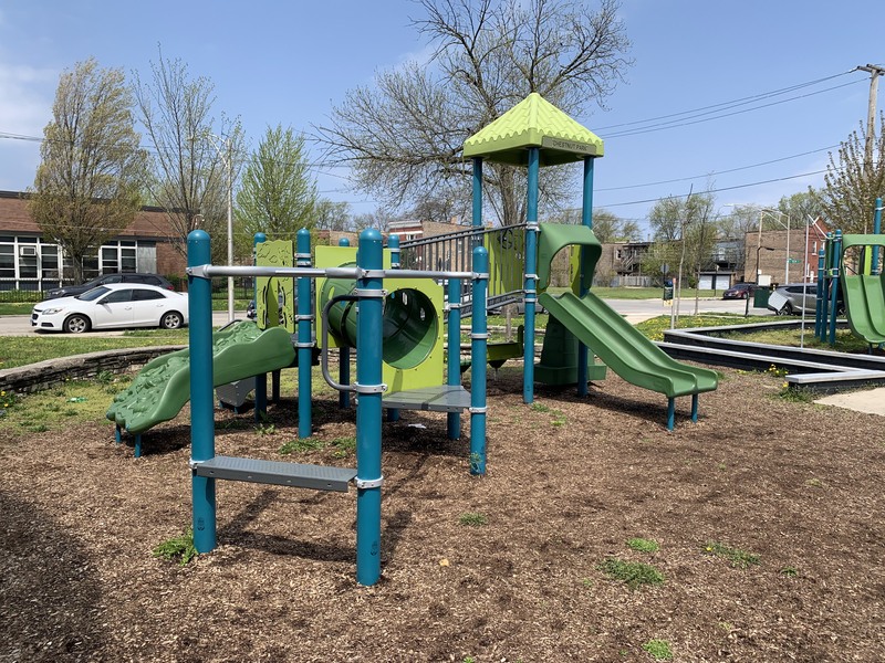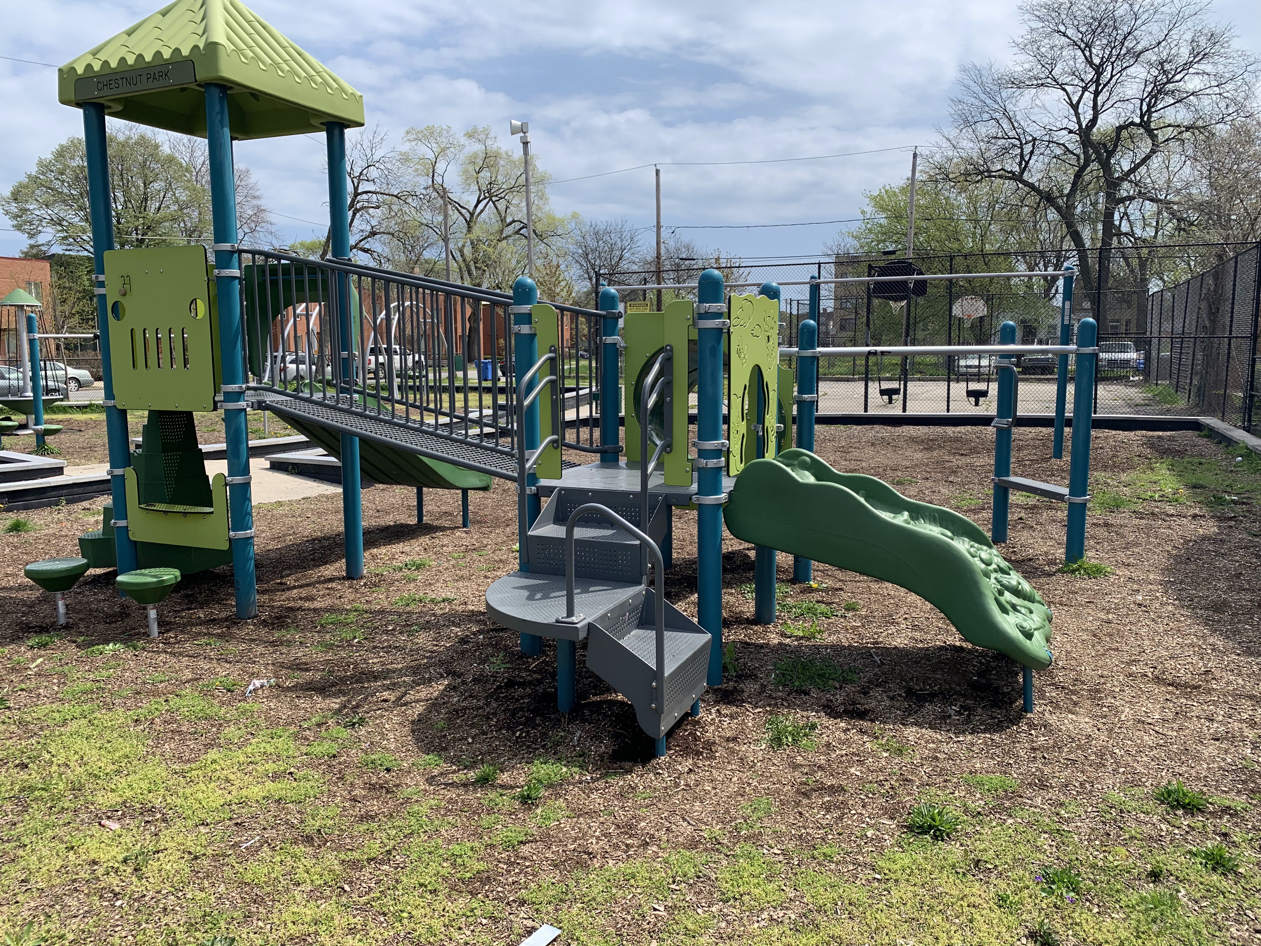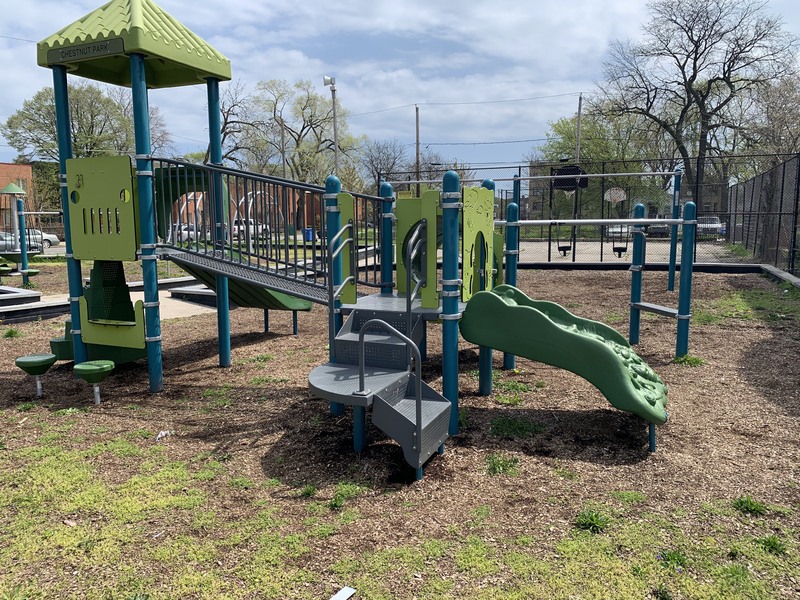 - Small Chestnut Park is a neighborhood park with a neighborhood playground featuring two play structures and few other elements. The smaller play structure is designed for younger children and has a few small slides, low to the ground monkey bars, and other climbing elements. The other structure is much larger and includes more challenging climbing and overhead elements as well as larger slides. This park has a solid offering of swings (toddler, molded bucket, belt seat, and hammock style saucer swings). The play area has a surface of wood chips and is bright and sunny throughout the day. There are a few benches near the play area and a drinking fountain.