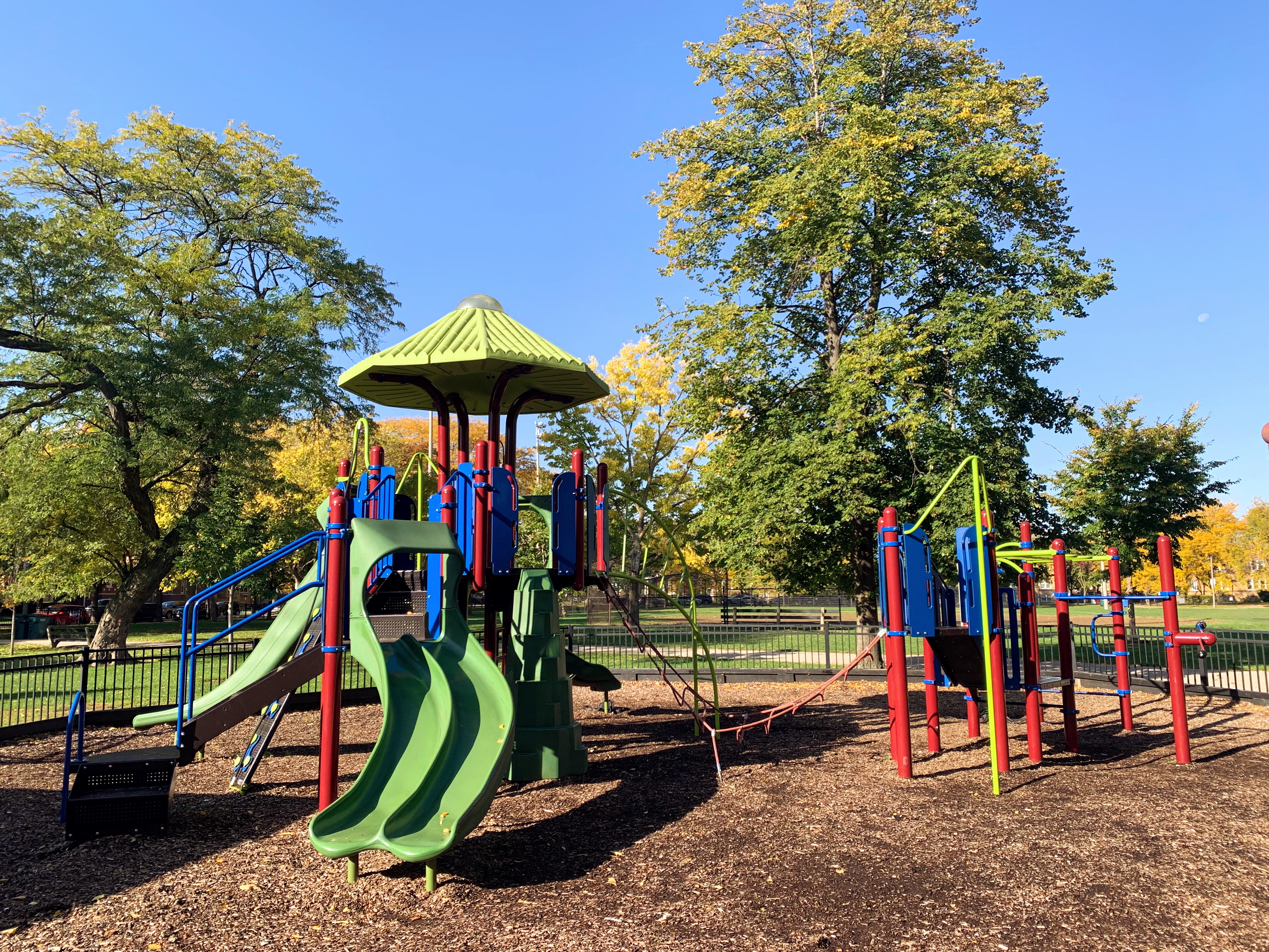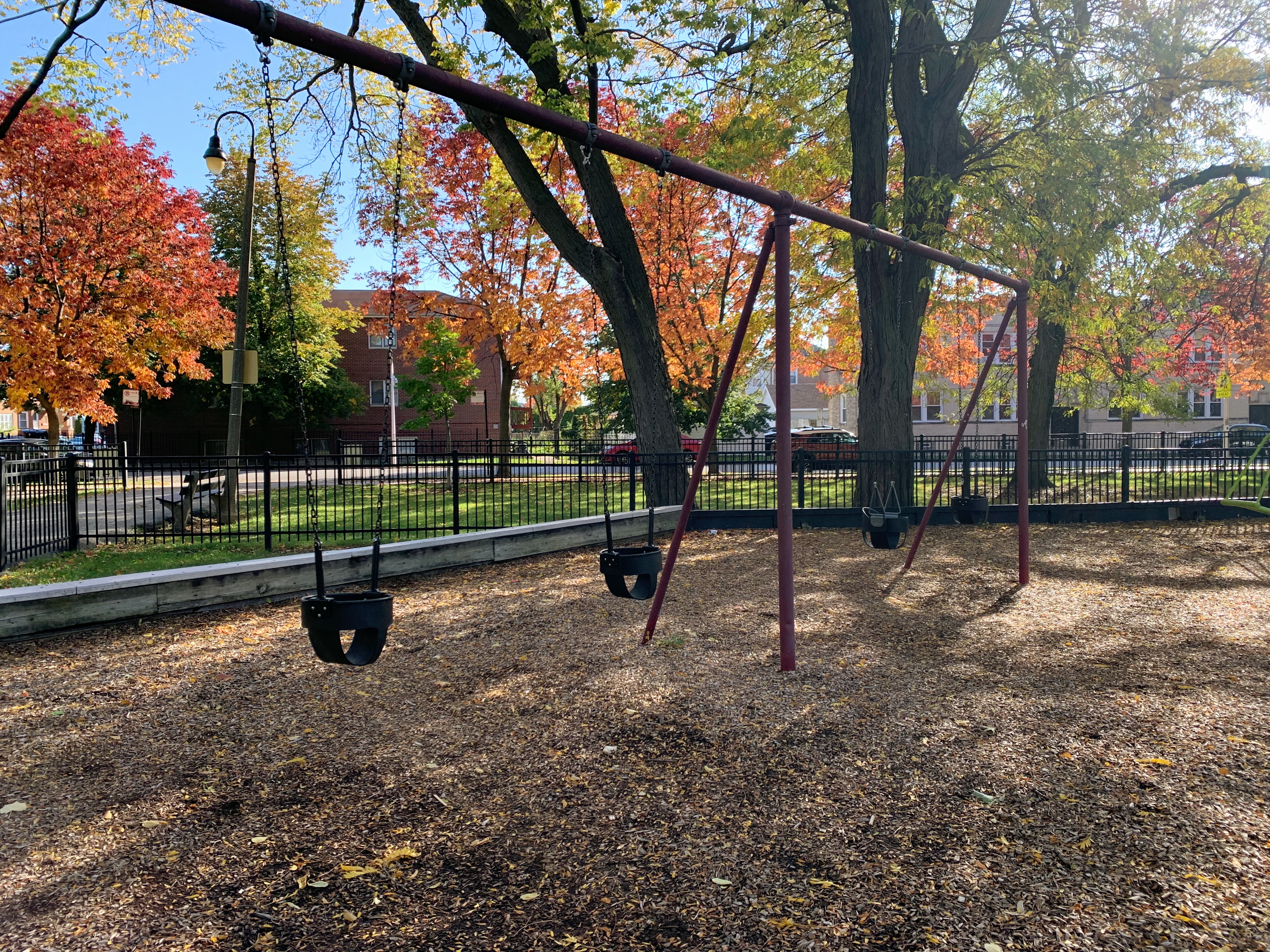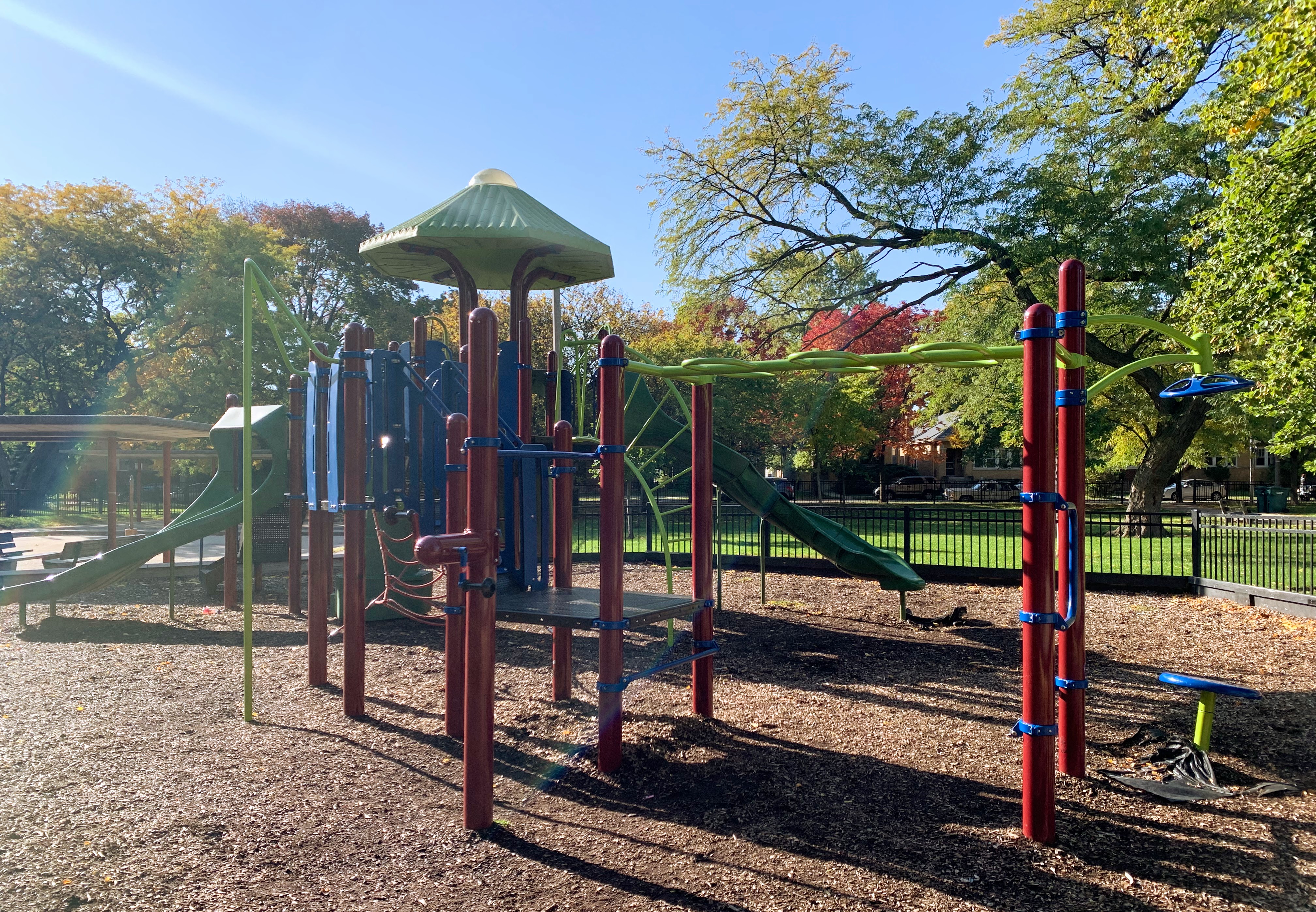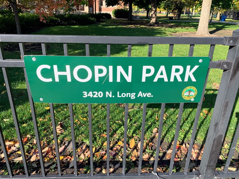 - The playground at Chopin Park is a great little playground. There are three areas at this site: one area with toddler swings and some small standalone elements, another area with belt seat swings and a large play structure, and finally a water spray area. The large play structure features a number of slides and climbing elements. The water spray feature seems somewhat dated - a single water sprayer surrounded by concrete - but the shade pavilions and benches offer some nice amenities. The main play surface is wood chips and there is a drinking fountain as well as access to the fieldhouse building. All in all, this is a great neighborhood playground and a worthwhile destination; highly recommend.