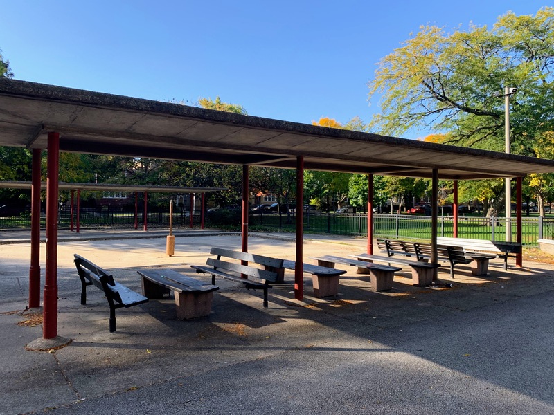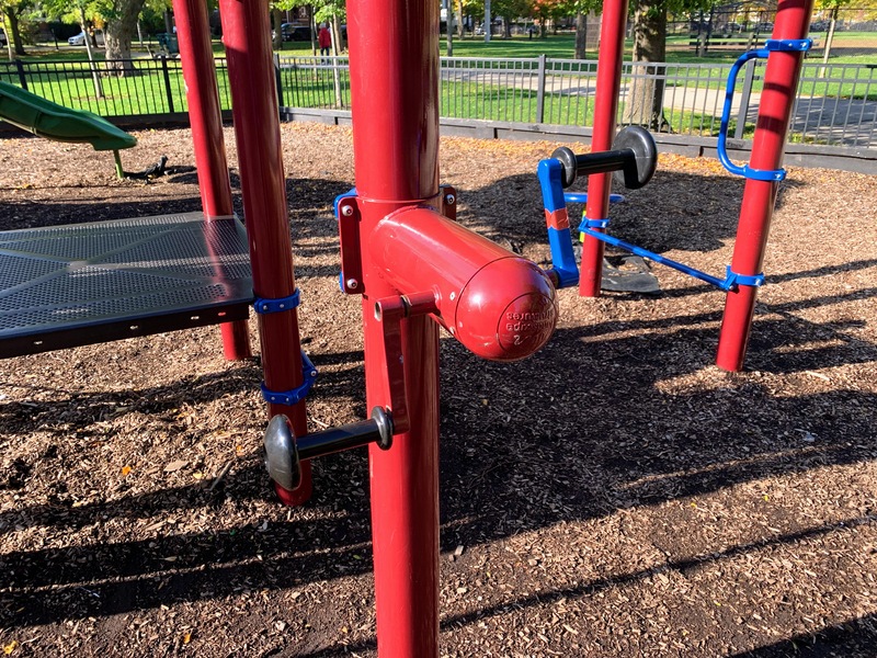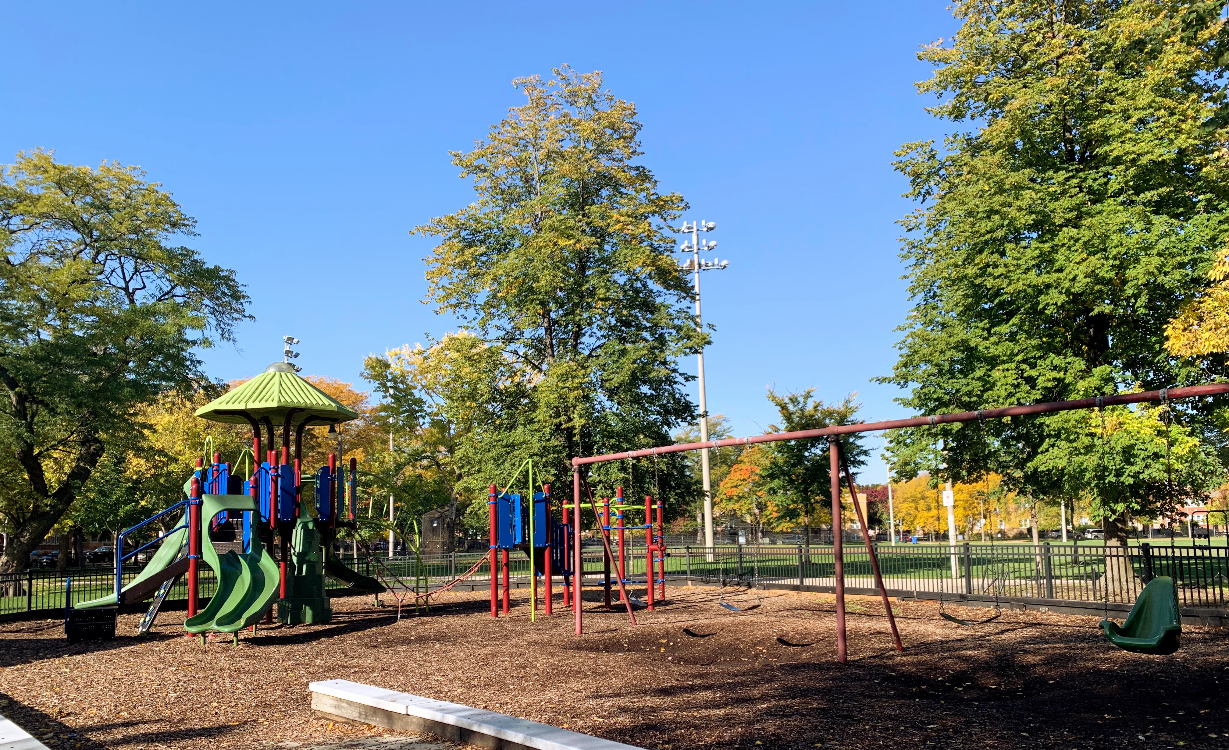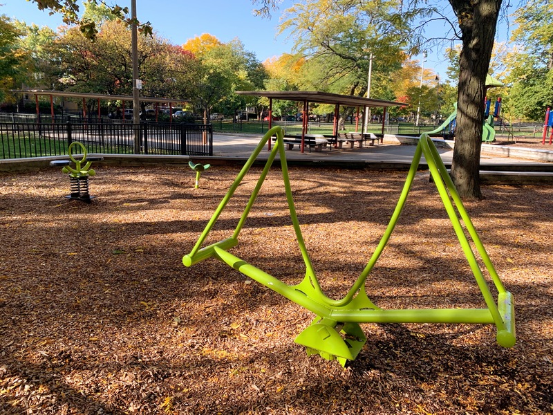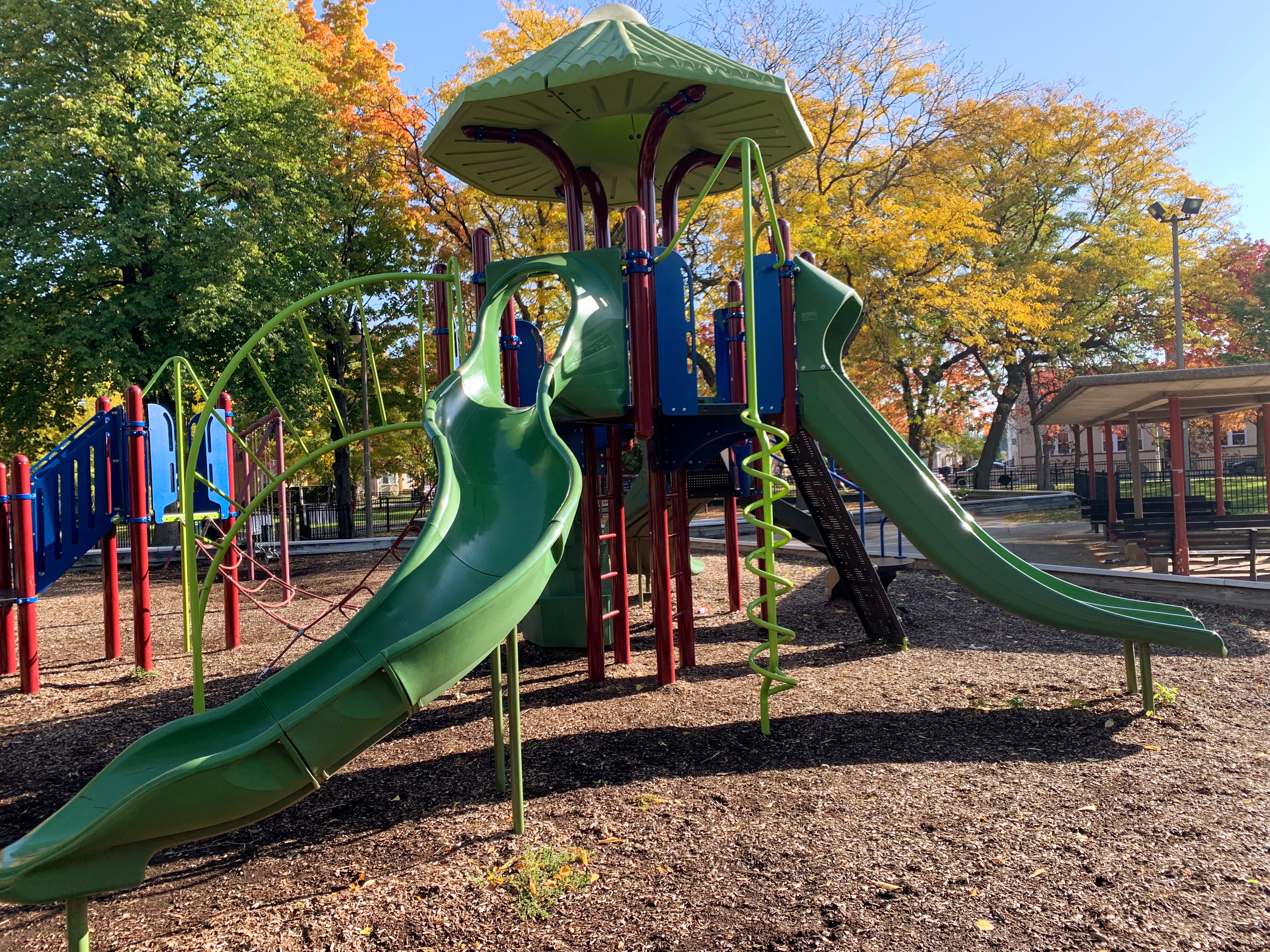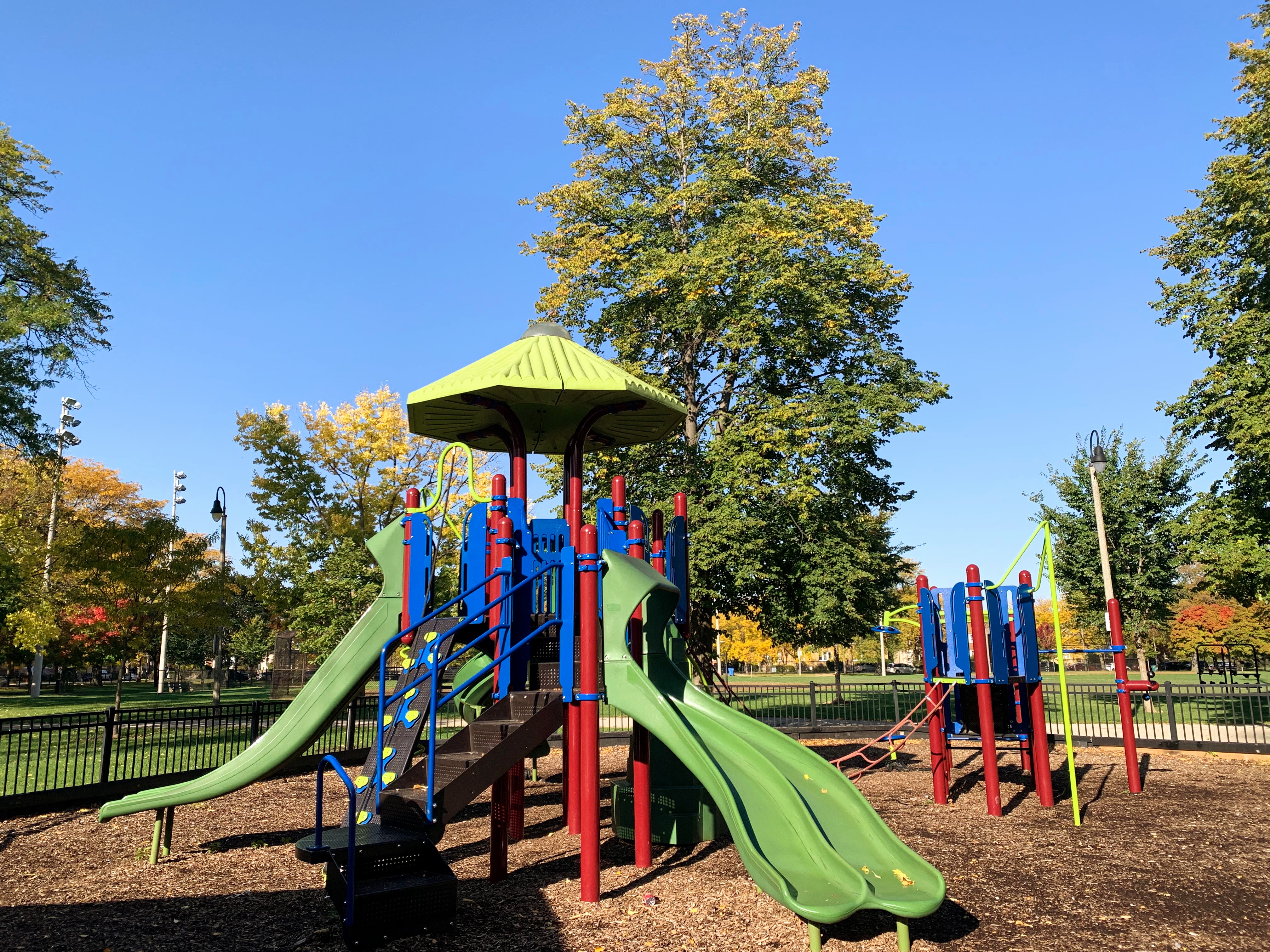 - The playground at Chopin Park is a great little playground. There are three areas at this site: one area with toddler swings and some small standalone elements, another area with belt seat swings and a large play structure, and finally a water spray area. The large play structure features a number of slides and climbing elements. The water spray feature seems somewhat dated - a single water sprayer surrounded by concrete - but the shade pavilions and benches offer some nice amenities. The main play surface is wood chips and there is a drinking fountain as well as access to the fieldhouse building. All in all, this is a great neighborhood playground and a worthwhile destination; highly recommend.