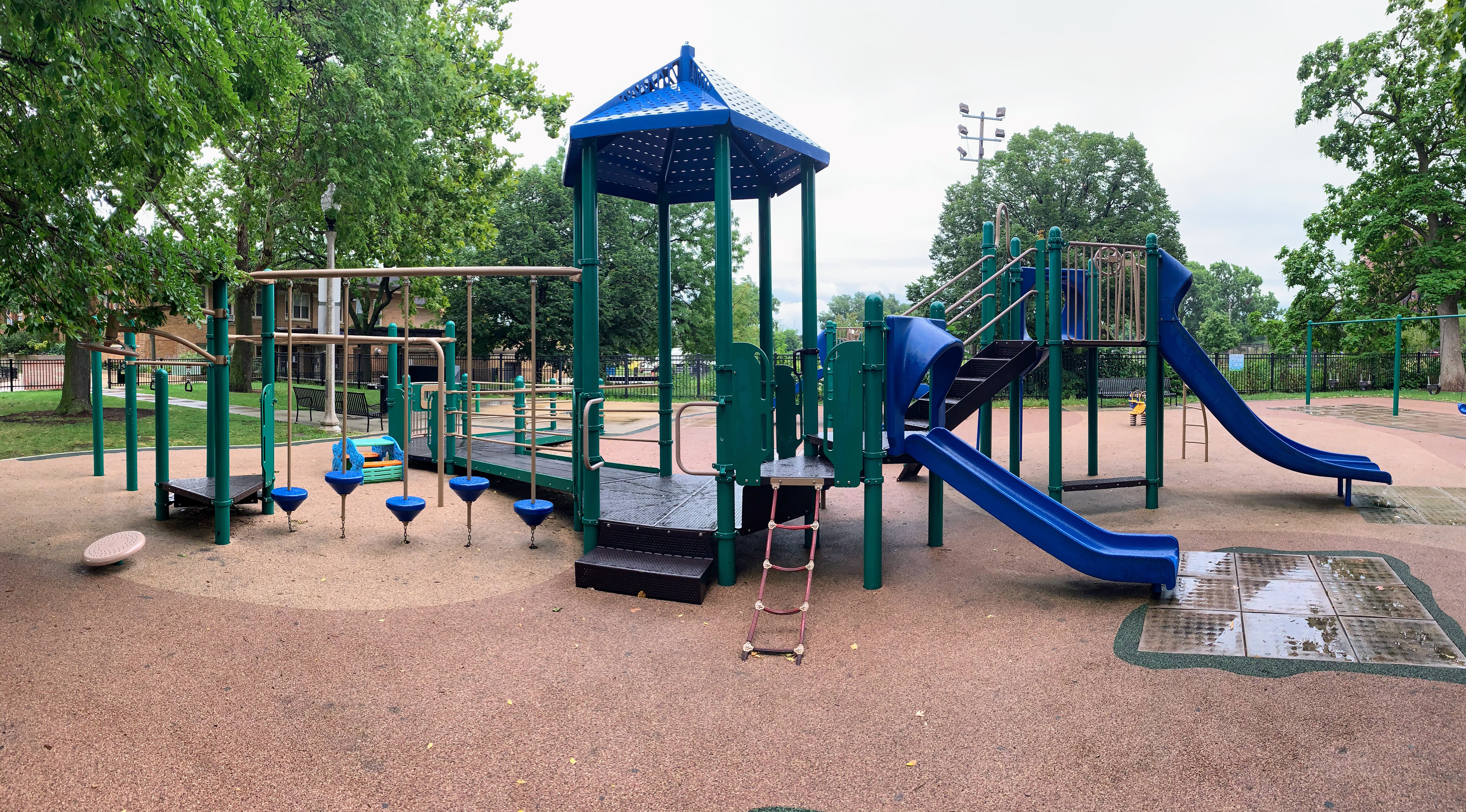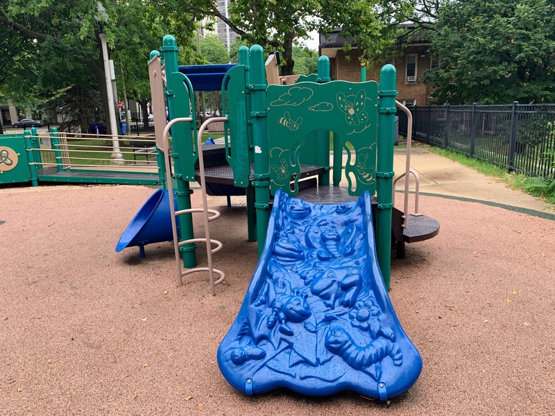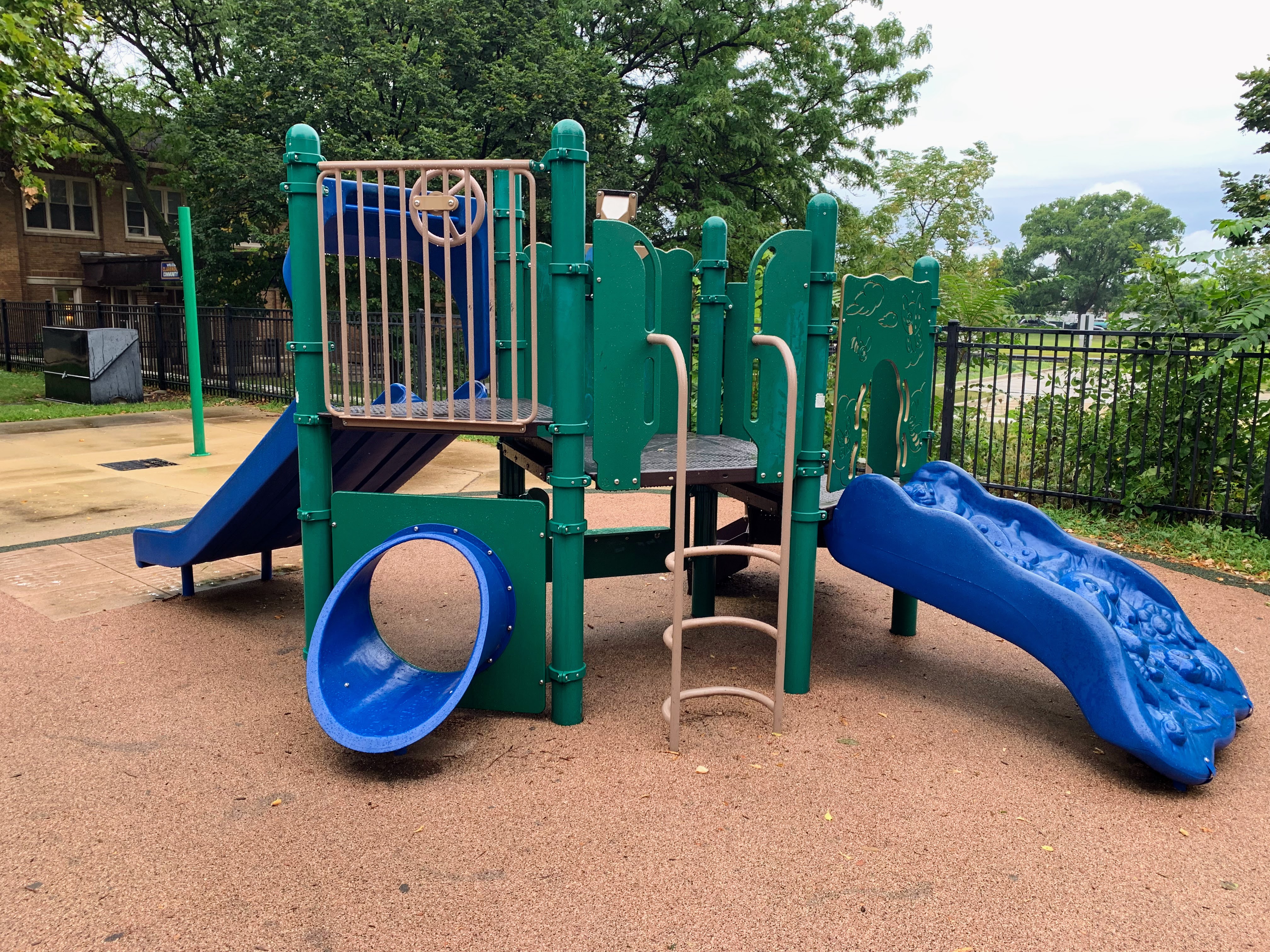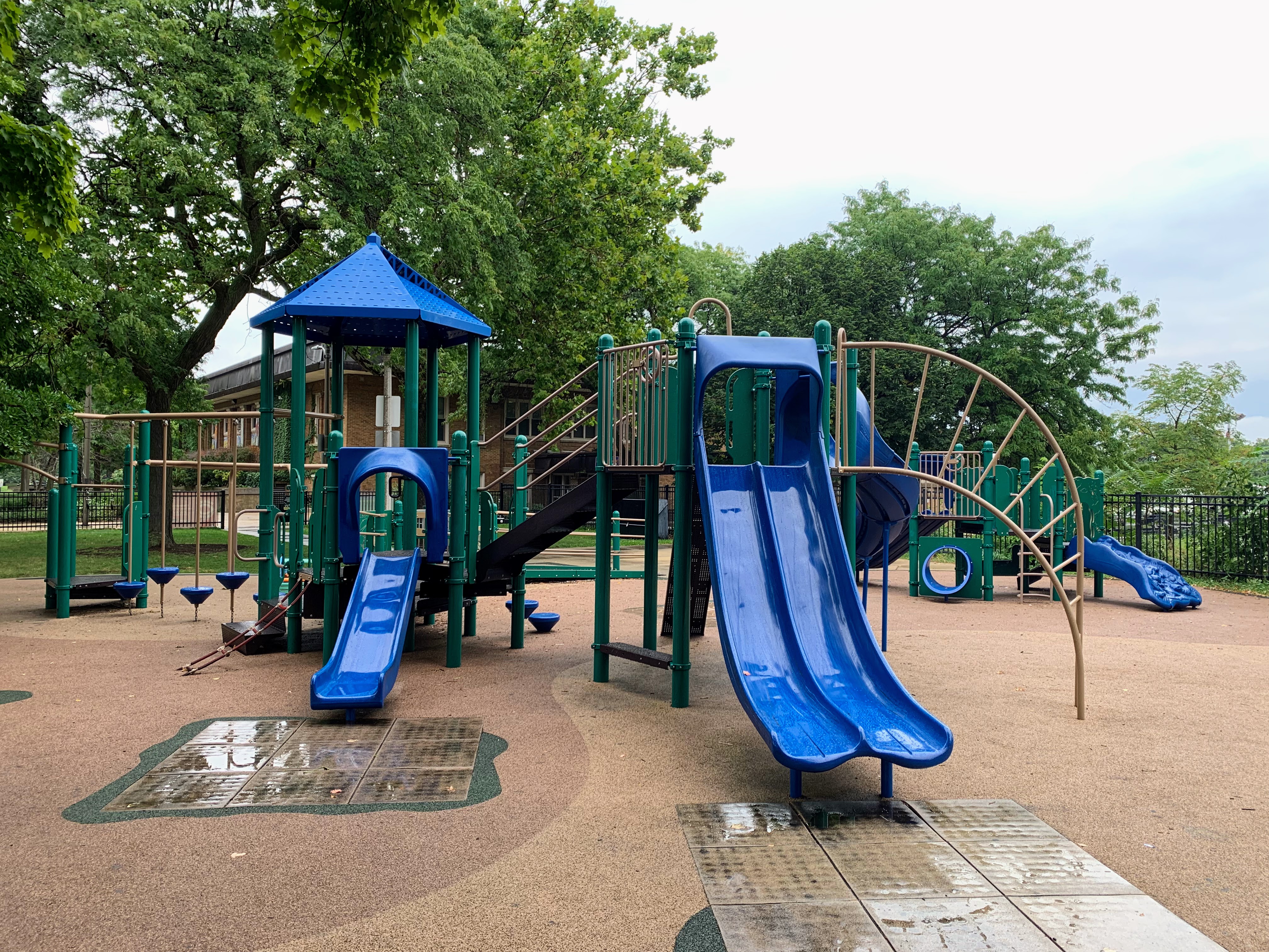 - Solid playground with two structures, a large set of swings, and a small water spray feature. The two play structures are both somewhat standard but offer a variety of slides and climbing elements. The swings are the standard Chicago Park varieties (toddler, adaptive, and belt seat) and the water spray feature is a single pole water sprayer. The playground is fully enclosed, somewhat shaded, and with a play surface of soft rubber. There are a few benches and a drinking fountain in the play area with the Clarendon Community Fieldhouse providing access to bathrooms (when open). All in all, this is a very solid neighborhood playground; highly recommend.