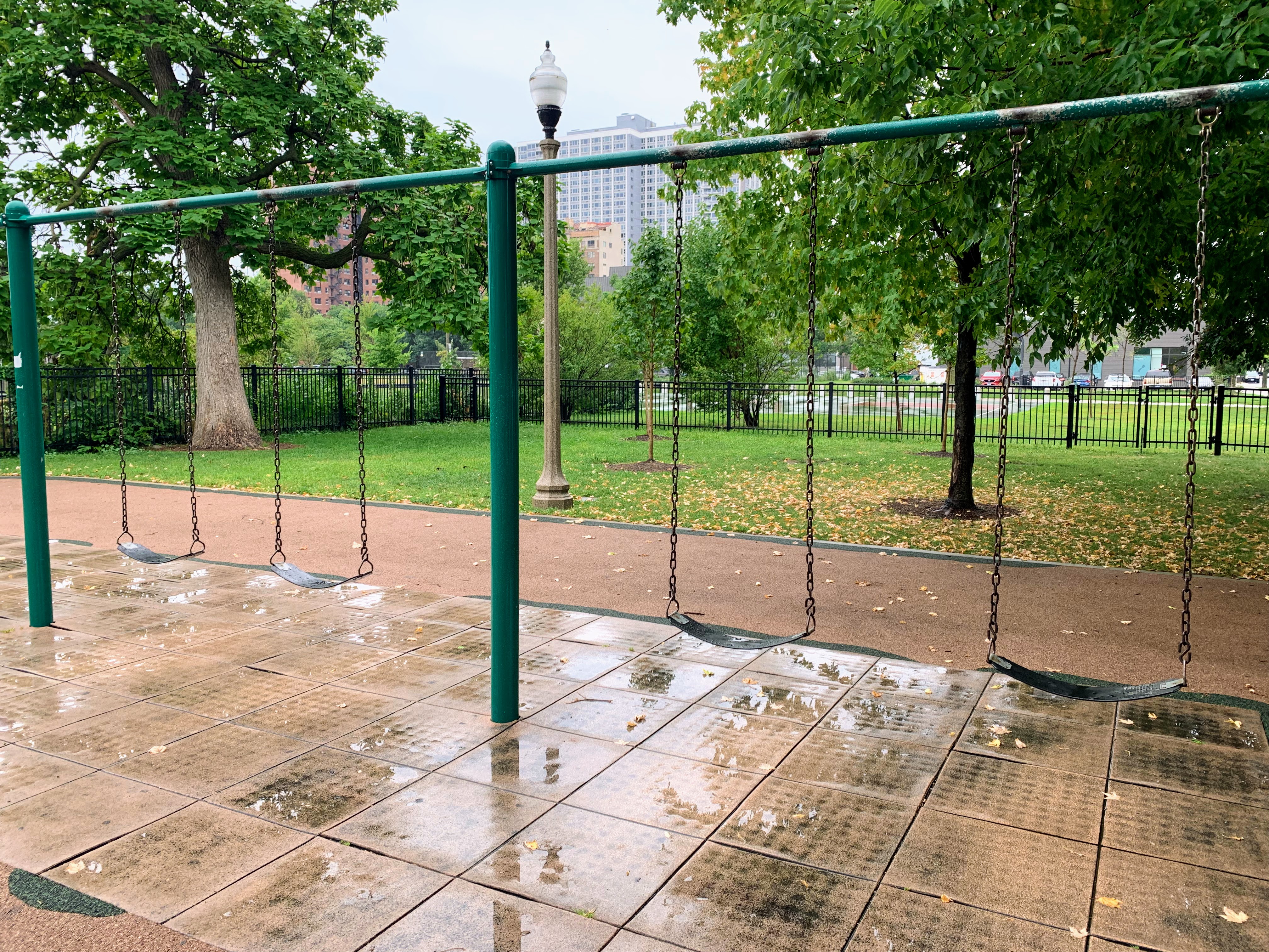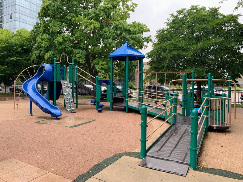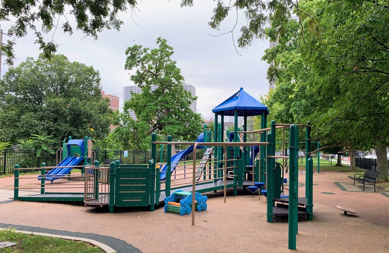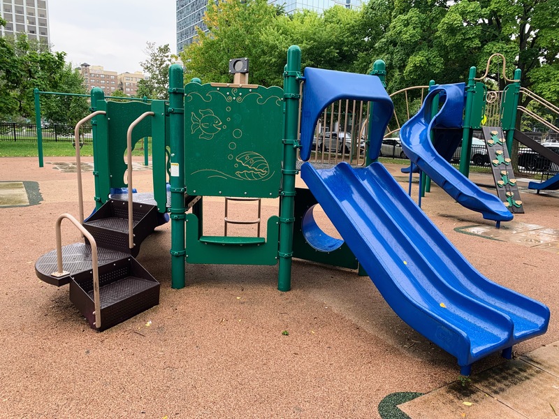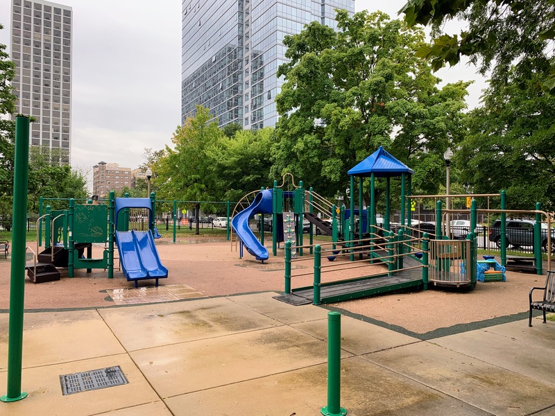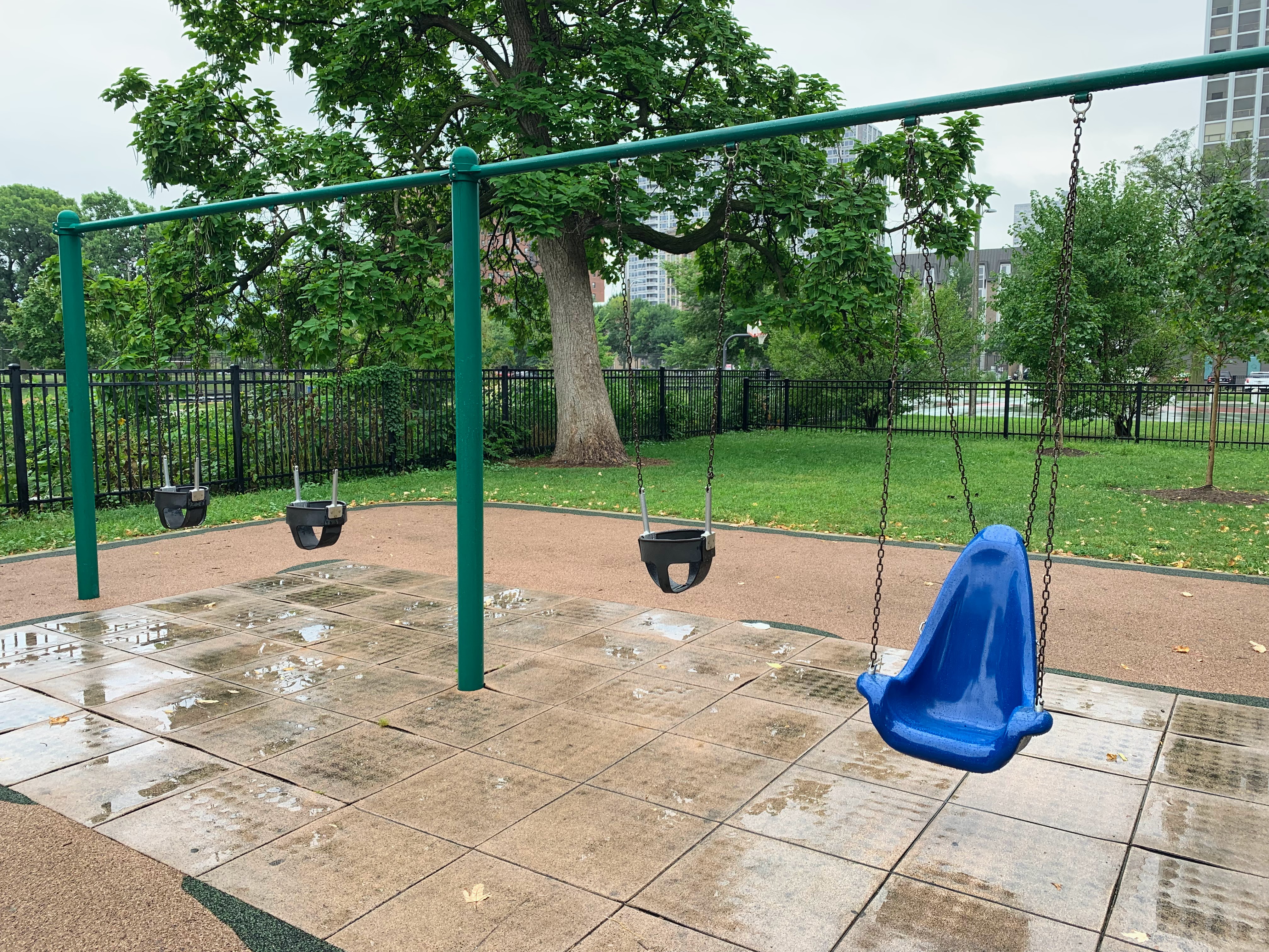 - Solid playground with two structures, a large set of swings, and a small water spray feature. The two play structures are both somewhat standard but offer a variety of slides and climbing elements. The swings are the standard Chicago Park varieties (toddler, adaptive, and belt seat) and the water spray feature is a single pole water sprayer. The playground is fully enclosed, somewhat shaded, and with a play surface of soft rubber. There are a few benches and a drinking fountain in the play area with the Clarendon Community Fieldhouse providing access to bathrooms (when open). All in all, this is a very solid neighborhood playground; highly recommend.