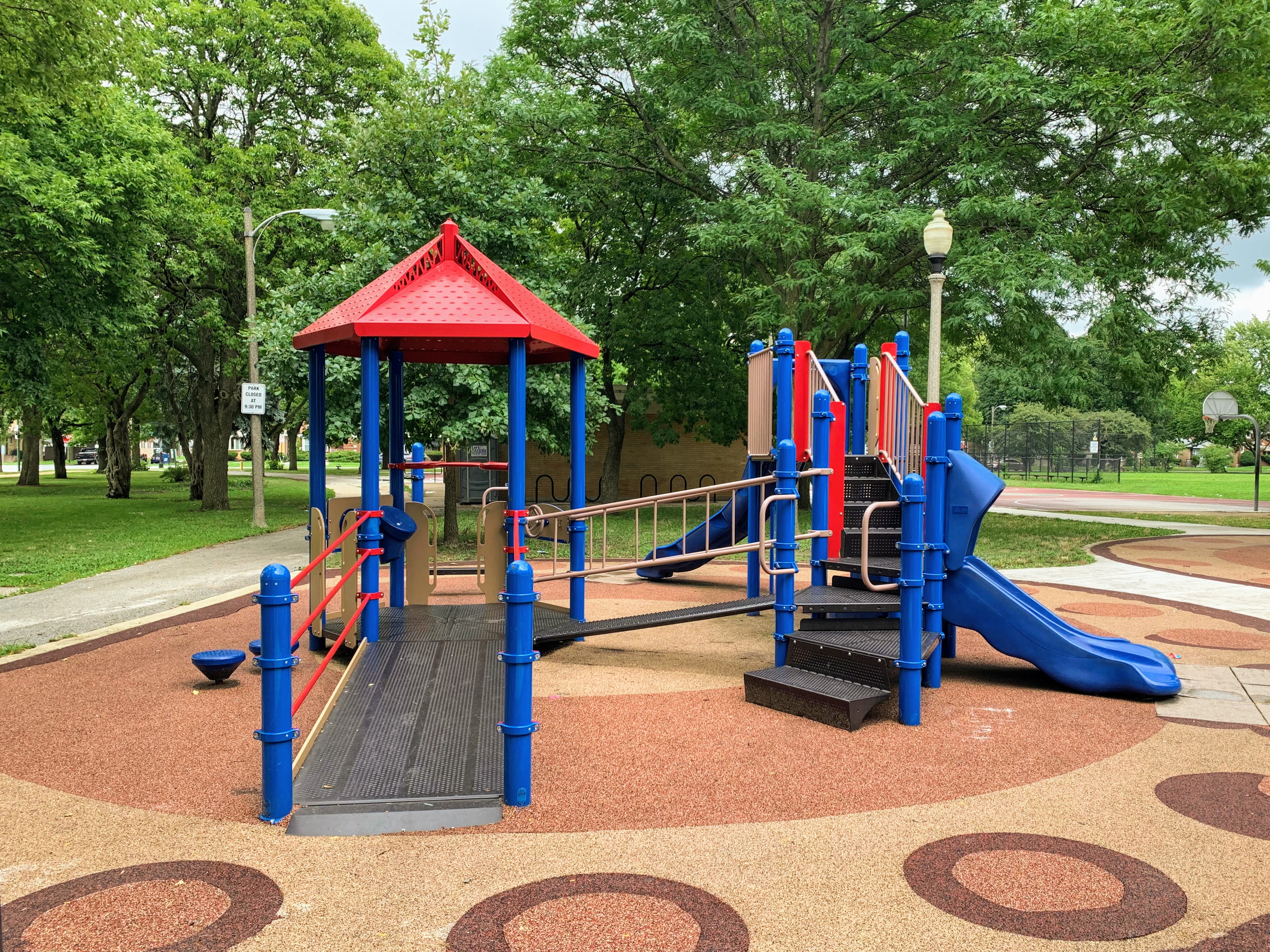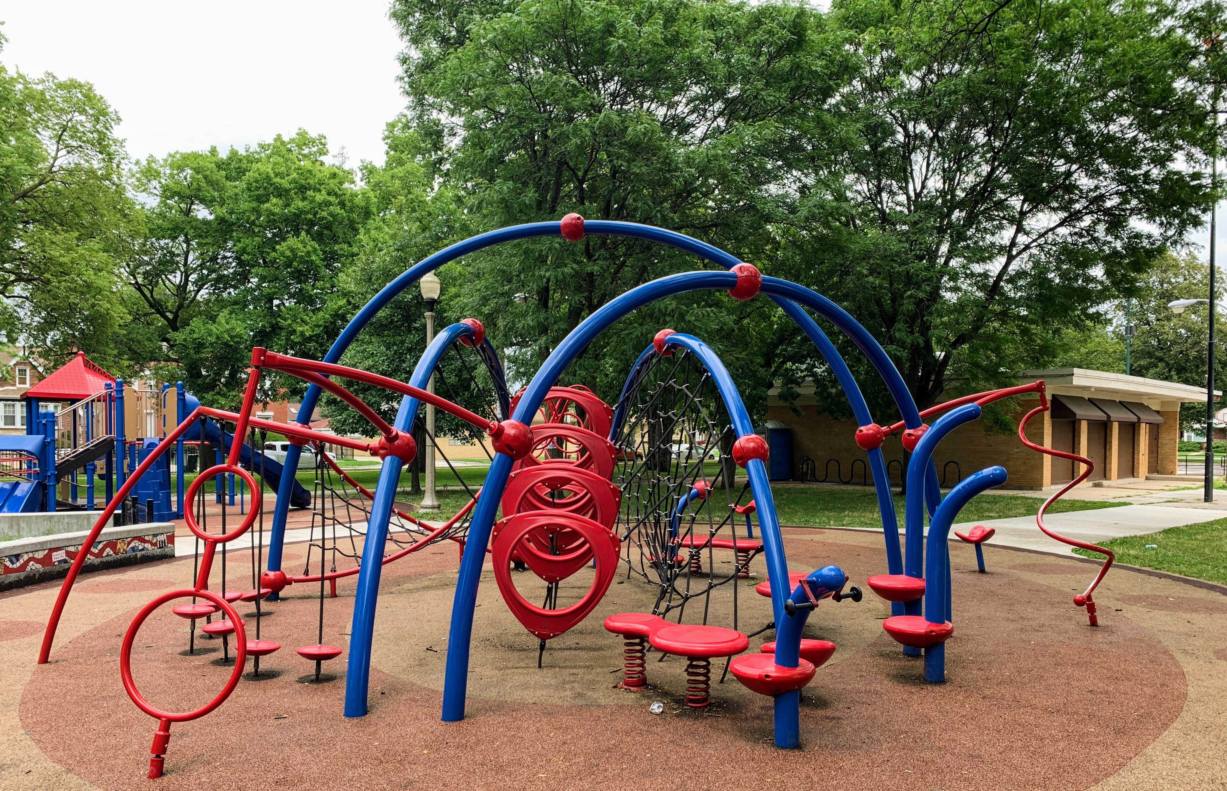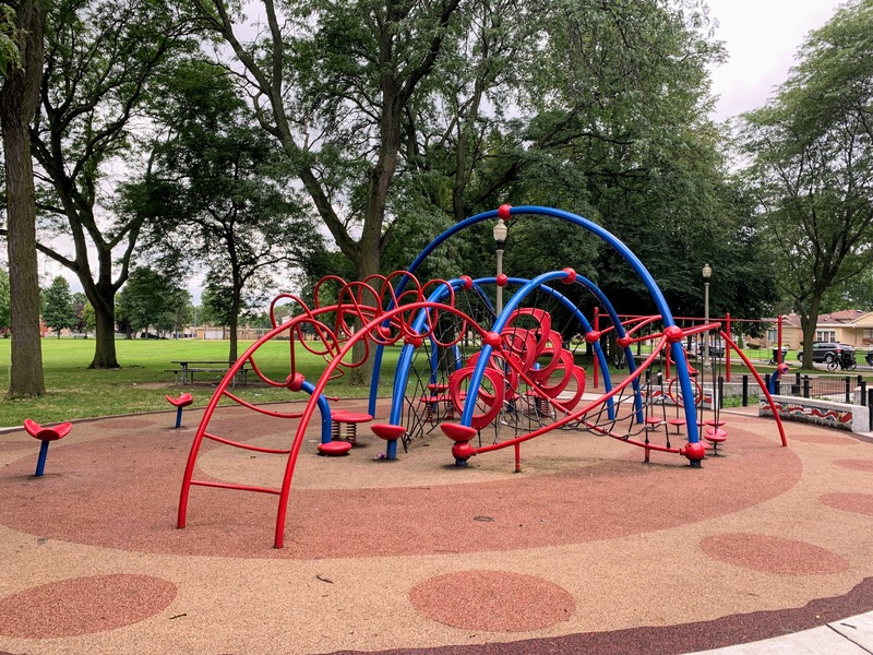 The amenities are also solid. There are benches and a picnic table near the play ground and the main play surface is soft rubber. Large trees provide some shade and the nearby park district building provides access to bathrooms (when open). The play area is fenced from the street (but not fully enclosed) and the play area opens to the rest of the park.