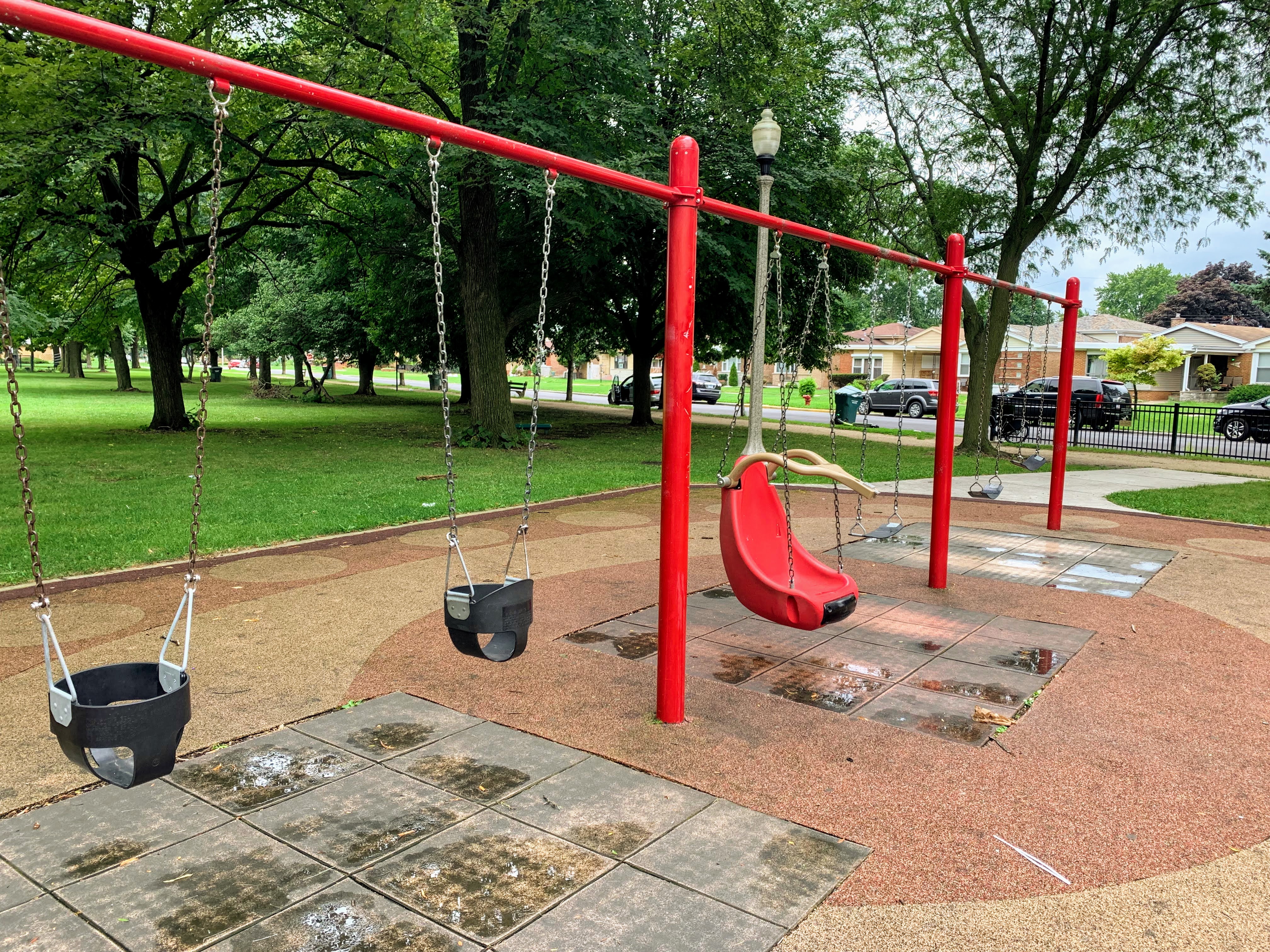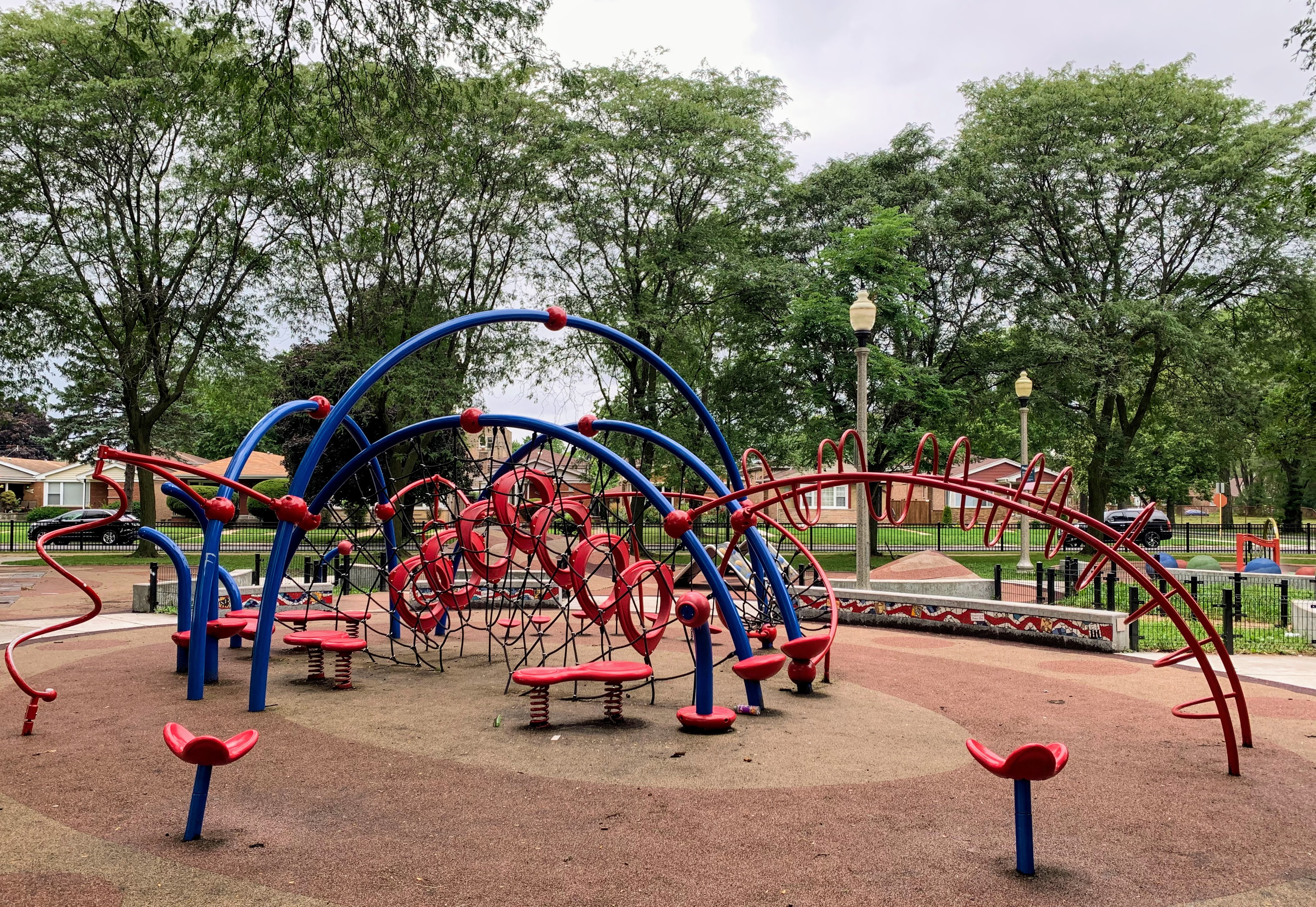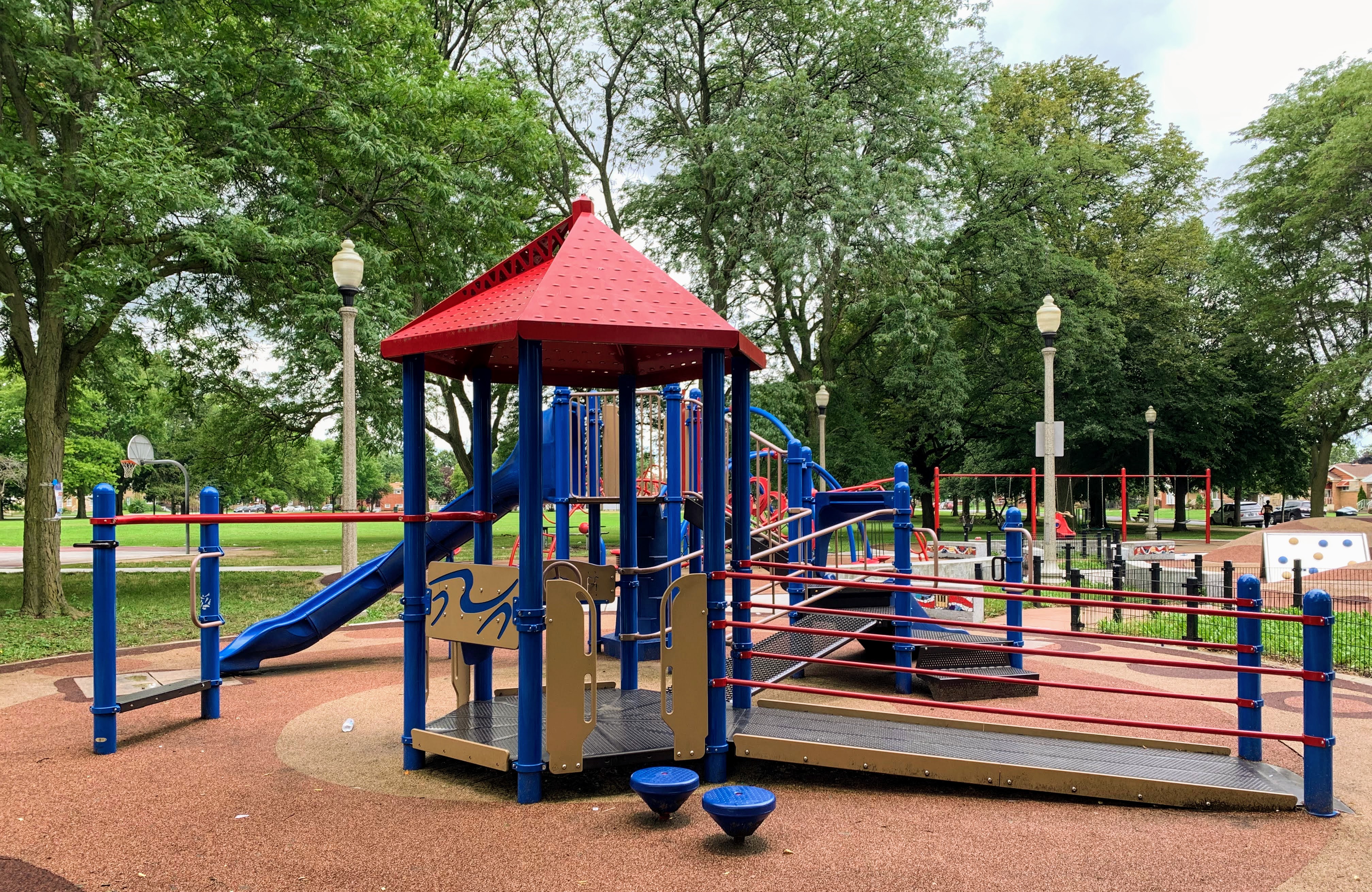 The amenities are also solid. There are benches and a picnic table near the play ground and the main play surface is soft rubber. Large trees provide some shade and the nearby park district building provides access to bathrooms (when open). The play area is fenced from the street (but not fully enclosed) and the play area opens to the rest of the park.