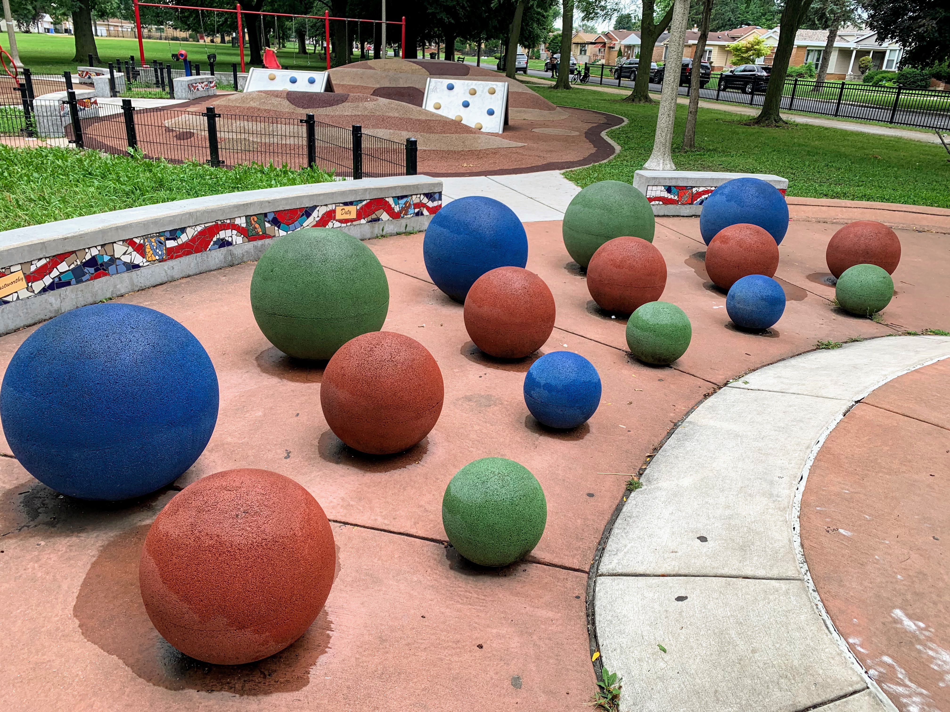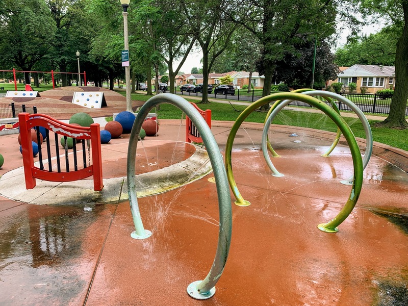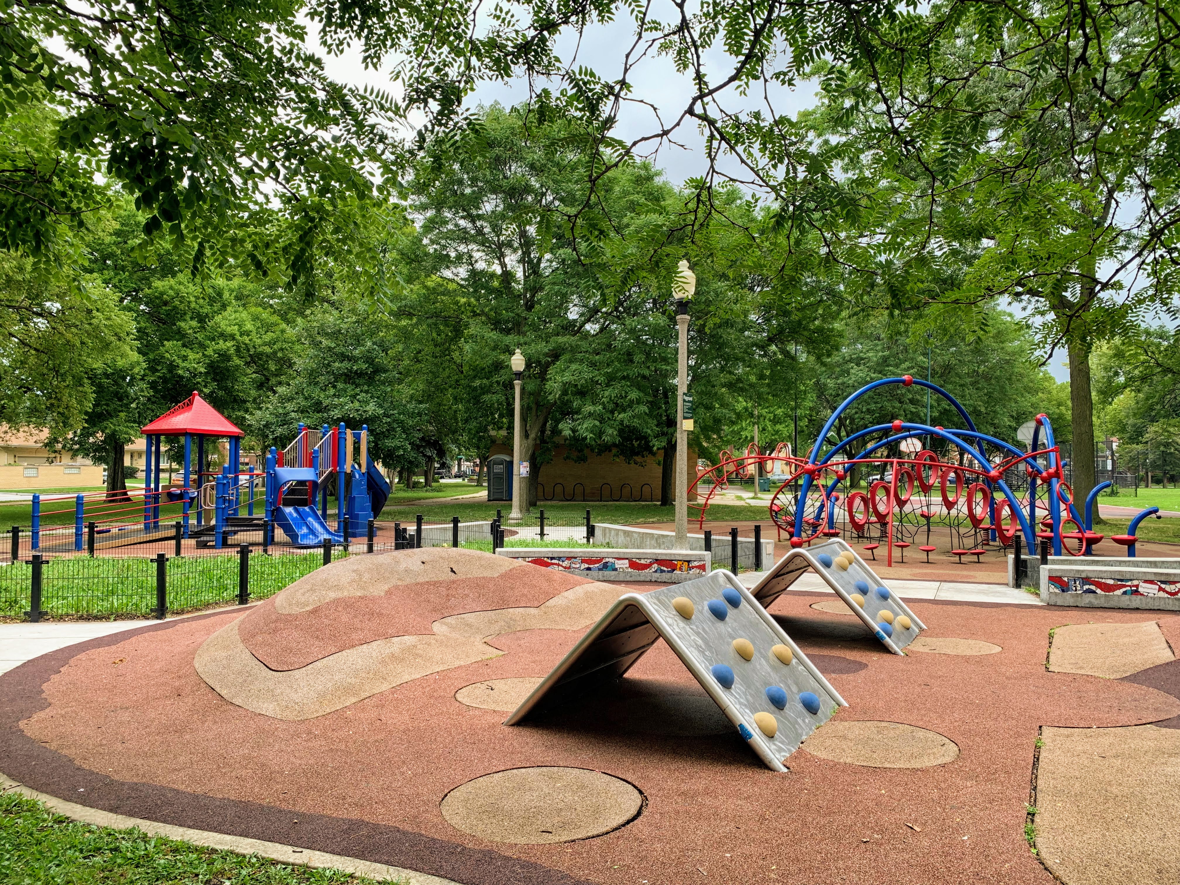 The playground at Nat King Cole Park is a gem: an interesting set of play elements with a water spray feature with very nice amenities. There are four main play area. The first is a somewhat standard play structure with slides, climbing elements, and monkey bars. The second area is a collection of rope net climbing elements that is less traditional but perhaps more interesting. The third is an area were the soft rubber surface is mounded in places and there are some interesting 'rock climbing tents - somewhat hard to describe but a unique area within Chicago Park playgrounds. The fourth area is a water spray area with some water loops, musical chimes, and (what appear to be) colored concrete balls set in the play area. Again, hard to describe but really interesting and unique.