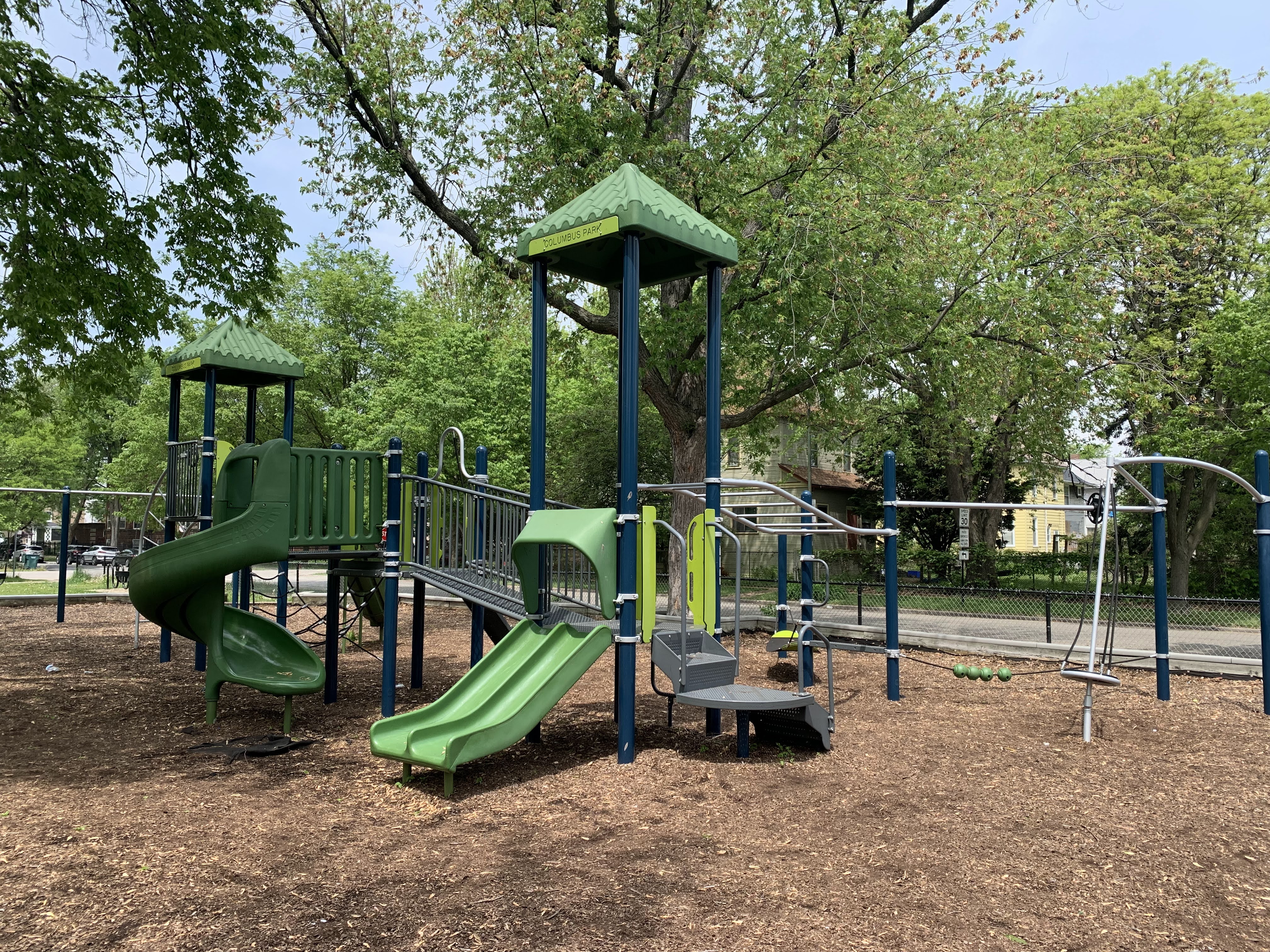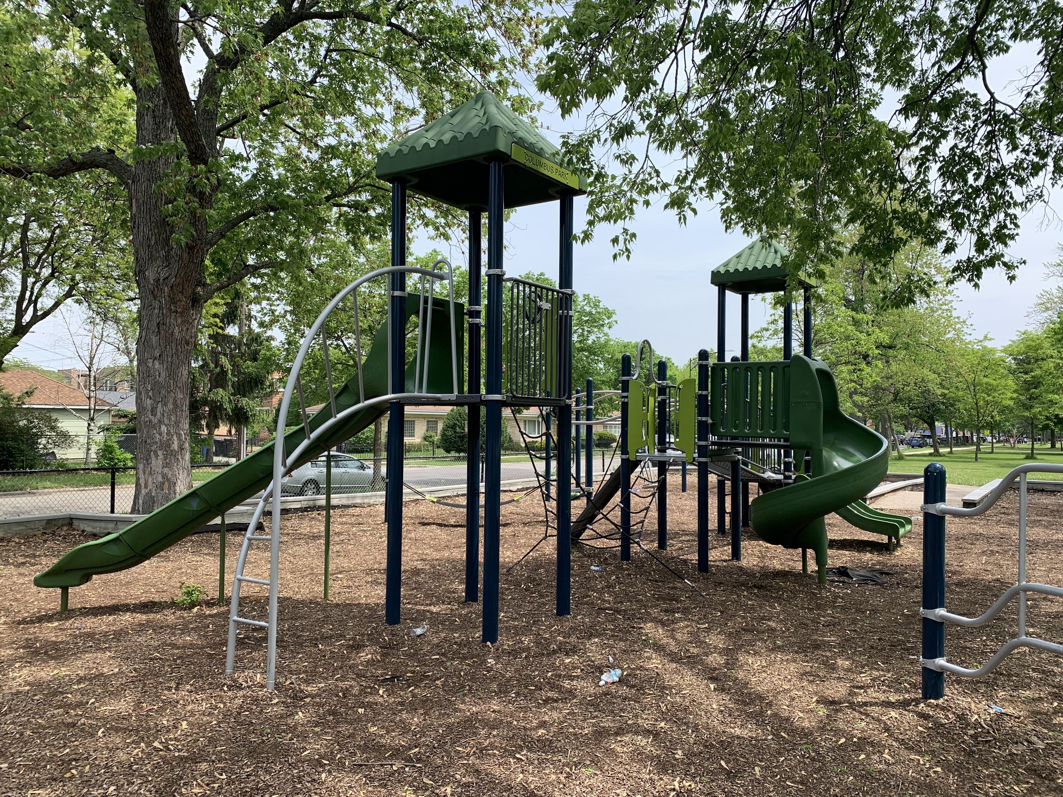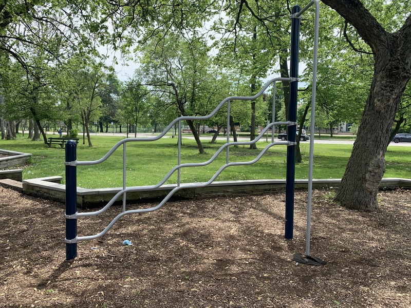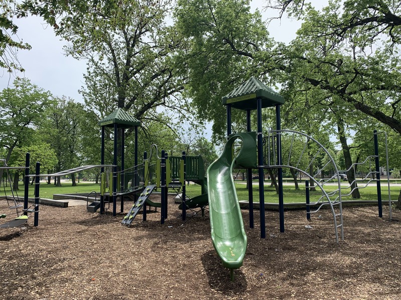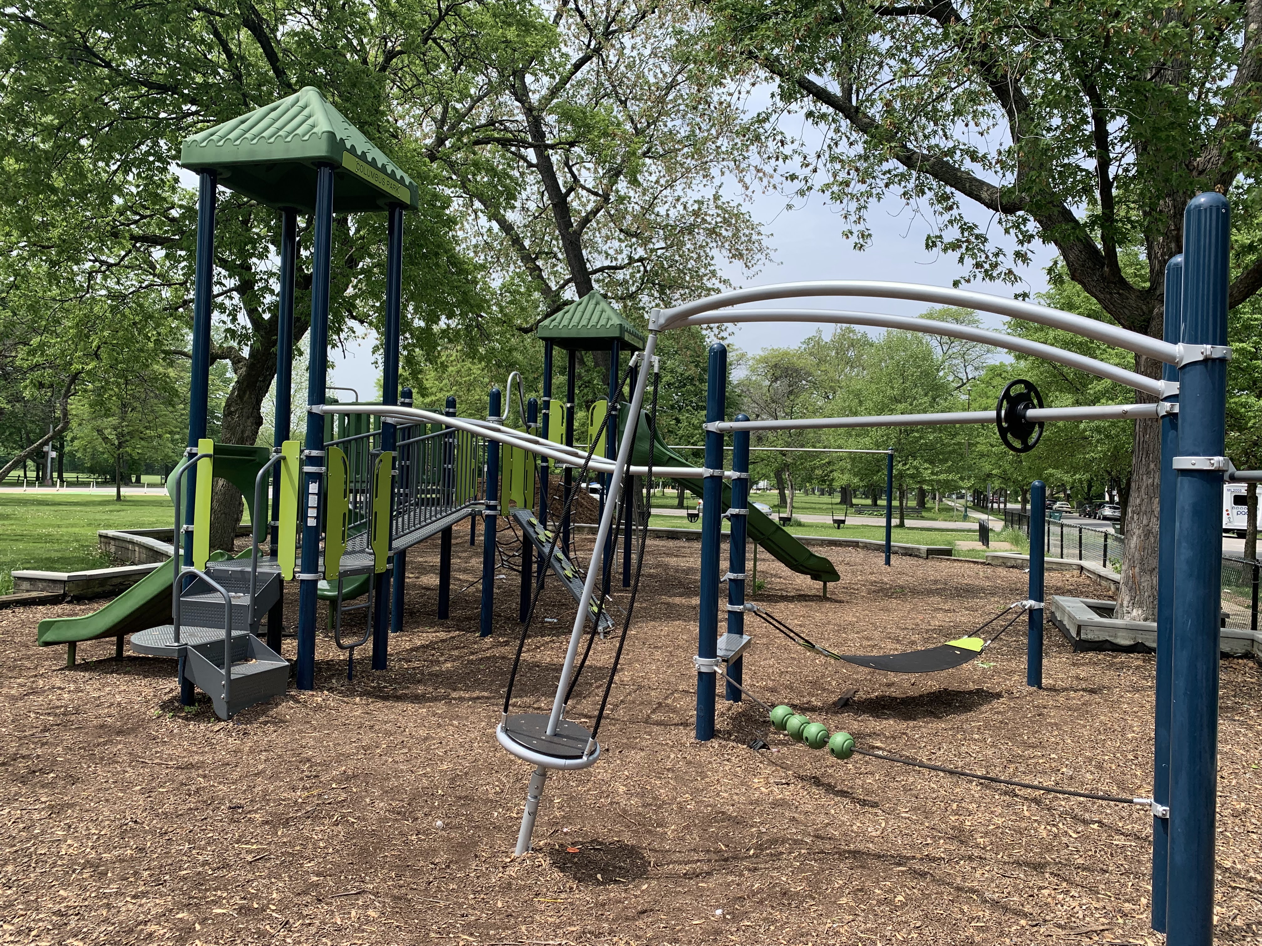 - This playground - one of two in Columbus Park - is located on the north side of the park between Jackson and Adams by Menard Drive. It features a large play structure with a variety of slides and climbing elements along with a standard set of swings. The play area is not enclosed but it is fenced from Adams. There are some trees (mainly to the south) that provide some shade and a few benches for seating. The play surface is wood chips.