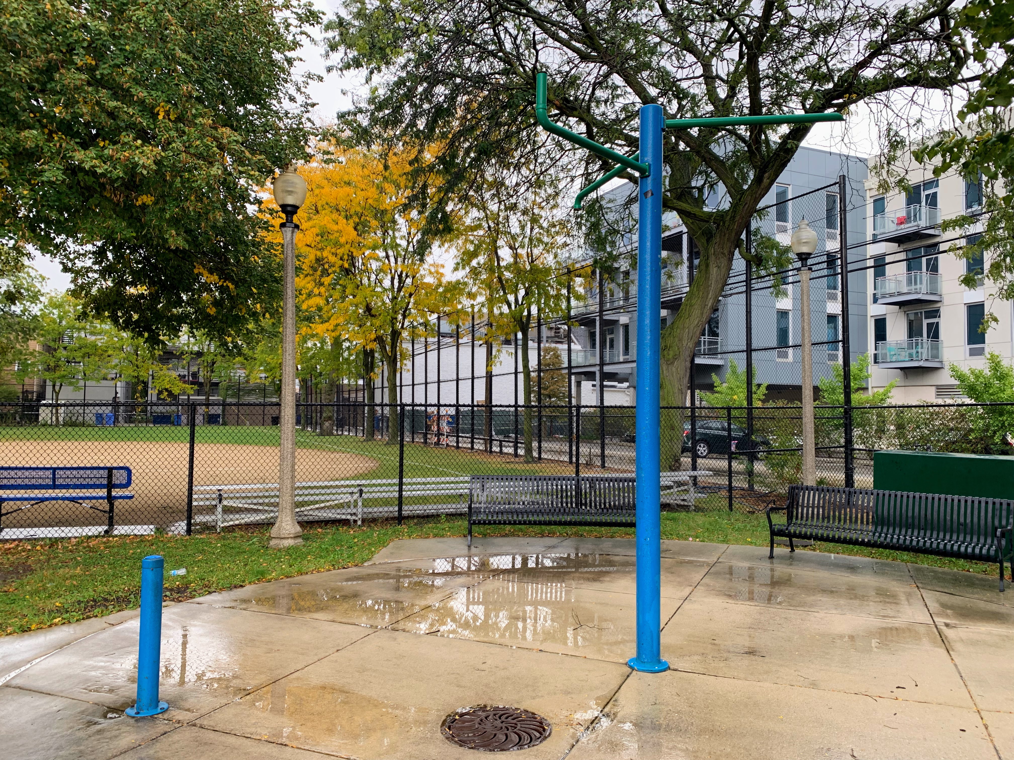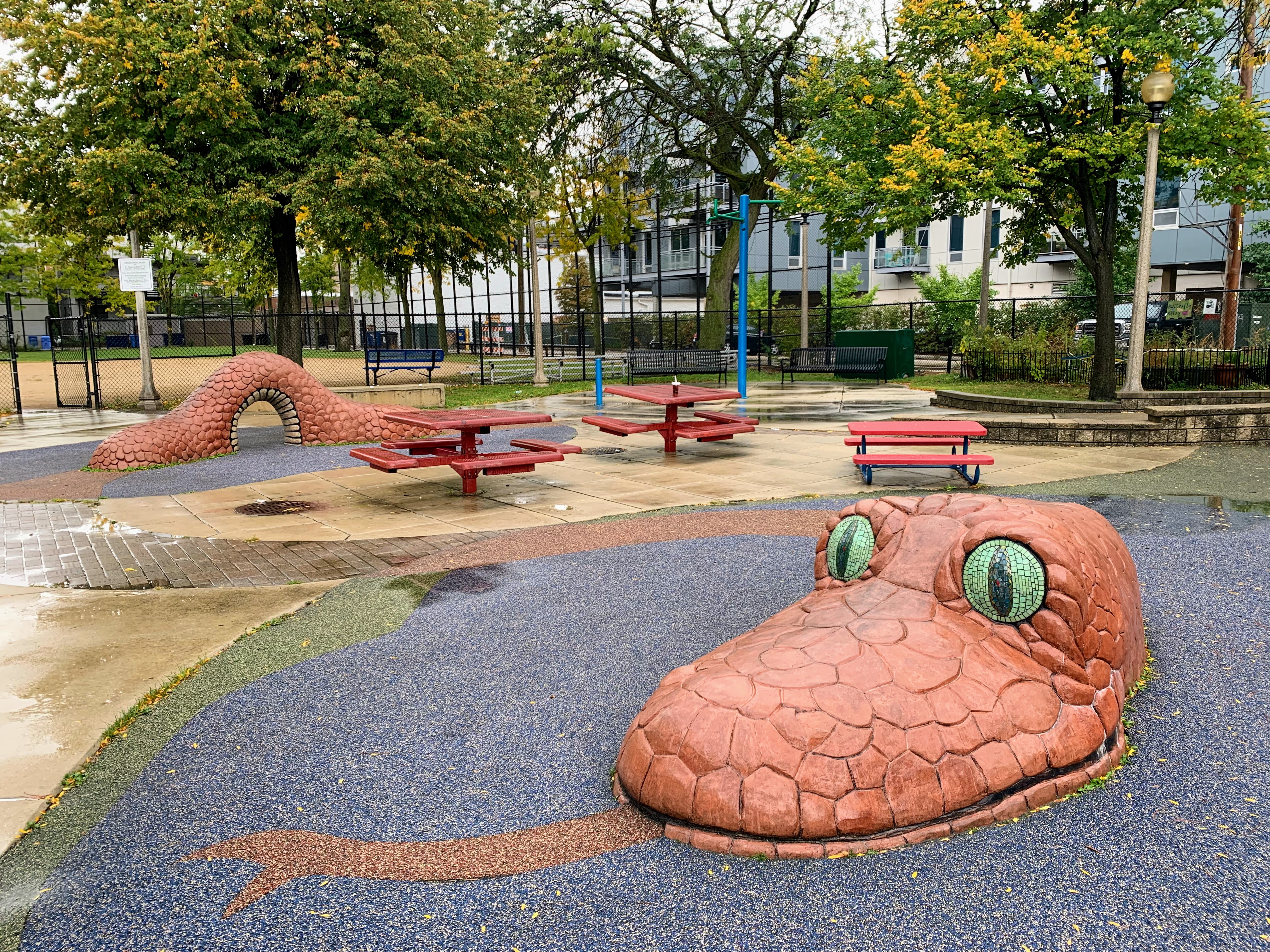 The non-play amenities are also great. The play area is fully enclosed with some shade and easy access to bathroom via the fieldhouse. There is ample seating with benches and picnic tables within the play area. And the play surface is soft rubber.