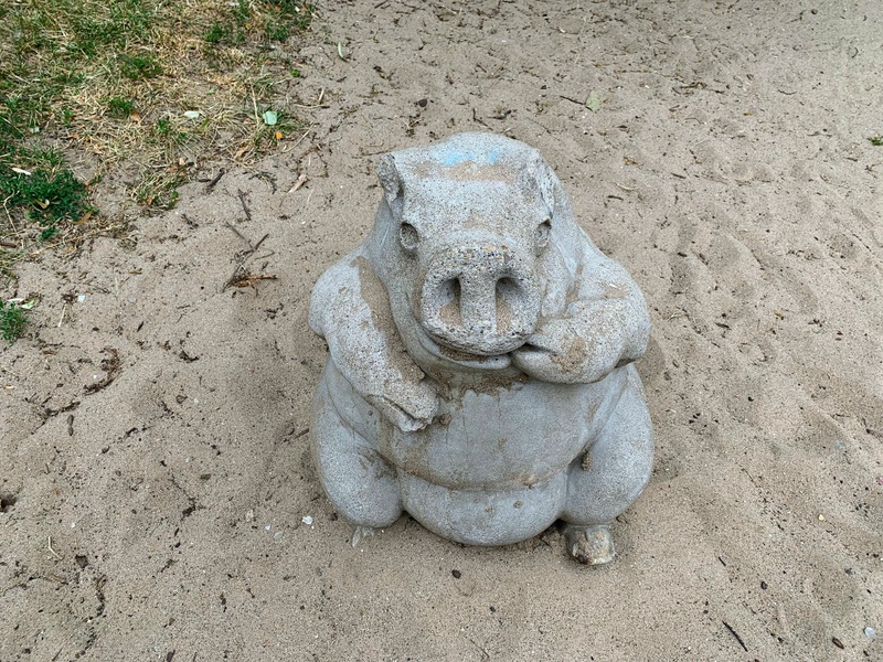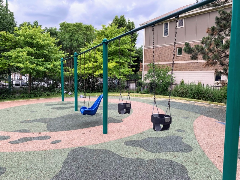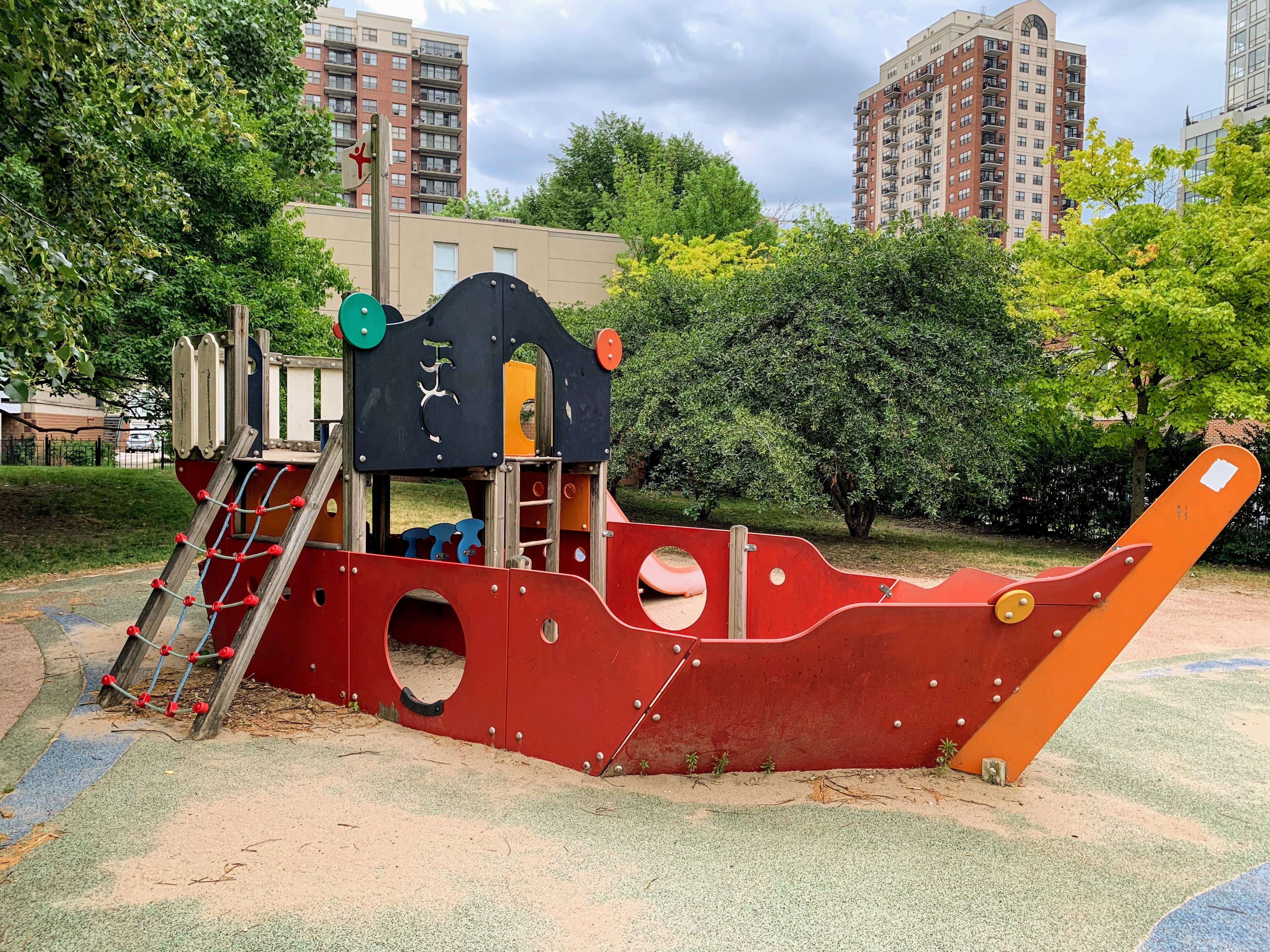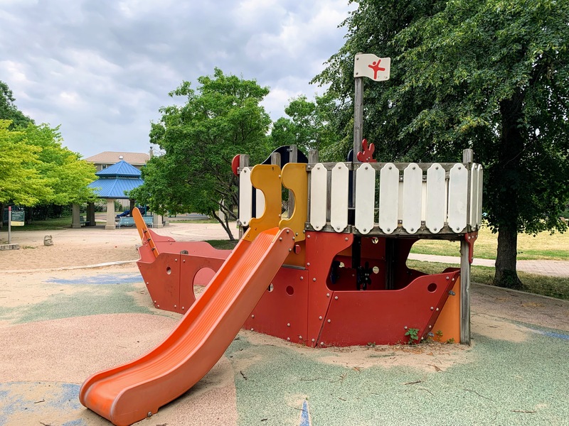 The playground at Cotton Tail park features swings and a small play structure on one side of a gazebo and a large sandbox and play ship on the other. The play structure is small and relatively simple with just two slides and limited climbing features. It offers the standard set of swings (toddler, adaptive, and belt seat) as well. On the other side is a large sand play area with a play ship with a single slide and a climbing net. Given the nature of the equipment, this is a great play space for younger children with great imaginations.