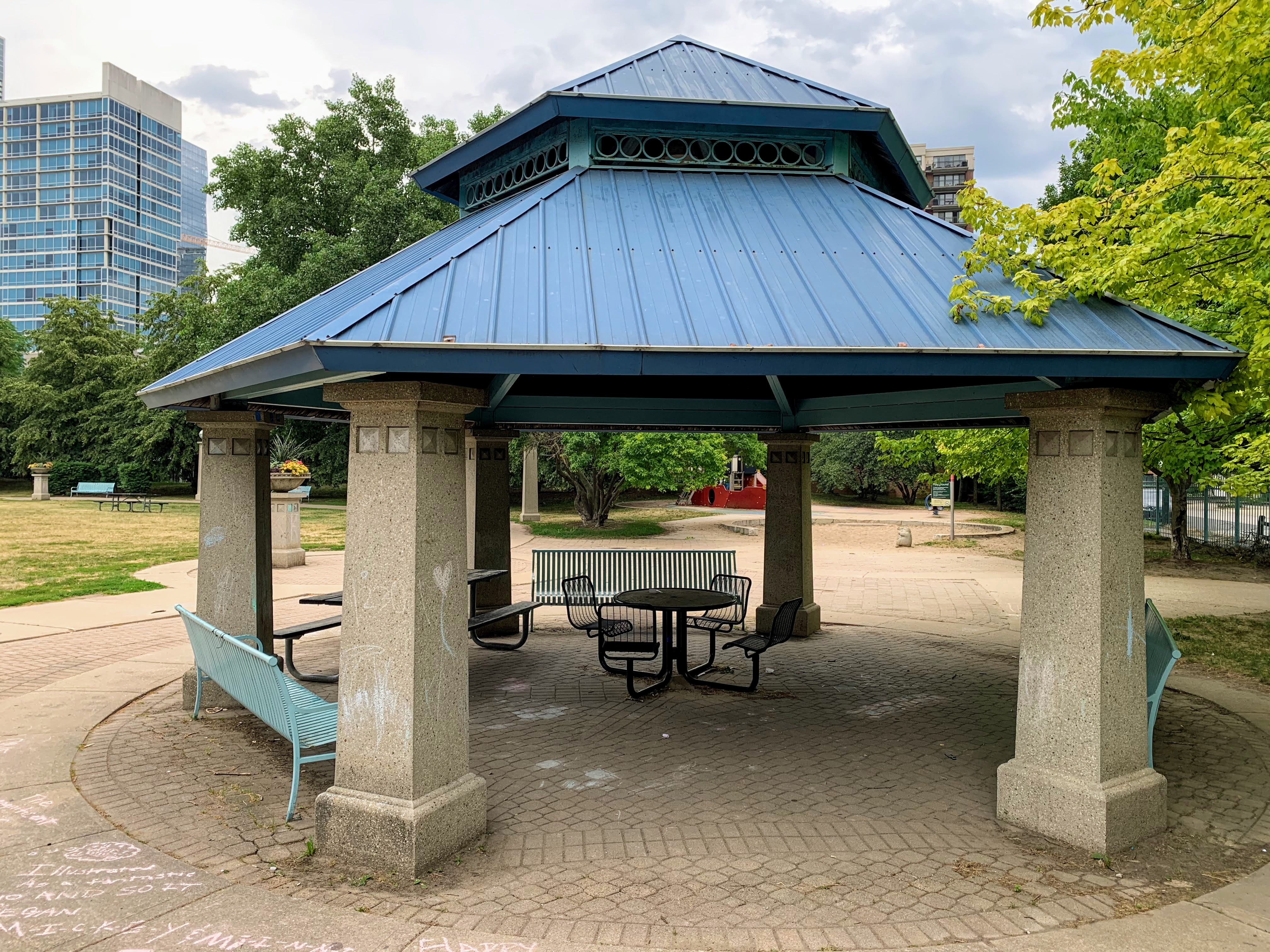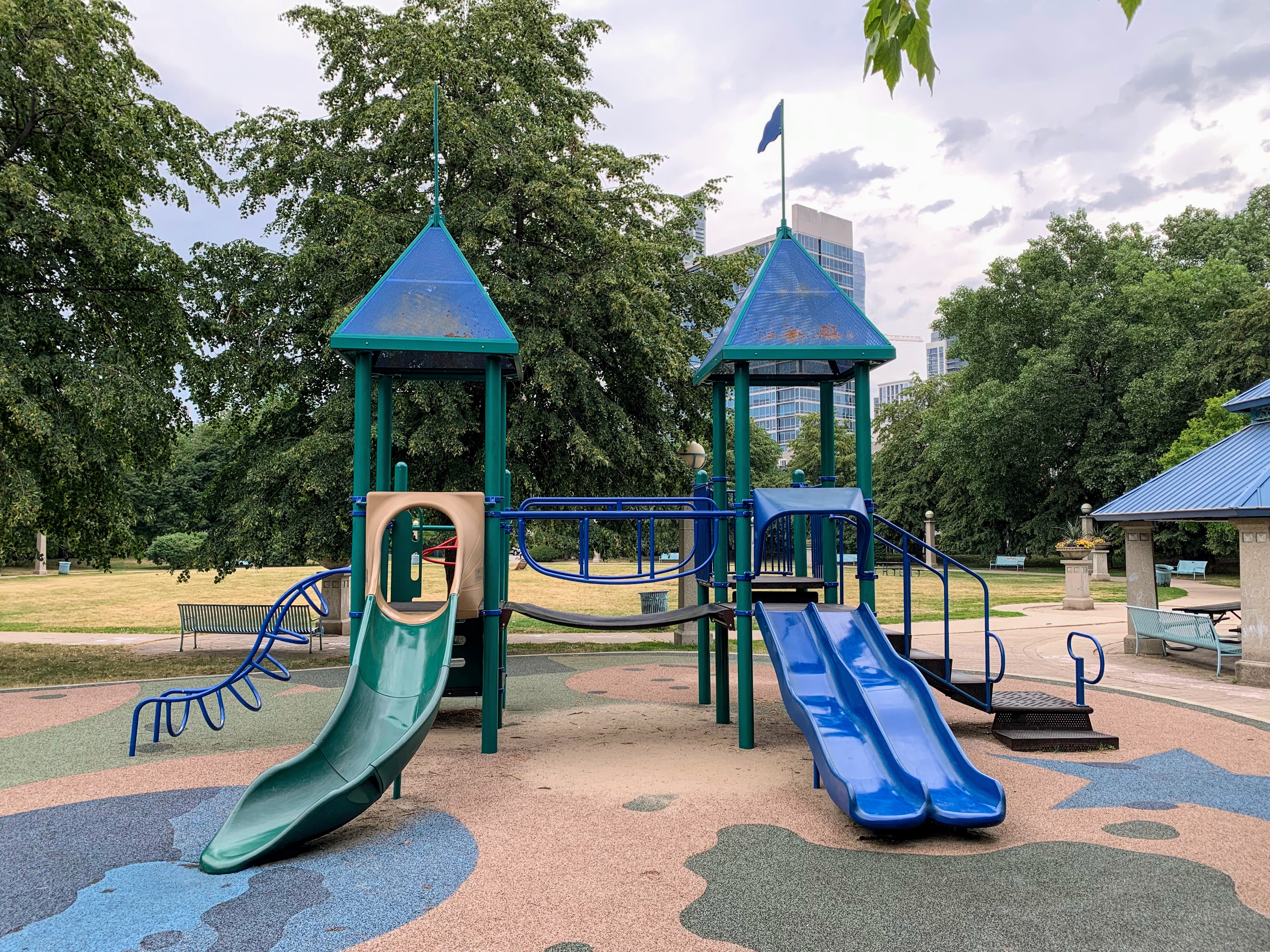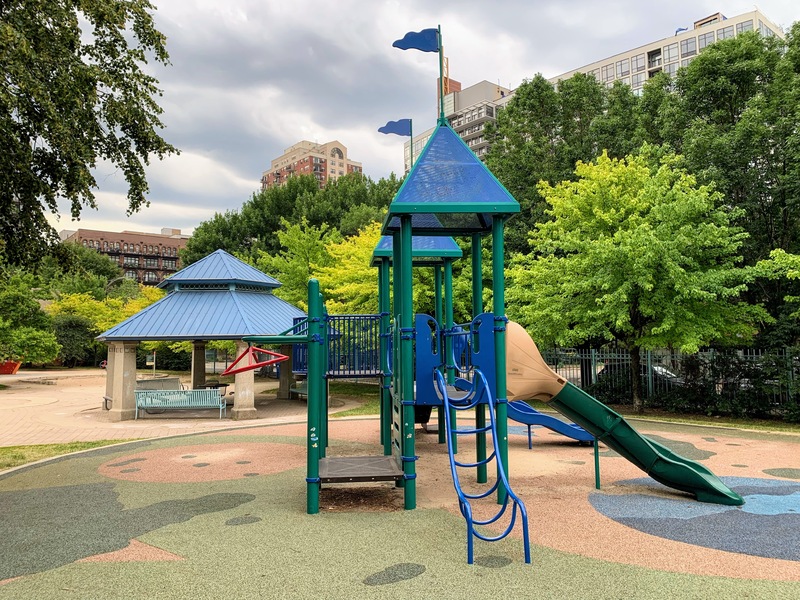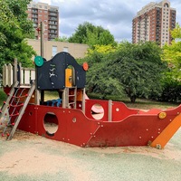 The play surface is soft rubber (except the sand play area which is...sand) and although the playground opens directly into the park the majority of the park is fenced from nearby streets. There are benches and a few picnic tables for seating as well as a drinking fountain. The gazebo provides some shade but the play areas are bright and sunny. This is an interesting playground that is worth checking out. - Playground Features