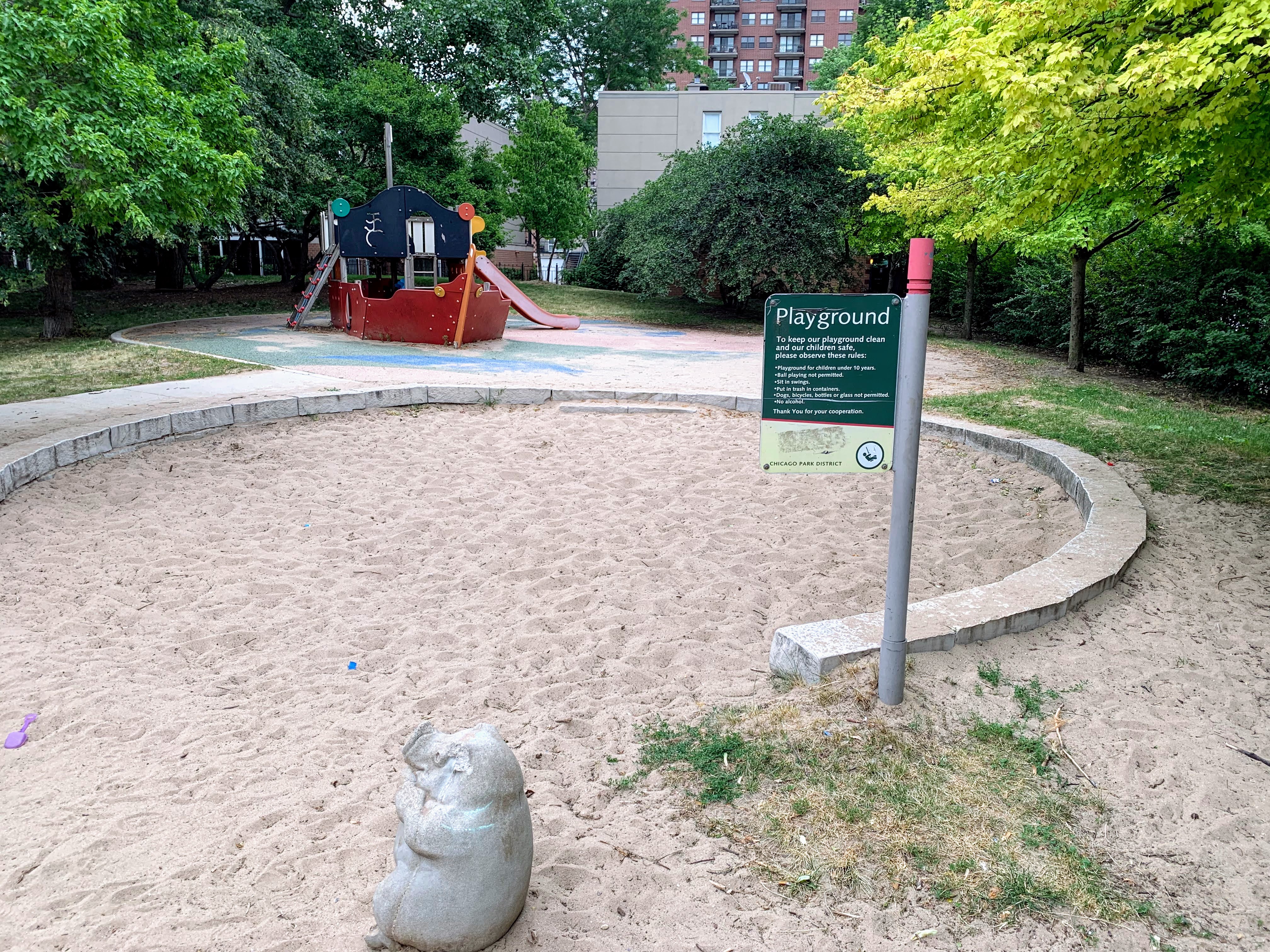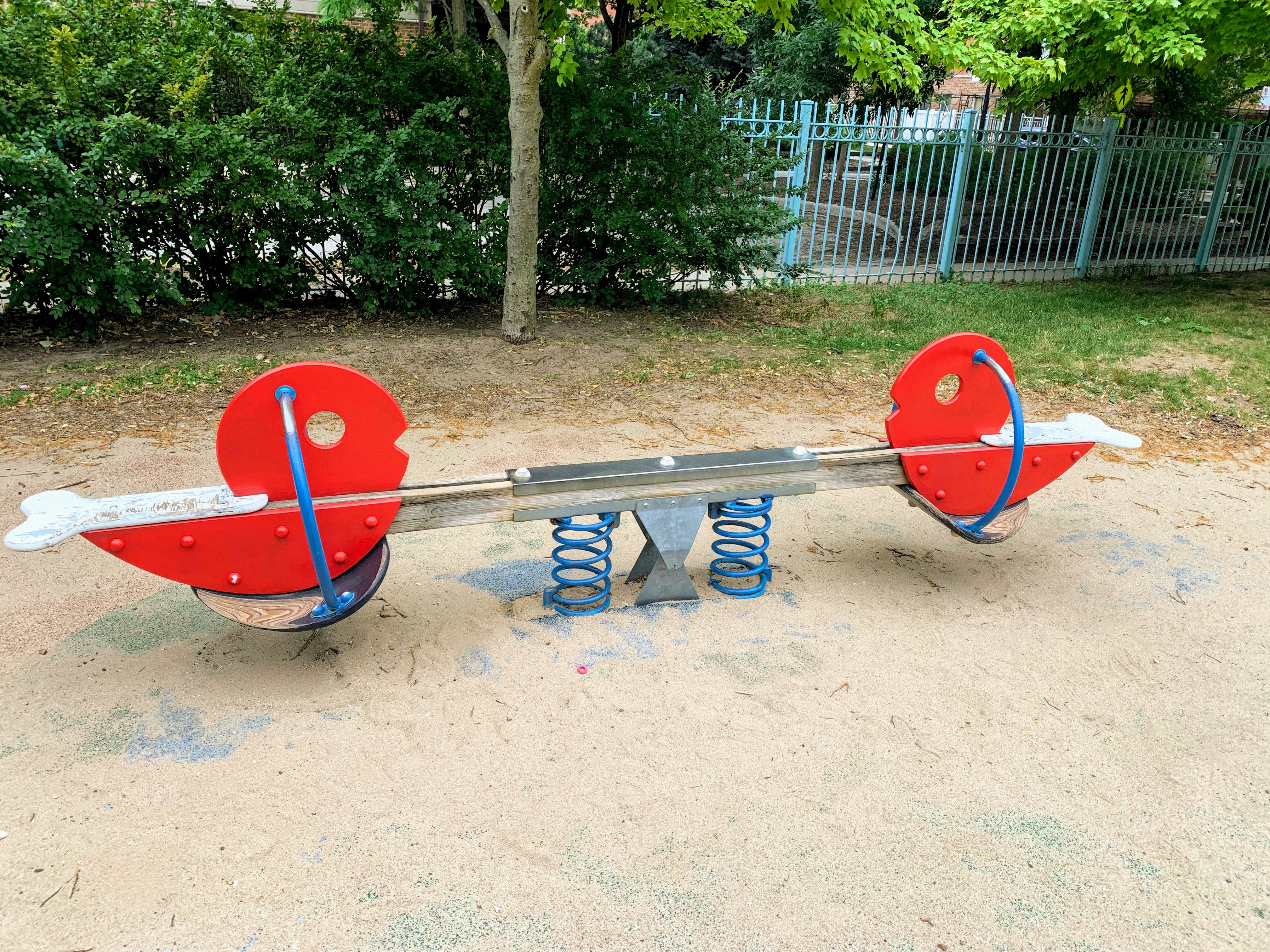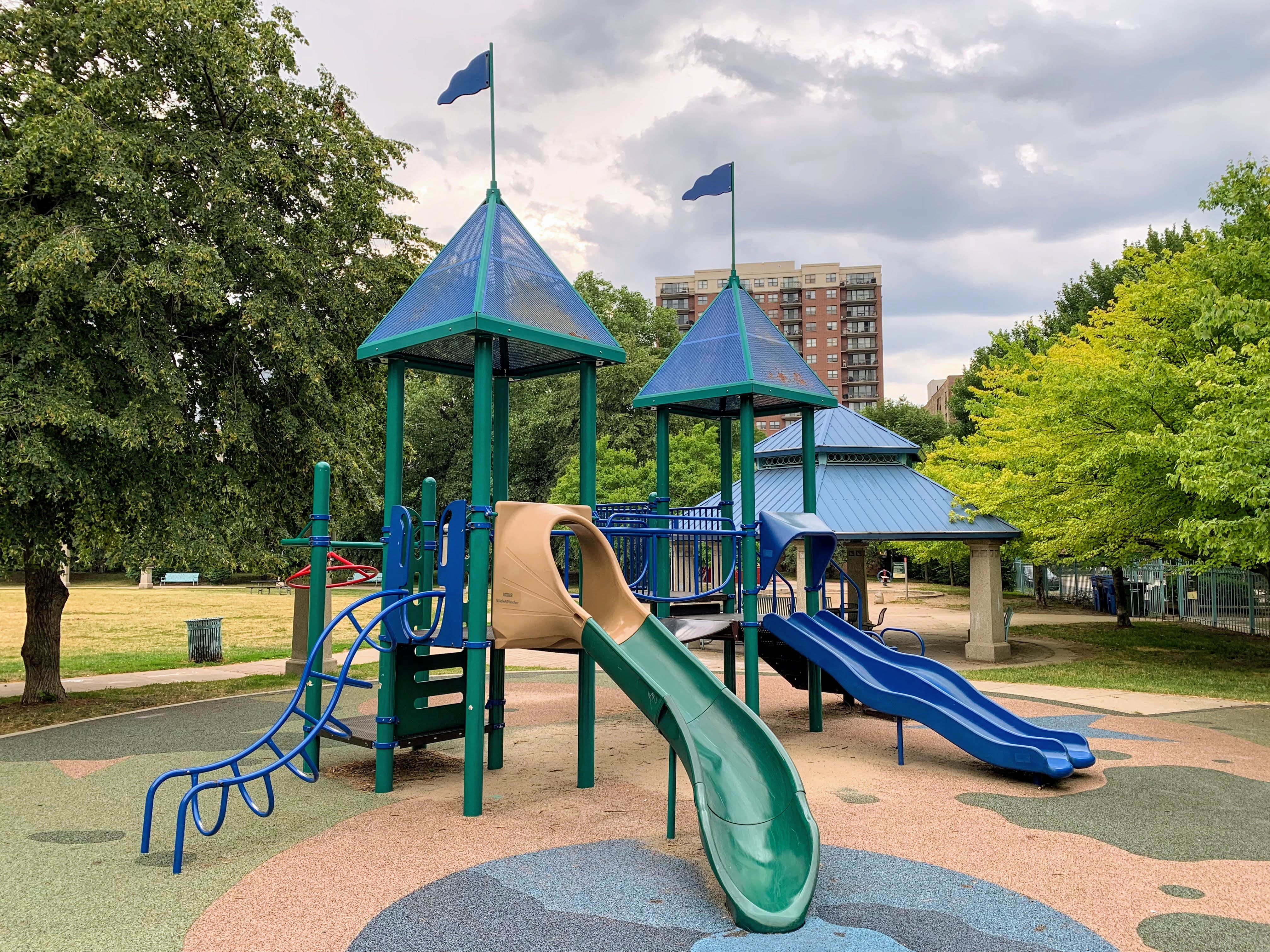 The play surface is soft rubber (except the sand play area which is...sand) and although the playground opens directly into the park the majority of the park is fenced from nearby streets. There are benches and a few picnic tables for seating as well as a drinking fountain. The gazebo provides some shade but the play areas are bright and sunny. This is an interesting playground that is worth checking out. - Playground Features