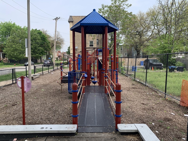 - This tiny neighborhood pocket park is situated on a narrow site and features a single play structure. There are a few slides, climbing elements, and monkey bars as well as a tire swing. The play lot is mostly enclosed and covered in wood chips. There aren't any benches in the play area but a few perimeter walls provide some seating.
