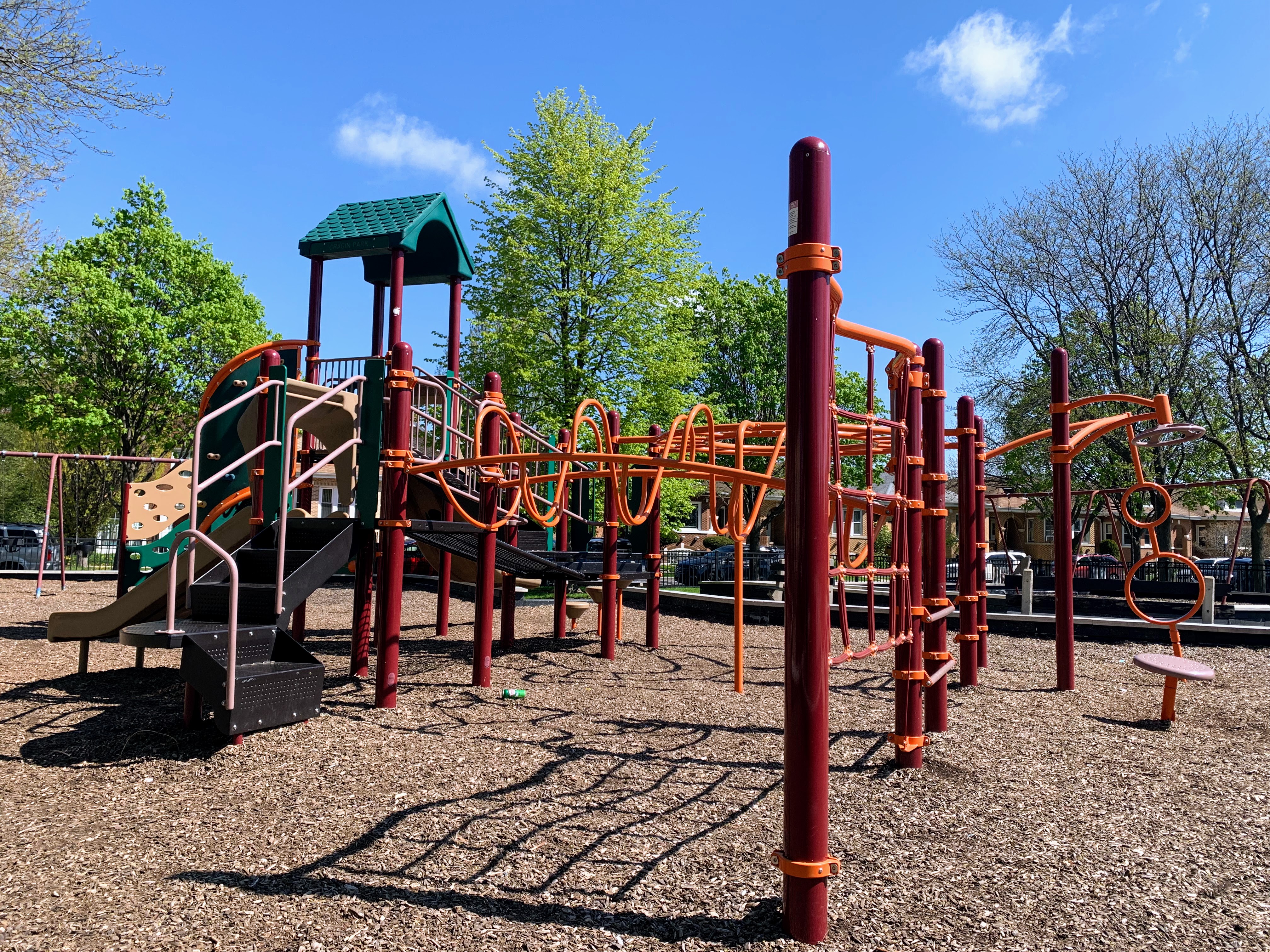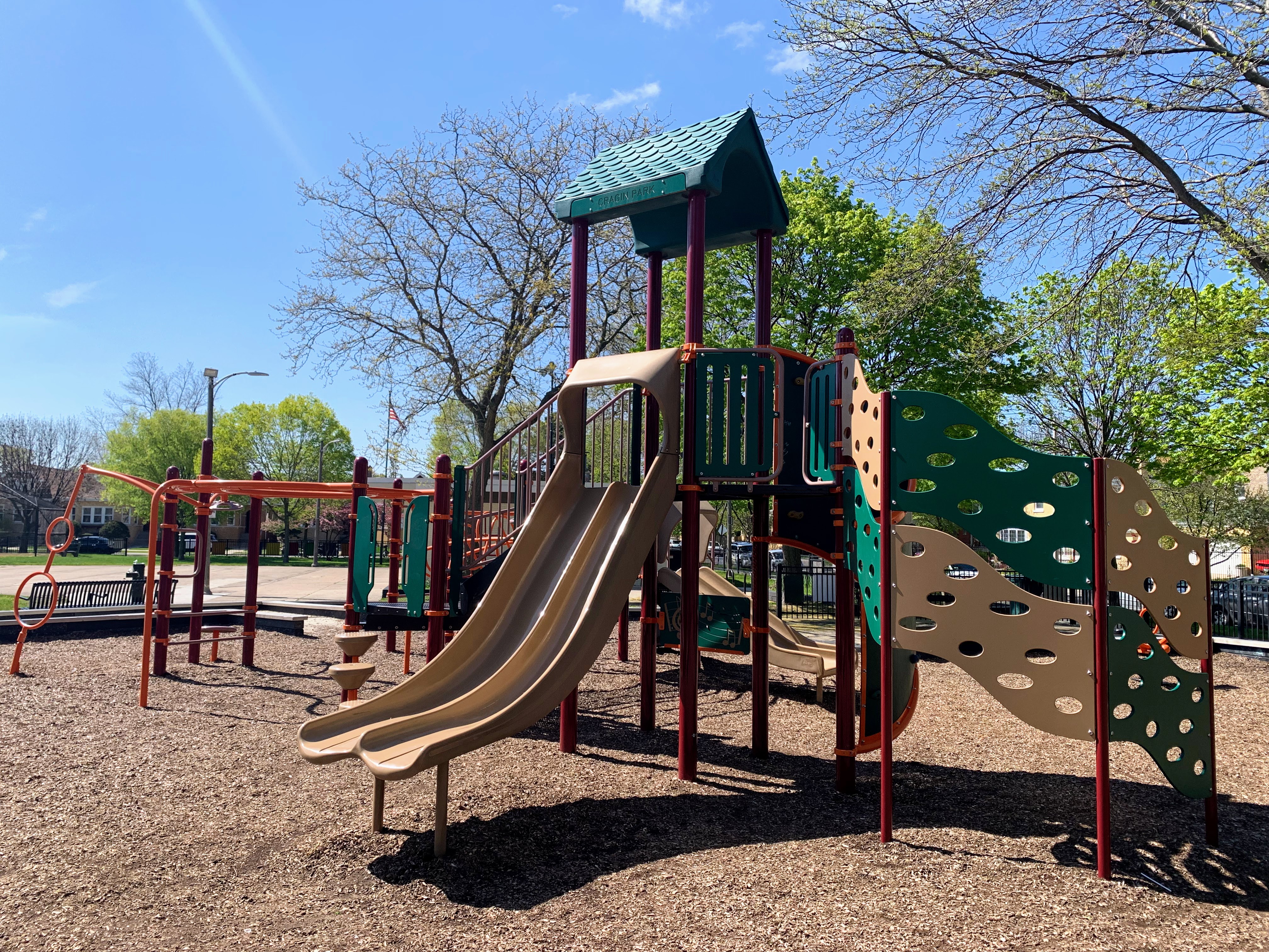 - The playground in Cragin Park is a wonderful little site with a moderately large play structure, swings, a few standalone elements, and a water spray feature. The play structure features a bunch of climbing elements and two slides. The water spray feature is a typical 'four sprayer' but is one of the nicest ones I've seen. The non-play amenities are standard but solid; there are benches and a drinking fountain around the play area with a wood chip play surface. The small fieldhouse nearby should provide access to bathrooms (when open). All in all, a very solid neighborhood park and playground.