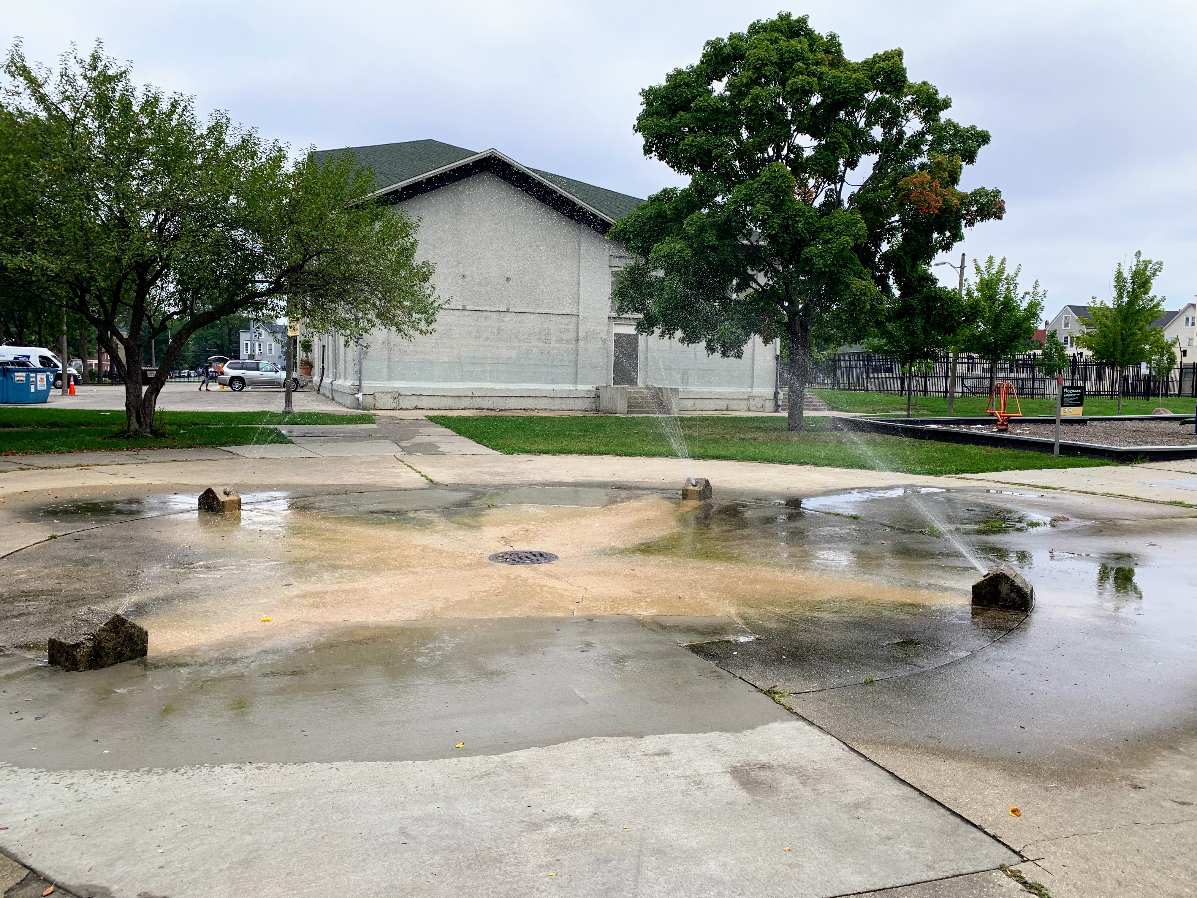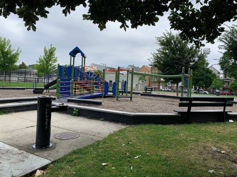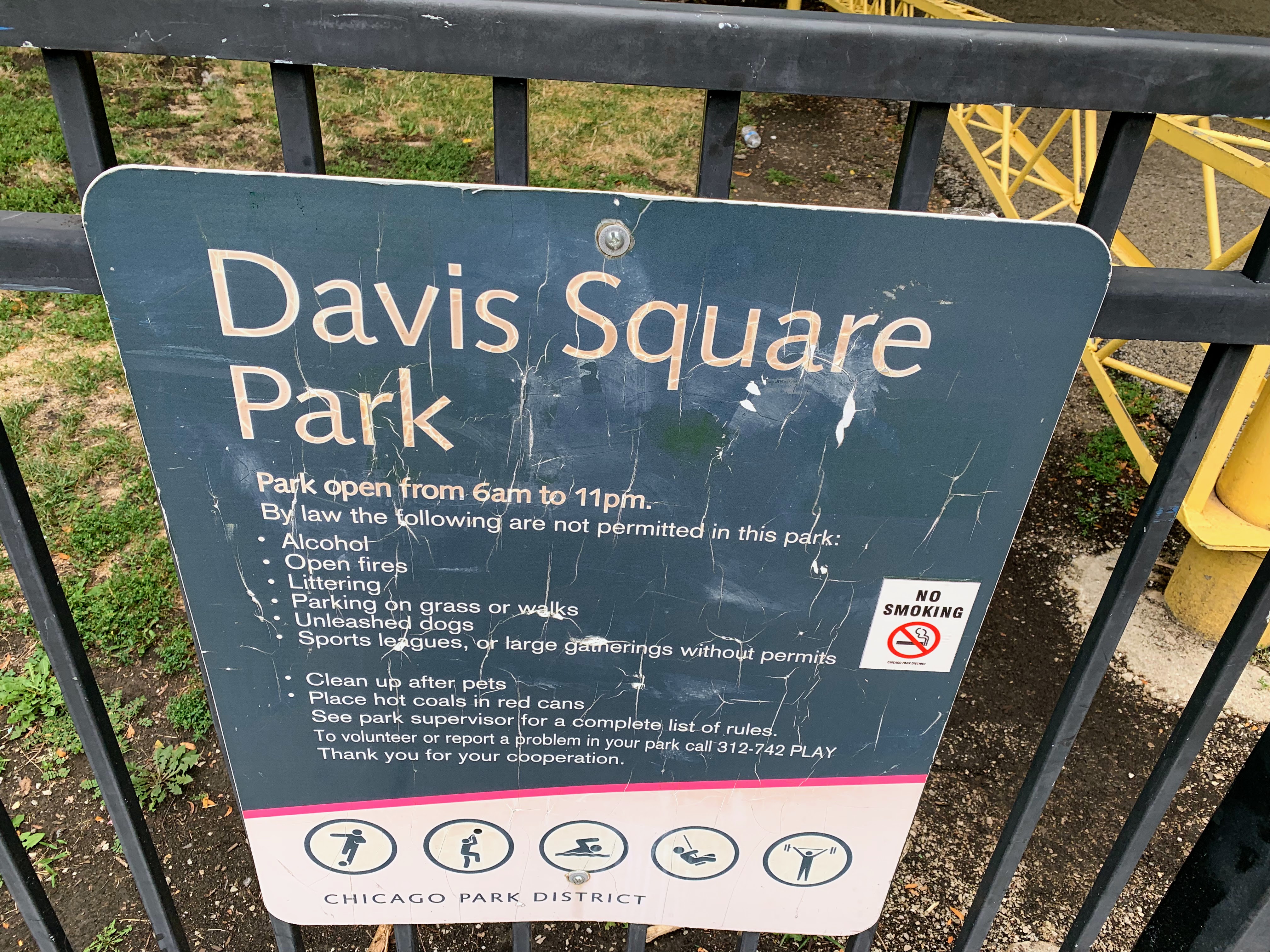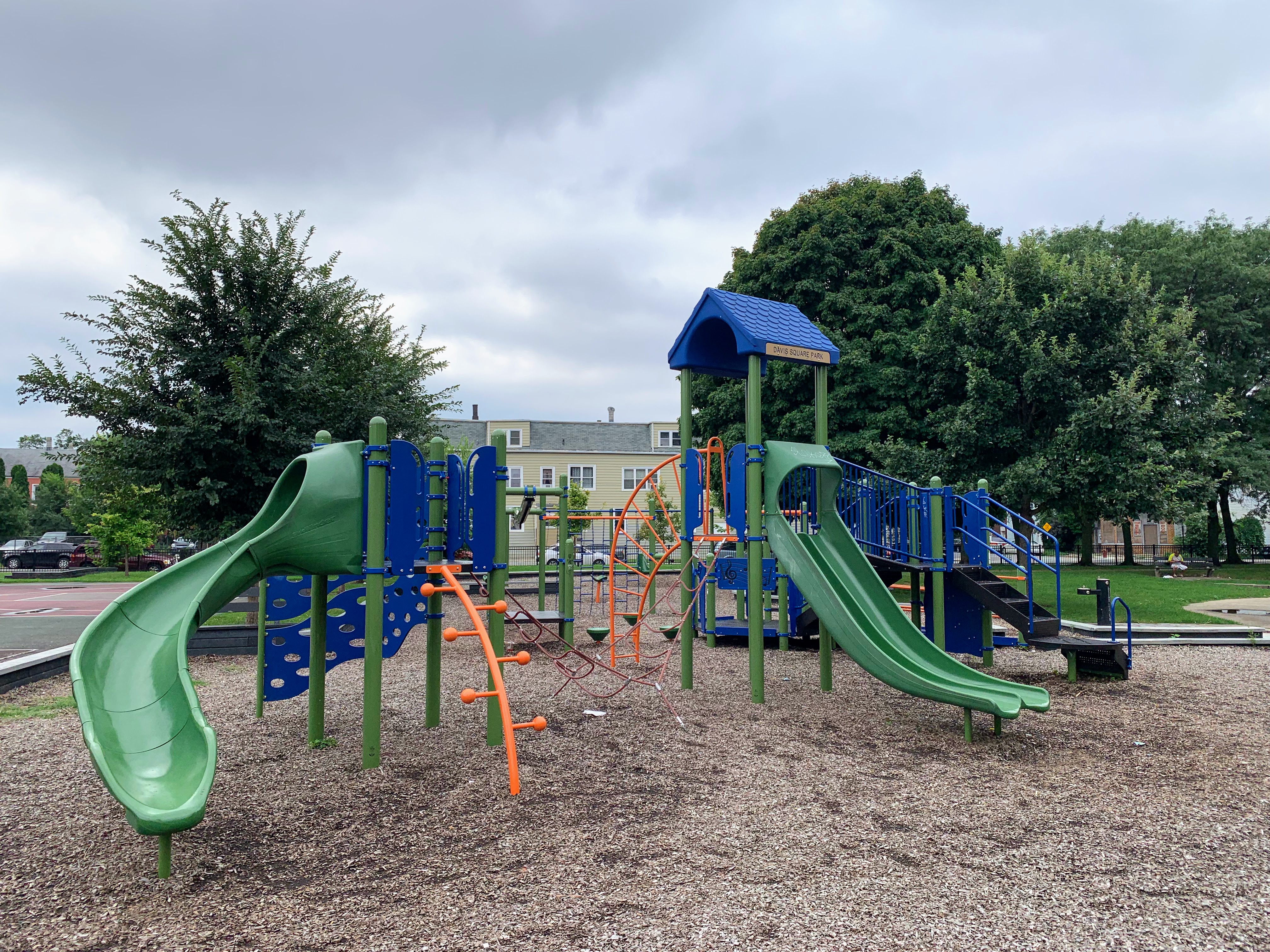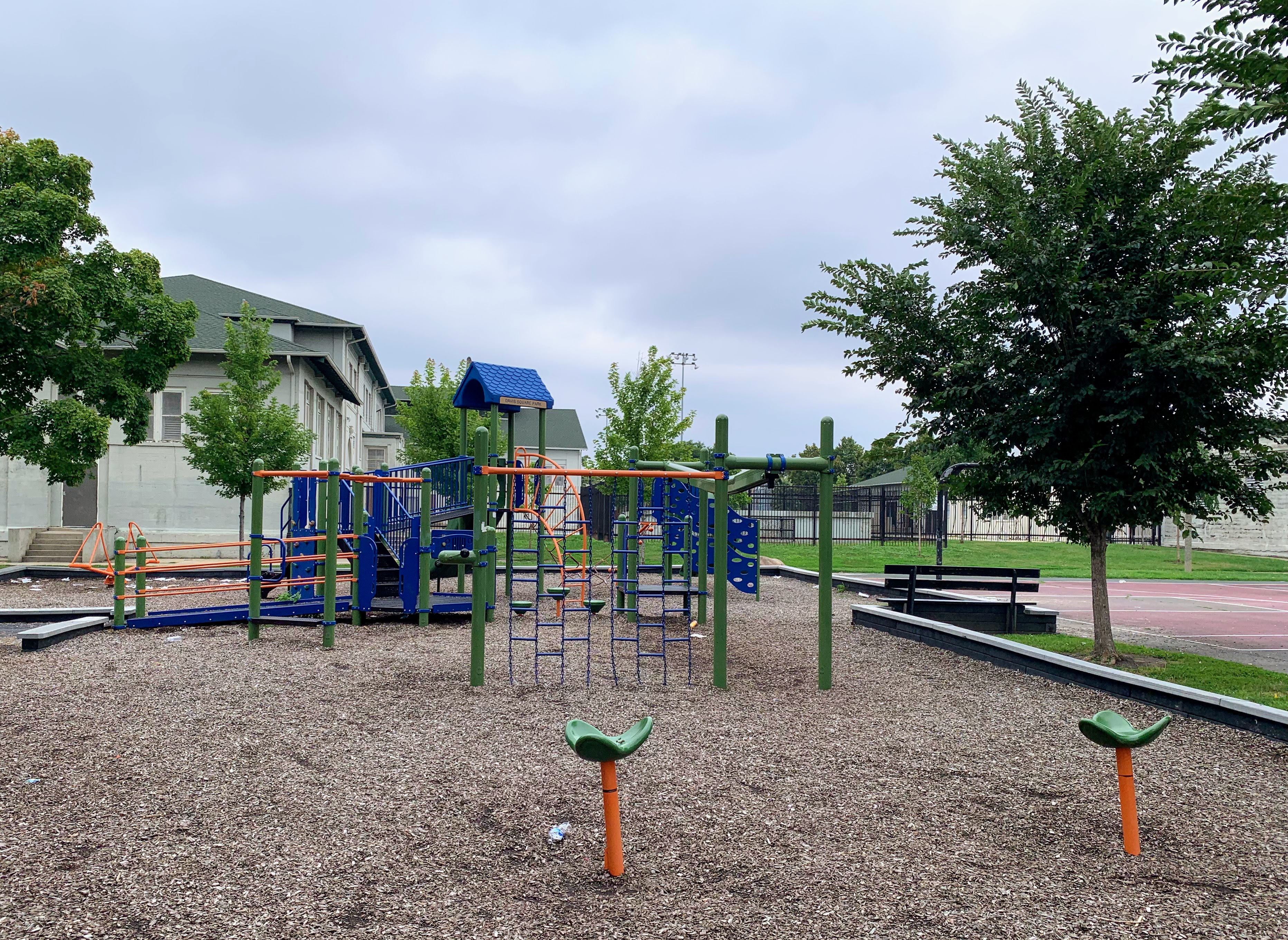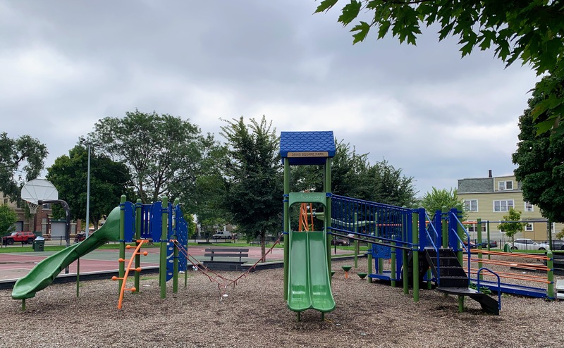 - Davis Square Park, a historic park that opened in 1905 to provide social services to the neighborhood, is still open and is still providing services and amenities to the neighborhood. The playground area features a play structure and an assortment of playground equipment for climbing and traversing. Rounding out the equipment, there is a small set of swings as well as a large "four sprayer" water spray feature. There are some of the classic playground features - benches for seating, a drinking fountain, a play surface of wood chips - without any additional frills or comforts. The playground is situated near the southeast corner of the park and just south of the fieldhouse that provide bathroom access (when open). All in all, this is a normal neighborhood playground in a large and historic park.